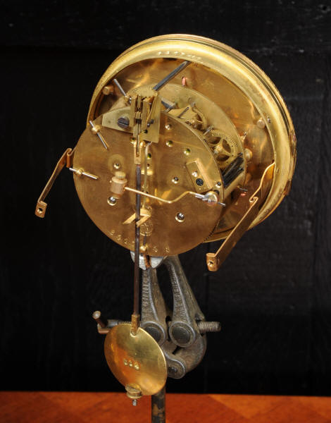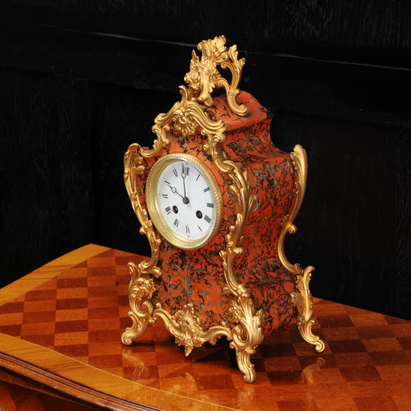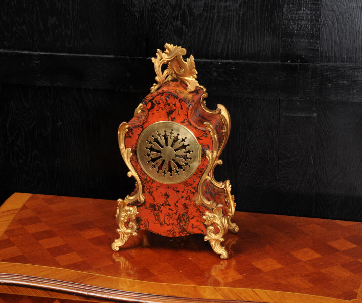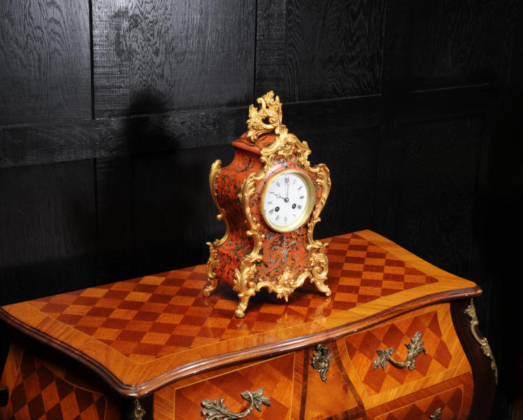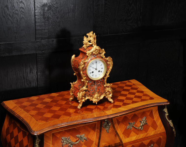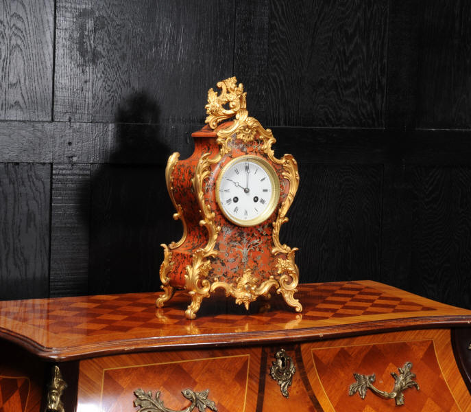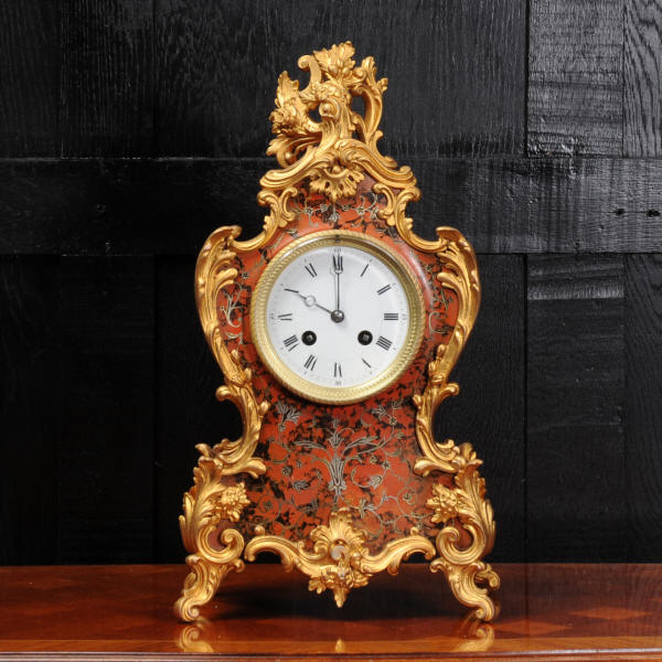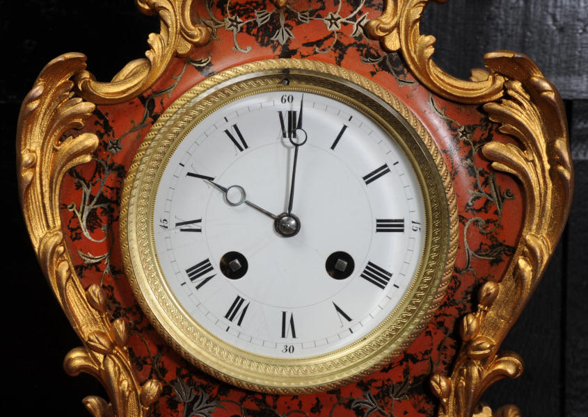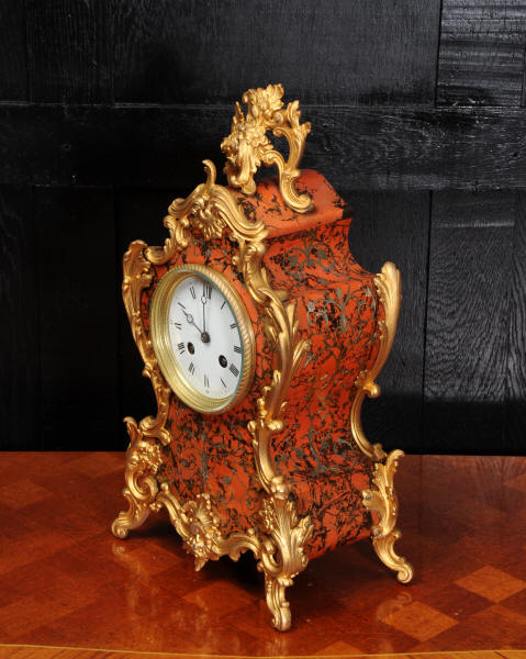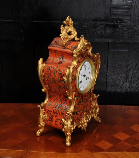 The dial is porcelain enamel on copper and has a finely engine turned bezel and delicately cut blued steel hands. The French movement is by A. D. Mougin and is of the company's usual high quality. It is in excellent clean and running condition having been fully overhauled by our clockmaker. Pendulum is an old replacement. It runs for 8 days and strikes the hours and halves on a gong. Click the video clip below to hear the gong and watch the clock running! Condition of the case is excellent, the lacquer is in good condition and has gently faded to a soft terracotta colour over the years. The gilt metal has some wear and we have polished it to a bright and clean finish with some wear on the high spots. The dial is good, there is some slight enamel loss near the 9 o'clock.