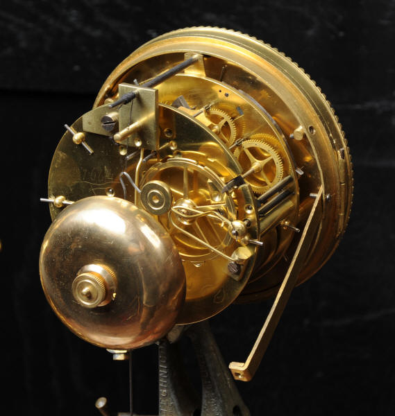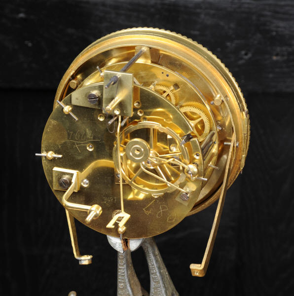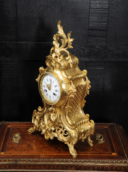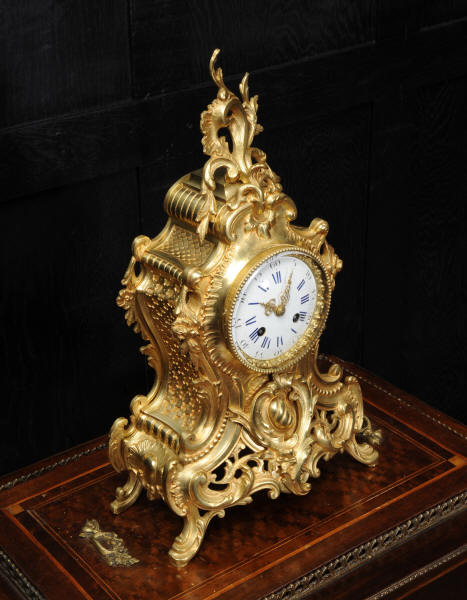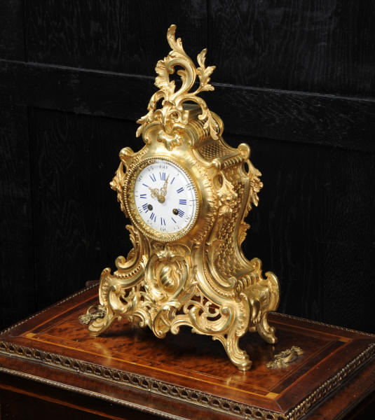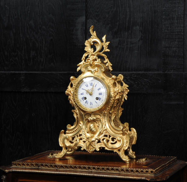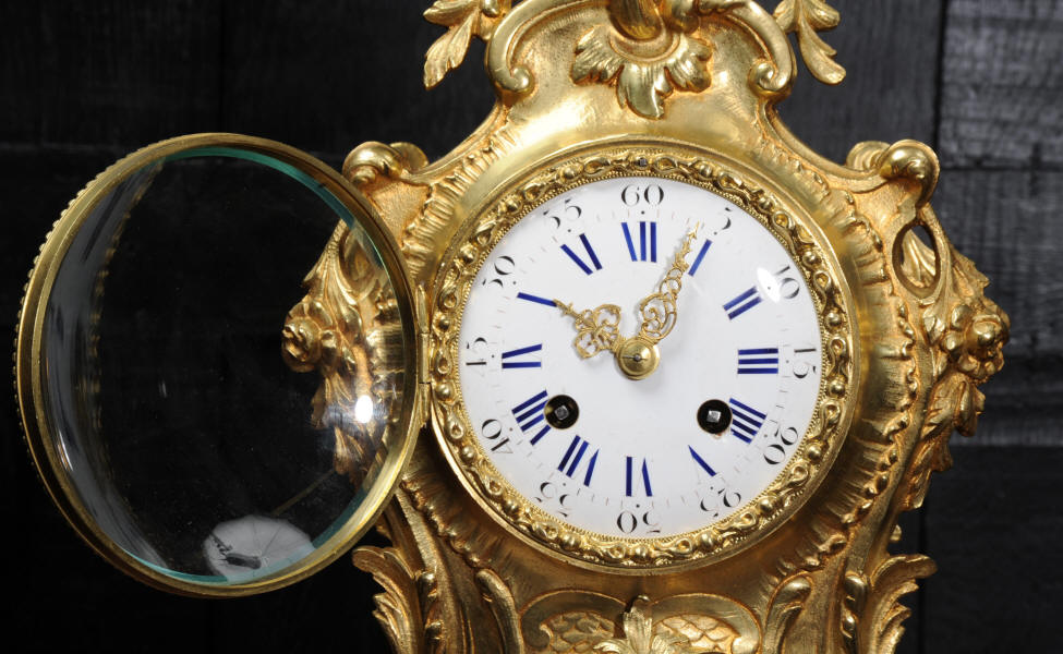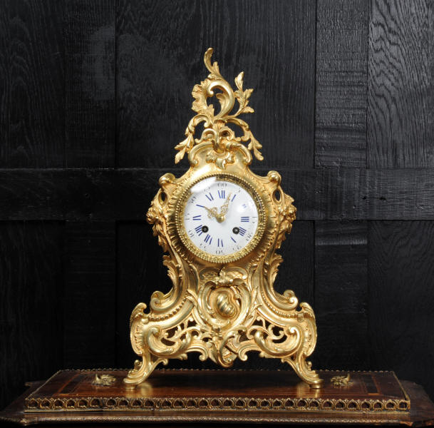 The dial is porcelain enamel on copper with blue lettering. It is complete with original finely fretted hands and convex glass. The French movement is by Japy Freres and is of high quality and is in excellent clean and running condition having been fully overhauled by our clockmaker. It is an early version of the Pendule de Paris movement with spring hammer stop and silk suspension. Pendulum is a replacement. It runs for 8 days and strikes the hours and halves on a bell. Click the video clip to hear the bell and watch the clock running! Condition of the case is excellent, the original gilding is beautifully clean and bright with hardly any wear or discolouration and there are no losses. The dial is also in excellent condition just some slight nibbles to the winding holes.