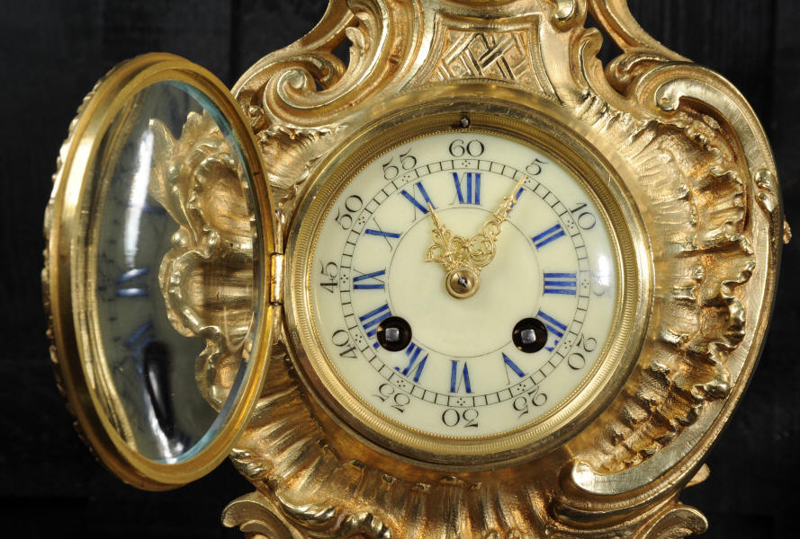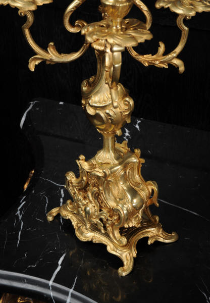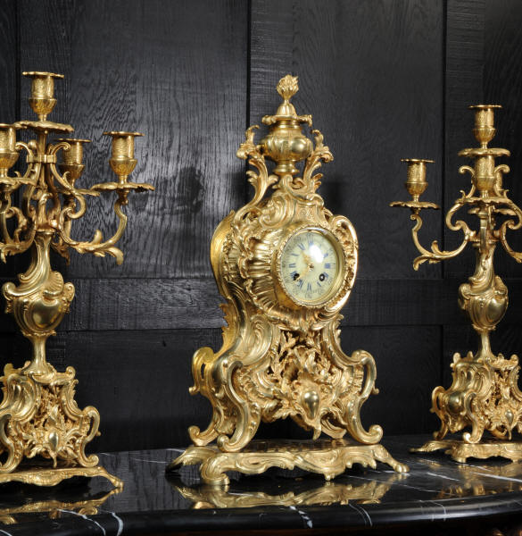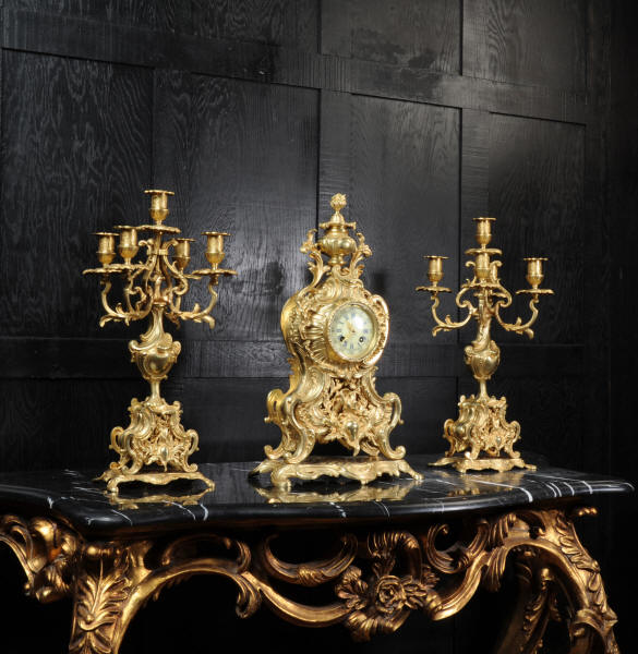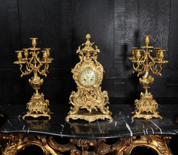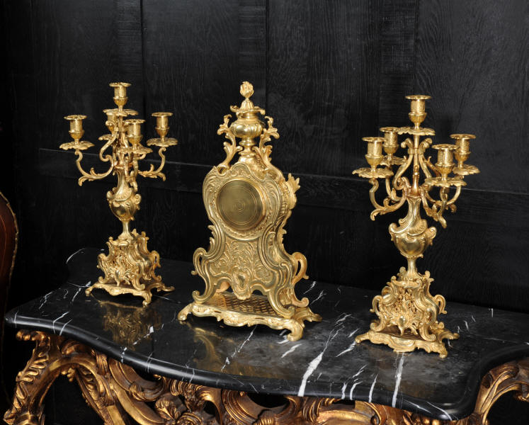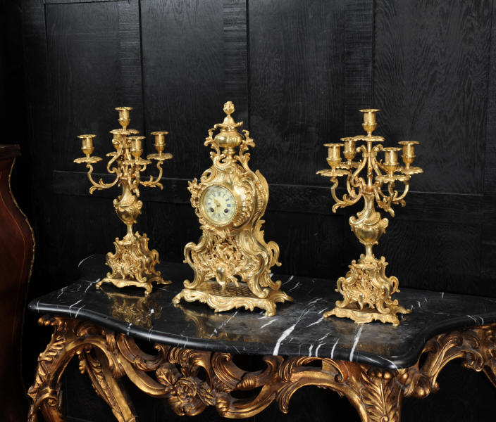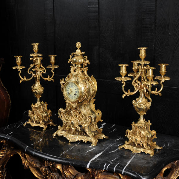 The dial is cream porcelain enamel with blue letters and a separate minute ring in black. It is complete with original finely fretted gilt hands and Rococo bezel with convex glass. The French movement is of high quality and is by A. D. Mougin. It is in excellent clean and running condition having been fully overhauled and tested by our clockmaker. Pendulum is a replacement. It runs for 8 days and strikes the hours and halves on a bell. Click the video clip below to hear the bell and watch the clock running. Condition of the case is excellent, the original gilding is beautifully clean and bright with hardly any wear or discolouration and there are no losses. The dial is also in excellent condition just some nibbles next to the winding holes. The set makes a stunning display as you can see below.