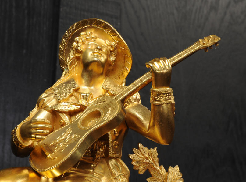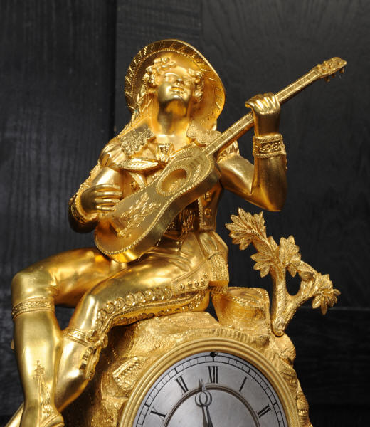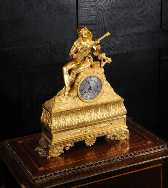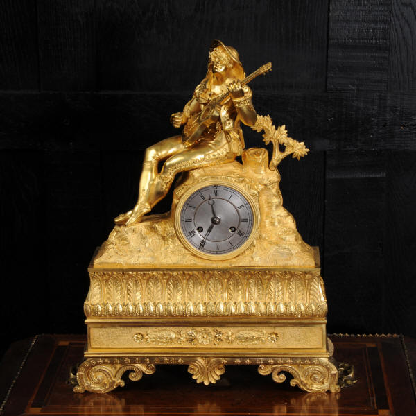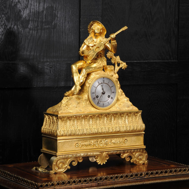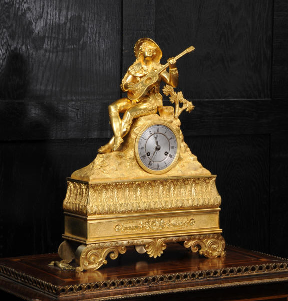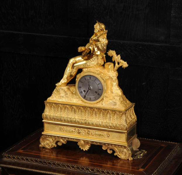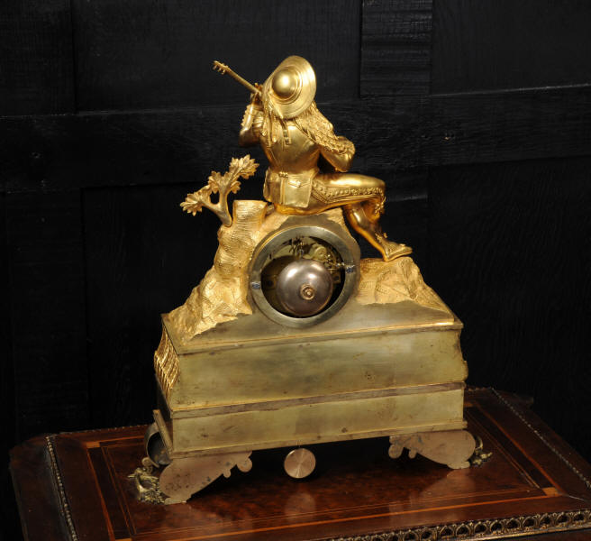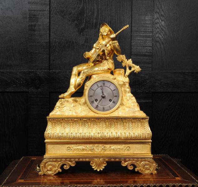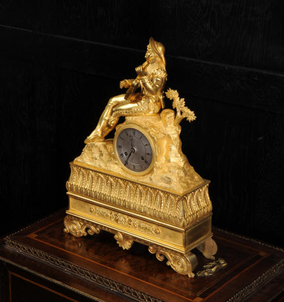 The dial is silvered bronze, lettered in black with original Breguet hands. The dial, bezel, rear bezel and the case are marked with matching serial numbers. Please note this style of clock does not have a glass bezel or rear door. The early French movement is of high quality and is by Charles of Paris and is in excellent clean and running condition having been fully overhauled by our clockmaker. On the rear plate is the mark of the retailer Piolaine of Paris. Both clockmaker and retailer are listed in Tardy, Dictionnaire Des Horlogers. It an early French movement with silk suspension and small plates. It has the more unusual through dial rate adjustment. Pendulum is a replacement. It runs for 8 days and strikes the hours and halves on a bell. Click the video clip below to hear the bell and watch the clock running. Condition of the case is excellent, the original gilding is beautifully clean and bright with some wear, mostly to the sides and rear of the case as these areas were not as heavily gilded as the front originally. There is an old repair to the right hand bracket foot. The dial is in very good condition with just some slight marks to the recent silvering. This is a stunning clock, almost 200 years old, in fine condition.