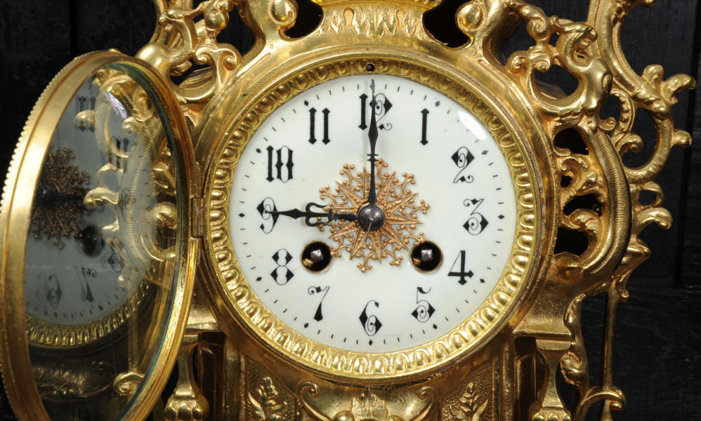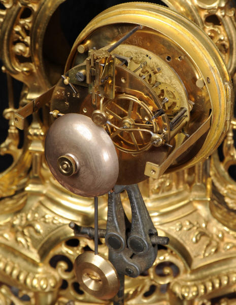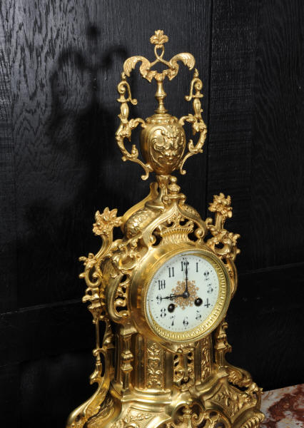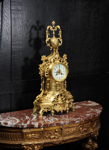 The dial is porcelain enamel on copper with a fancy gilt overlay to the centre, egg and dart bezel and blued steel hands. The French movement is of high quality and is by Japy Freres. It is in excellent clean and running condition having been fully overhauled by our clockmaker. Pendulum is a replacement. It runs for 8 days and strikes the hours and halves on a bell. Click the video clip below to hear the bell and watch the clock running! Condition of the case is excellent, the original gilding is beautifully clean and bright with hardly any wear or discolouration and there are no losses. The dial is also in excellent condition with no damage.