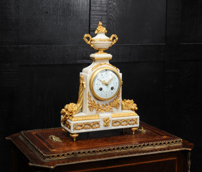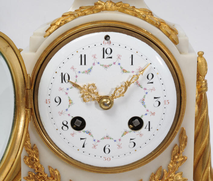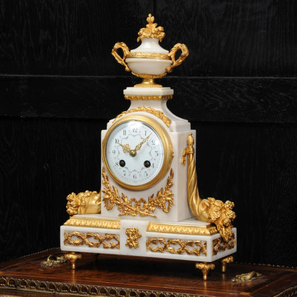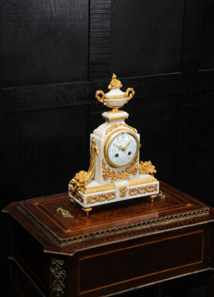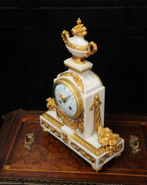 The dial is porcelain enamel on copper with delicate floral swags between the numbers and the original finely fretted gilt brass hands. The French movement is of high quality and has the Samuel Marti mark on the backplate. It is in excellent clean and running condition having been fully overhauled by our clockmaker. Pendulum is a old replacement. It runs for 8 days and strikes the hours and halves on a bell. Click the video clip below to hear the bell and watch the clock running! Condition of the case is excellent, the original gilding is beautifully clean and bright with hardly any wear or discolouration. The dial is also in excellent condition just some tiny nibbles to the winding holes. The marble has a good polish and has mellowed to an off-white over time with some staining and discolouration. There is an occasional small nibble to the edges particularly to the rear.