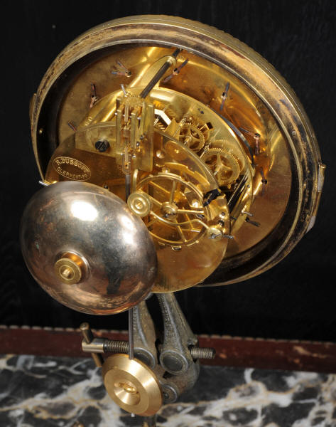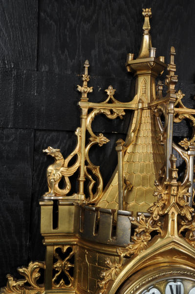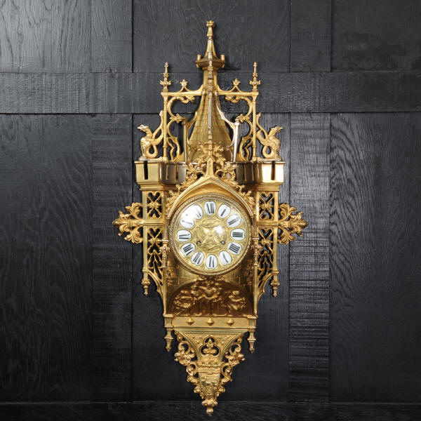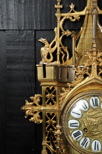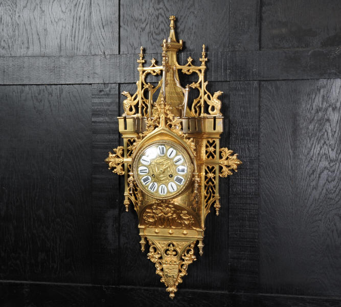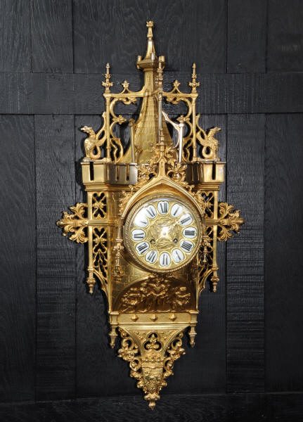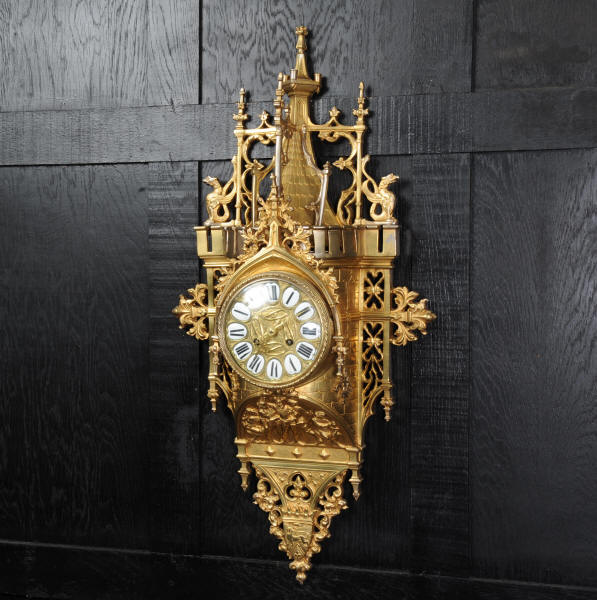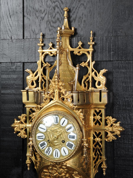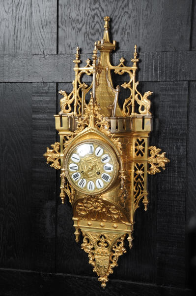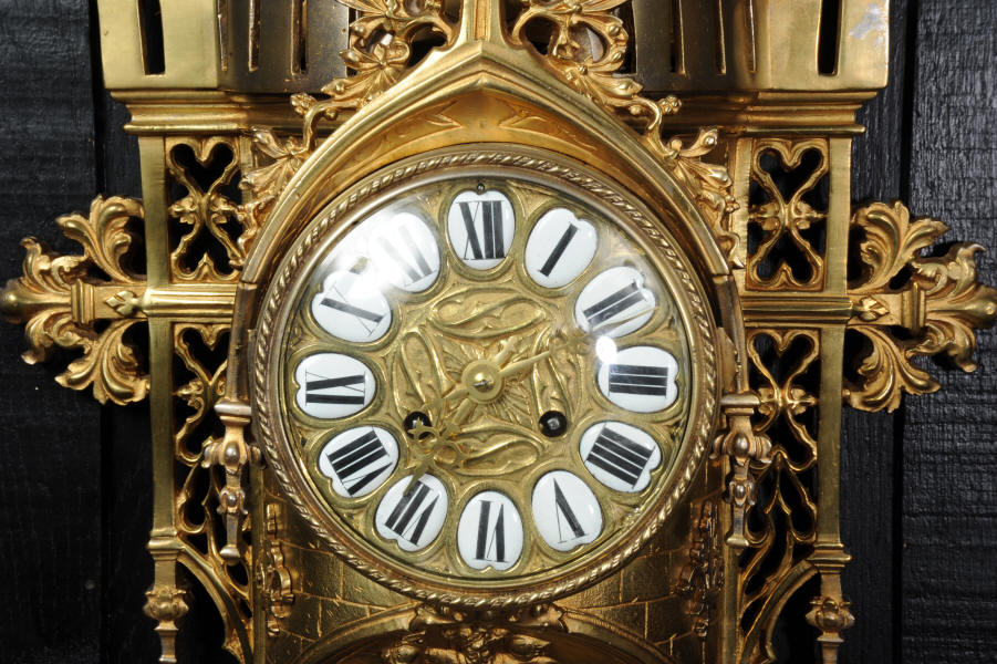 The dial is gilded bronze mounted with 12 individual porcelain enamel cartouches in the traditional French practice. Hands are finely cut brass. The French movement is of high quality and is in excellent clean and running condition having been fully overhauled by our clockmaker. Pendulum is a replacement. It runs for 8 days and strikes the hours and halves on a bell. Click the video clip below to hear the bell and watch the clock running! Condition of the case is excellent, the original gilding is clean and bright, the silver highlighting has worn and mellowed over the years and gives a pleasing contrast and age to the piece. There are some slight distortions to finials. Dial is excellent with no damage.
