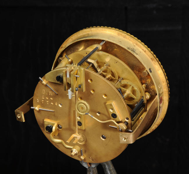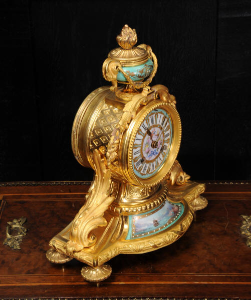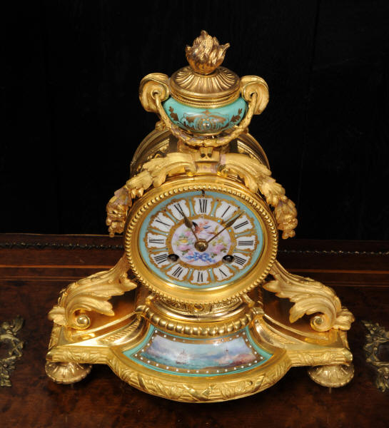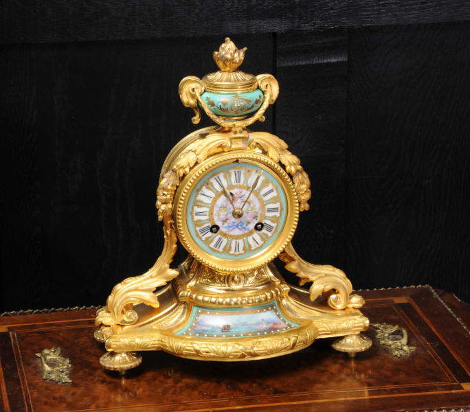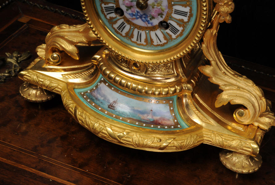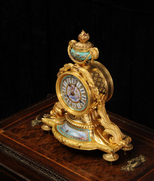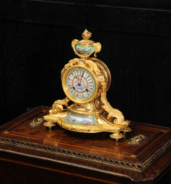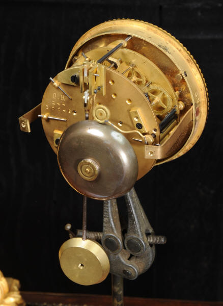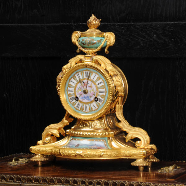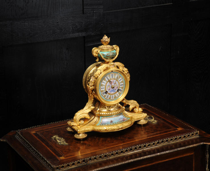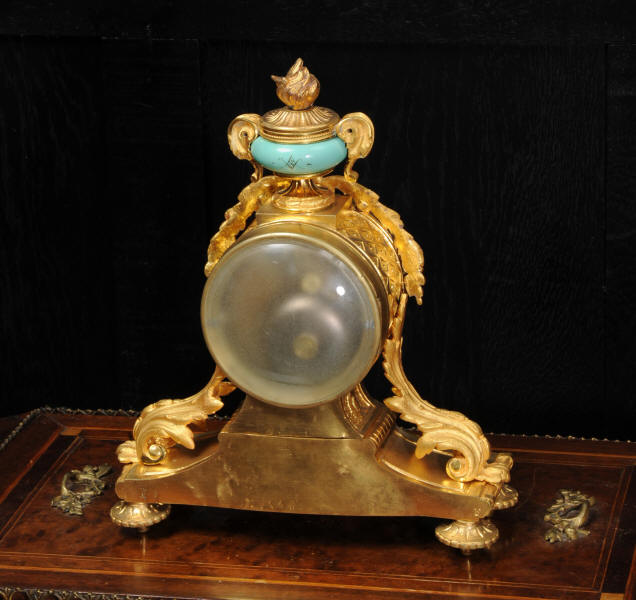 The dial is porcelain, delicately painted with flowers, butterflies and a bow. The rear door is glazed with convex frosted glass. Please note that this type of clock does not have a glazed front bezel. The French movement is of high quality and has the Japy Frères mark on the backplate. It is in excellent clean and running condition having been fully overhauled by our clockmaker. Pendulum is an old replacement. It runs for 8 days and strikes the hours and halves on a bell. Click the video clip below to hear the bell and watch the clock running! Condition of the case is very good, the original gilding is beautifully clean and bright with some occasional tarnish or discolouration. The porcelain is also in excellent condition with some loss to the over-glaze gilt decoration and applied porcelain jewels.