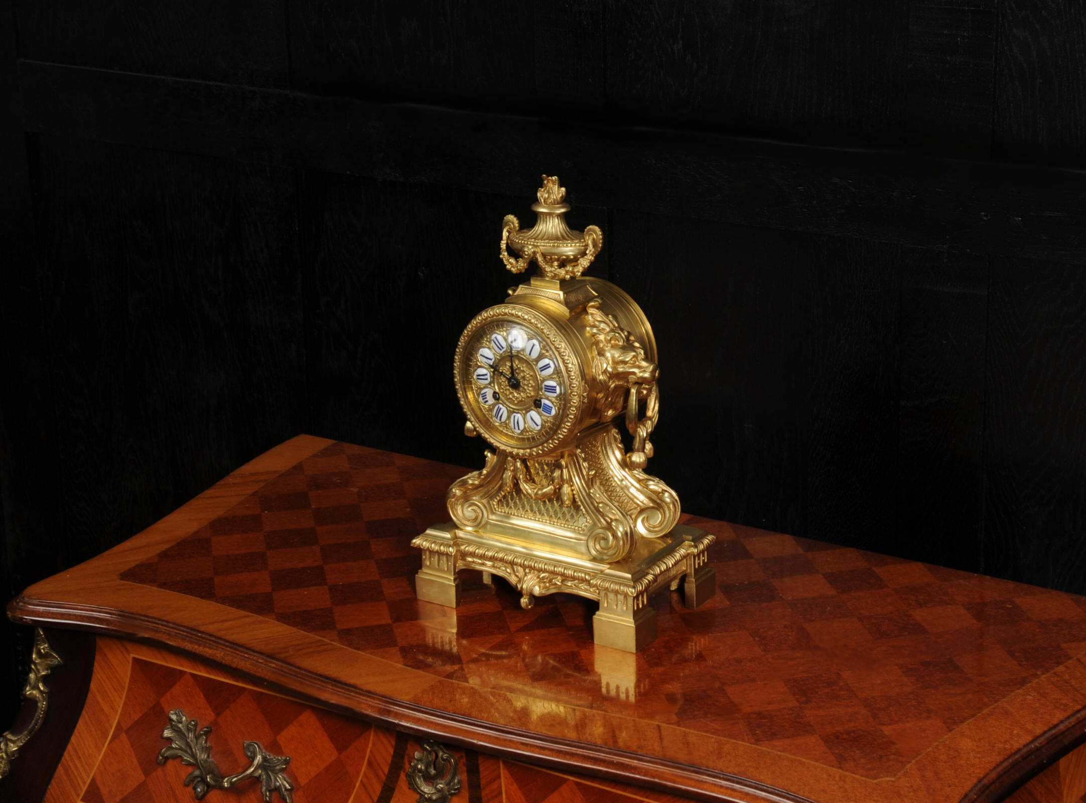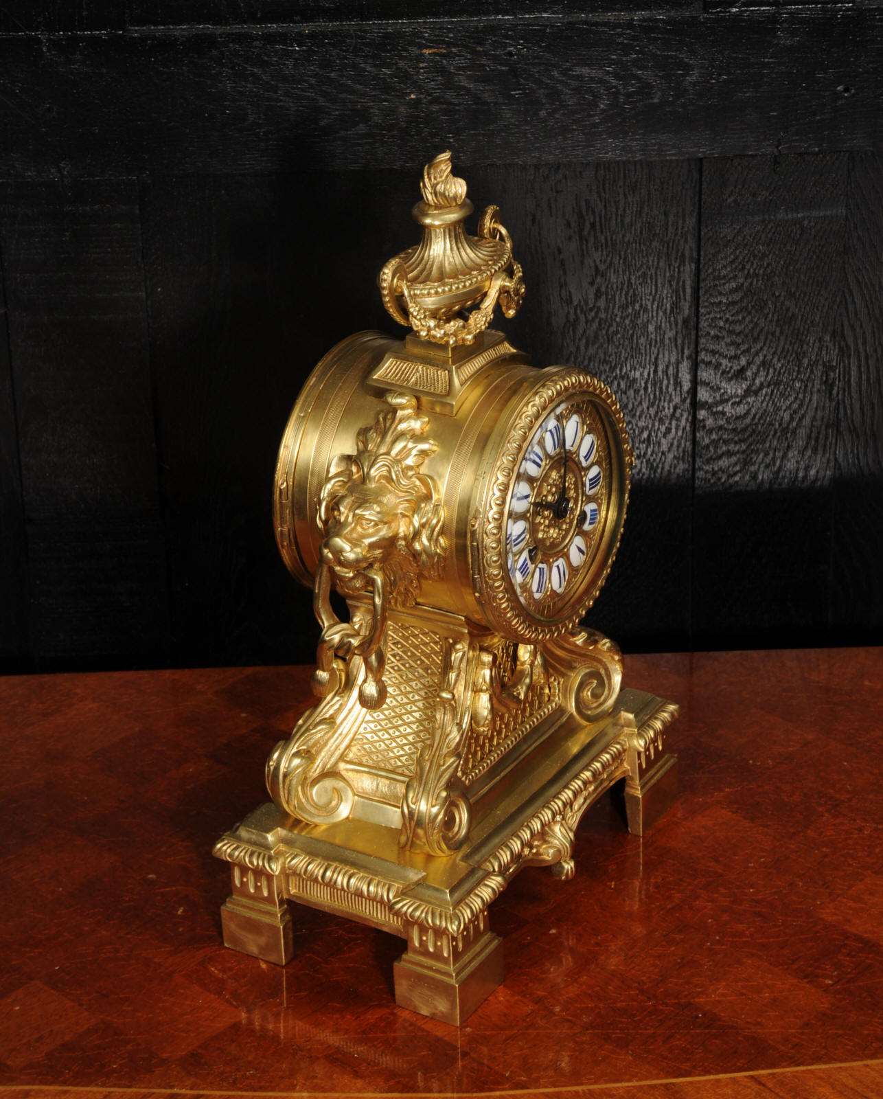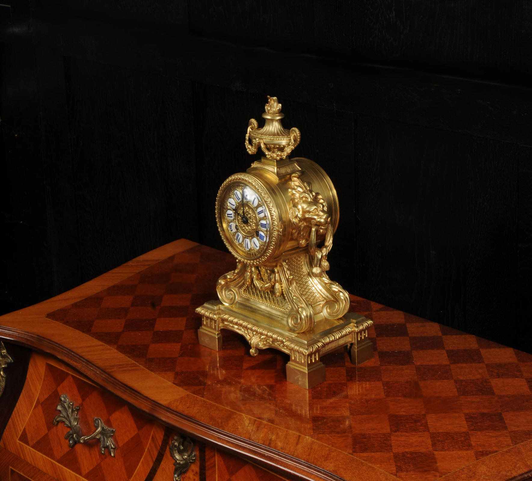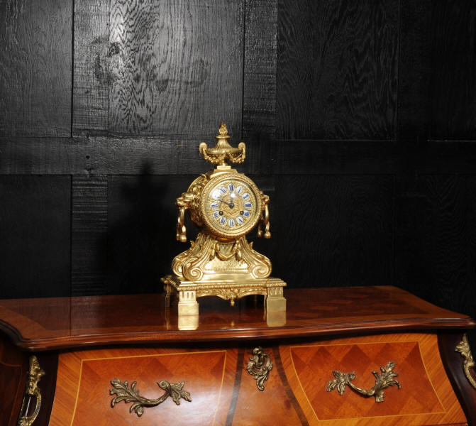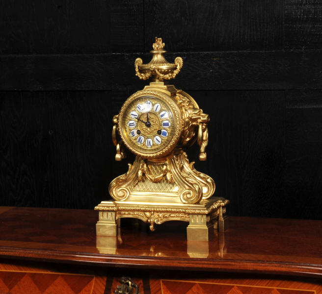 To the top is an elegant flaming urn with pieced handles with a laurel swag. The dial is heavy cast bronze with an engraved minute ring and mounted with porcelain enamel cartouche hours and is complete with original finely cut blued steel hands. The rear door is glazed with frosted glass. The clock is modelled in the round so will display beautifully in the centre of a room or in front of a mirror. The clock houses a fine French movement by Samuel Marti, renowned for precision and quality. It is presented in excellent, clean running order, having been fully overhauled and tested by our clockmaker. The original pendulum accompanies the movement. It runs for eight days and strikes the hours and half-hours on a bell with a clear, pleasing tone. Please click the video below to hear the strike and see the clock in operation. The design of this clock is based on the 18th century by the well known case maker Antoine Foullet (1710-1775). He was a cabinet maker who specialised in clockcases. He became master in 1749 and worked from his workshop on the rue du Faubourg-Saint-Antoine, Paris. Following his death in 1775, an inventory drawn up lists twenty clocks cases, some made entirely of bronze. Foullet's work is represented in the finest collections including The J Paul Getty Museum. A design drawing of a similar clock can be seen on page 192 of Vergoldete Bronzen by Hans Ottomeyer and Peter Proschel. A clock of similar design can be seen on page 239 of Les Plus Belles Pendules Francaises by Giacomo and Aurelie Wannenes 2013. The case is in excellent condition, clean and bright showing hardly any wear or discolouration. The dial is also in very good order overall; there is a chip to the cartouche adjacent to the left-hand winding hole.