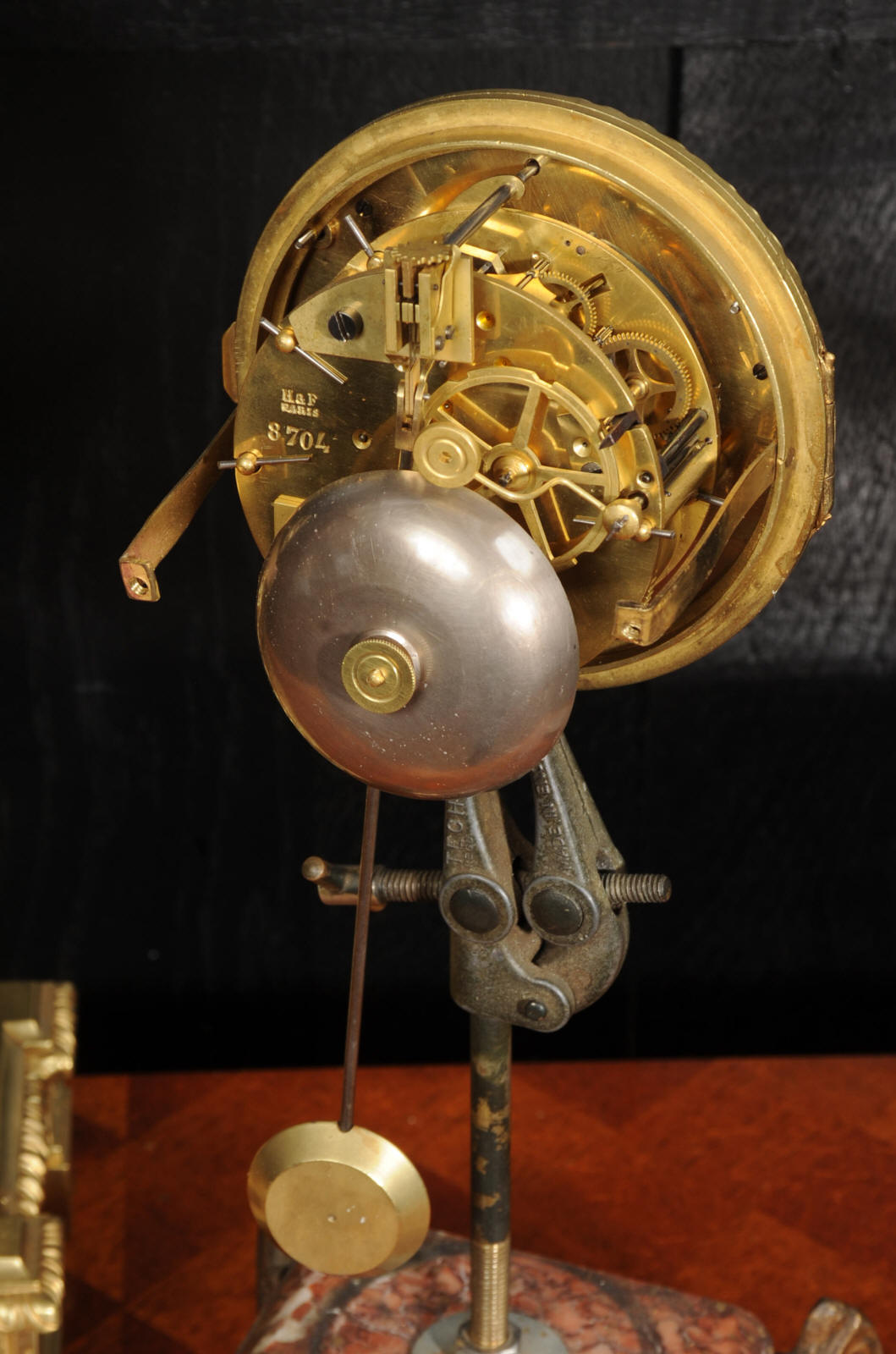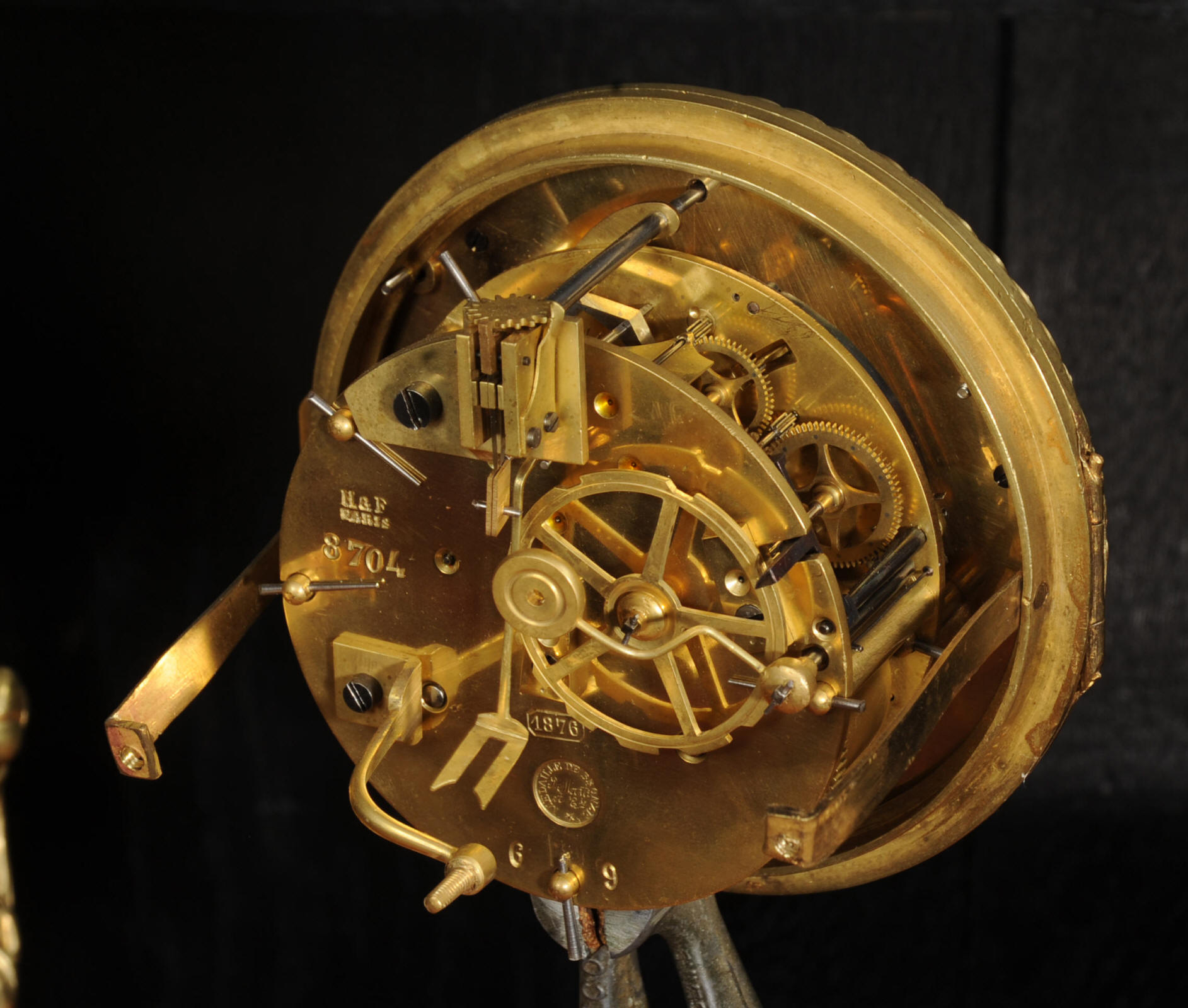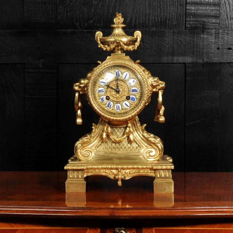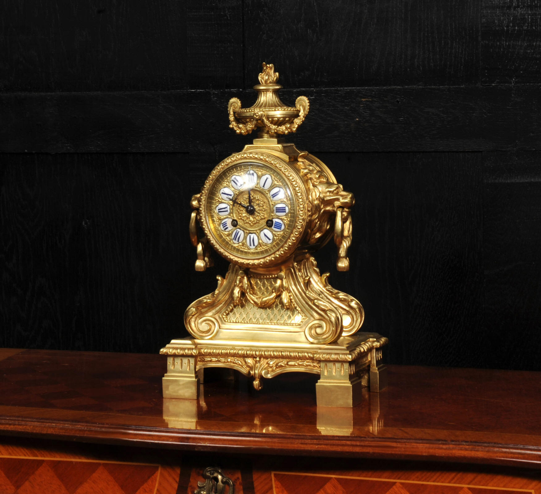 To the top is an elegant flaming urn with pieced handles with a laurel swag. The dial is heavy cast bronze with an engraved minute ring and mounted with porcelain enamel cartouche hours and is complete with original finely cut blued steel hands. The rear door is glazed with frosted glass. The clock is modelled in the round so will display beautifully in the centre of a room or in front of a mirror. The clock houses a fine French movement by Samuel Marti, renowned for precision and quality. It is presented in excellent, clean running order, having been fully overhauled and tested by our clockmaker. The original pendulum accompanies the movement. It runs for eight days and strikes the hours and half-hours on a bell with a clear, pleasing tone. Please click the video below to hear the strike and see the clock in operation. The design of this clock is based on the 18th century by the well known case maker Antoine Foullet (1710-1775). He was a cabinet maker who specialised in clockcases. He became master in 1749 and worked from his workshop on the rue du Faubourg-Saint-Antoine, Paris. Following his death in 1775, an inventory drawn up lists twenty clocks cases, some made entirely of bronze. Foullet's work is represented in the finest collections including The J Paul Getty Museum. A design drawing of a similar clock can be seen on page 192 of Vergoldete Bronzen by Hans Ottomeyer and Peter Proschel. A clock of similar design can be seen on page 239 of Les Plus Belles Pendules Francaises by Giacomo and Aurelie Wannenes 2013. The case is in excellent condition, clean and bright showing hardly any wear or discolouration. The dial is also in very good order overall; there is a chip to the cartouche adjacent to the left-hand winding hole.
