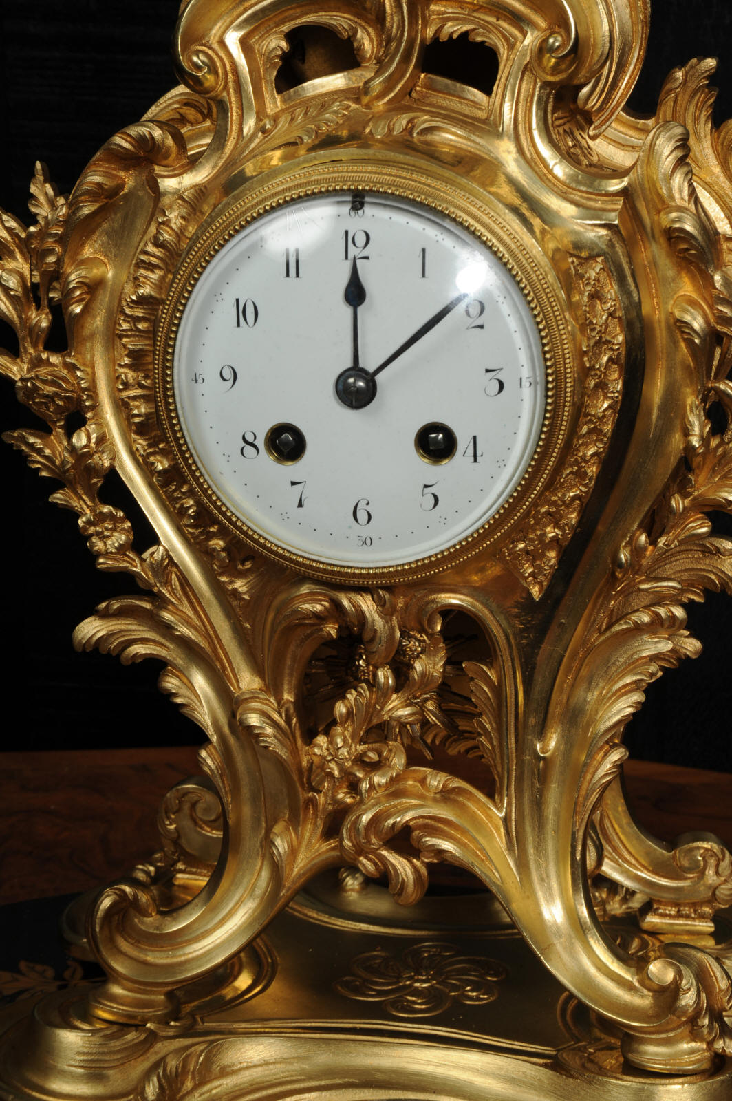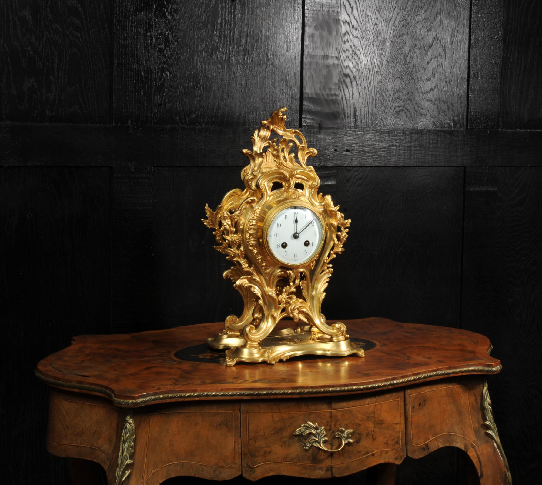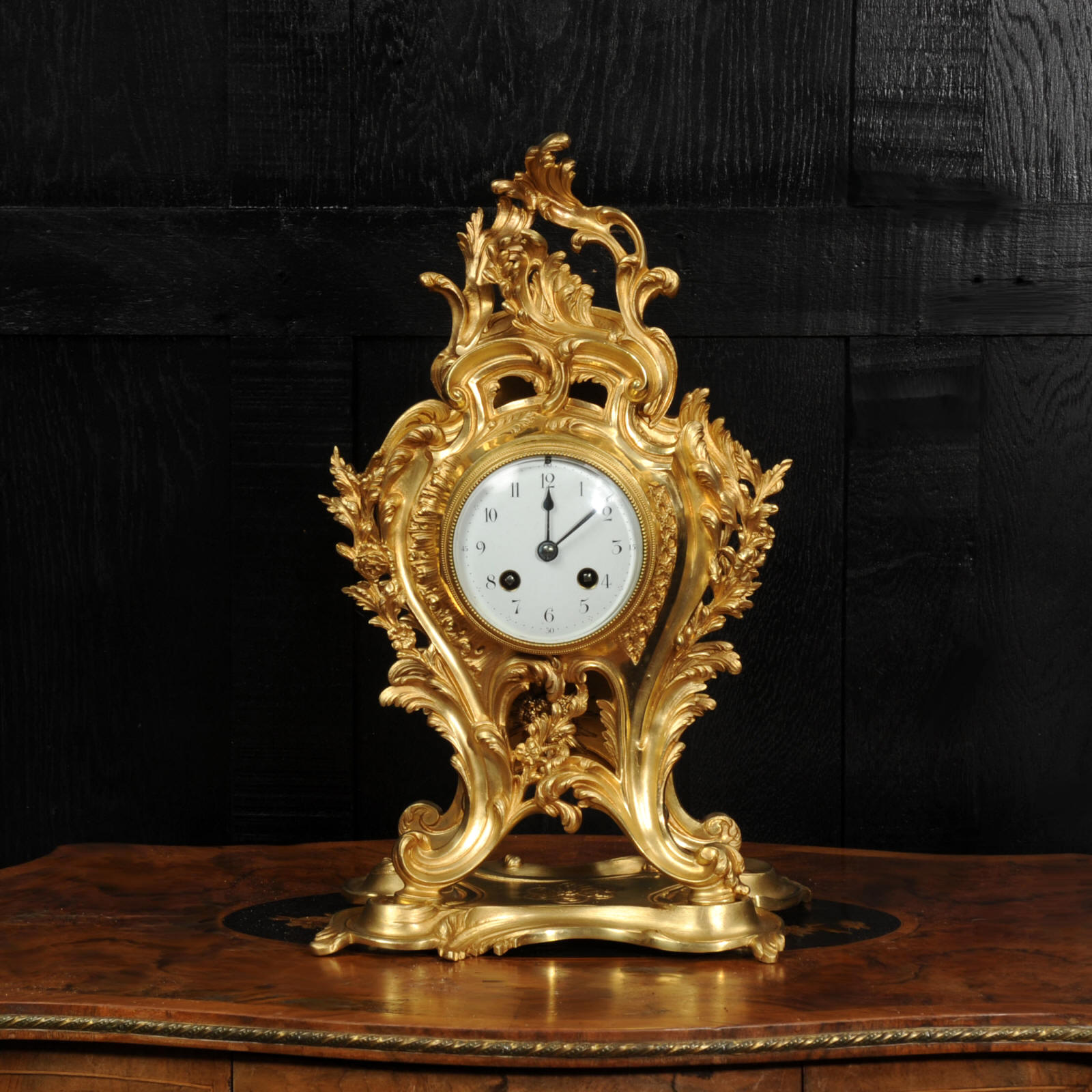 The dial is porcelain enamel on copper, beautifully chic with fine lettering and blued steel hands. The French movement is of high quality and is in excellent clean and running condition having been fully overhauled by our clockmaker. Pendulum is original. It runs for 8 days and strikes the hours and halves on a bell. Click the video to hear the bell and watch the clock running.