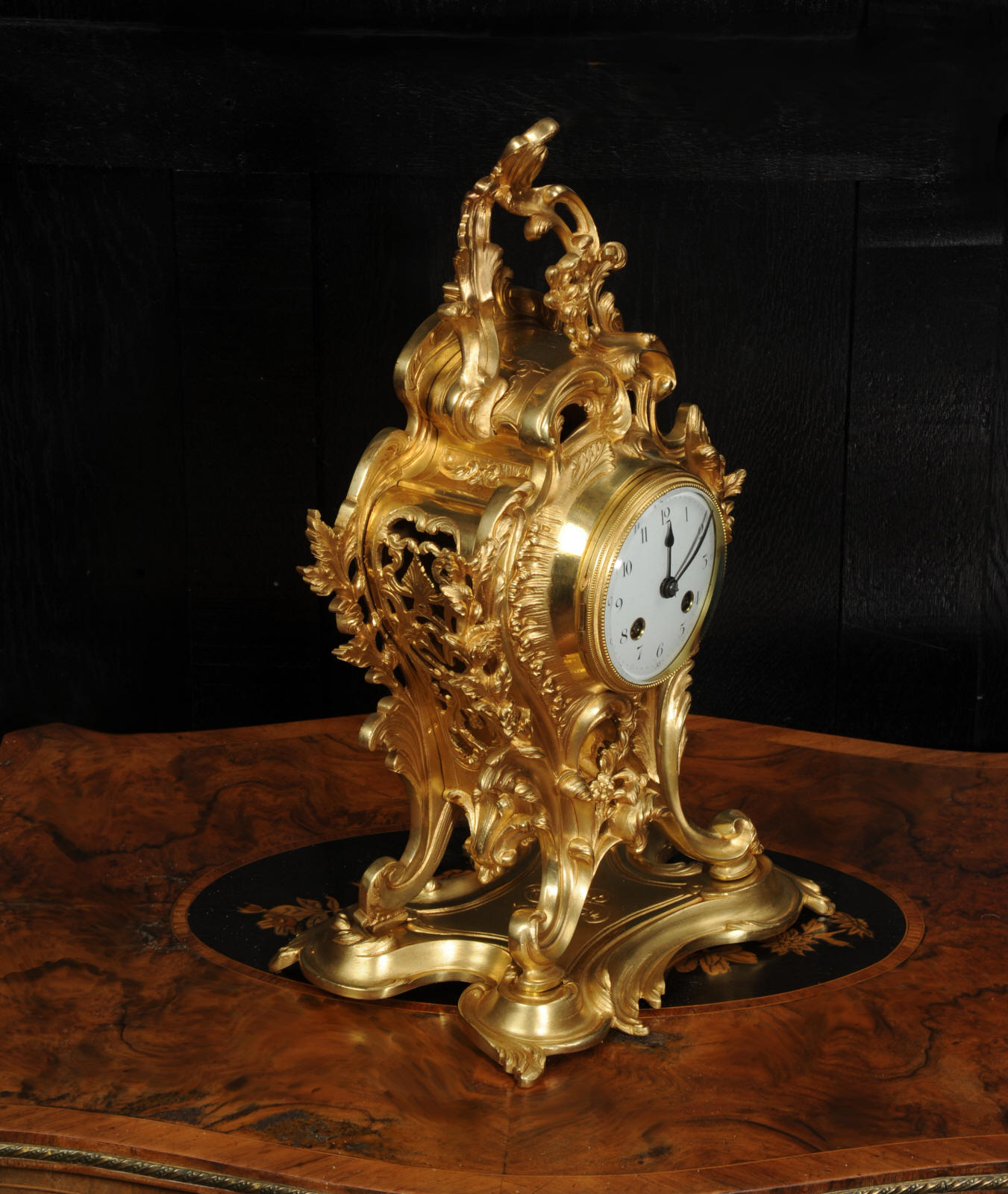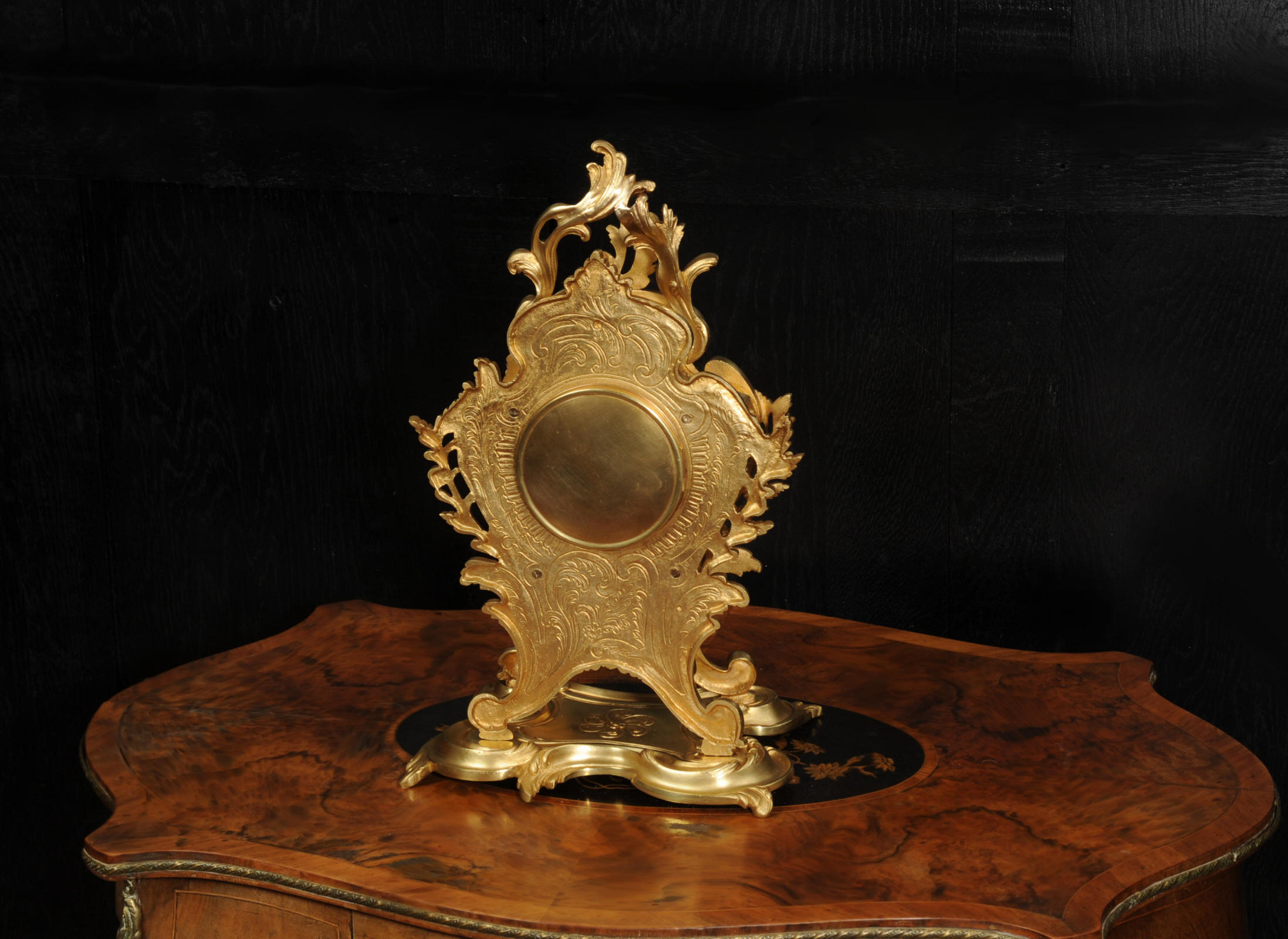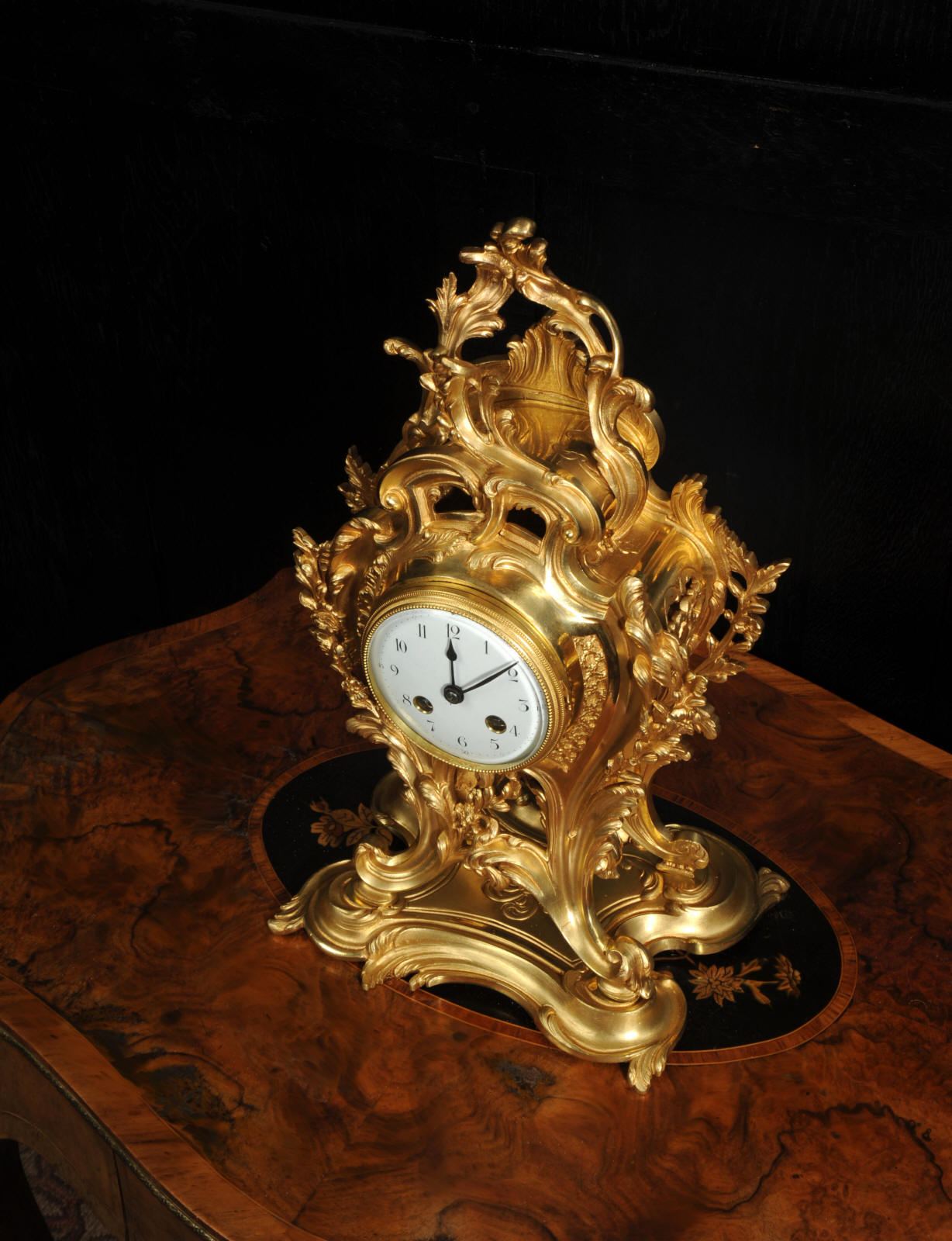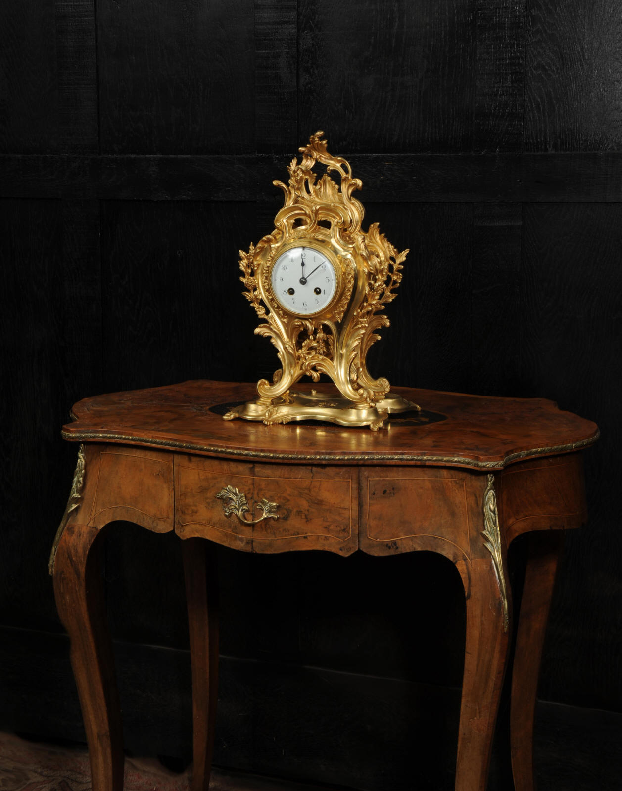 The dial is porcelain enamel on copper, beautifully chic with fine lettering and blued steel hands. The French movement is of high quality and is in excellent clean and running condition having been fully overhauled by our clockmaker. Pendulum is original. It runs for 8 days and strikes the hours and halves on a bell. Click the video to hear the bell and watch the clock running.