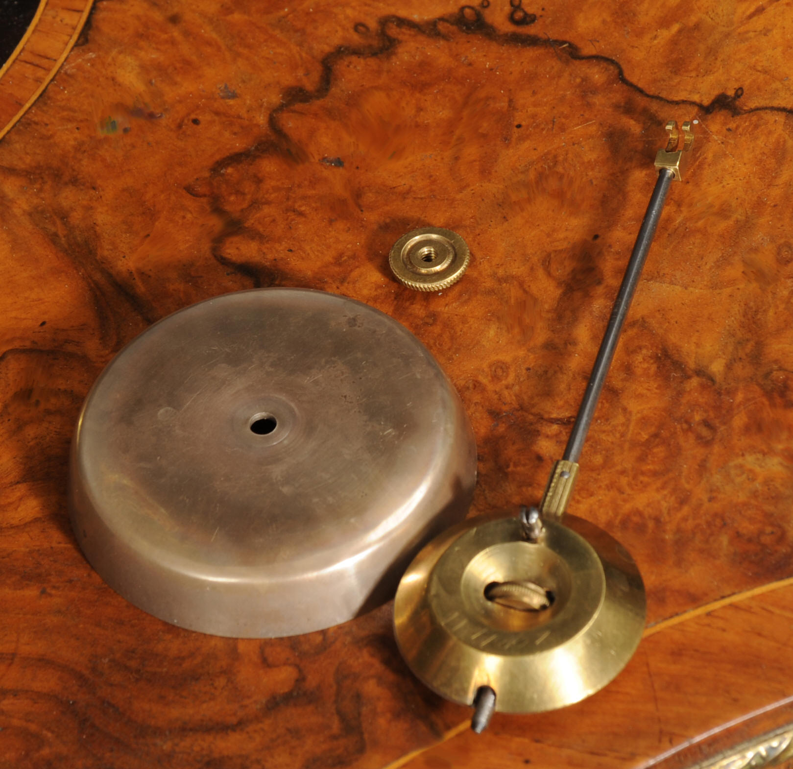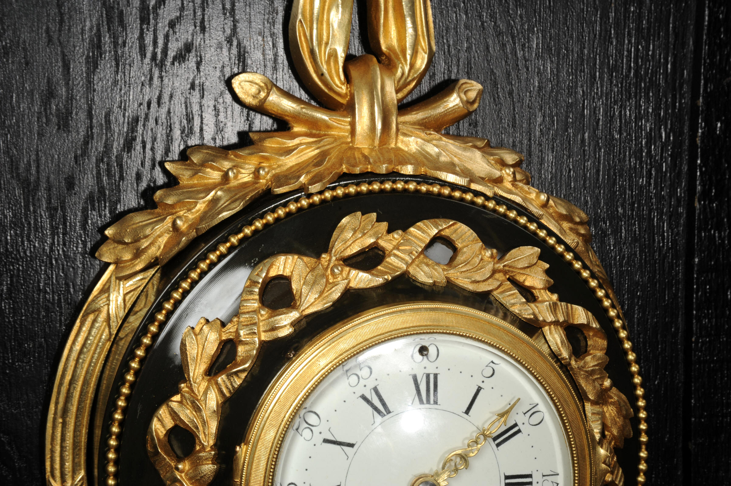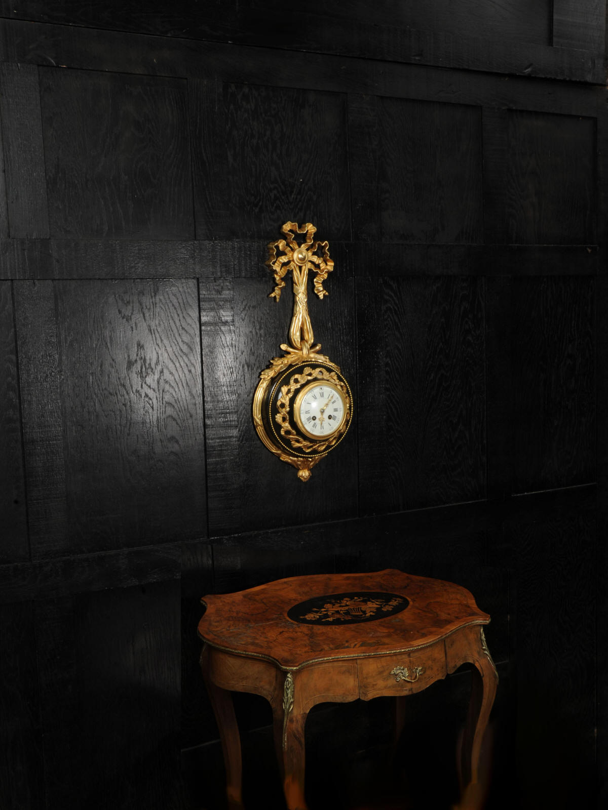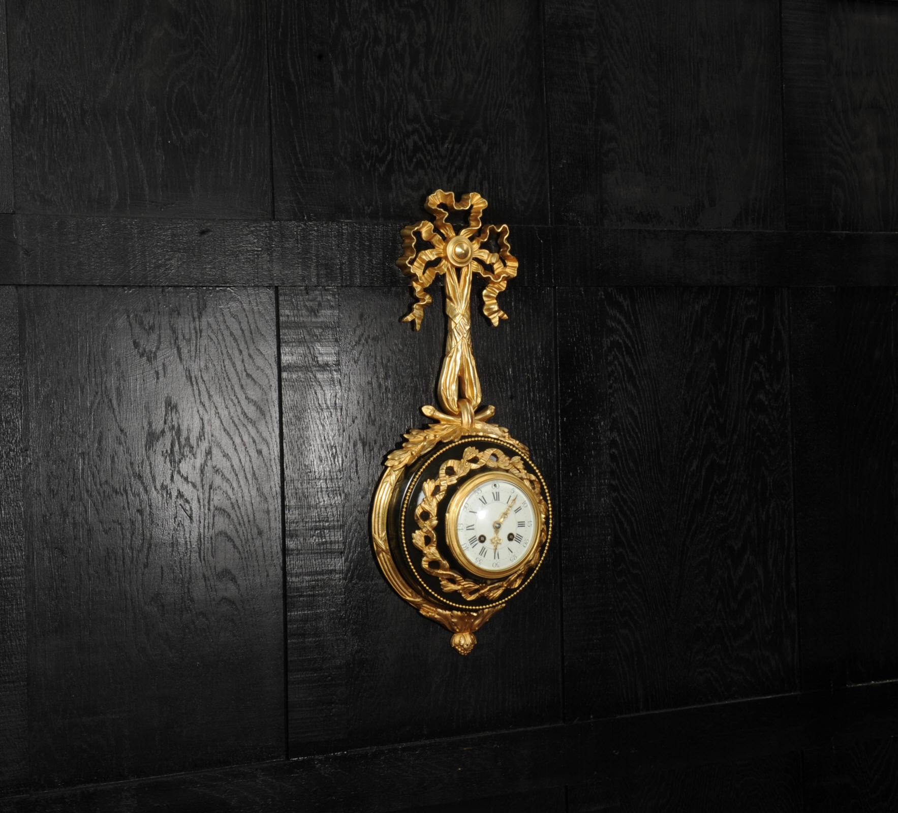 The bronze body is adorned with a laurel wreath motif, symbolising honour and achievement, and is completed by a laurel crest at the base of the ribbon. The porcelain enamel dial on copper is set behind a convex glass, and features fretted and incised gilt brass hands. At the heart of the piece is a high-quality French movement by Samuel Marti, fully overhauled and in excellent clean and running condition. It comes complete with its original pendulum, runs for eight days, and strikes the hours and half-hours on a bell. A video is available to hear the bell and see the clock in operation, please see below. The case is in superb condition, with the original gilding remaining beautifully bright and clean, showing only minimal wear or discolouration. The bronze retains a rich, original patina with slight, age-appropriate wear and a few small surface marks. The dial is excellent, free from damage, and the original convex glass has only a slight mark, an original manufacturing fault. This is a wonderfully decorative and mechanically sound timepiece—both a functional clock and a fine decorative object.