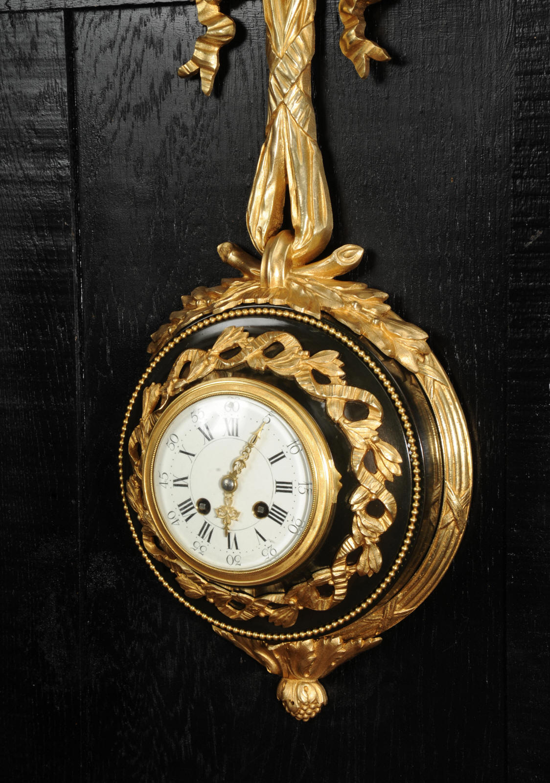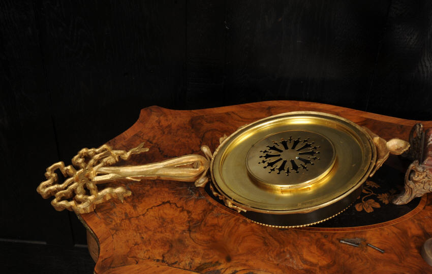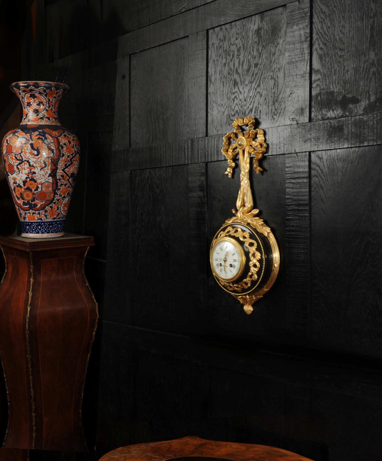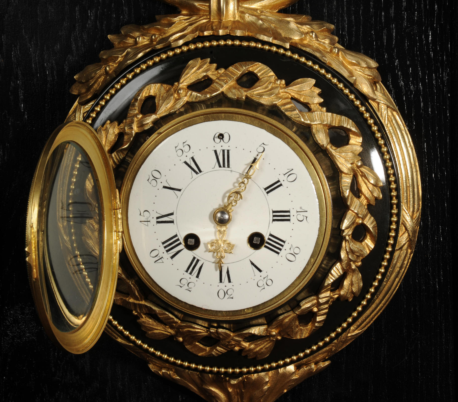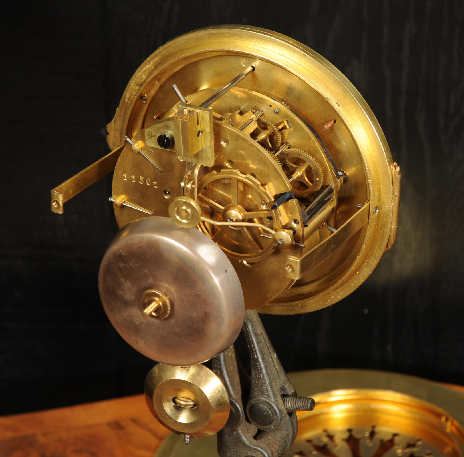 The bronze body is adorned with a laurel wreath motif, symbolising honour and achievement, and is completed by a laurel crest at the base of the ribbon. The porcelain enamel dial on copper is set behind a convex glass, and features fretted and incised gilt brass hands. At the heart of the piece is a high-quality French movement by Samuel Marti, fully overhauled and in excellent clean and running condition. It comes complete with its original pendulum, runs for eight days, and strikes the hours and half-hours on a bell. A video is available to hear the bell and see the clock in operation, please see below. The case is in superb condition, with the original gilding remaining beautifully bright and clean, showing only minimal wear or discolouration. The bronze retains a rich, original patina with slight, age-appropriate wear and a few small surface marks. The dial is excellent, free from damage, and the original convex glass has only a slight mark, an original manufacturing fault. This is a wonderfully decorative and mechanically sound timepiece—both a functional clock and a fine decorative object.