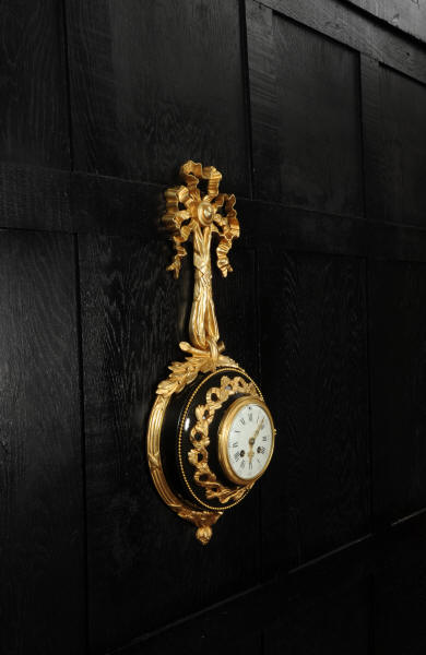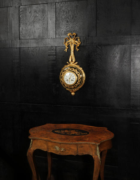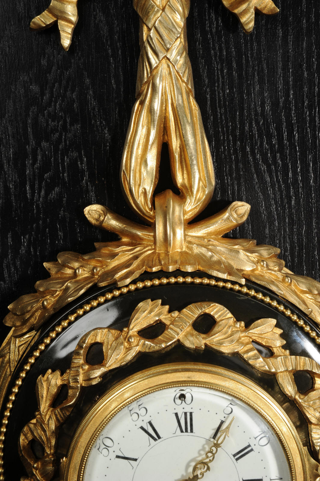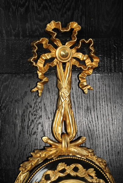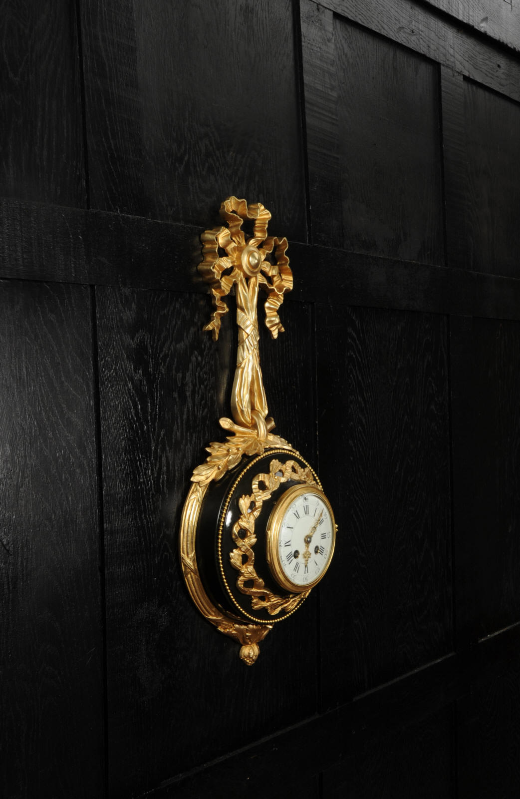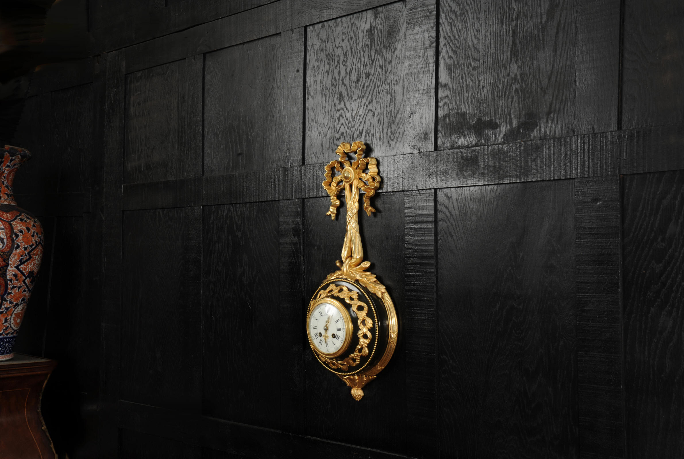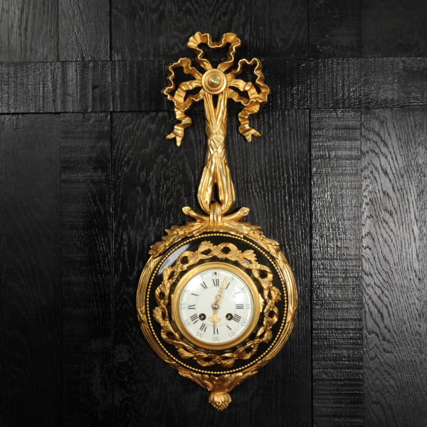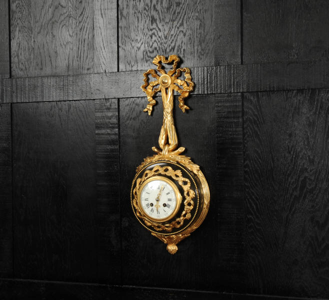 The bronze body is adorned with a laurel wreath motif, symbolising honour and achievement, and is completed by a laurel crest at the base of the ribbon. The porcelain enamel dial on copper is set behind a convex glass, and features fretted and incised gilt brass hands. At the heart of the piece is a high-quality French movement by Samuel Marti, fully overhauled and in excellent clean and running condition. It comes complete with its original pendulum, runs for eight days, and strikes the hours and half-hours on a bell. A video is available to hear the bell and see the clock in operation, please see below. The case is in superb condition, with the original gilding remaining beautifully bright and clean, showing only minimal wear or discolouration. The bronze retains a rich, original patina with slight, age-appropriate wear and a few small surface marks. The dial is excellent, free from damage, and the original convex glass has only a slight mark, an original manufacturing fault. This is a wonderfully decorative and mechanically sound timepiece—both a functional clock and a fine decorative object.