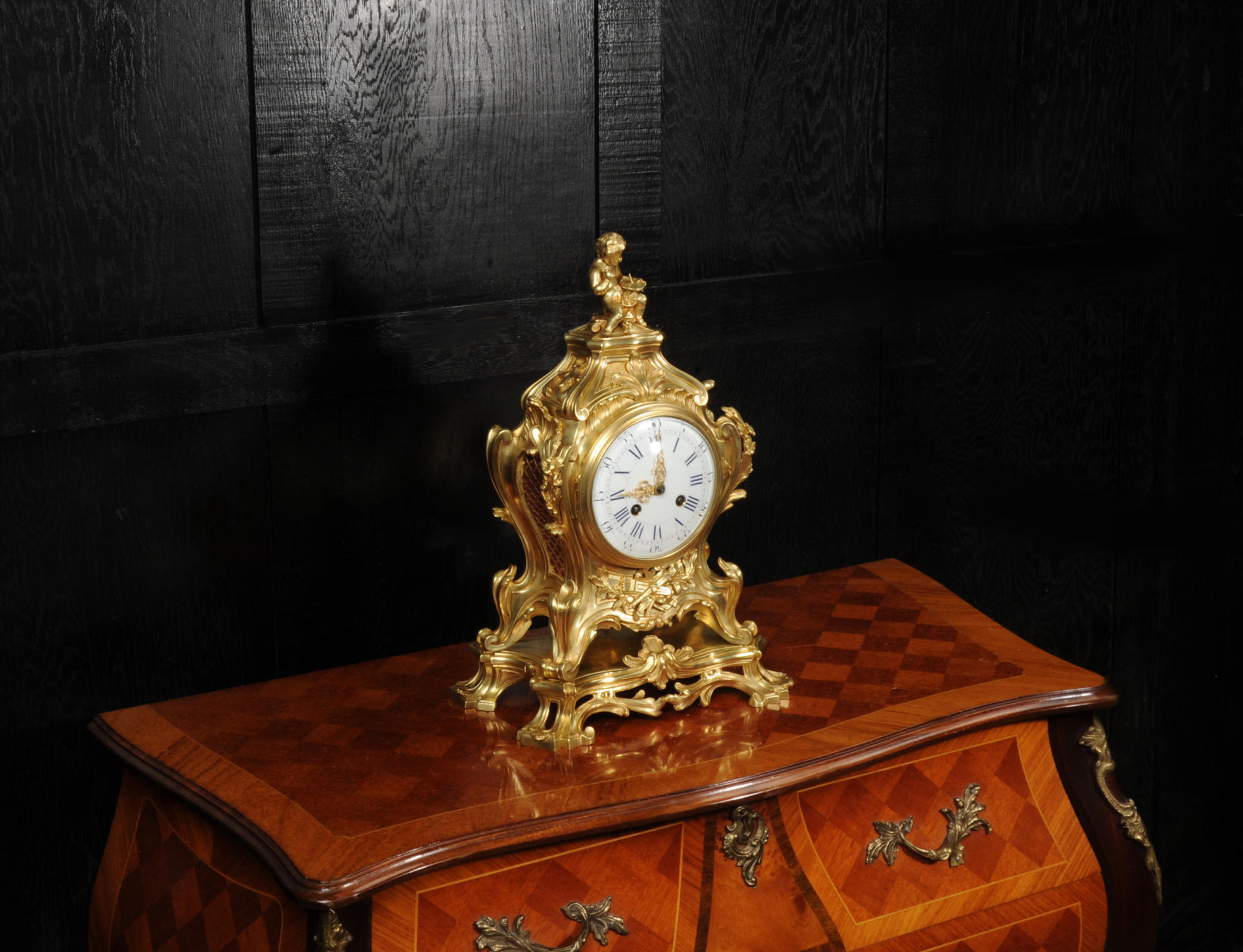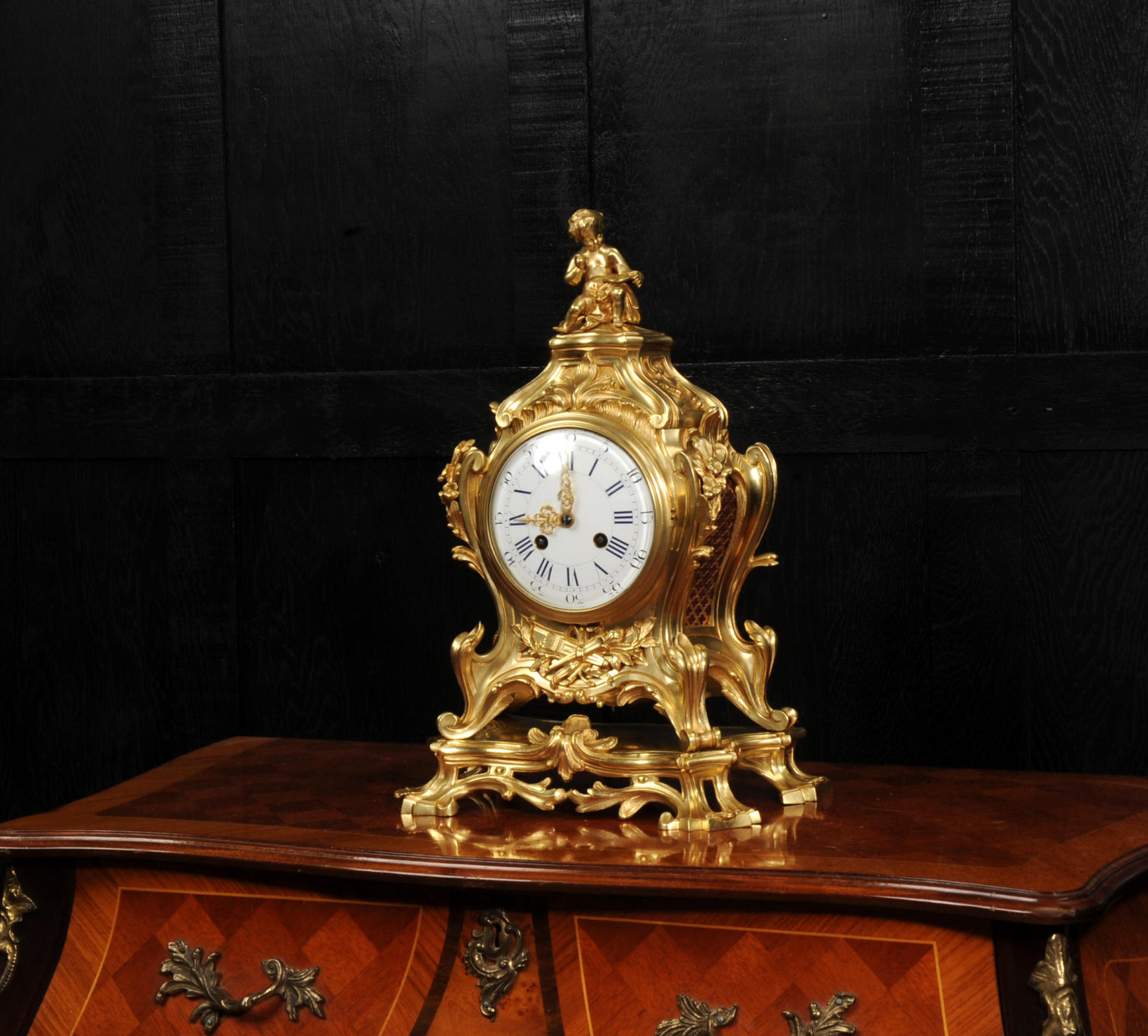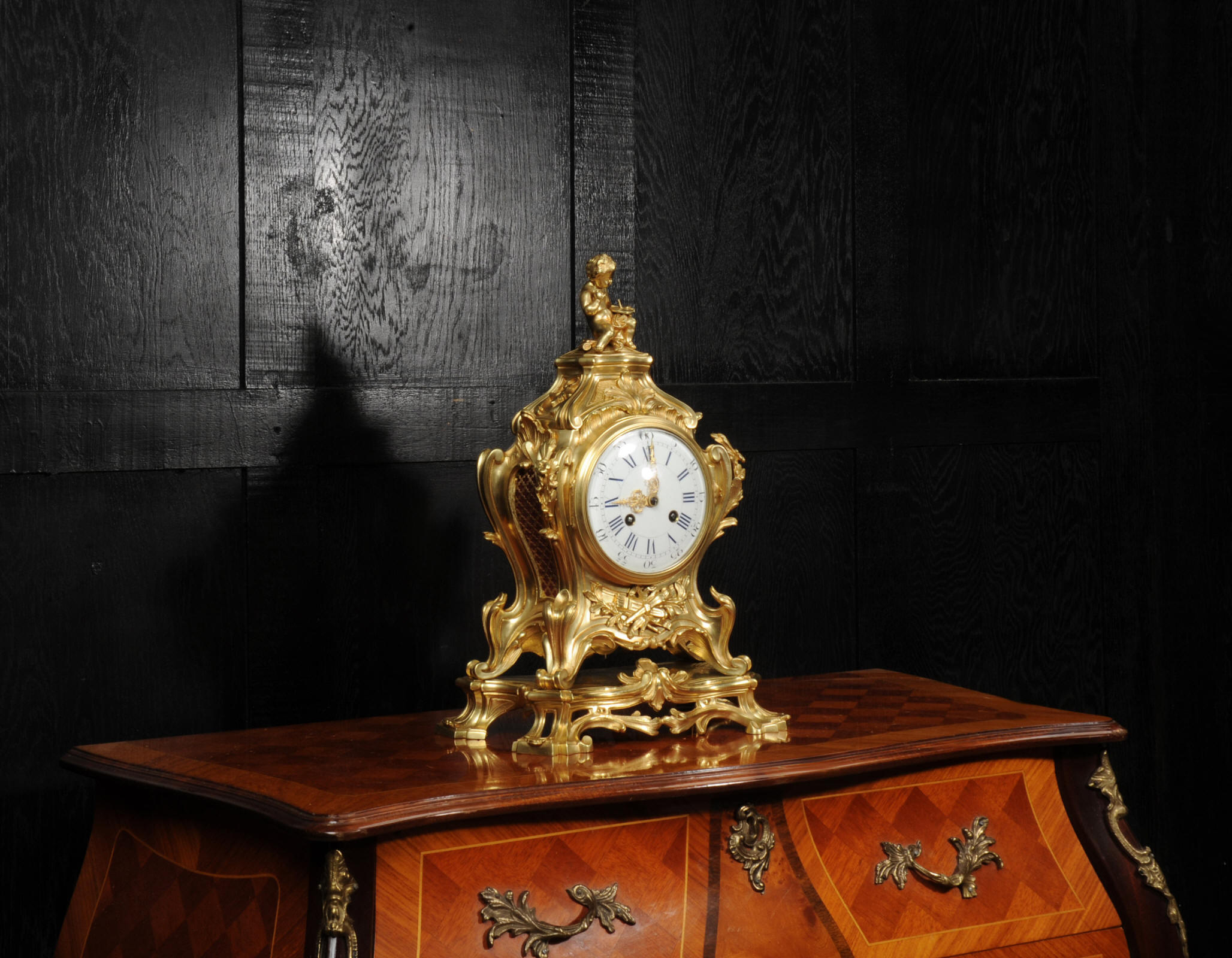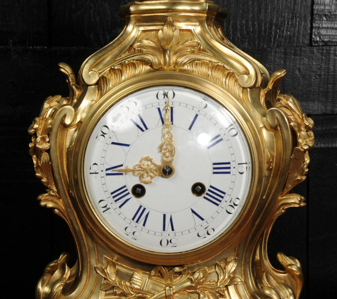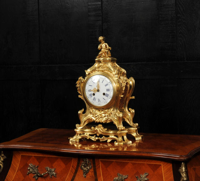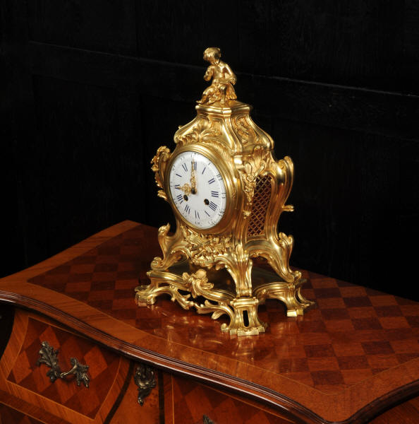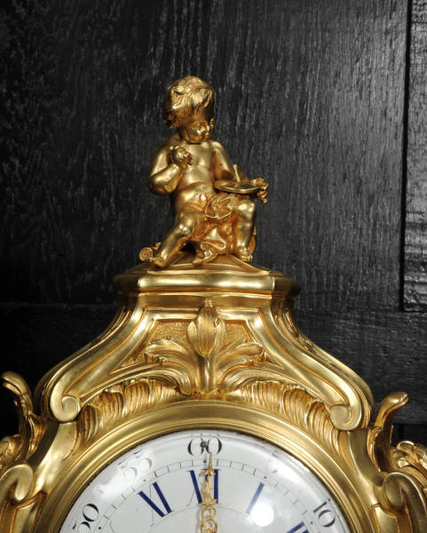 The dial is of porcelain enamel on copper, retaining its original finely pierced gilt-bronze hands and set beneath a convex glass bezel. Beneath the dial, the allegorical symbolism continues with Amor’s quiver of arrows and flaming torch, emblematic of love and enlightenment, nestled among richly cast foliate scrolls and finely chased ornamentation. The sides are mounted with fabric-backed sound frets, lending visual lightness to the design. The polished base subtly reflects the movement of the pendulum, which may be seen gently swinging within the case. A glazed rear door reveals the beautifully finished movement. The case is modelled in the round, making this clock particularly well-suited for display in the centre of a room or on a table. The clock houses a high-quality French movement by Samuel Marti, and is of superb quality. The movement is presented in excellent condition, having been fully overhauled by our specialist clockmaker, and is in perfect working order. It features an eight-day duration, striking the hours and half-hours on a bell with a clear, resonant tone. The pendulum is a sympathetic replacement. Click the video clip to hear the bell and watch the clock running. Condition of the case is excellent, the original gilding is beautifully clean and bright with slight wear and discolouration. There are a couple of small casting faults, including one to the cherubs torso. The dial is also in excellent condition with damage. A comparable model is illustrated in Hans Ottomeyer and Peter Pröschel's, Vergoldete Bronzen: Die Bronzearbeiten des Spätbarock und Klassizismus, Munich, 1986 and also in Giacomo and Aurélie Wannenes', Les plus belles pendules françaises: De Louis XIV à l'Empire, Wannenes Art Publications. Robert Osmond - Bronzier (1711 - 1789). French bronzier Robert Osmond was born in Canisy, near Saint-Lô; he began his apprenticeship in the workshop of Louis Regnard, maître fondeur en terre et en sable, and became a master bronzier in Paris in 1746. He is recorded as working in the rue des Canettes in the St. Sulpice parish, moving to the rue de Mâcon in 1761. Robert Osmond became a juré, thus gaining a certain degree of protection of his creative rights. In 1753, he sent for his nephew in Normandy, and in 1761, the workshop, which by that time had grown considerably, moved to the rue de Macon. The nephew, Jean-Baptiste Osmond (1742-after 1790) became a master in 1764 and as of that date worked closely with his uncle, to such a degree that it is difficult to differentiate between the contributions of each. Robert appears to have retired around 1775. Jean-Baptiste, who remained in charge of the workshop after the retirement of his uncle, encountered difficulties and went bankrupt in 1784. Robert Osmond died in 1789. Prolific bronze casters and chasers, the Osmonds worked with equal success in both the Louis XV and the Neo-classical styles. Prized by connoisseurs of the period, their work was distributed by clockmakers and marchands-merciers. Specialising at first in the rocaille style, in the early 1760’s they turned to the new Neo-classical style and soon numbered among its greatest practitioners. They furnished cases to the best clockmakers of the period.