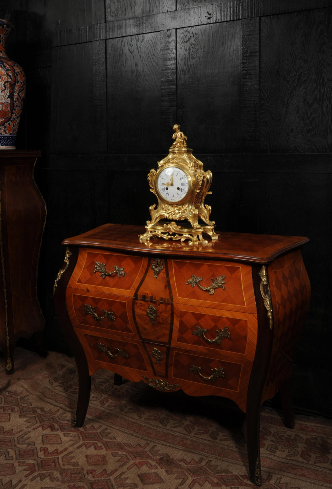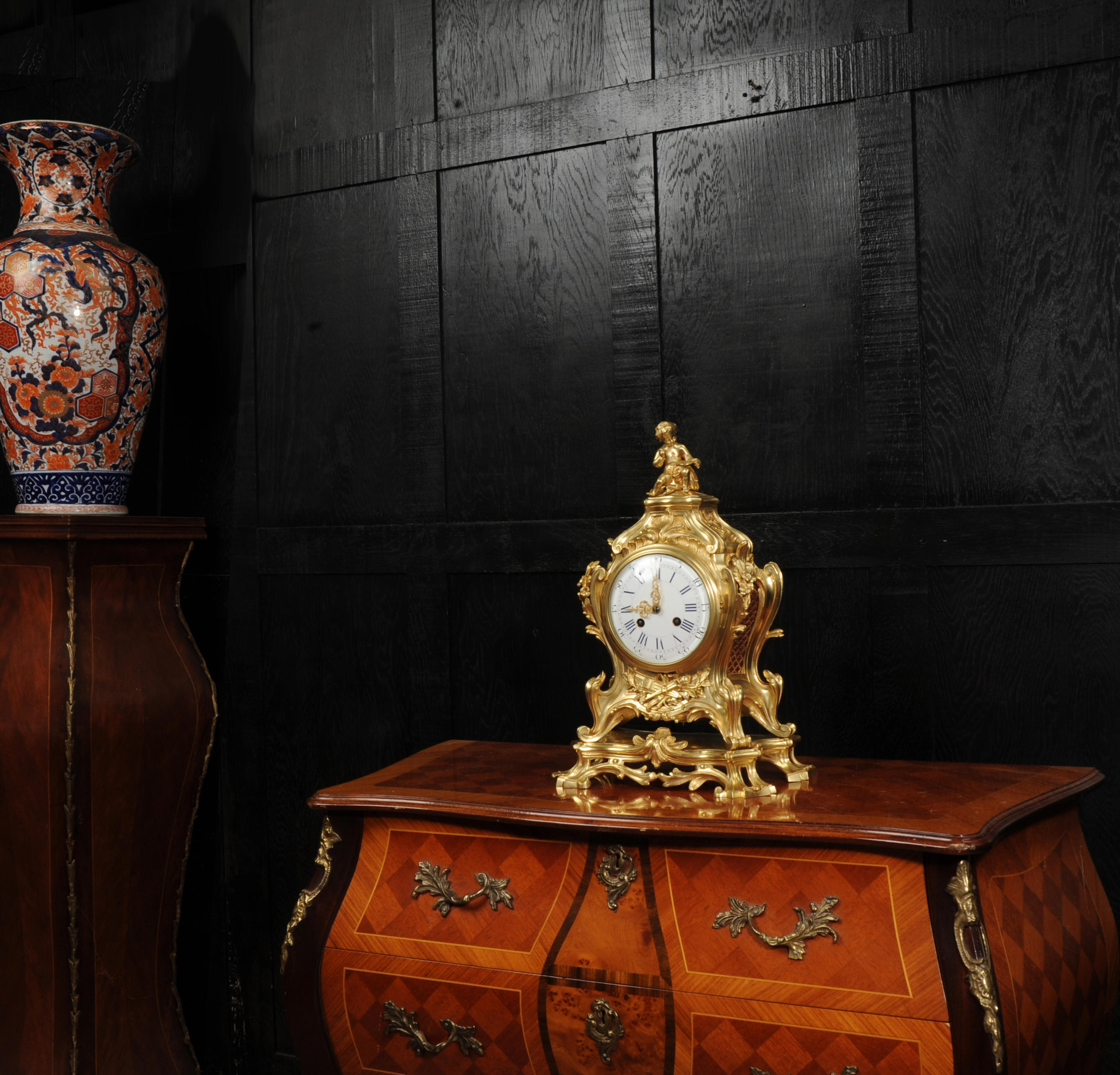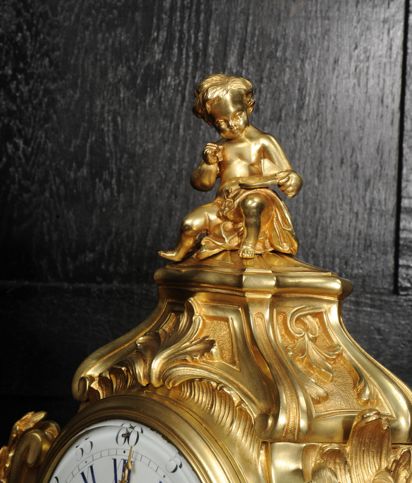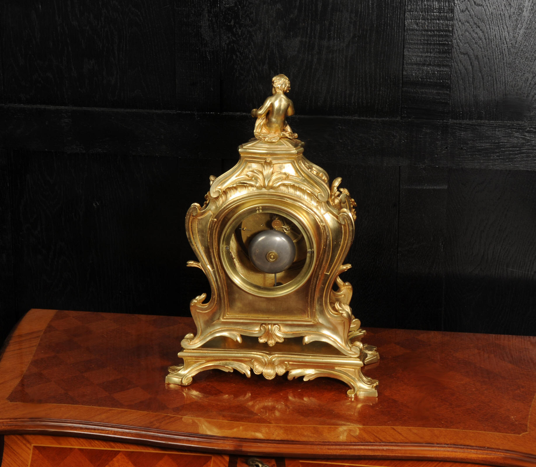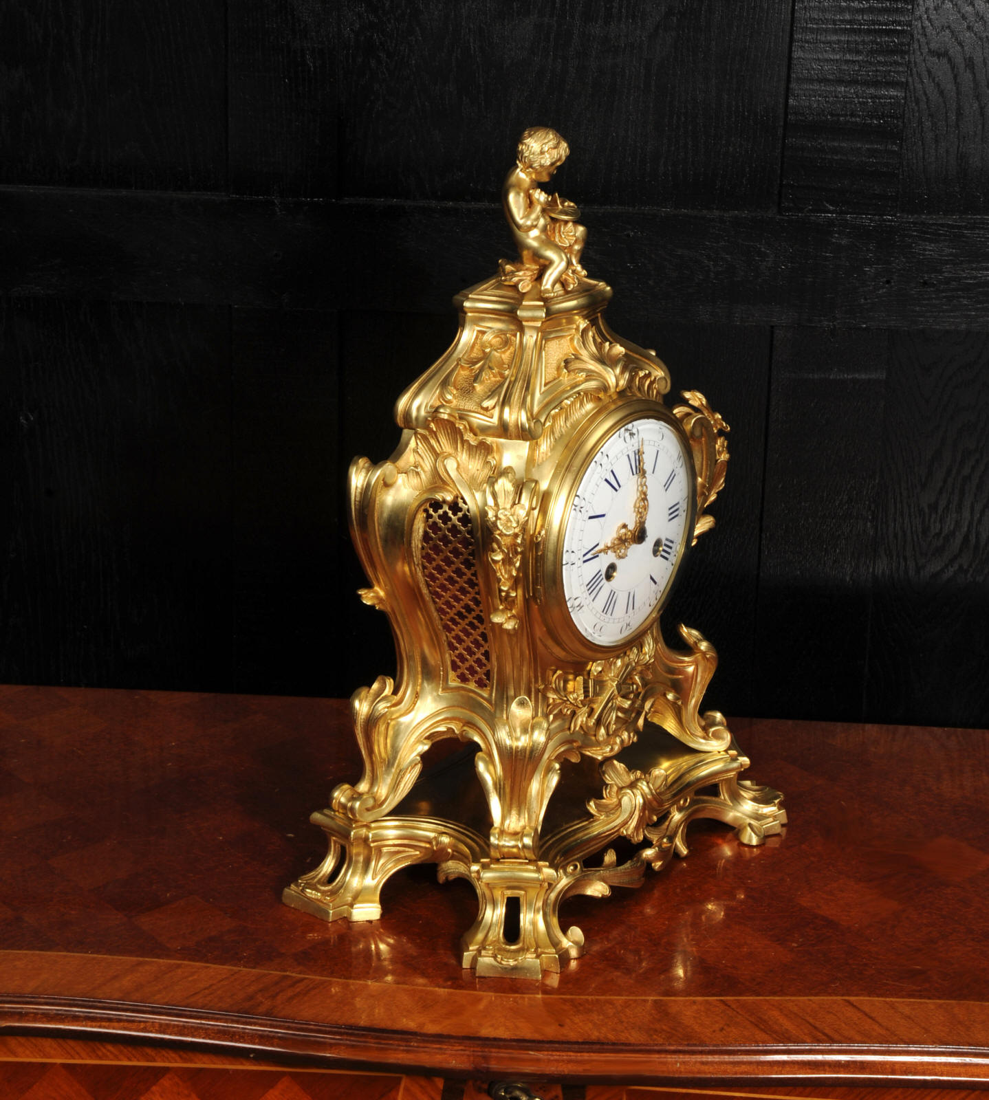 The dial is of porcelain enamel on copper, retaining its original finely pierced gilt-bronze hands and set beneath a convex glass bezel. Beneath the dial, the allegorical symbolism continues with Amor’s quiver of arrows and flaming torch, emblematic of love and enlightenment, nestled among richly cast foliate scrolls and finely chased ornamentation. The sides are mounted with fabric-backed sound frets, lending visual lightness to the design. The polished base subtly reflects the movement of the pendulum, which may be seen gently swinging within the case. A glazed rear door reveals the beautifully finished movement. The case is modelled in the round, making this clock particularly well-suited for display in the centre of a room or on a table. The clock houses a high-quality French movement by Samuel Marti, and is of superb quality. The movement is presented in excellent condition, having been fully overhauled by our specialist clockmaker, and is in perfect working order. It features an eight-day duration, striking the hours and half-hours on a bell with a clear, resonant tone. The pendulum is a sympathetic replacement. Click the video clip to hear the bell and watch the clock running. Condition of the case is excellent, the original gilding is beautifully clean and bright with slight wear and discolouration. There are a couple of small casting faults, including one to the cherubs torso. The dial is also in excellent condition with damage. A comparable model is illustrated in Hans Ottomeyer and Peter Pröschel's, Vergoldete Bronzen: Die Bronzearbeiten des Spätbarock und Klassizismus, Munich, 1986 and also in Giacomo and Aurélie Wannenes', Les plus belles pendules françaises: De Louis XIV à l'Empire, Wannenes Art Publications. Robert Osmond - Bronzier (1711 - 1789). French bronzier Robert Osmond was born in Canisy, near Saint-Lô; he began his apprenticeship in the workshop of Louis Regnard, maître fondeur en terre et en sable, and became a master bronzier in Paris in 1746. He is recorded as working in the rue des Canettes in the St. Sulpice parish, moving to the rue de Mâcon in 1761. Robert Osmond became a juré, thus gaining a certain degree of protection of his creative rights. In 1753, he sent for his nephew in Normandy, and in 1761, the workshop, which by that time had grown considerably, moved to the rue de Macon. The nephew, Jean-Baptiste Osmond (1742-after 1790) became a master in 1764 and as of that date worked closely with his uncle, to such a degree that it is difficult to differentiate between the contributions of each. Robert appears to have retired around 1775. Jean-Baptiste, who remained in charge of the workshop after the retirement of his uncle, encountered difficulties and went bankrupt in 1784. Robert Osmond died in 1789. Prolific bronze casters and chasers, the Osmonds worked with equal success in both the Louis XV and the Neo-classical styles. Prized by connoisseurs of the period, their work was distributed by clockmakers and marchands-merciers. Specialising at first in the rocaille style, in the early 1760’s they turned to the new Neo-classical style and soon numbered among its greatest practitioners. They furnished cases to the best clockmakers of the period.