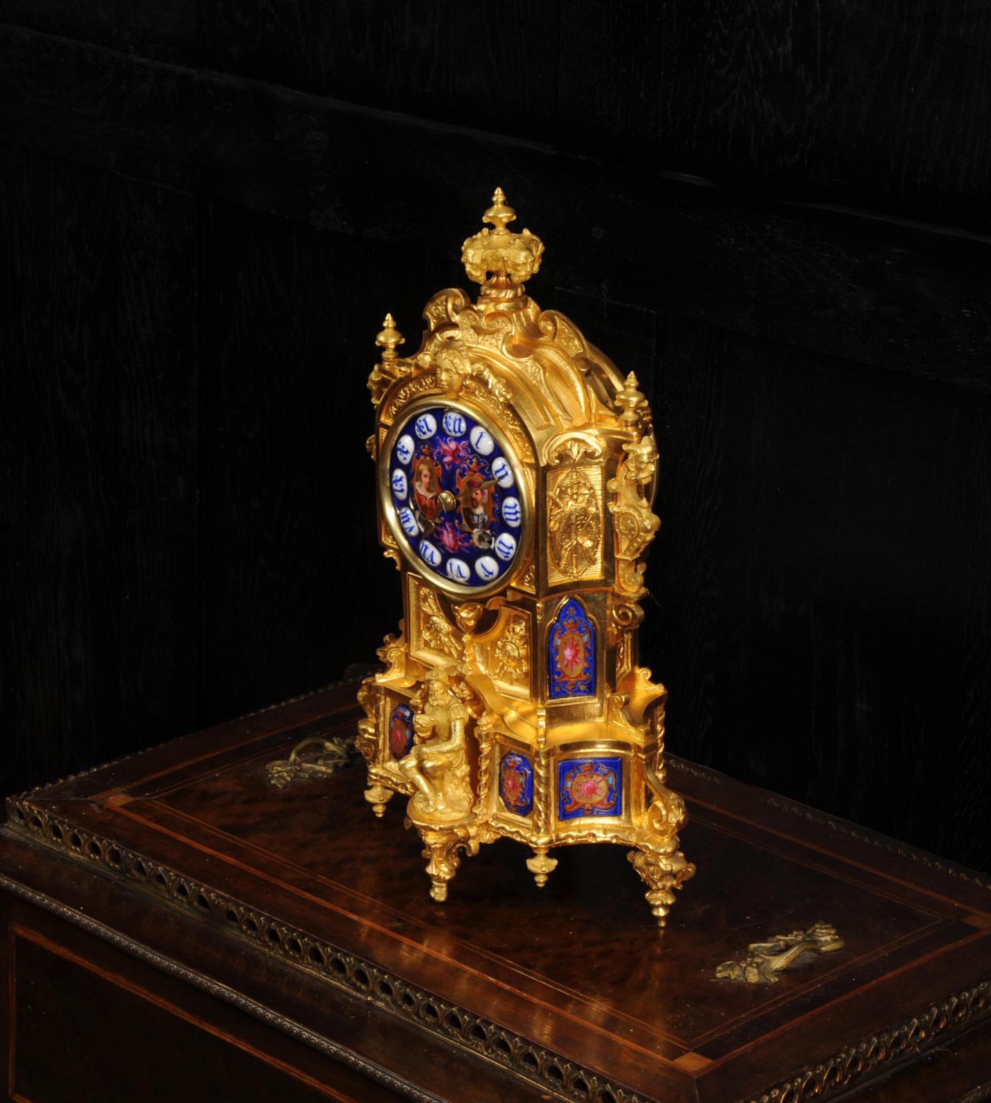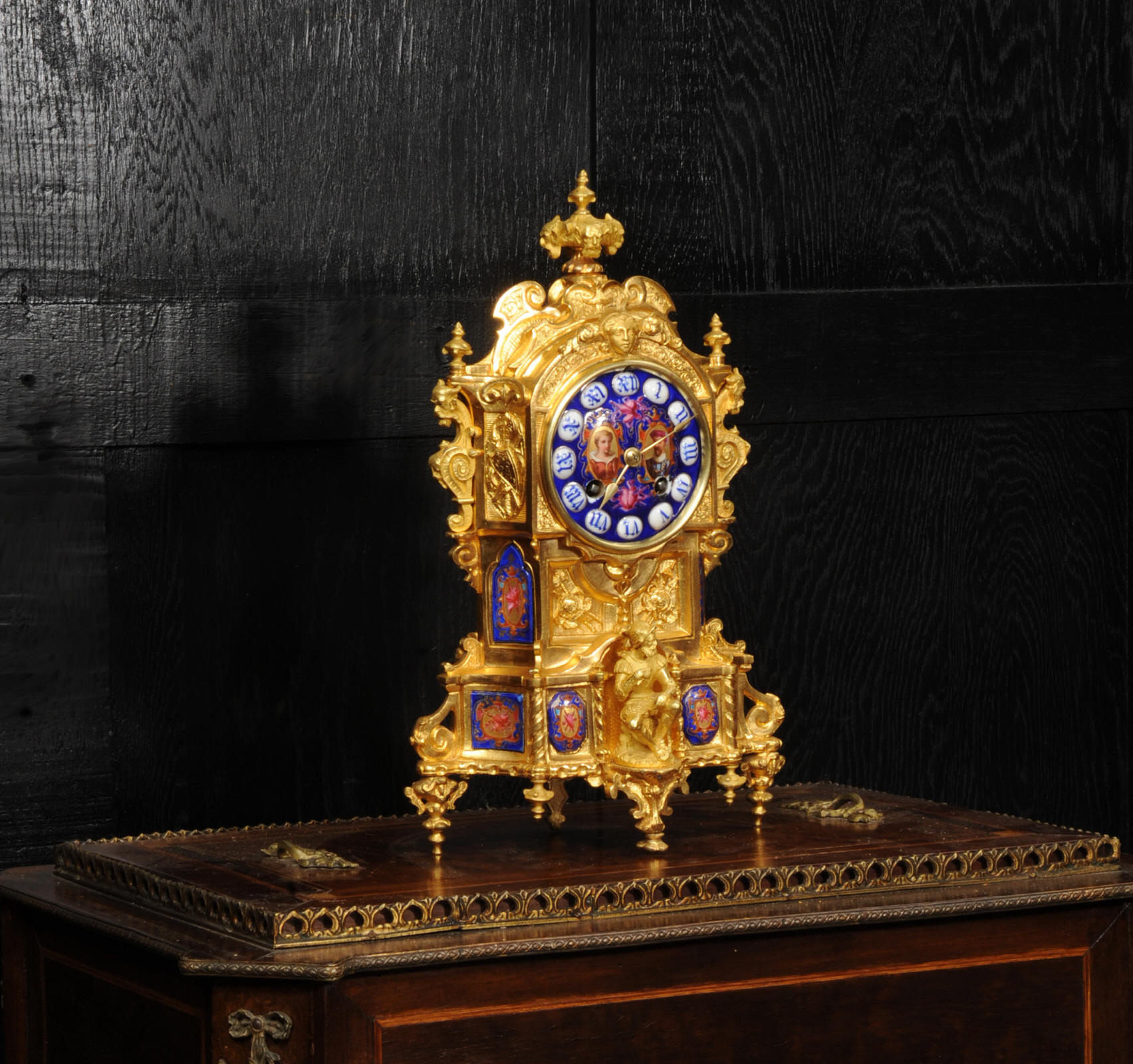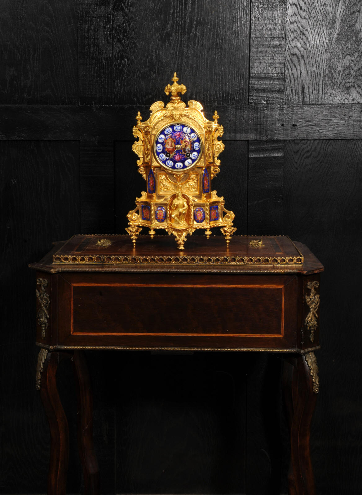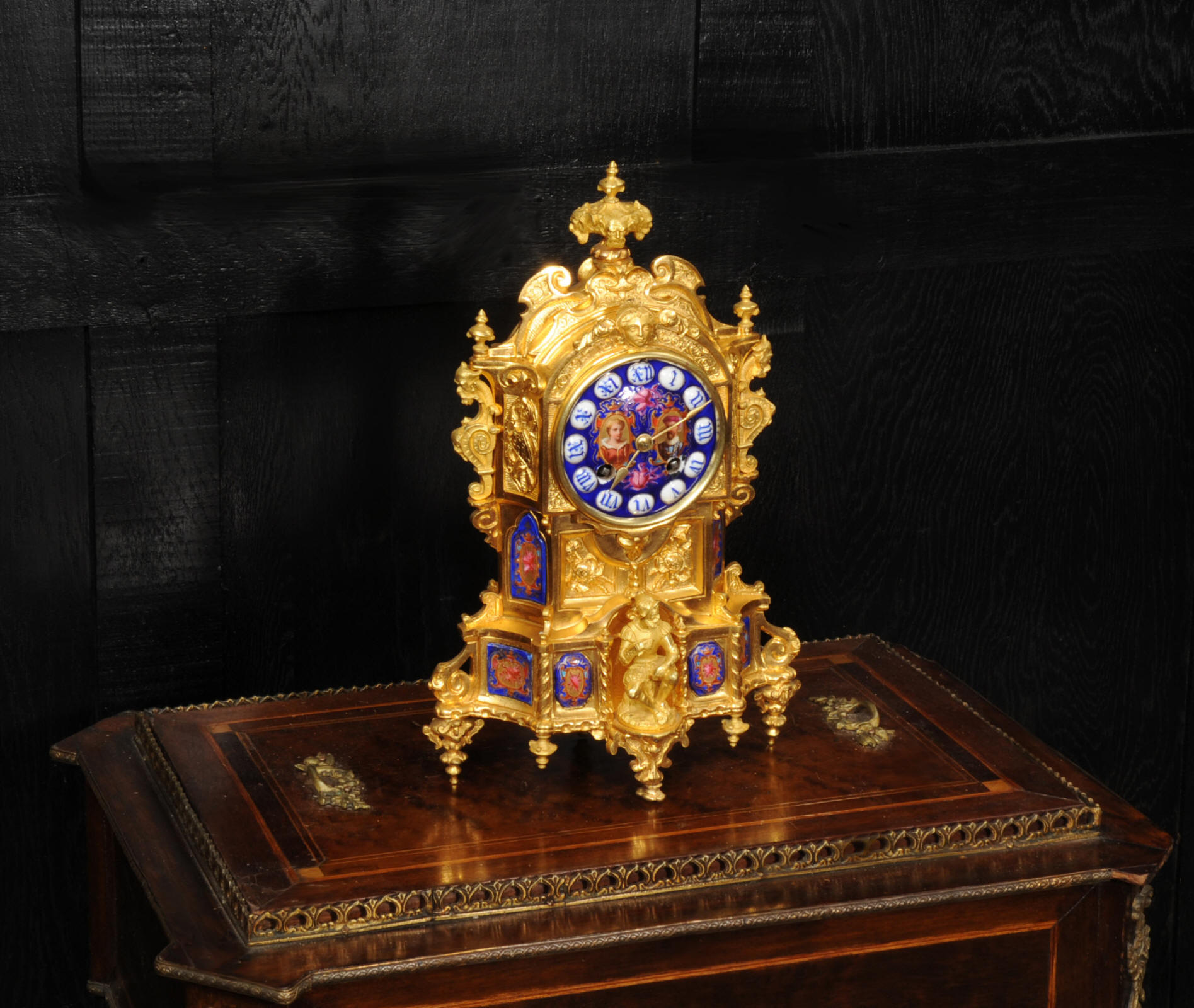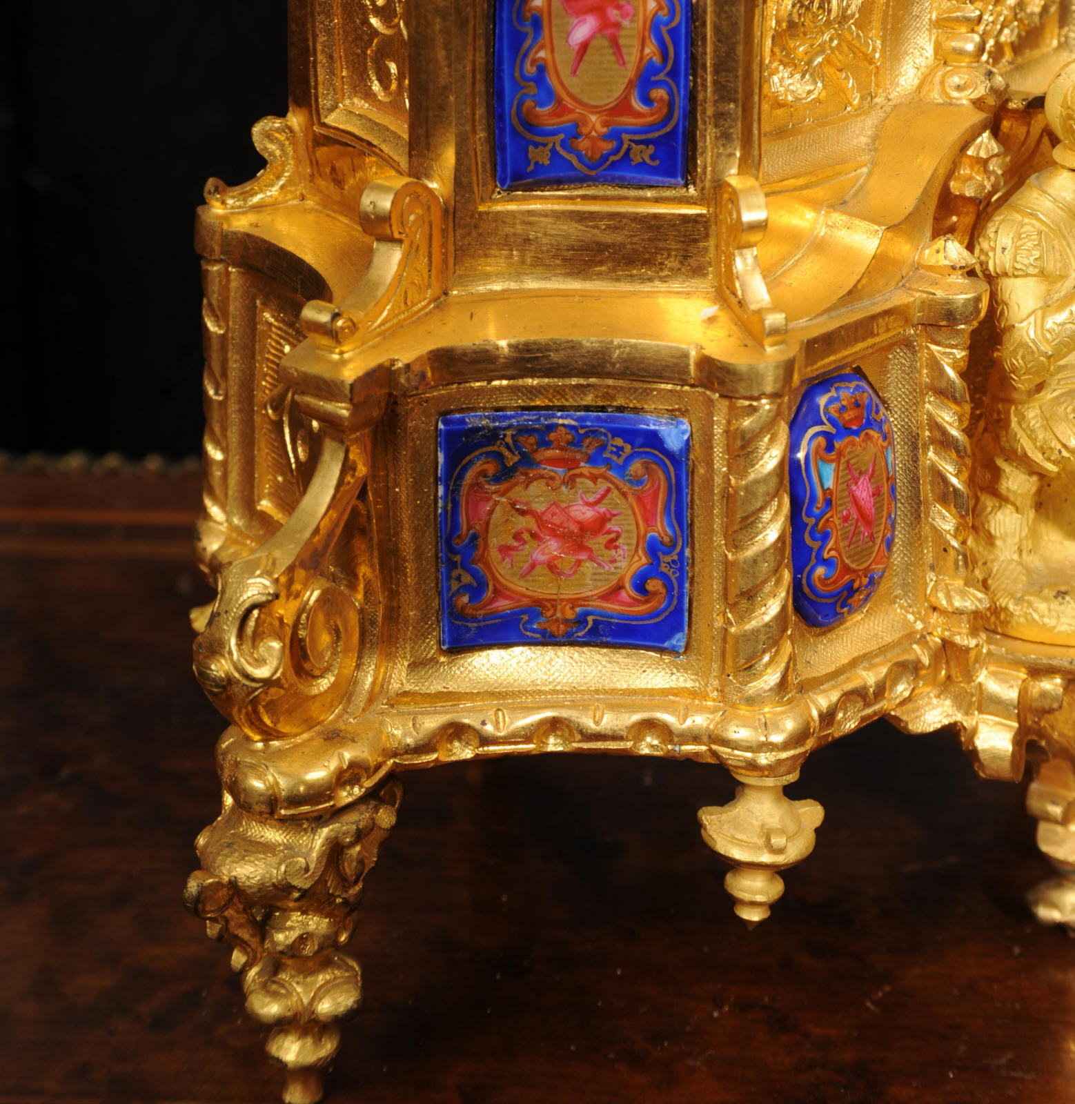 The dial lettered in gothic script and is complete with its original fine brass hands. The rear door is glazed with convex glass to allow the movement to be seen. Please note that this type of clock does not have a front bezel. The French movement is of high quality and is by Vincenti. It is in excellent clean and running condition having been fully overhauled by our clockmaker. Pendulum is original. It runs for 8 days and strikes the hours and halves on a bell. Click the video below to hear the bell and watch the clock running. Condition of the case is excellent, the original gilding is beautifully clean and bright with occasional areas of wear and discolouration. Condition of the porcelain is good, the bottom left panel has some cracking and old restoration. the dial has some chipping around the winding holes.