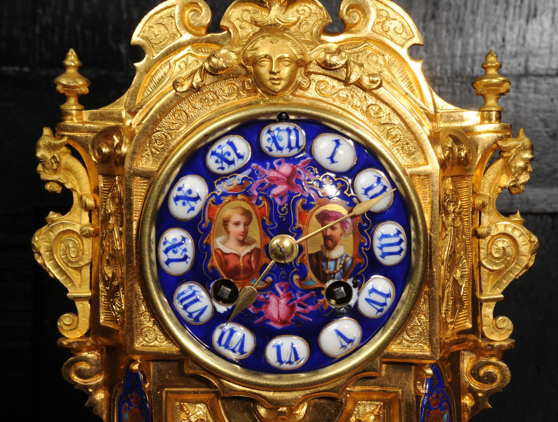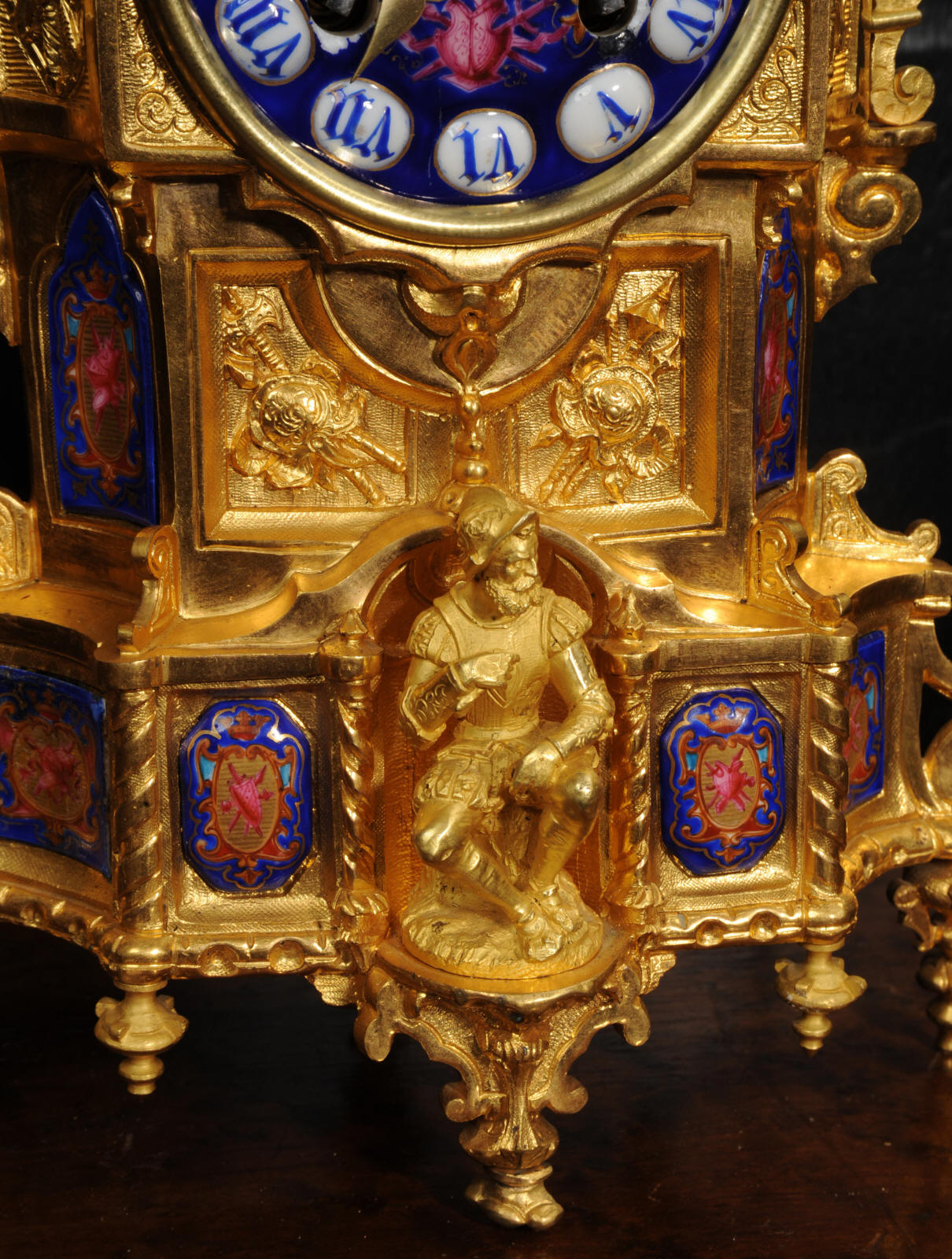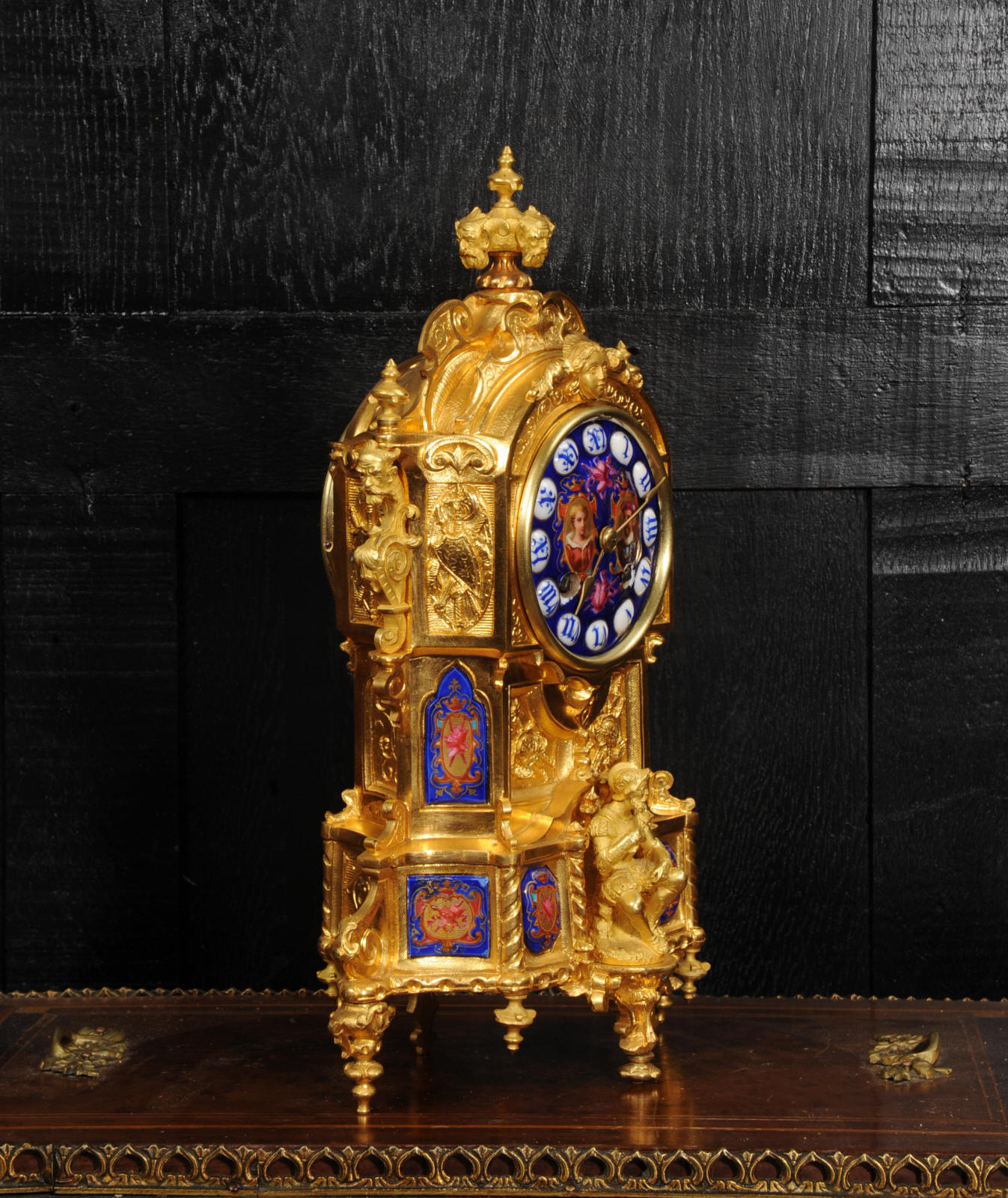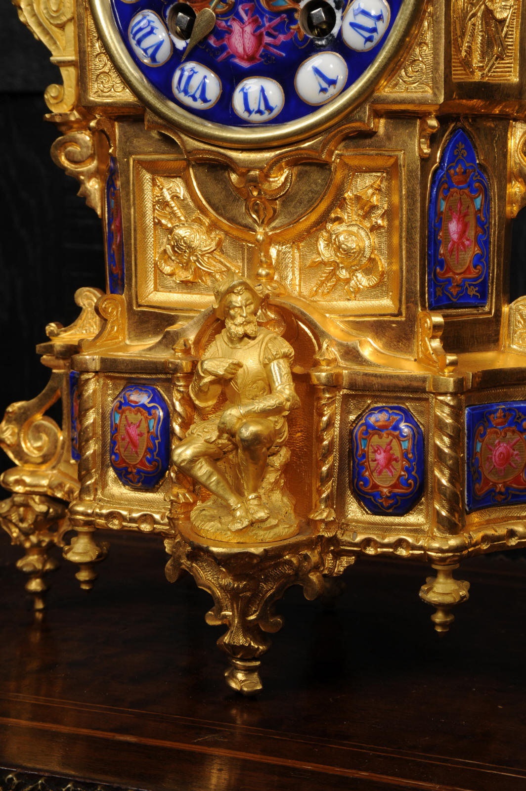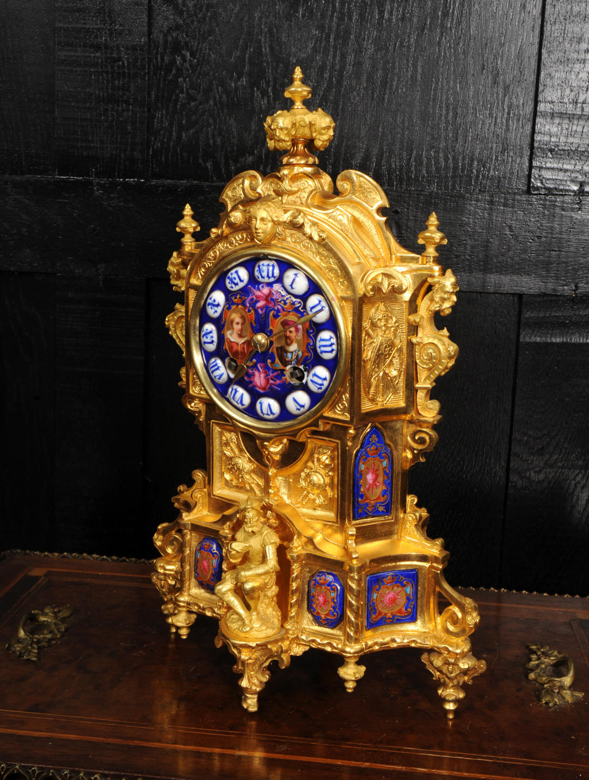 The dial lettered in gothic script and is complete with its original fine brass hands. The rear door is glazed with convex glass to allow the movement to be seen. Please note that this type of clock does not have a front bezel. The French movement is of high quality and is by Vincenti. It is in excellent clean and running condition having been fully overhauled by our clockmaker. Pendulum is original. It runs for 8 days and strikes the hours and halves on a bell. Click the video below to hear the bell and watch the clock running. Condition of the case is excellent, the original gilding is beautifully clean and bright with occasional areas of wear and discolouration. Condition of the porcelain is good, the bottom left panel has some cracking and old restoration. the dial has some chipping around the winding holes.