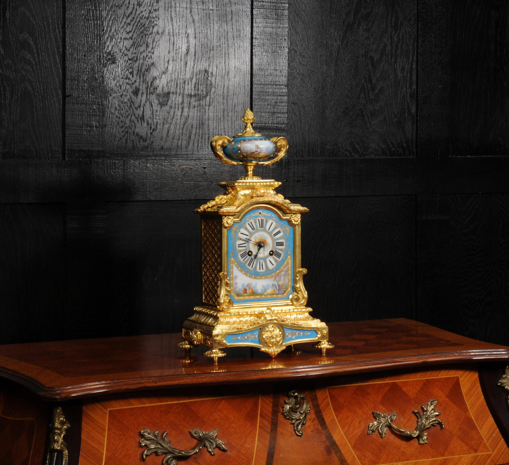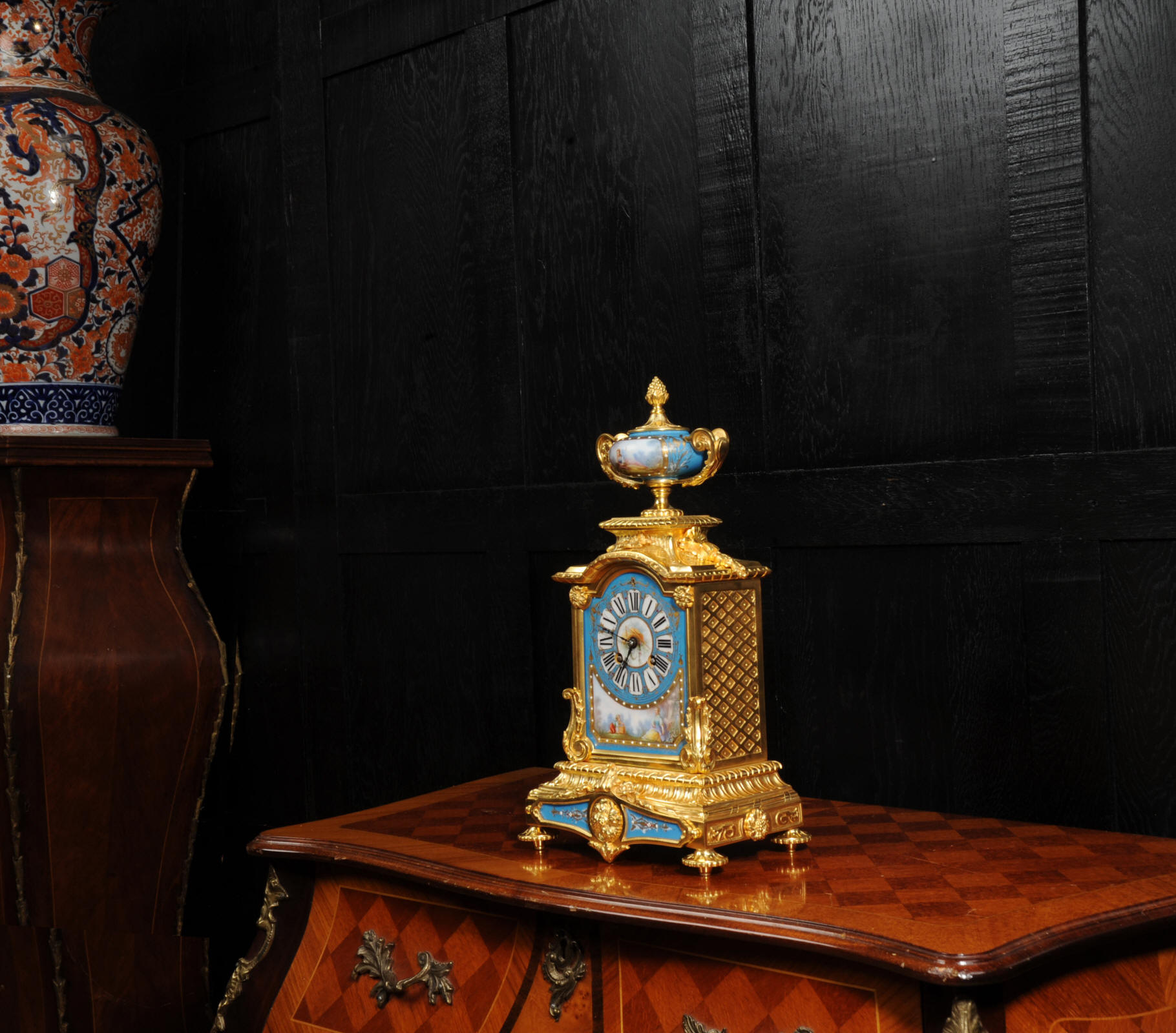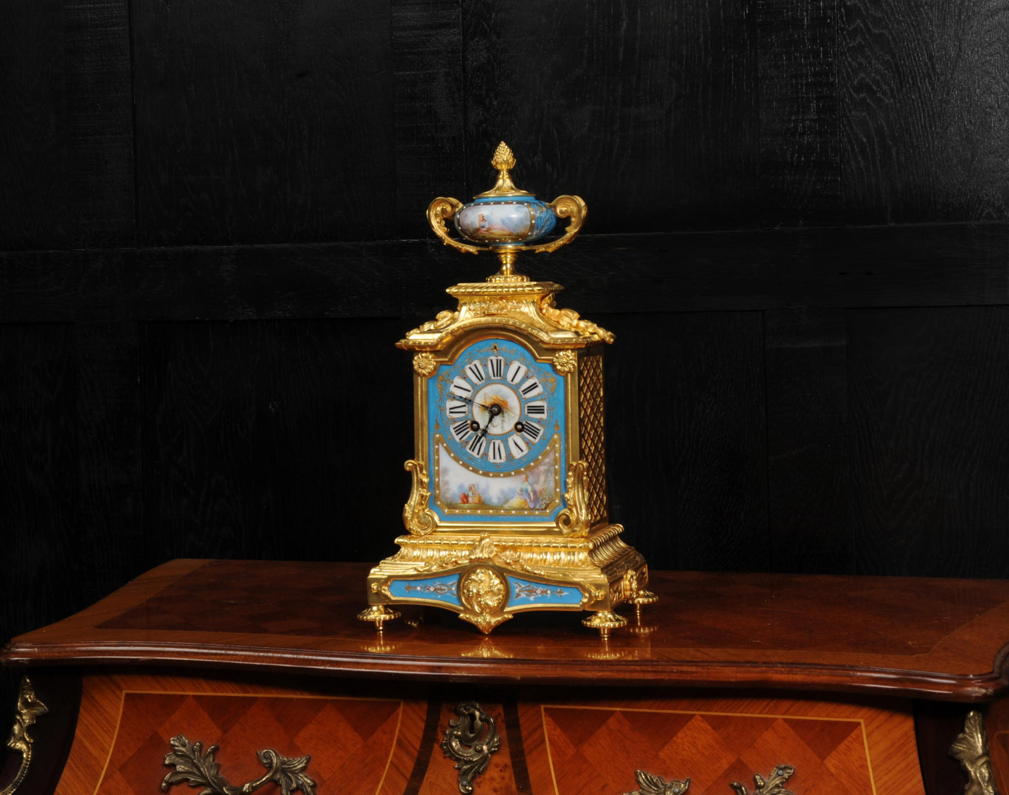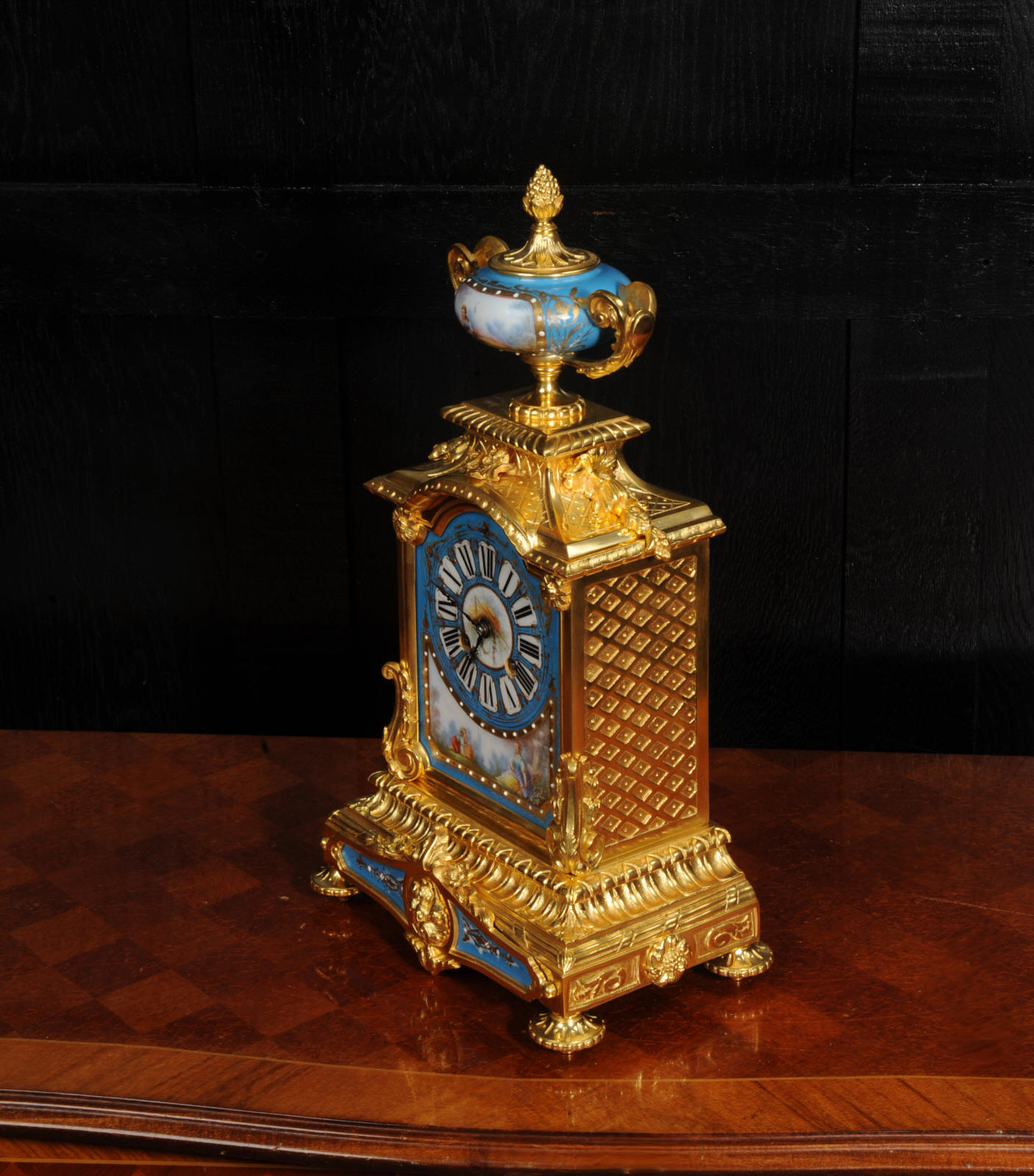 To the top is a large urn, painted with a scene of the young woman in a romantic country setting. The dial is beautifully decorated with delicate overglaze gilt decoration. The porcelain is signed to the rear. Please note that this type of clock does not have a glazed front door. The French movement is of very high quality and has the clockmaker's mark on the movement backplate. Pendulum is a replacement. It is in excellent clean and running condition having been fully overhauled by our clockmaker. It runs for 8 days on one wind and strikes the hours and halves on a bell. Click the video to hear the bell and watch the clock running. Condition of the case is superb, gilding is in original condition with a clean and bright finish. The porcelain is in good condition, some wear to the overglaze decoration and also some wear to the blue ground. There are some chips around the winding holes. Some of the red and white applied jewels are missing. This is a fine and very decorative clock to add to your collection. The firm of Richard and Co was founded in Paris in 1848 and added a branch in London in 1857. (Carriage Clocks, Charles Allix). The company continued until 1881.