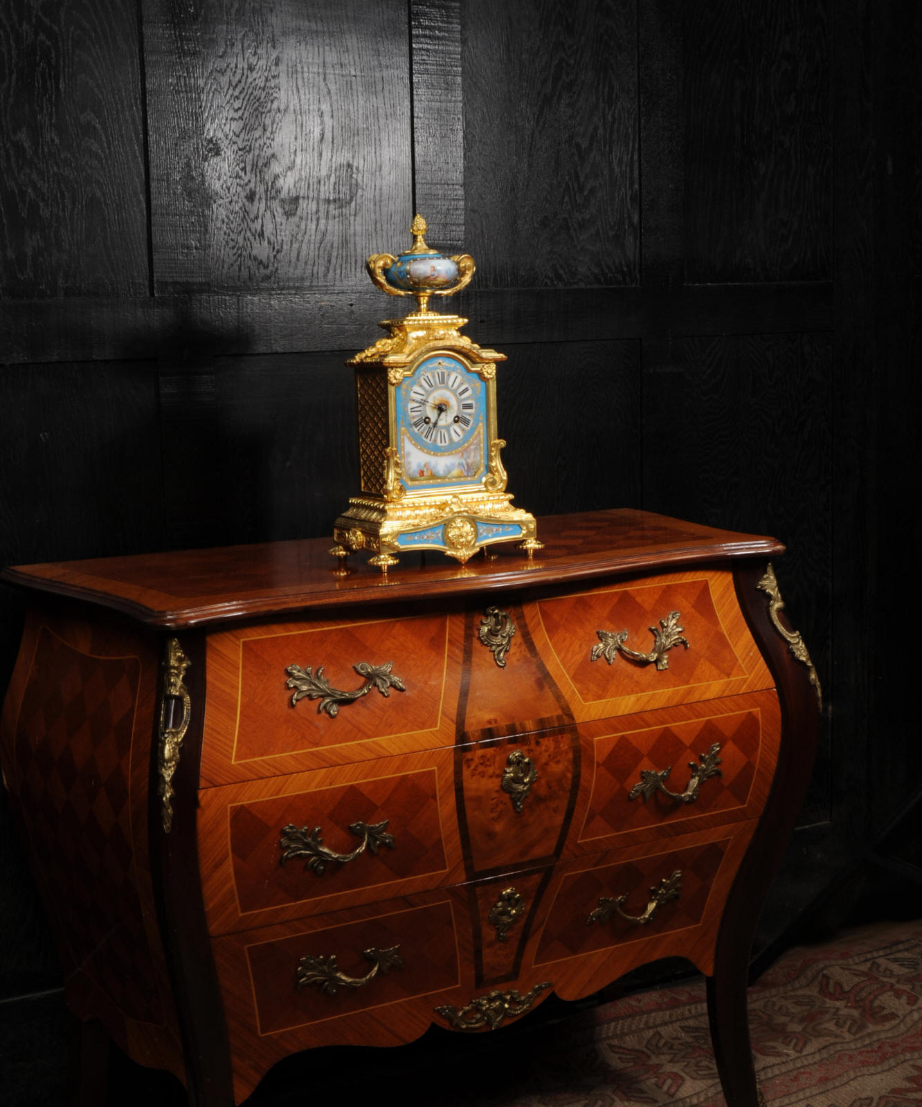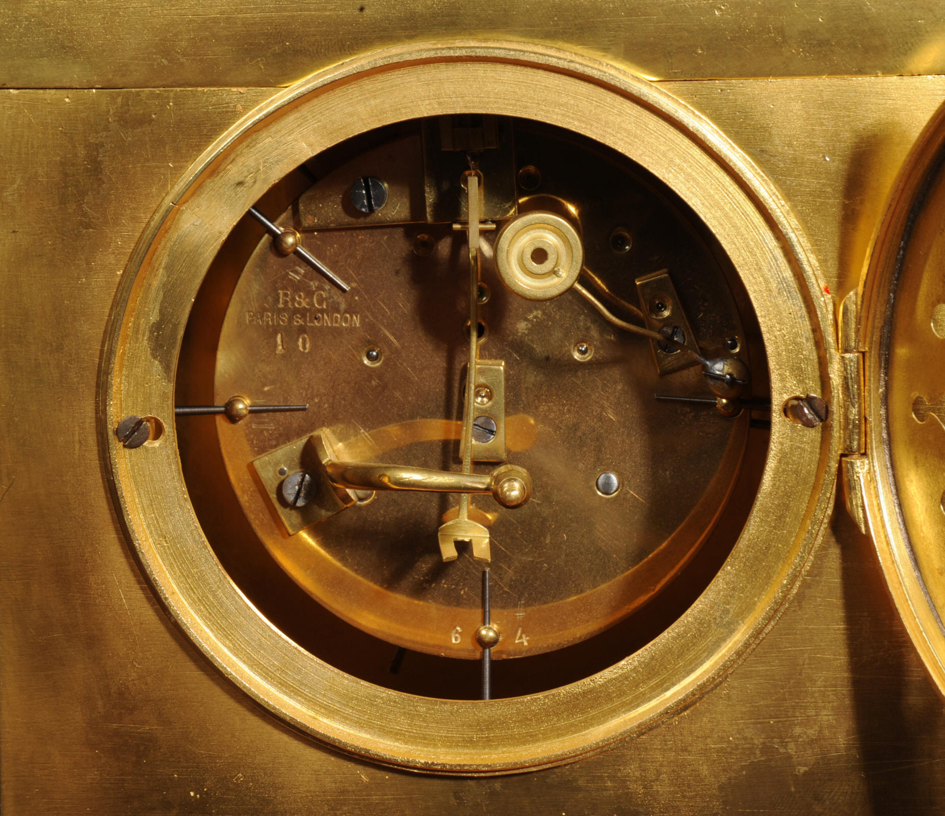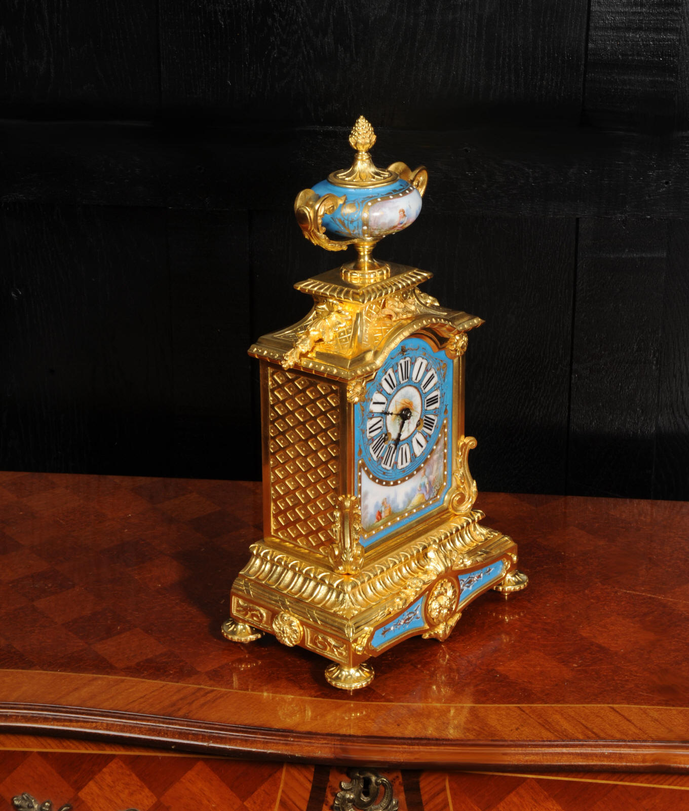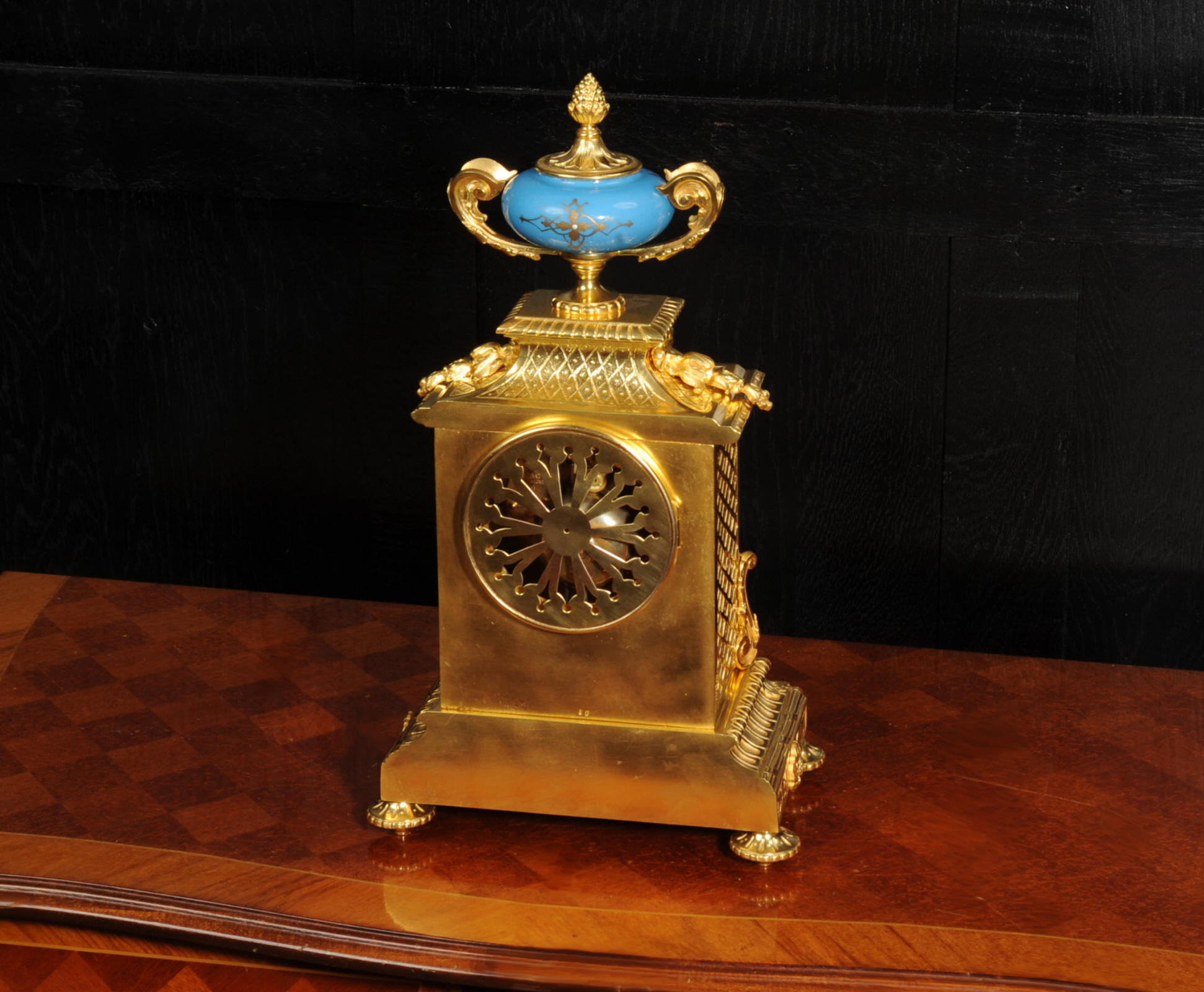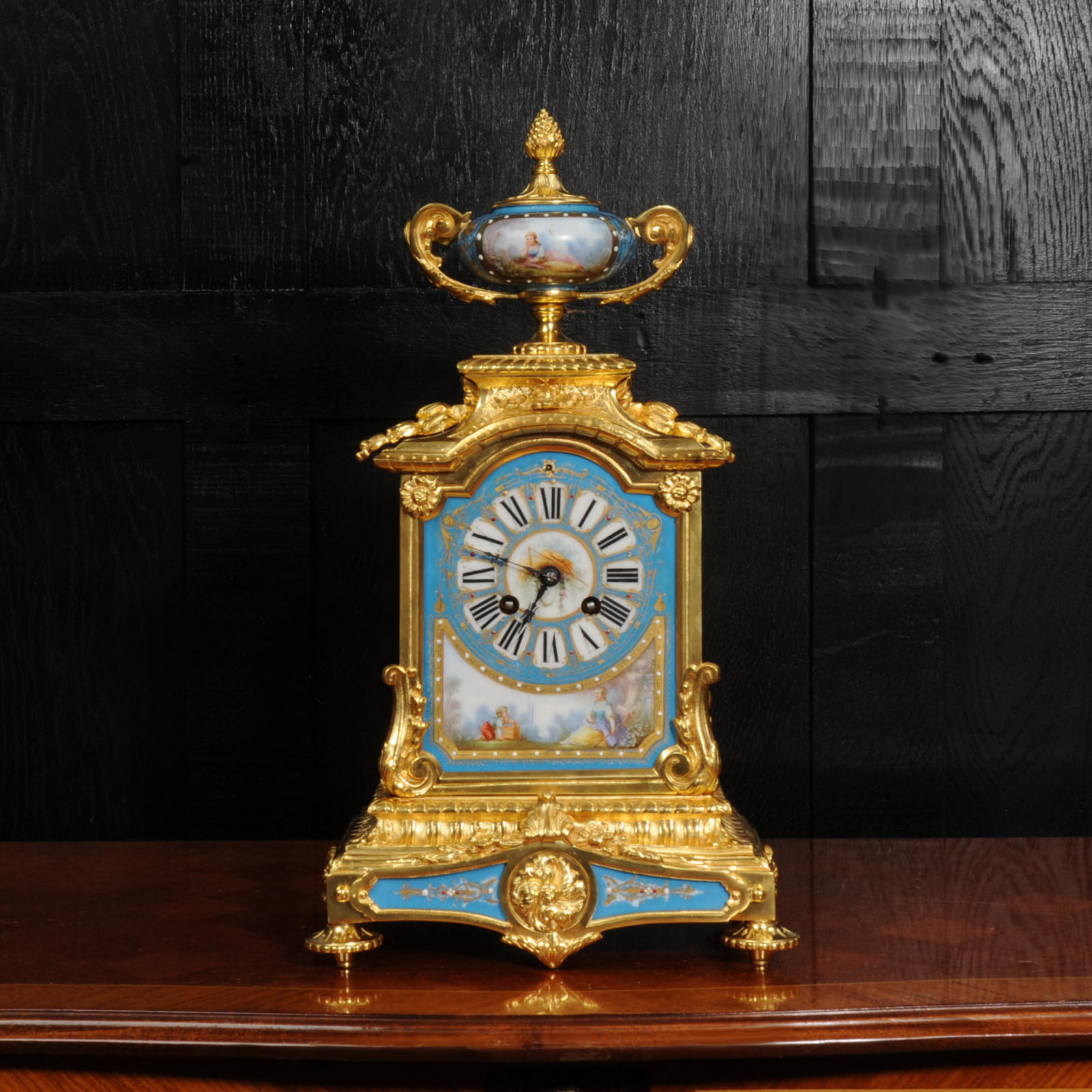 To the top is a large urn, painted with a scene of the young woman in a romantic country setting. The dial is beautifully decorated with delicate overglaze gilt decoration. The porcelain is signed to the rear. Please note that this type of clock does not have a glazed front door. The French movement is of very high quality and has the clockmaker's mark on the movement backplate. Pendulum is a replacement. It is in excellent clean and running condition having been fully overhauled by our clockmaker. It runs for 8 days on one wind and strikes the hours and halves on a bell. Click the video to hear the bell and watch the clock running. Condition of the case is superb, gilding is in original condition with a clean and bright finish. The porcelain is in good condition, some wear to the overglaze decoration and also some wear to the blue ground. There are some chips around the winding holes. Some of the red and white applied jewels are missing. This is a fine and very decorative clock to add to your collection. The firm of Richard and Co was founded in Paris in 1848 and added a branch in London in 1857. (Carriage Clocks, Charles Allix). The company continued until 1881.