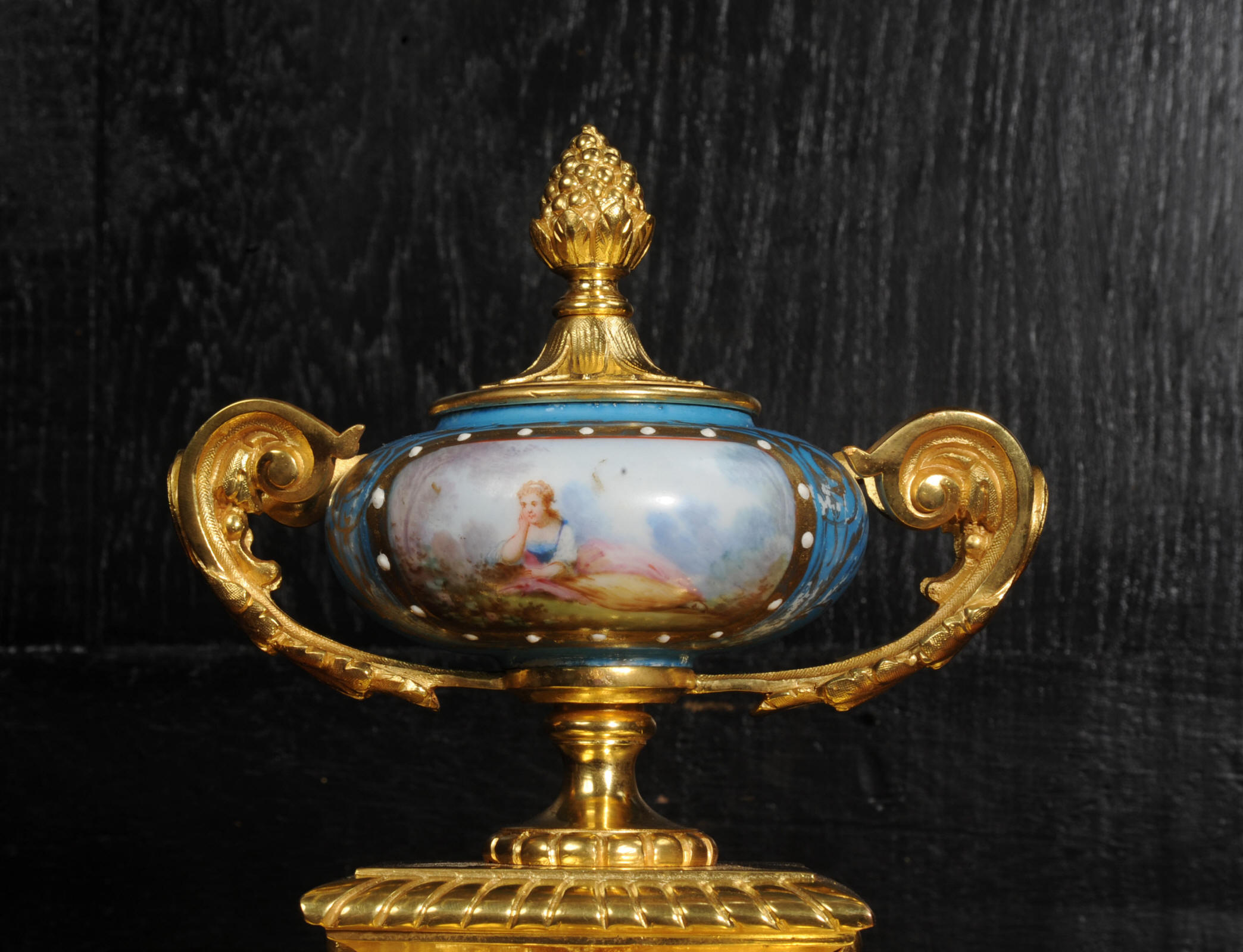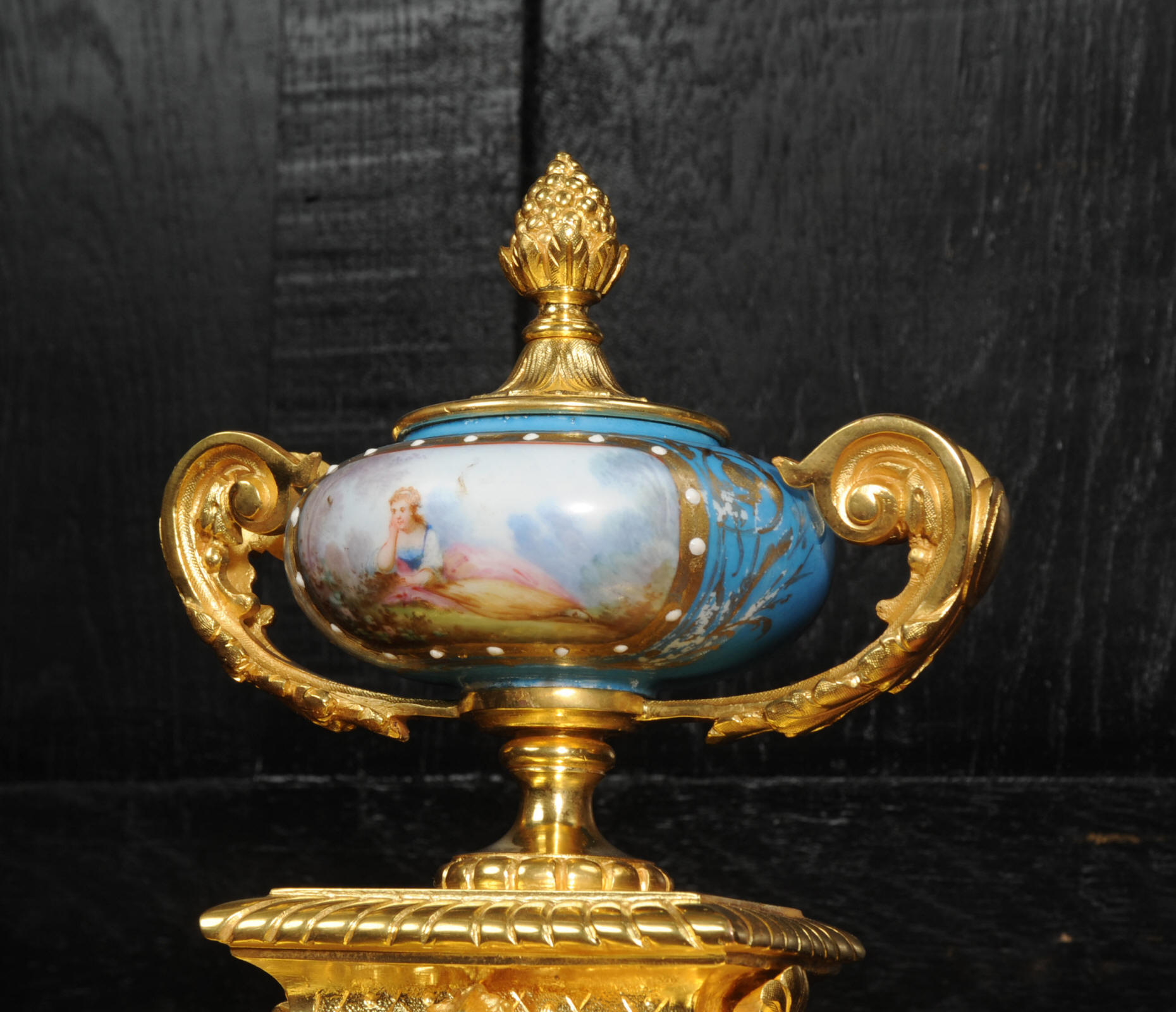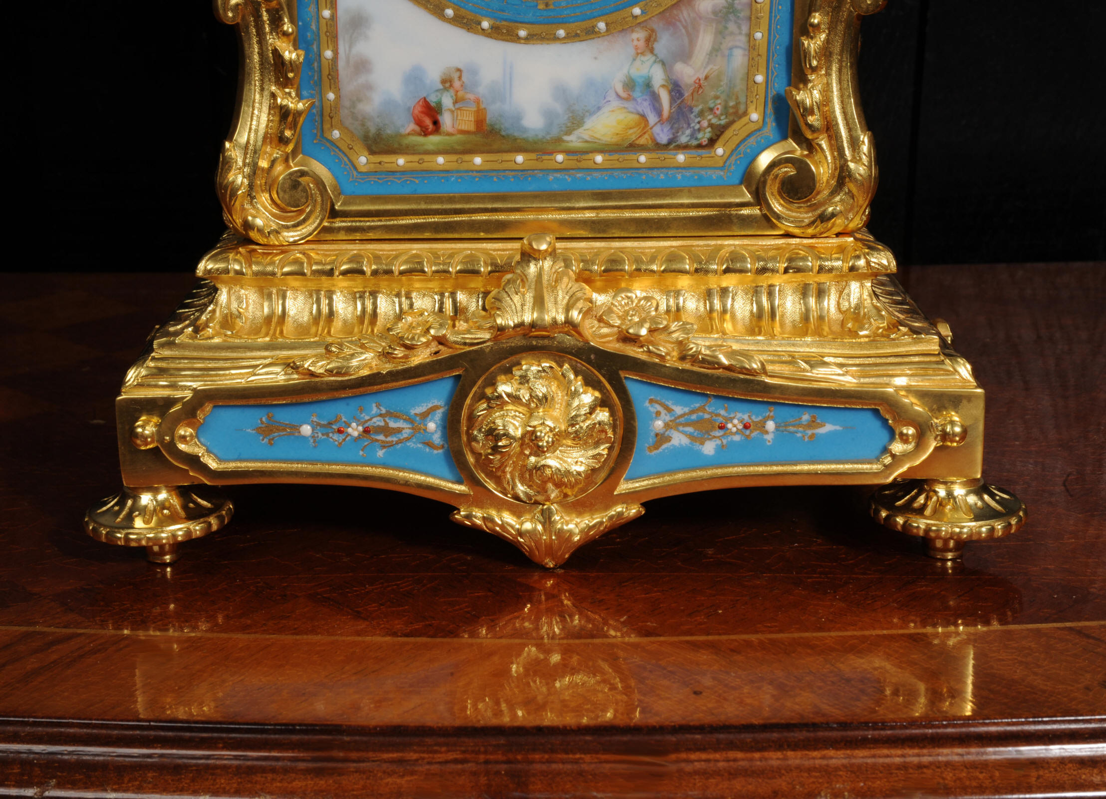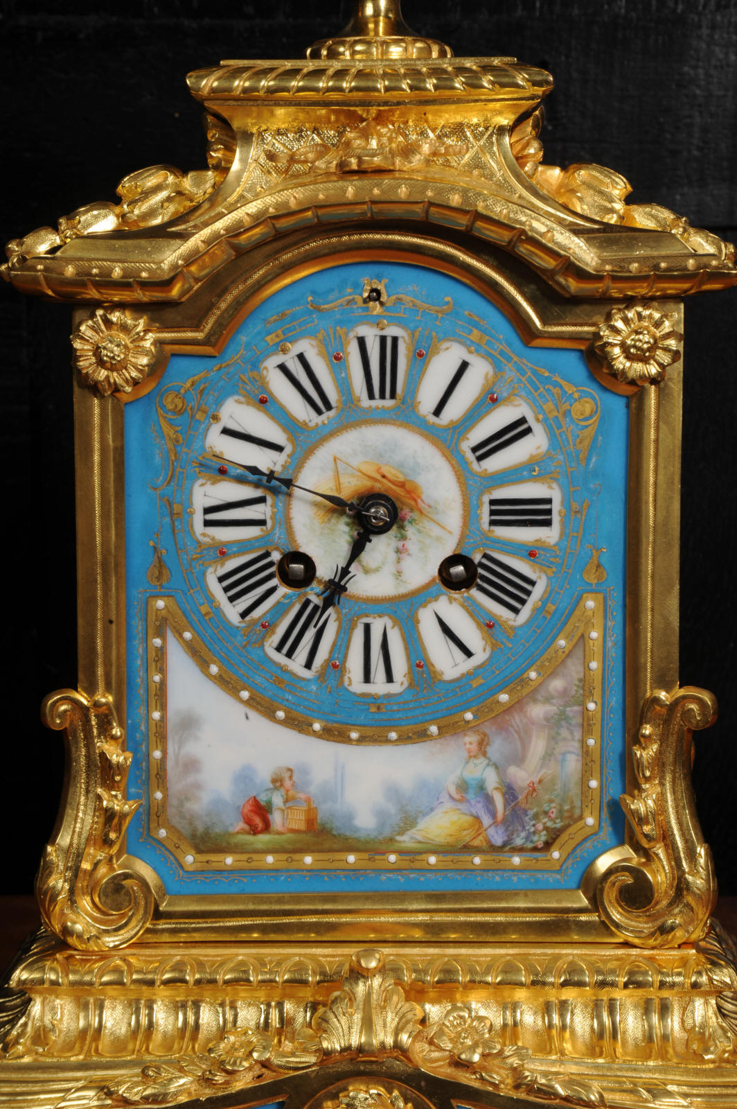 To the top is a large urn, painted with a scene of the young woman in a romantic country setting. The dial is beautifully decorated with delicate overglaze gilt decoration. The porcelain is signed to the rear. Please note that this type of clock does not have a glazed front door. The French movement is of very high quality and has the clockmaker's mark on the movement backplate. Pendulum is a replacement. It is in excellent clean and running condition having been fully overhauled by our clockmaker. It runs for 8 days on one wind and strikes the hours and halves on a bell. Click the video to hear the bell and watch the clock running. Condition of the case is superb, gilding is in original condition with a clean and bright finish. The porcelain is in good condition, some wear to the overglaze decoration and also some wear to the blue ground. There are some chips around the winding holes. Some of the red and white applied jewels are missing. This is a fine and very decorative clock to add to your collection. The firm of Richard and Co was founded in Paris in 1848 and added a branch in London in 1857. (Carriage Clocks, Charles Allix). The company continued until 1881.