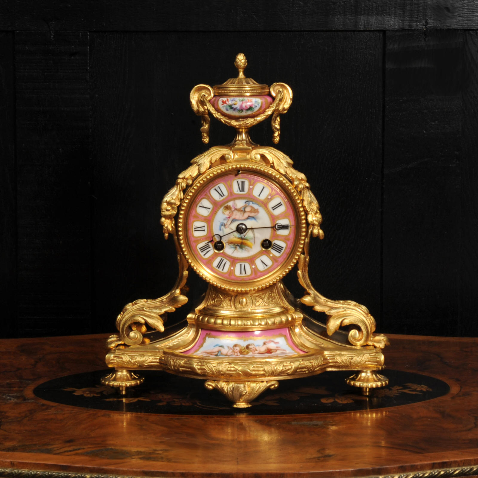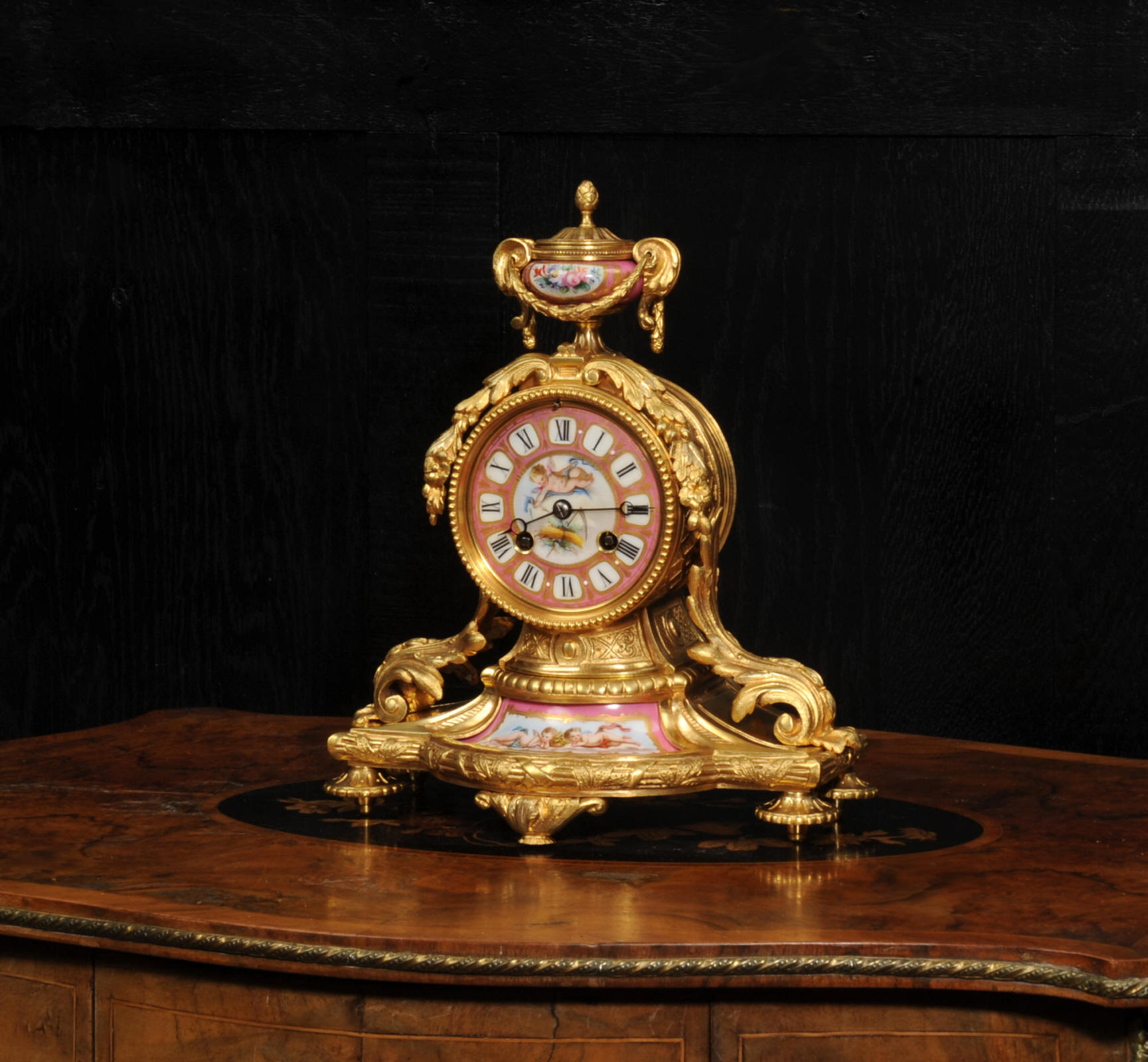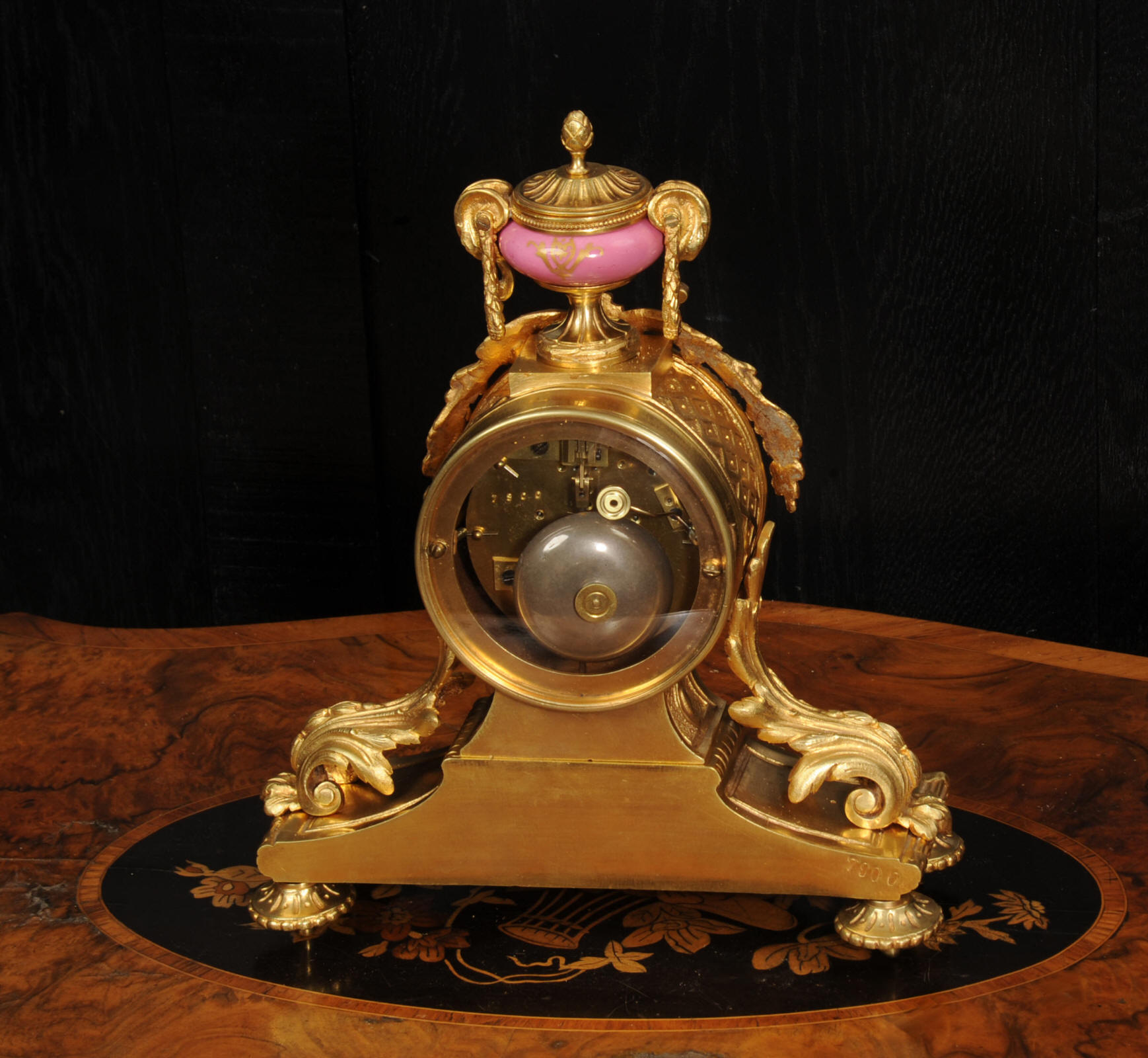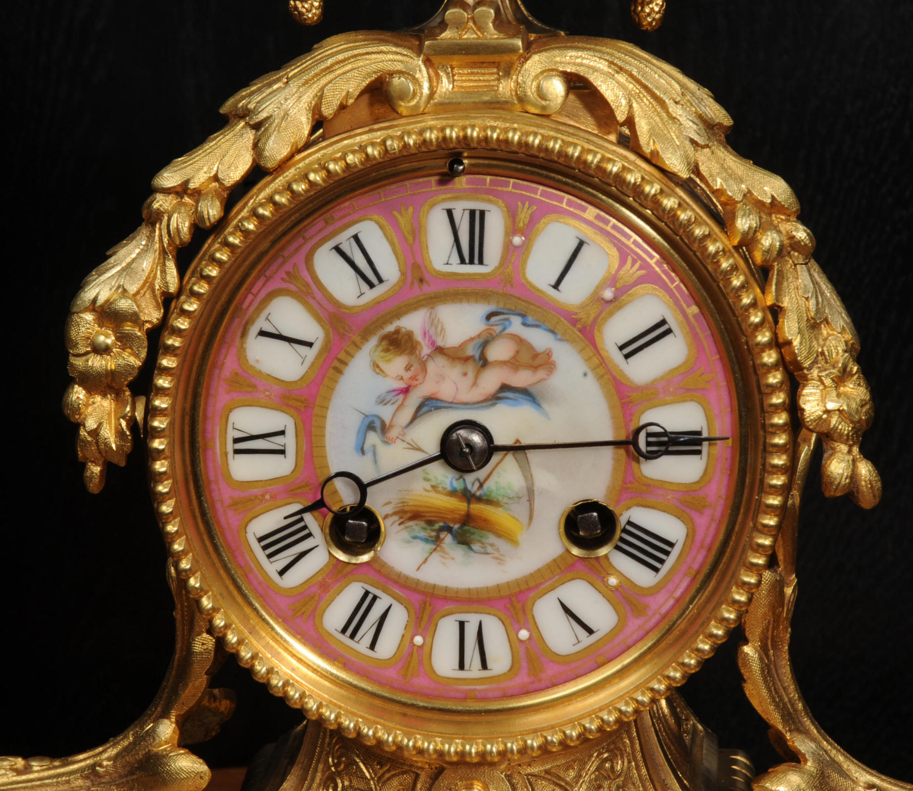 The porcelain dial shows a lovely depiction of cupid as a cherub with his arrow. Above the dial is a porcelain urn, delicately painted with a floral swag and mounted with ormolu handles and a pineapple finial. The rear door is glazed with convex glass to allow the movement to be seen. Please note that this style of clock does not have a glazed bezel over the dial. The French movement is of high quality and is by Japy Frères. It is in excellent clean and running condition having been fully overhauled by our clockmaker. Pendulum is original. It runs for 8 days and strikes the hours and halves on a bell. Click the video below to hear the bell and watch the clock running. Condition of the case is excellent, the original gilding is beautifully clean and bright with some slight wear, discolouration and tarnish. Porcelain is also in excellent condition with some very occasional and slight wear to the over-glaze gilt decoration. Some of the half hour jewel marks on the dial missing.