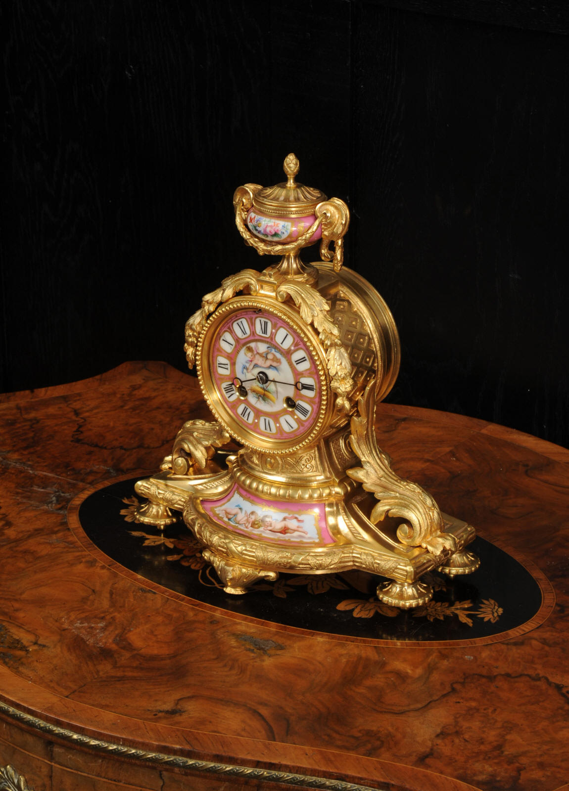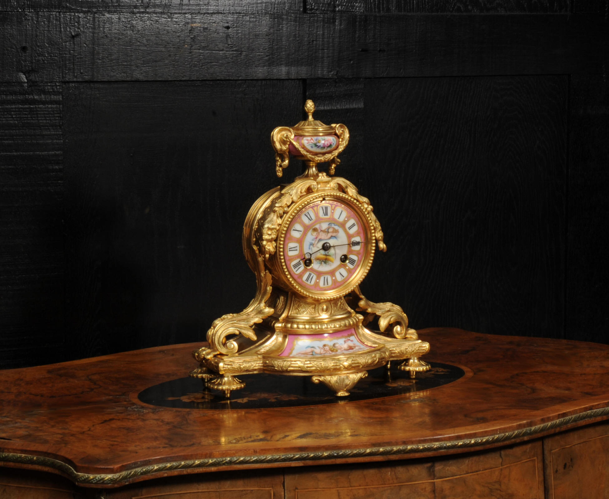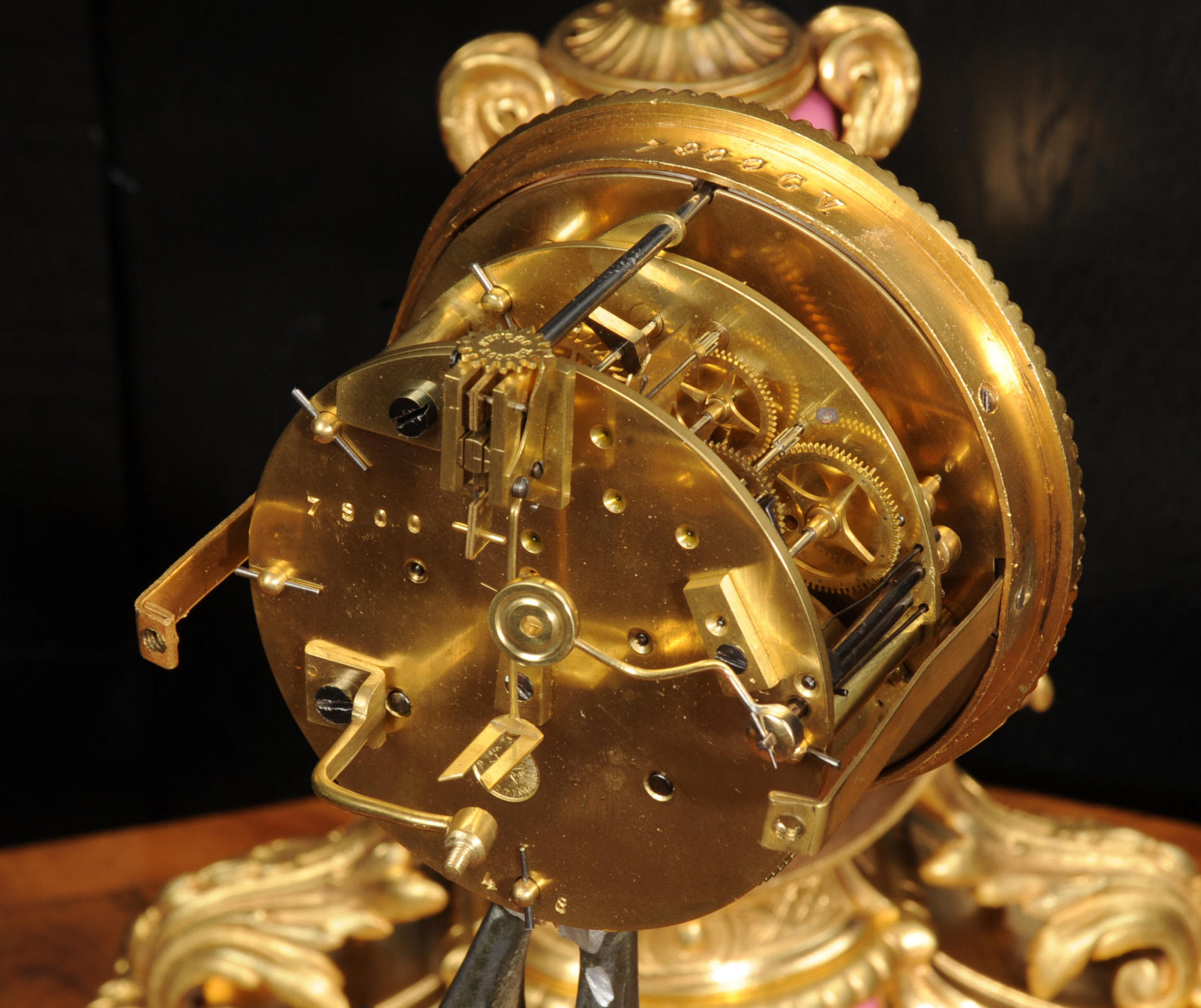 The porcelain dial shows a lovely depiction of cupid as a cherub with his arrow. Above the dial is a porcelain urn, delicately painted with a floral swag and mounted with ormolu handles and a pineapple finial. The rear door is glazed with convex glass to allow the movement to be seen. Please note that this style of clock does not have a glazed bezel over the dial. The French movement is of high quality and is by Japy Frères. It is in excellent clean and running condition having been fully overhauled by our clockmaker. Pendulum is original. It runs for 8 days and strikes the hours and halves on a bell. Click the video below to hear the bell and watch the clock running. Condition of the case is excellent, the original gilding is beautifully clean and bright with some slight wear, discolouration and tarnish. Porcelain is also in excellent condition with some very occasional and slight wear to the over-glaze gilt decoration. Some of the half hour jewel marks on the dial missing.