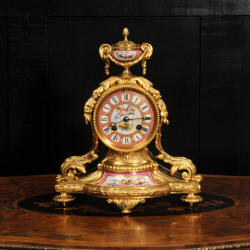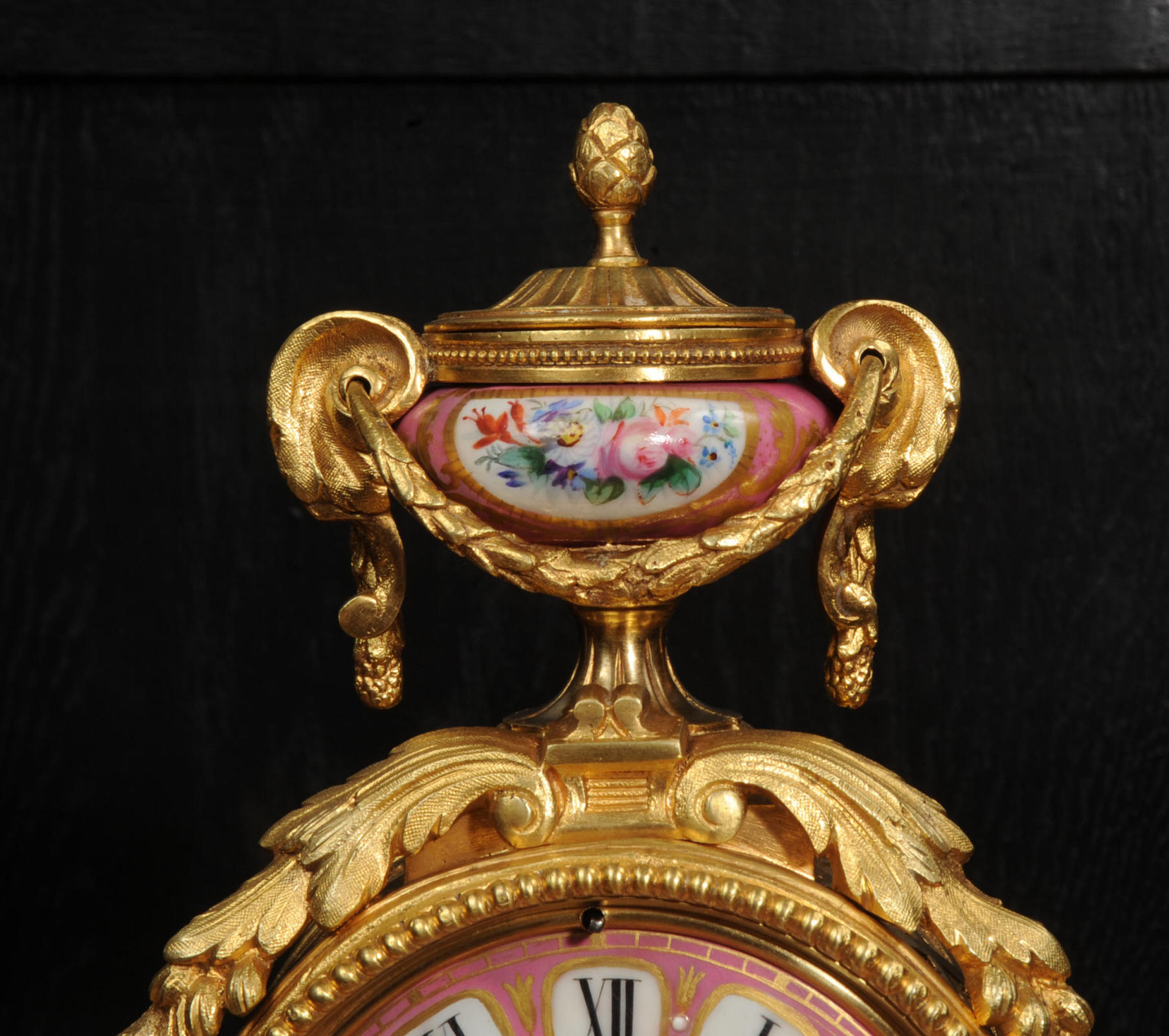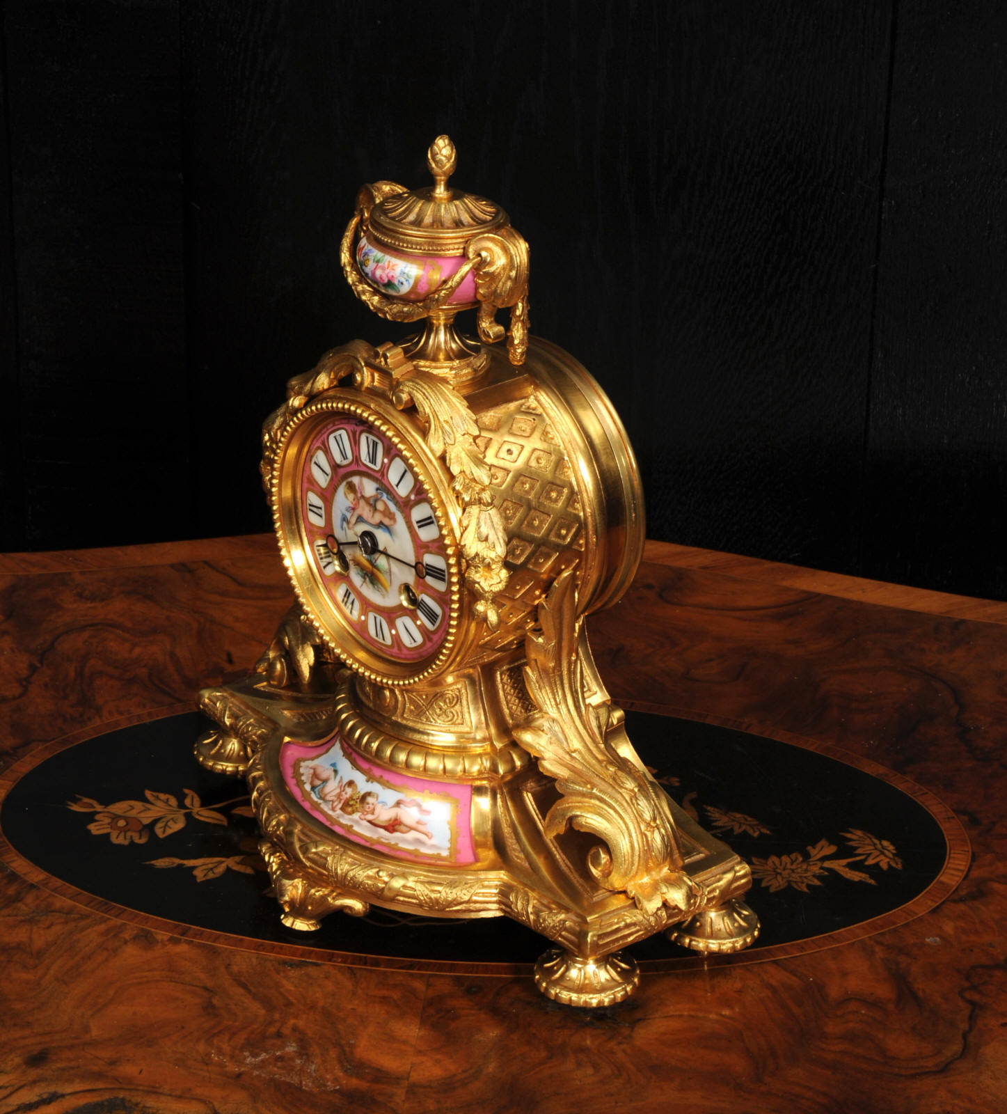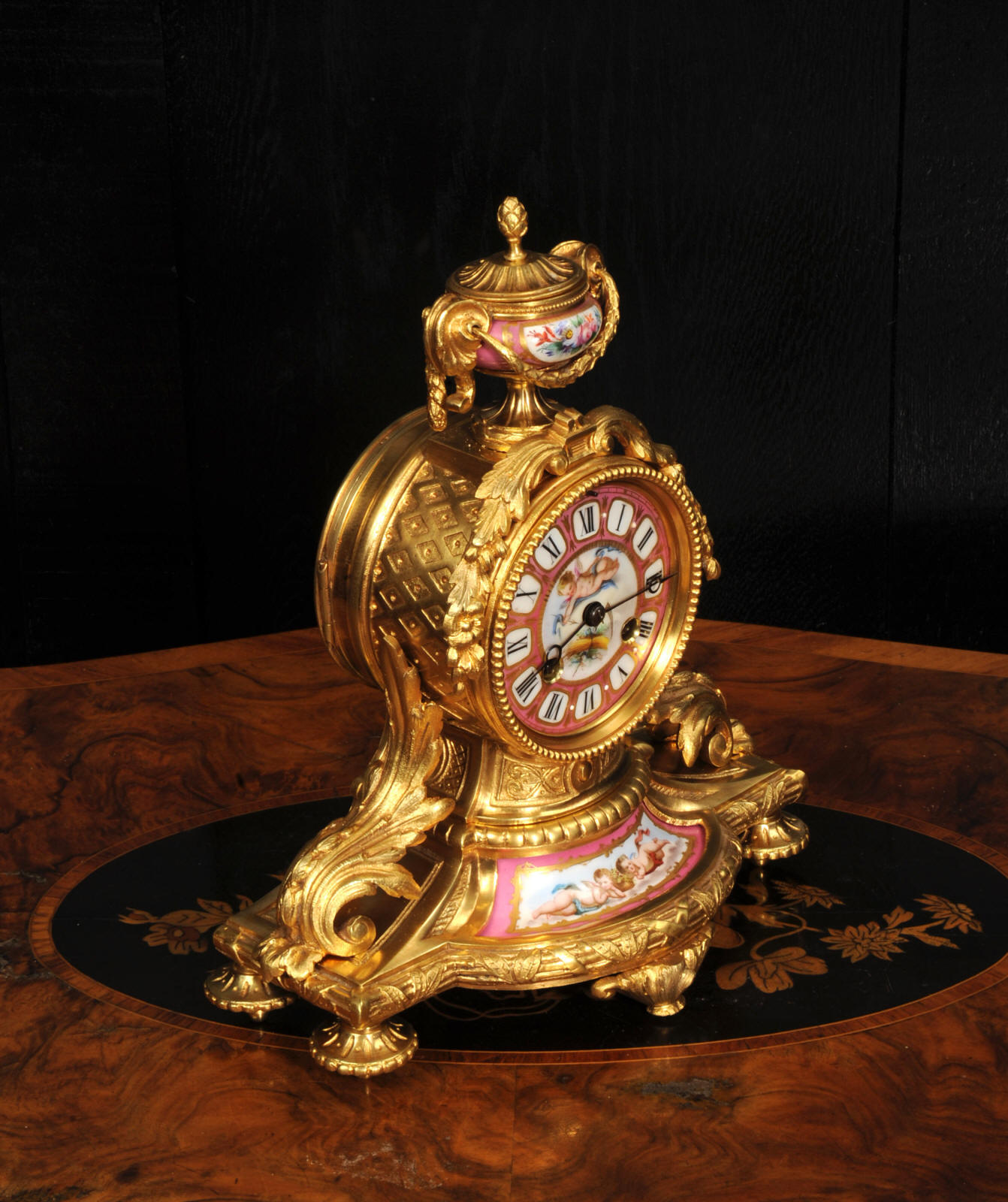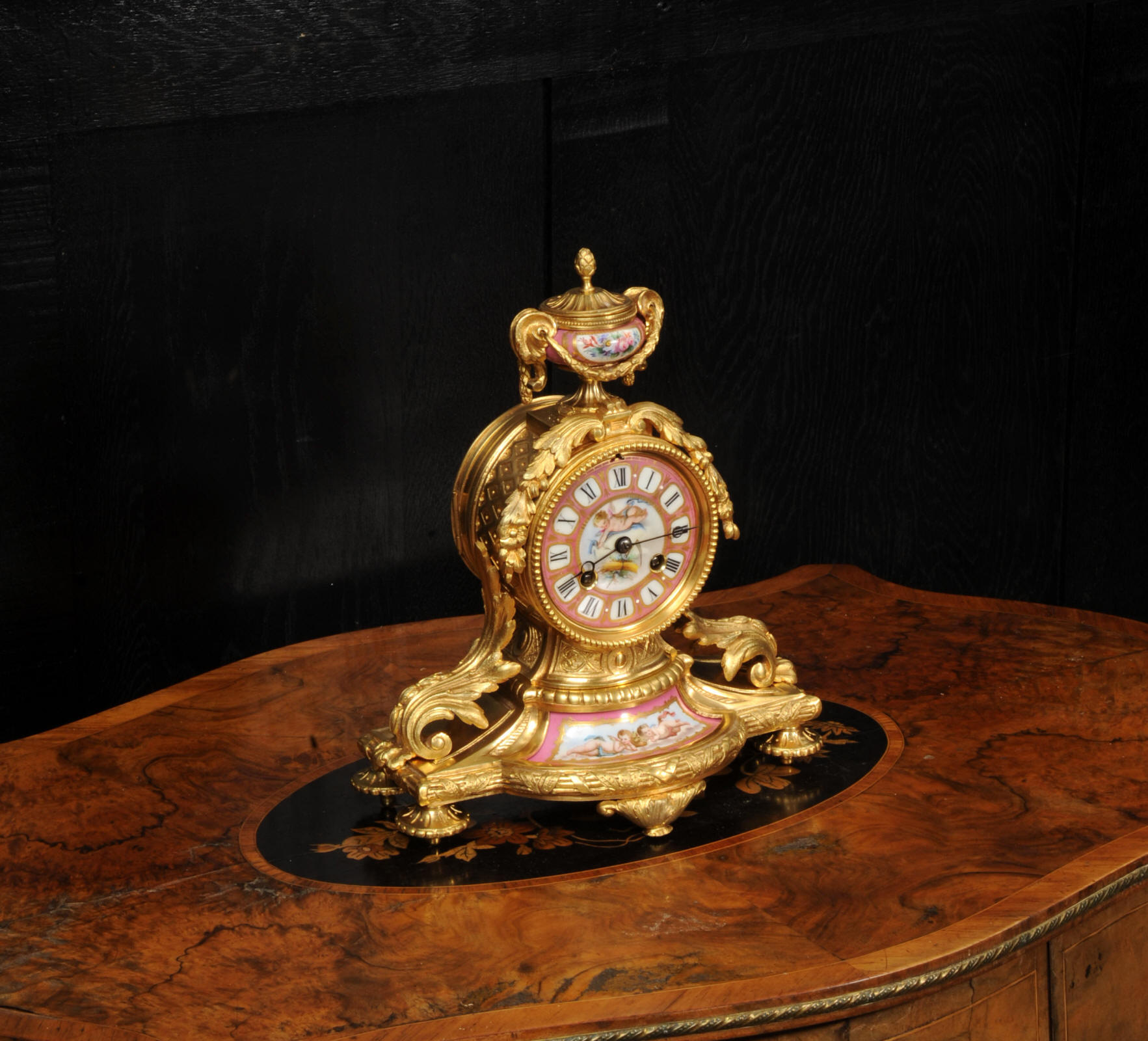 The porcelain dial shows a lovely depiction of cupid as a cherub with his arrow. Above the dial is a porcelain urn, delicately painted with a floral swag and mounted with ormolu handles and a pineapple finial. The rear door is glazed with convex glass to allow the movement to be seen. Please note that this style of clock does not have a glazed bezel over the dial. The French movement is of high quality and is by Japy Frères. It is in excellent clean and running condition having been fully overhauled by our clockmaker. Pendulum is original. It runs for 8 days and strikes the hours and halves on a bell. Click the video below to hear the bell and watch the clock running. Condition of the case is excellent, the original gilding is beautifully clean and bright with some slight wear, discolouration and tarnish. Porcelain is also in excellent condition with some very occasional and slight wear to the over-glaze gilt decoration. Some of the half hour jewel marks on the dial missing.
