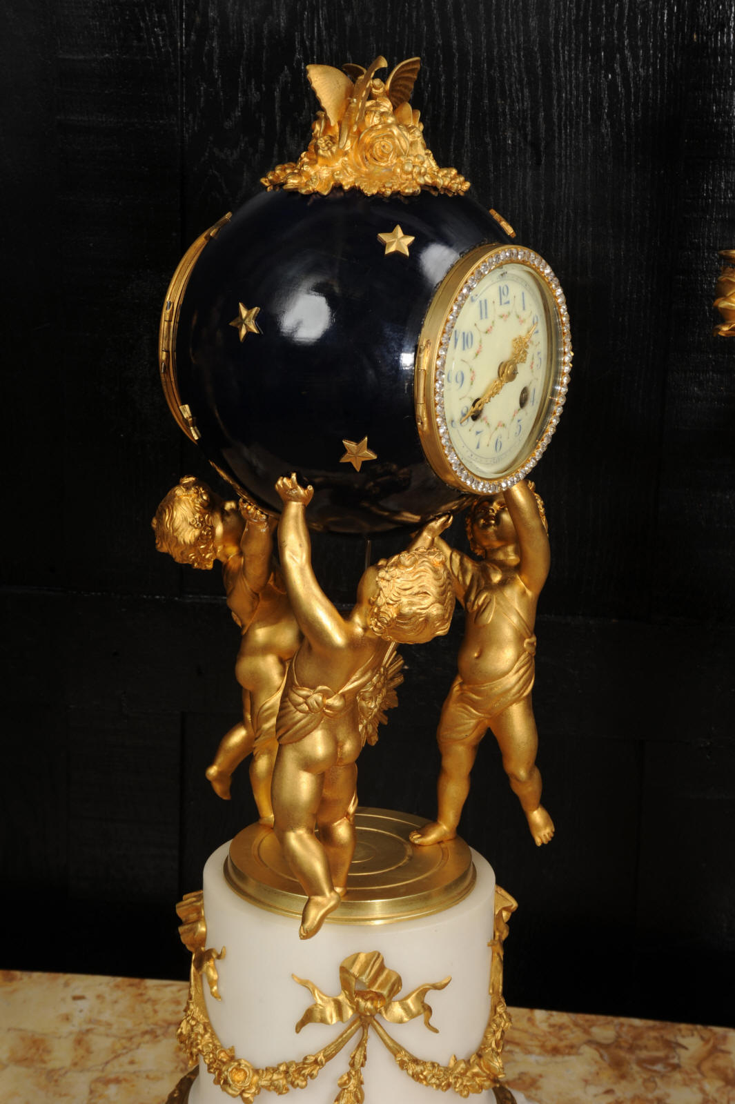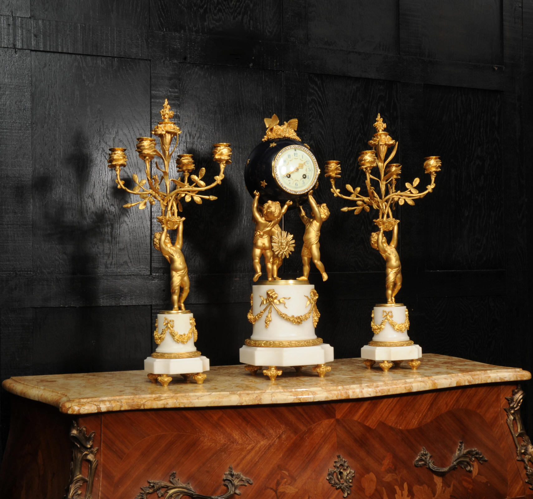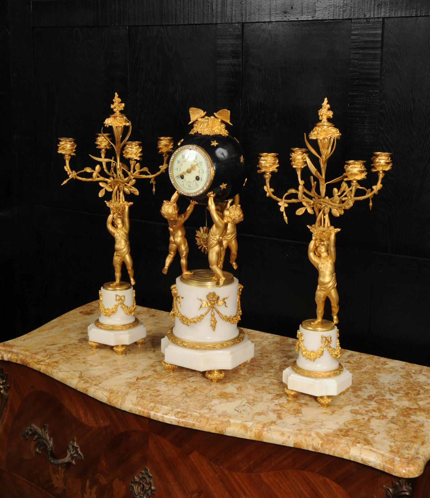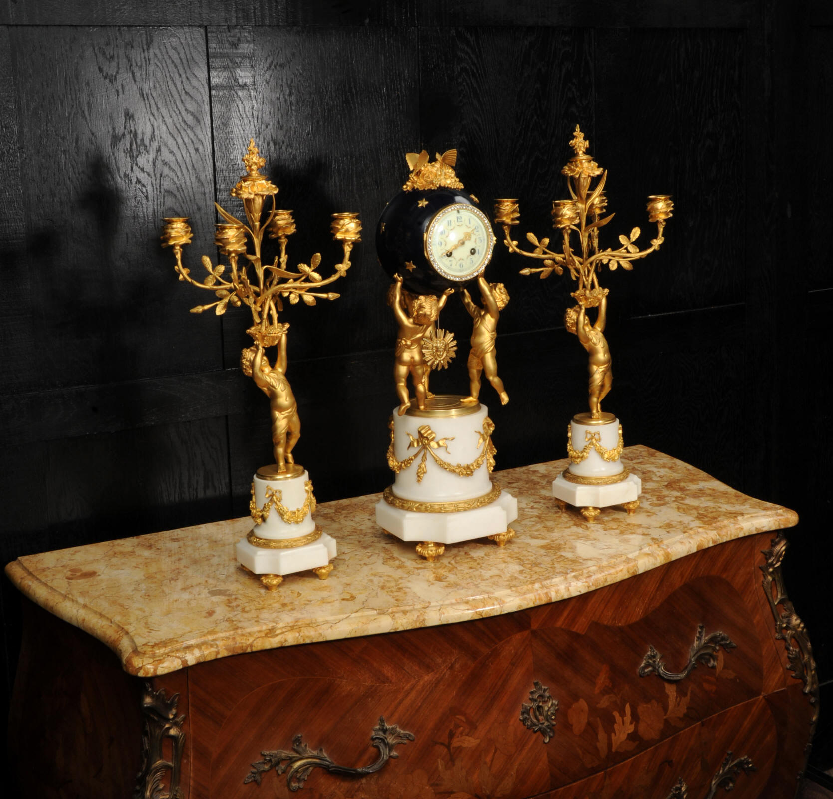 The orb is studded with ormolu stars and above butterflies delicate land upon a floral arrangement. The candelabra are modelled en suite with cherubs carrying the weight of five lights modelled as scrolling foliage, snuffers sit in the central sconce as finials when not in use. The three elements are mounted on white Carrera marble bases swagged with flowers tied with bows. The dial is porcelain enamel on copper, cream with delicate swags painted between the numerals. It is complete with it's original finely cut gilt hands. The bezel is set with paste jewels and convex glass. The set is beautifully made and finished in finely gilded bronze ormolu. The French movement is of superb quality and is by Samuel Marti. It is in excellent clean and running condition having been fully overhauled by our clockmaker. Pendulum is an old replacement. It runs for 8 days and strikes the hours and halves on a bell. Click the video to hear the bell and watch the clock running. Condition of the case is excellent, the original gilding is beautifully clean and bright, some slight wear and tarnish in places, particularly the ormolu tops to the marble bases. Marble is also excellent with a good polish, some slight staining and nibbles to the edges. Blue orb has some light scratches and wear to the original lacquer. Dial is excellent with no damage, some slight fading. H. Luppens & Cie were a famous foundry from Brussels, Belguim operating in the 19th century. The H. Luppens & Cie Foundry had its workshops in Saint-Gilles, 15 rue de Danemark. There were known for their Foundry and specialised in Lustres, Bronzes, Pendules and Meubles. furniture, clocks, ceiling lights and bronze. They had premises in Rue Neuve 144 to 148 and Boulevard du Nord 151 to 155 Brussels. They have made many extremely high quality objects which can be found across the globe from large clock sets to chandeliers, often retailed from their Paris premises as in the case of this clock set.