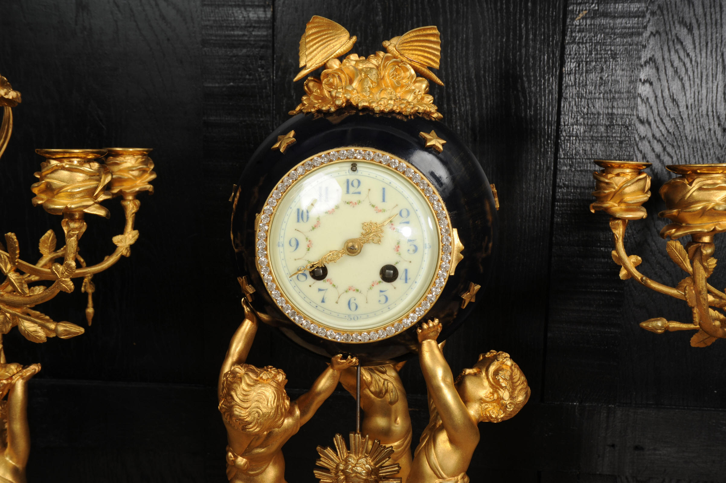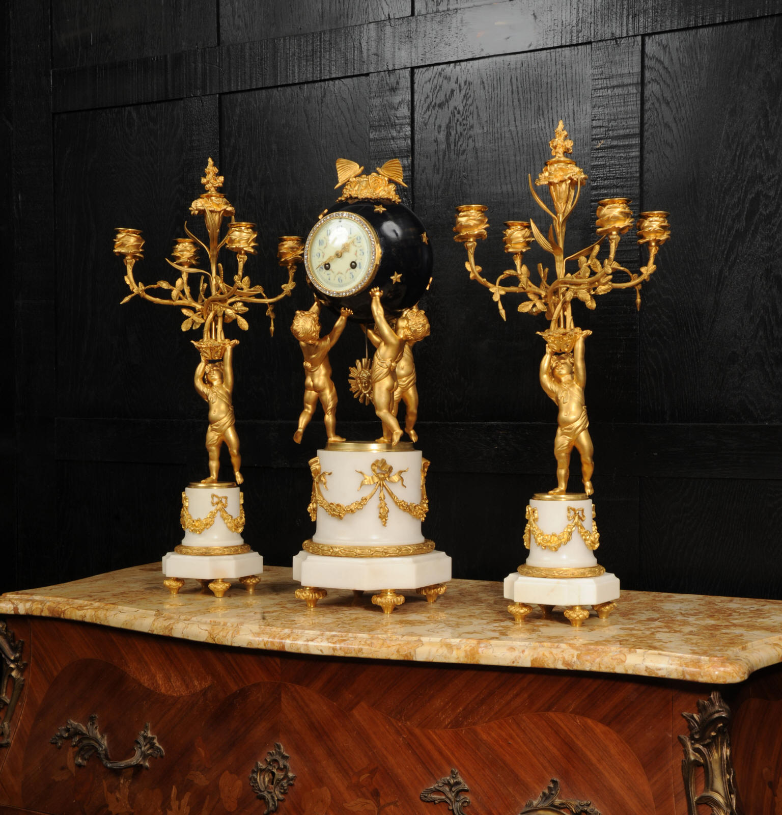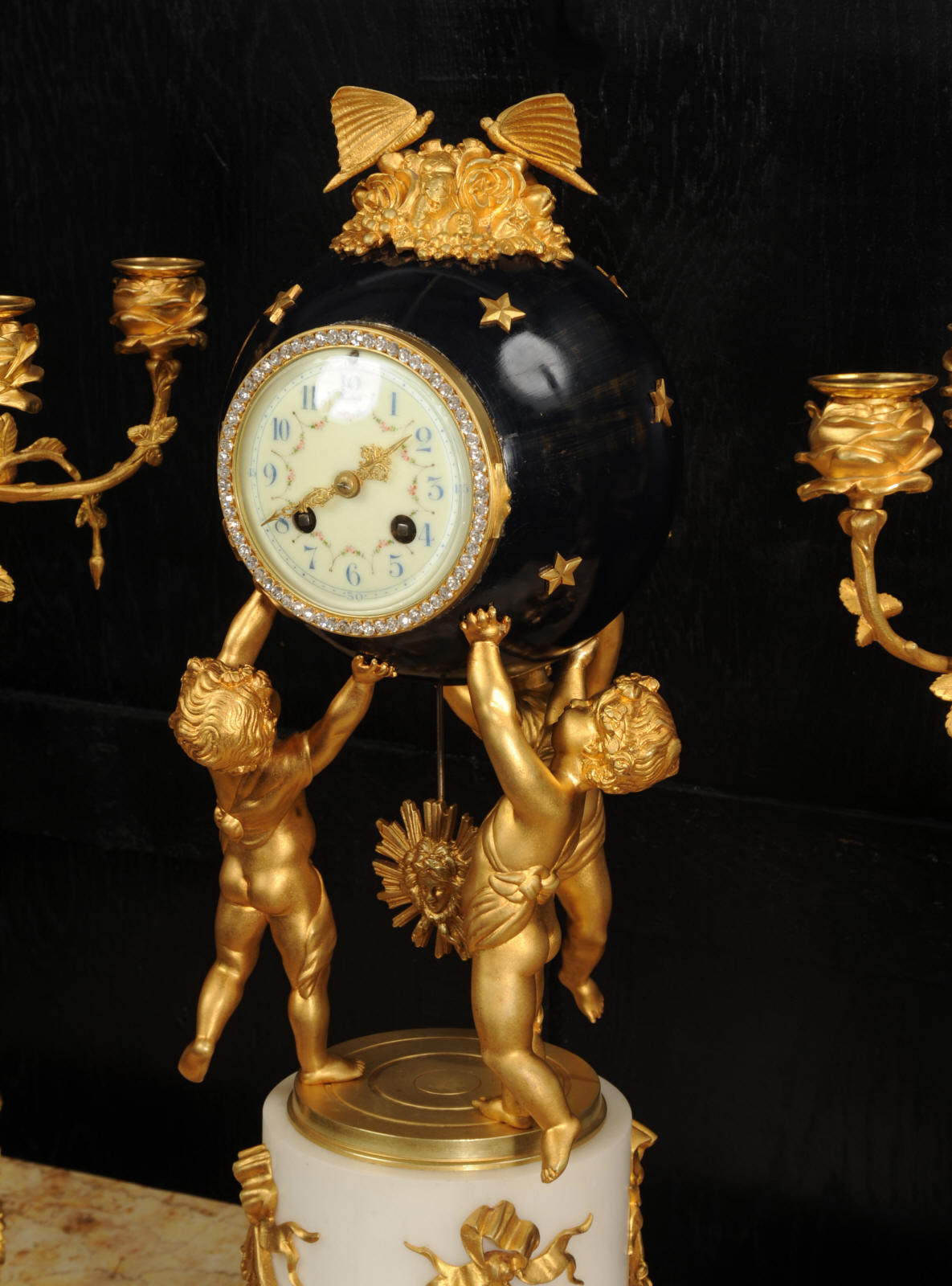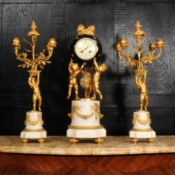 The orb is studded with ormolu stars and above butterflies delicate land upon a floral arrangement. The candelabra are modelled en suite with cherubs carrying the weight of five lights modelled as scrolling foliage, snuffers sit in the central sconce as finials when not in use. The three elements are mounted on white Carrera marble bases swagged with flowers tied with bows. The dial is porcelain enamel on copper, cream with delicate swags painted between the numerals. It is complete with it's original finely cut gilt hands. The bezel is set with paste jewels and convex glass. The set is beautifully made and finished in finely gilded bronze ormolu. The French movement is of superb quality and is by Samuel Marti. It is in excellent clean and running condition having been fully overhauled by our clockmaker. Pendulum is an old replacement. It runs for 8 days and strikes the hours and halves on a bell. Click the video to hear the bell and watch the clock running. Condition of the case is excellent, the original gilding is beautifully clean and bright, some slight wear and tarnish in places, particularly the ormolu tops to the marble bases. Marble is also excellent with a good polish, some slight staining and nibbles to the edges. Blue orb has some light scratches and wear to the original lacquer. Dial is excellent with no damage, some slight fading. H. Luppens & Cie were a famous foundry from Brussels, Belguim operating in the 19th century. The H. Luppens & Cie Foundry had its workshops in Saint-Gilles, 15 rue de Danemark. There were known for their Foundry and specialised in Lustres, Bronzes, Pendules and Meubles. furniture, clocks, ceiling lights and bronze. They had premises in Rue Neuve 144 to 148 and Boulevard du Nord 151 to 155 Brussels. They have made many extremely high quality objects which can be found across the globe from large clock sets to chandeliers, often retailed from their Paris premises as in the case of this clock set.