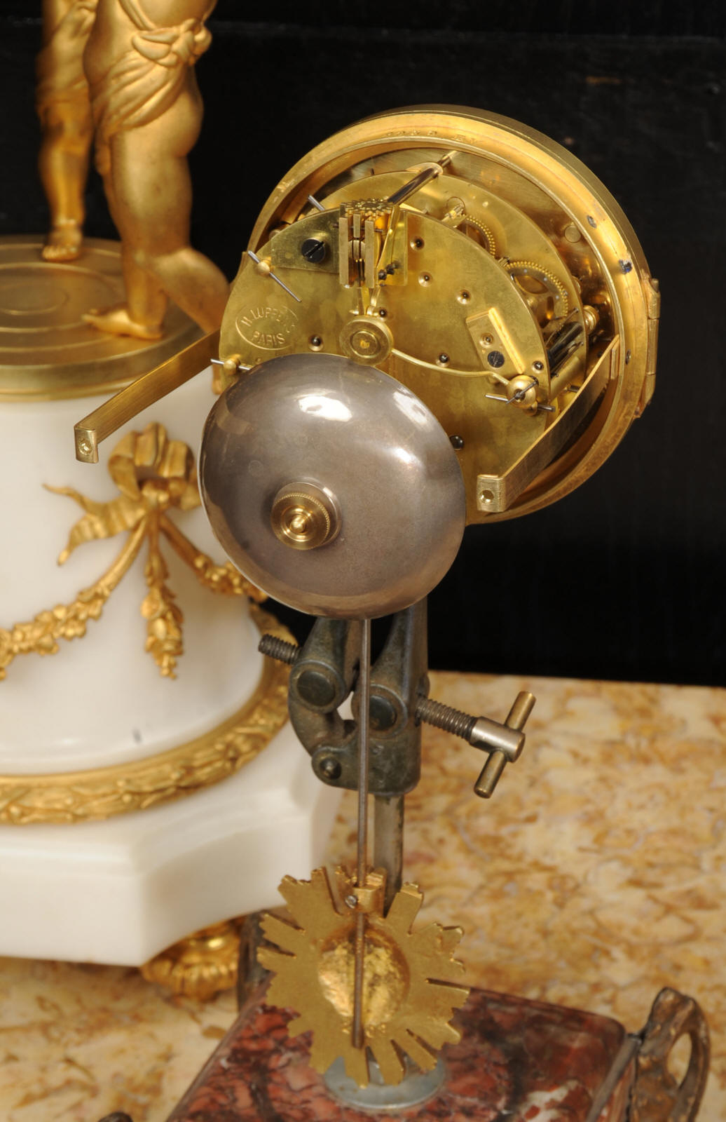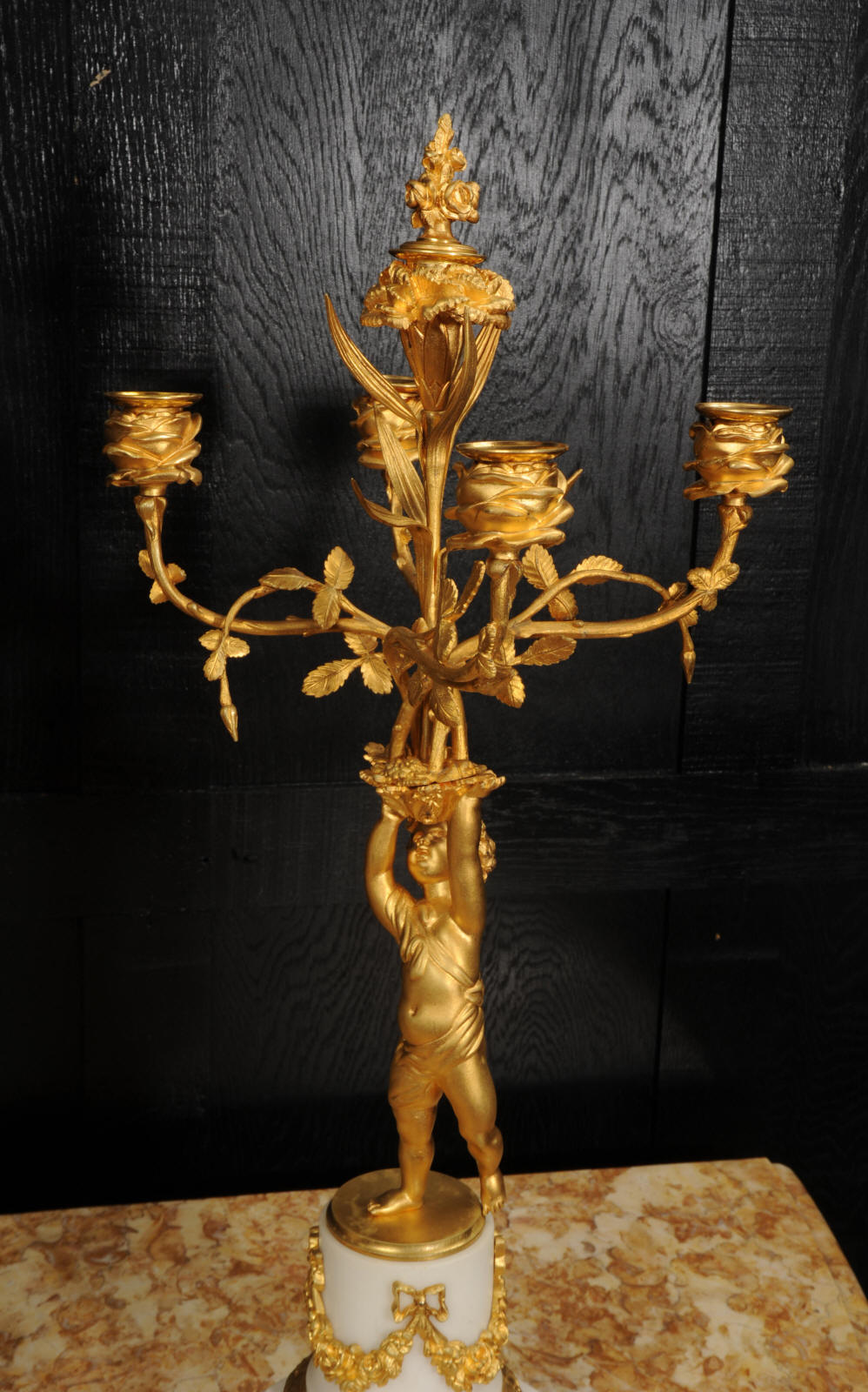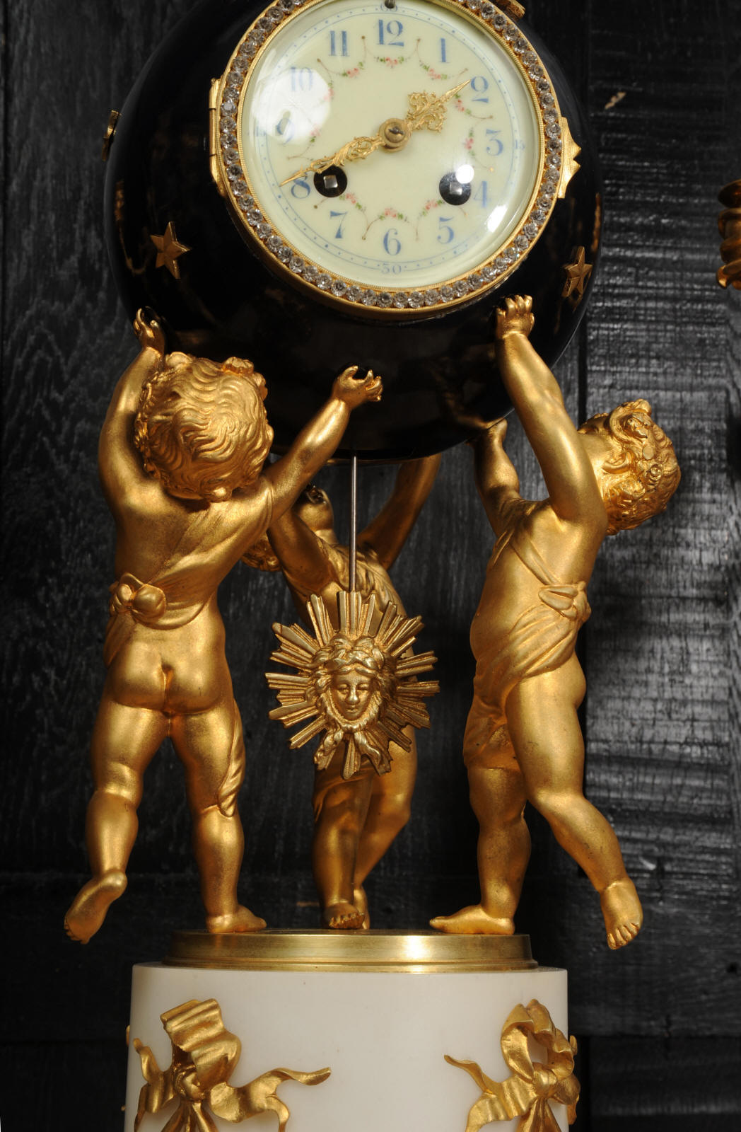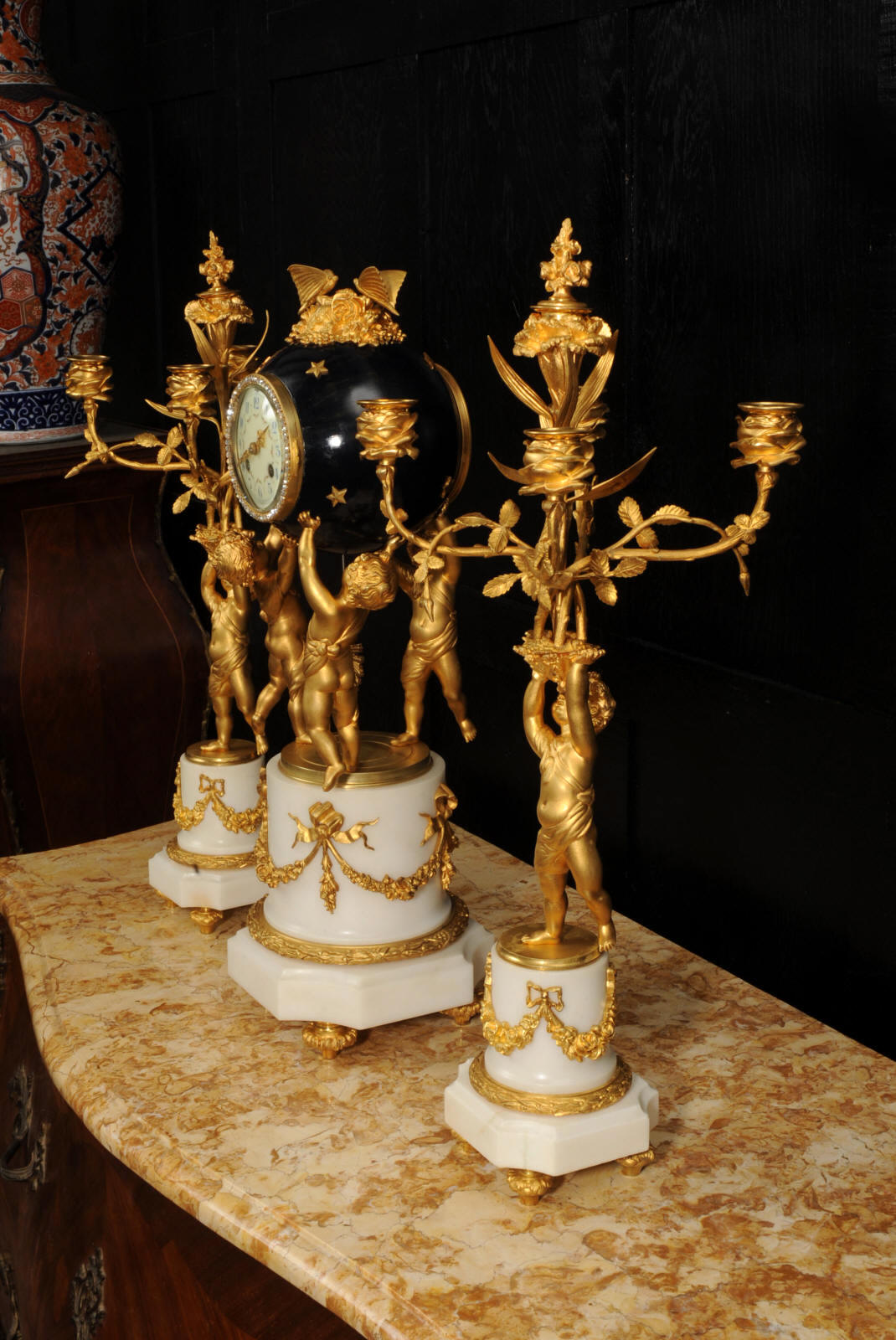The orb is studded with ormolu stars and above butterflies delicate land upon a floral arrangement. The candelabra are modelled en suite with cherubs carrying the weight of five lights modelled as scrolling foliage, snuffers sit in the central sconce as finials when not in use. The three elements are mounted on white Carrera marble bases swagged with flowers tied with bows. The dial is porcelain enamel on copper, cream with delicate swags painted between the numerals. It is complete with it's original finely cut gilt hands. The bezel is set with paste jewels and convex glass. The set is beautifully made and finished in finely gilded bronze ormolu. The French movement is of superb quality and is by Samuel Marti. It is in excellent clean and running condition having been fully overhauled by our clockmaker. Pendulum is an old replacement. It runs for 8 days and strikes the hours and halves on a bell. Click the video to hear the bell and watch the clock running. Condition of the case is excellent, the original gilding is beautifully clean and bright, some slight wear and tarnish in places, particularly the ormolu tops to the marble bases. Marble is also excellent with a good polish, some slight staining and nibbles to the edges. Blue orb has some light scratches and wear to the original lacquer. Dial is excellent with no damage, some slight fading. H. Luppens & Cie were a famous foundry from Brussels, Belguim operating in the 19th century. The H. Luppens & Cie Foundry had its workshops in Saint-Gilles, 15 rue de Danemark. There were known for their Foundry and specialised in Lustres, Bronzes, Pendules and Meubles. furniture, clocks, ceiling lights and bronze. They had premises in Rue Neuve 144 to 148 and Boulevard du Nord 151 to 155 Brussels. They have made many extremely high quality objects which can be found across the globe from large clock sets to chandeliers, often retailed from their Paris premises as in the case of this clock set.