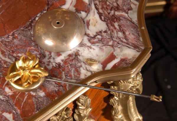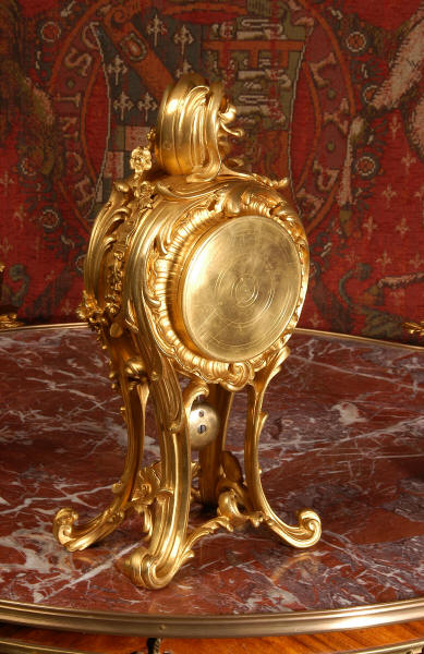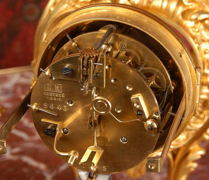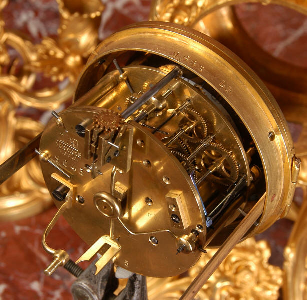 hold the movement aloft and the original ormolu pendulum is visible, swinging
