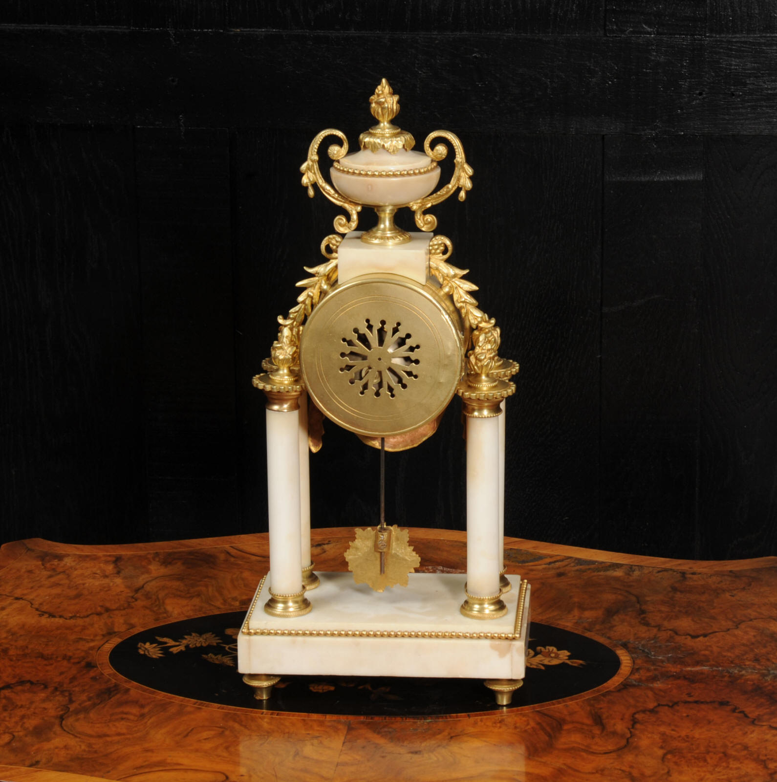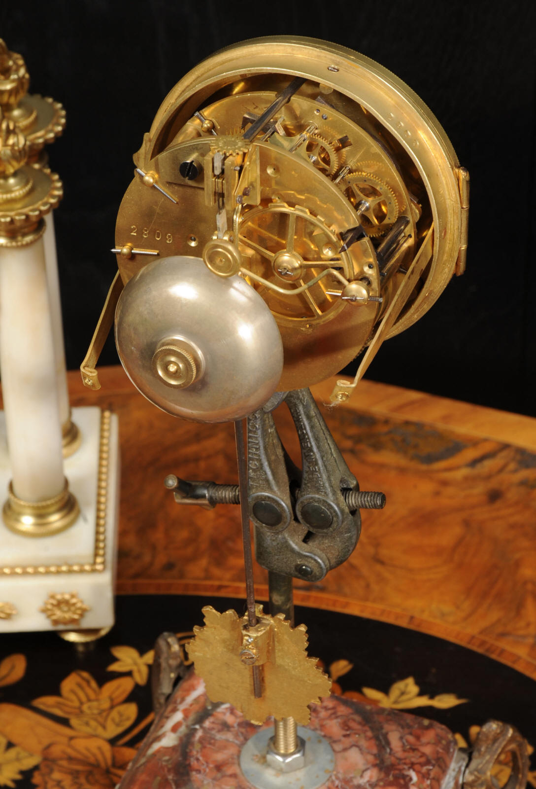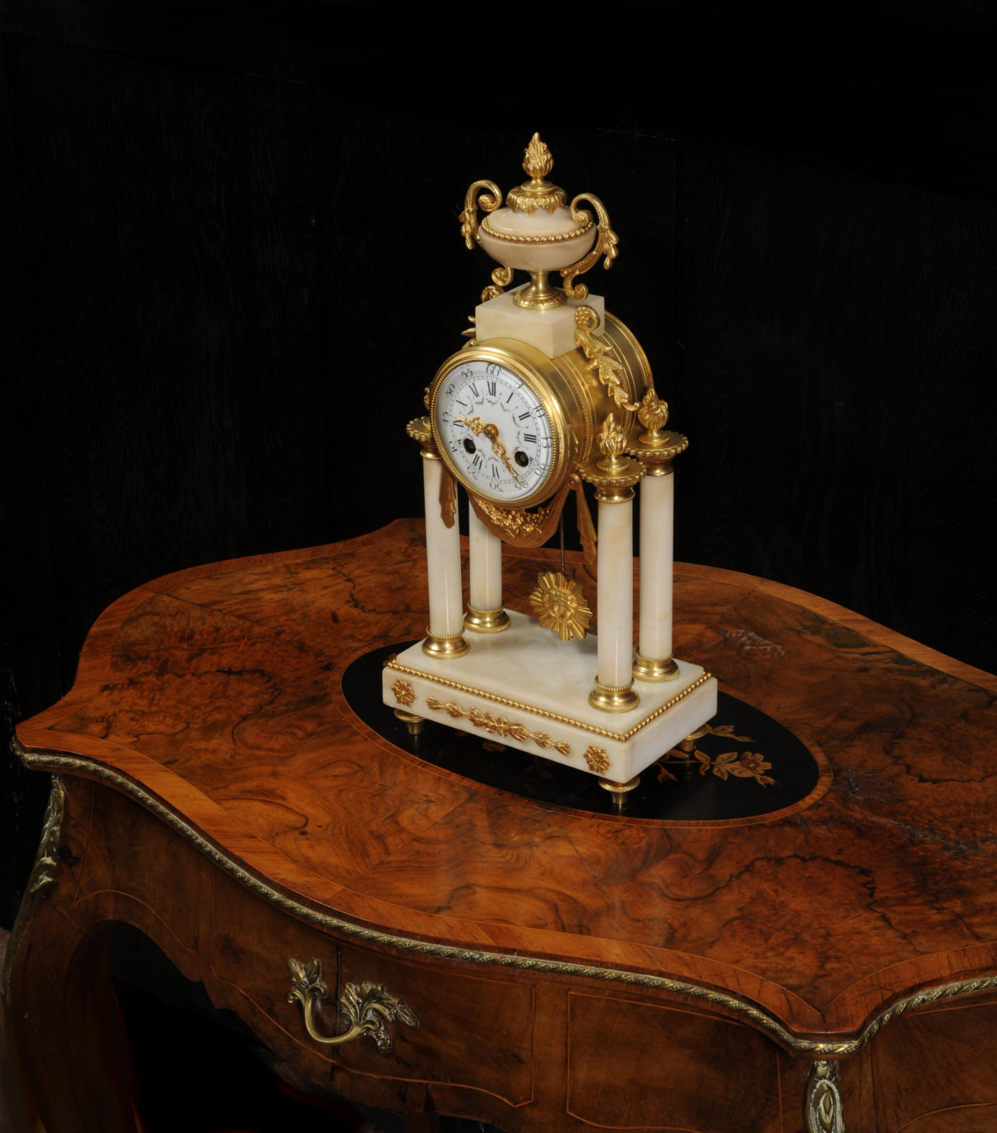 The dial is prettily painted with floral swags between the numbers on porcelain enamel. It is complete with it's original finely fretted gilt brass hands and convex glass. The French movement is by Japy Frères and is of high quality. It is in excellent clean and running condition having been fully overhauled by our clockmaker. Pendulum is original with ormolu sunburst. It runs for 8 days and strikes the hours and halves on a bell. Click the video below to hear the bell and watch the clock running!