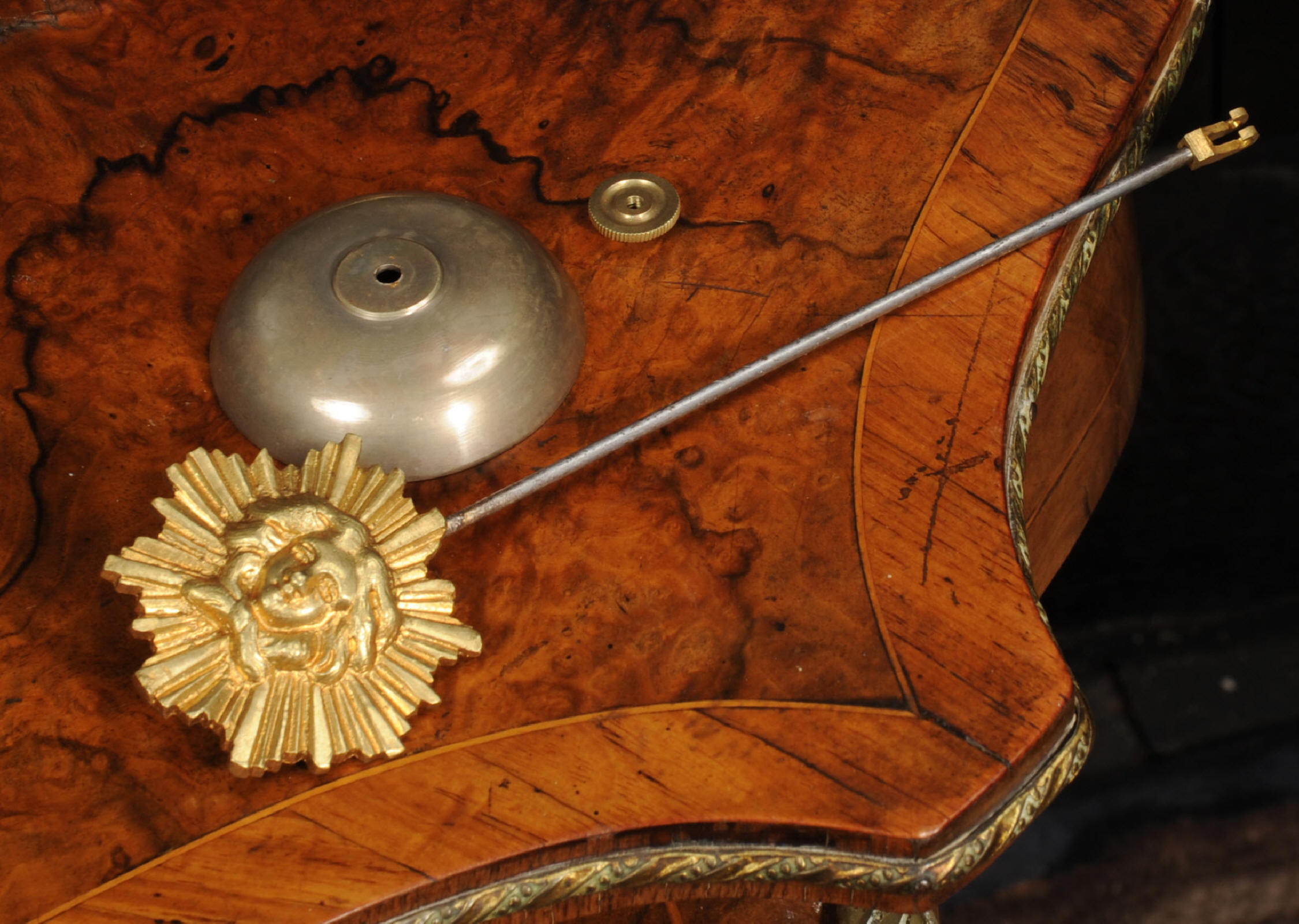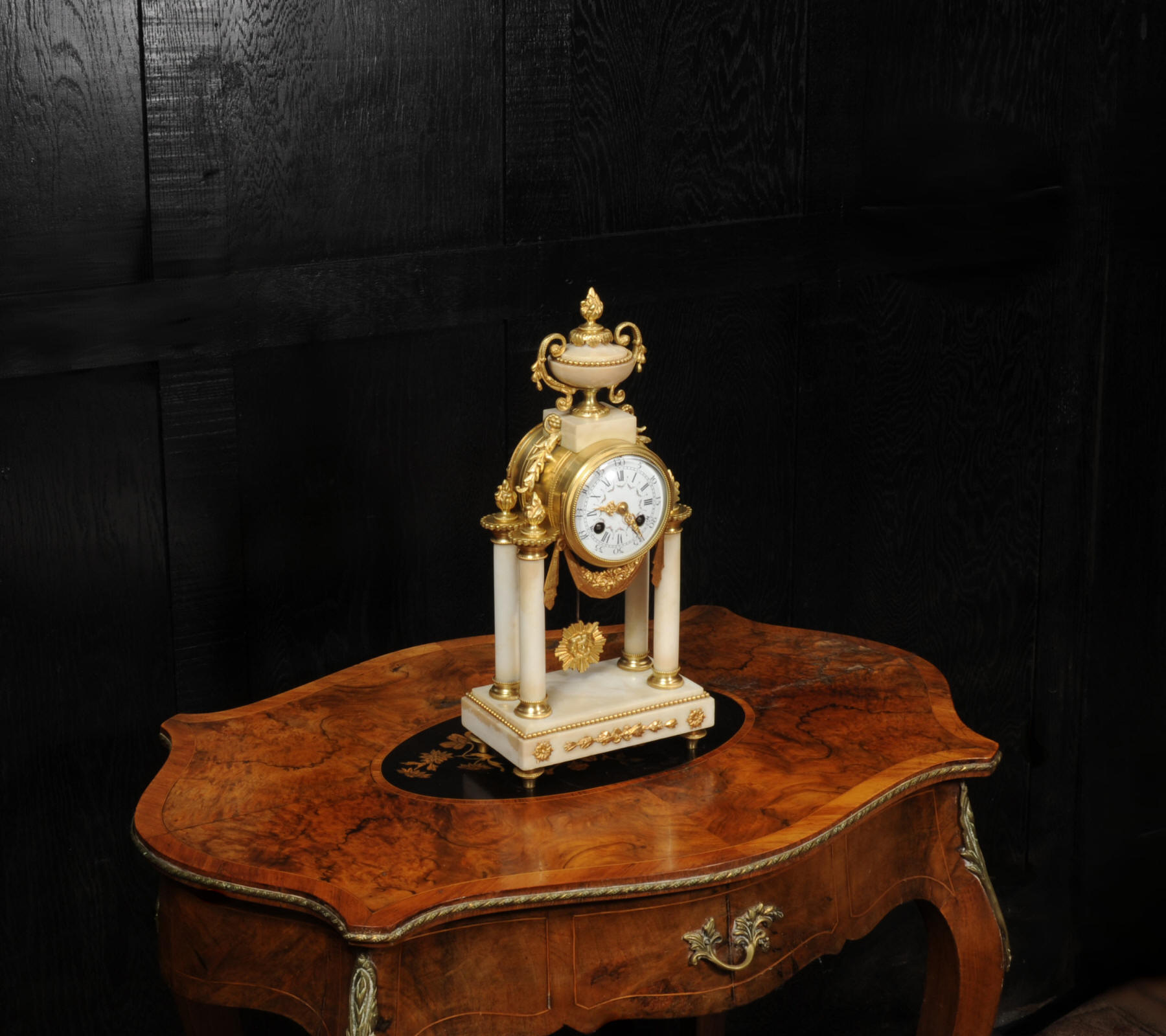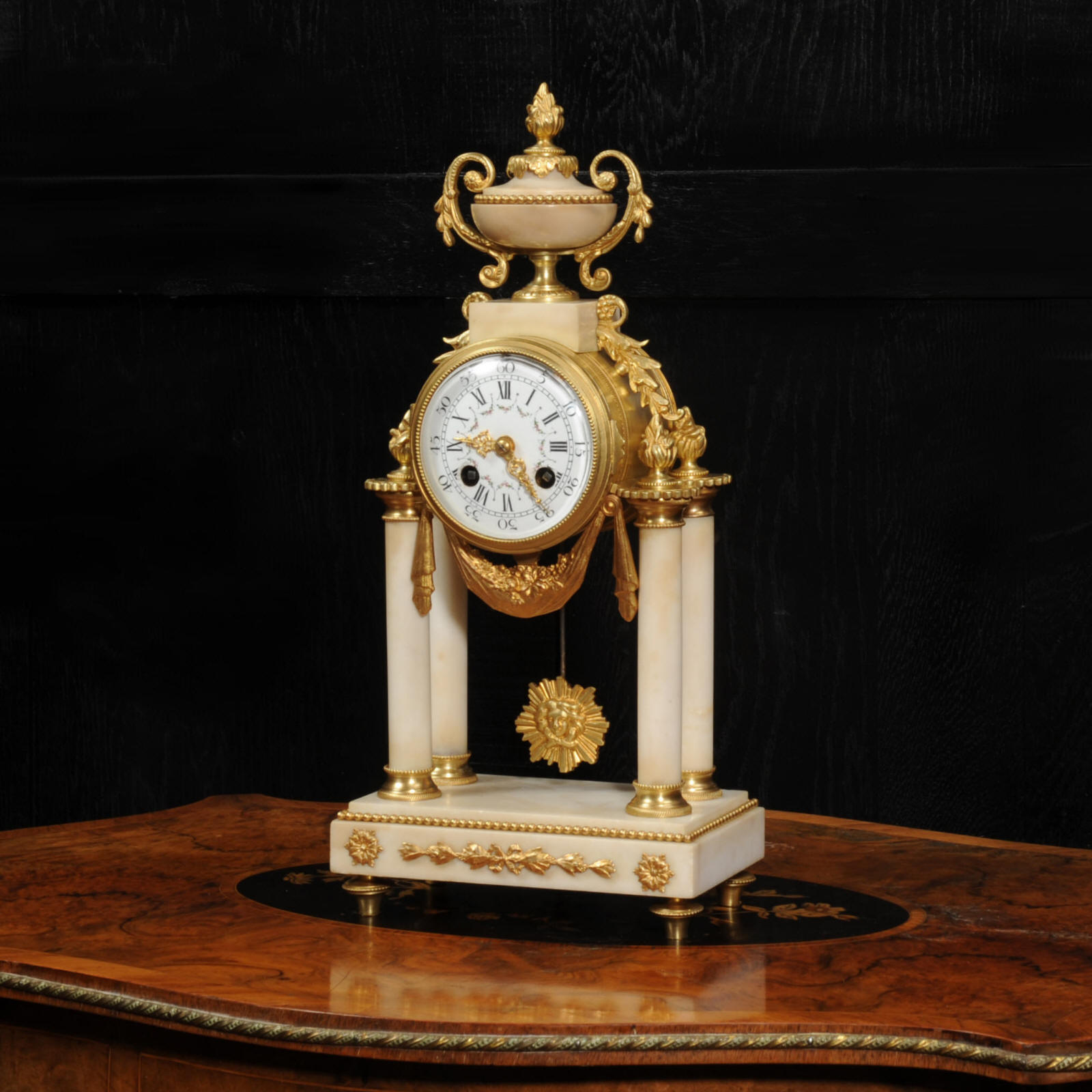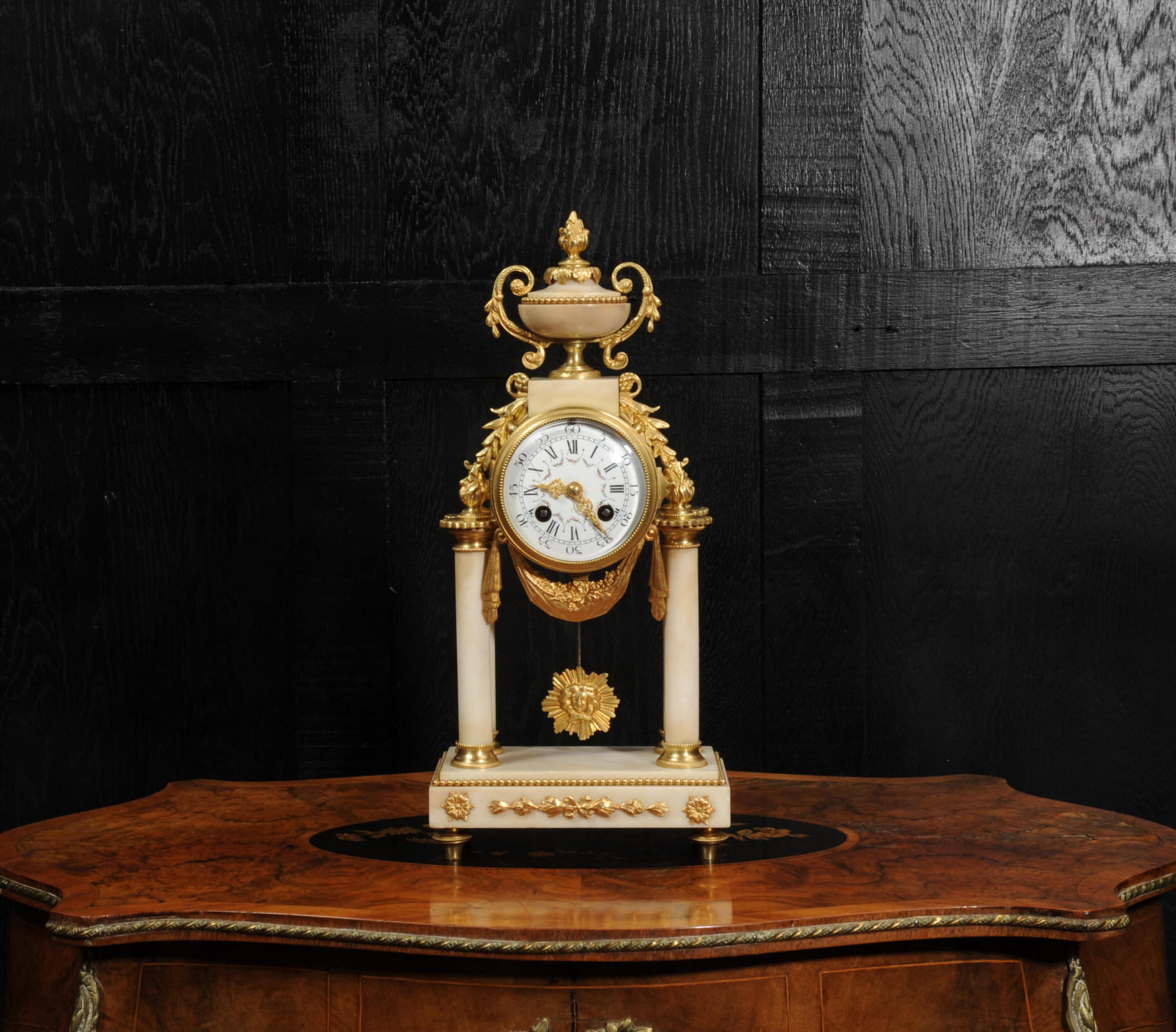 The dial is prettily painted with floral swags between the numbers on porcelain enamel. It is complete with it's original finely fretted gilt brass hands and convex glass. The French movement is by Japy Frères and is of high quality. It is in excellent clean and running condition having been fully overhauled by our clockmaker. Pendulum is original with ormolu sunburst. It runs for 8 days and strikes the hours and halves on a bell. Click the video below to hear the bell and watch the clock running!