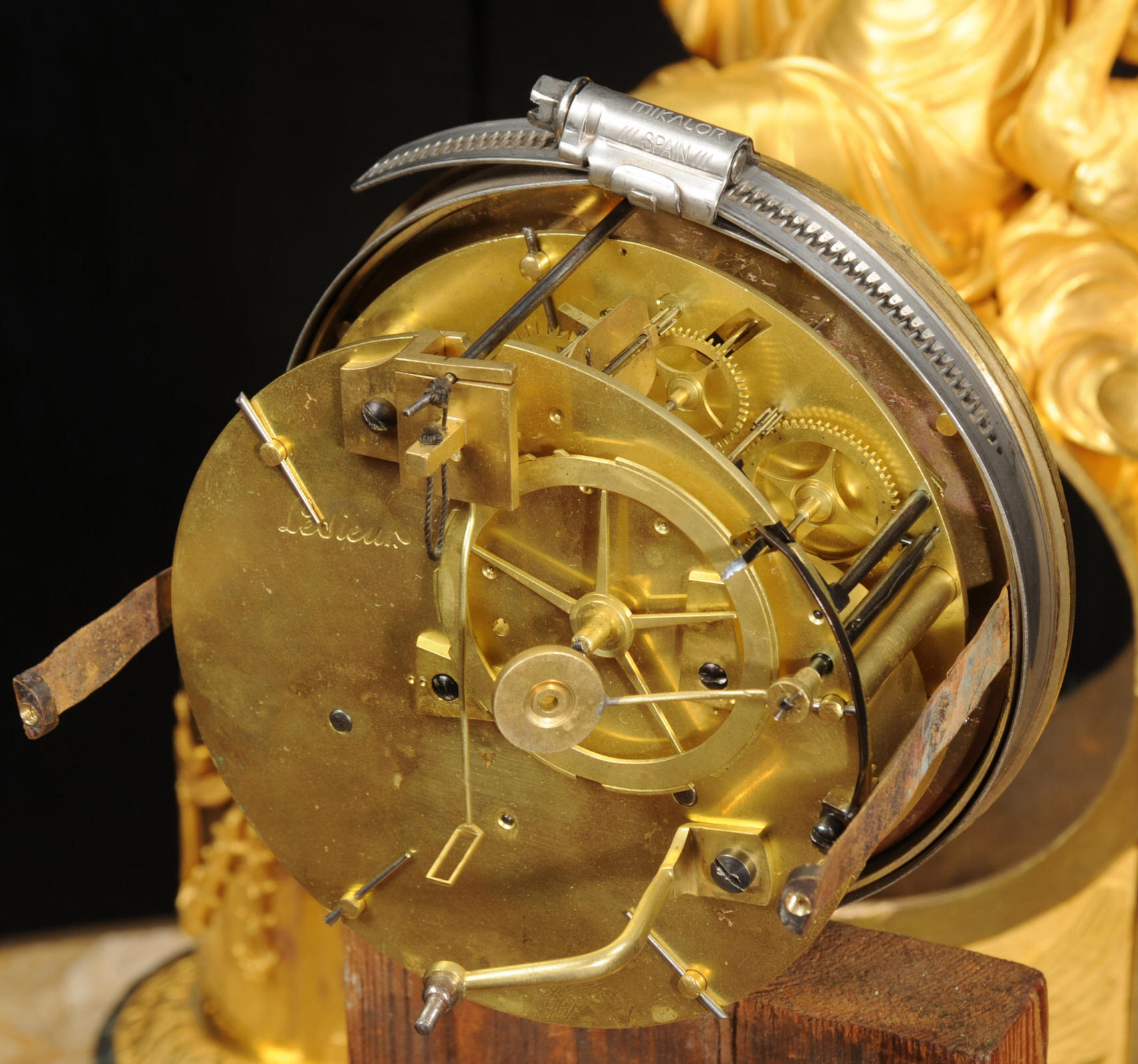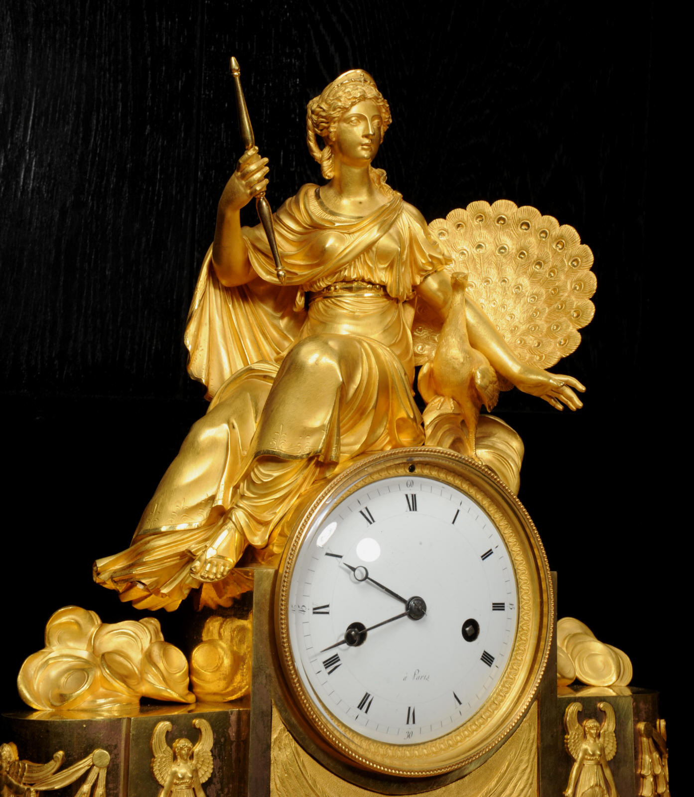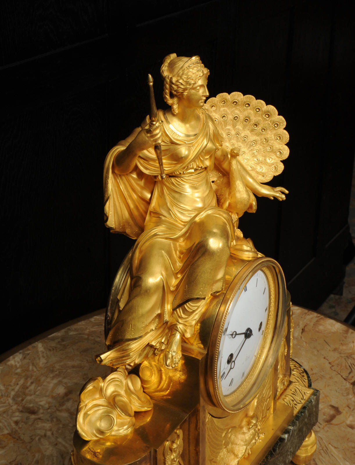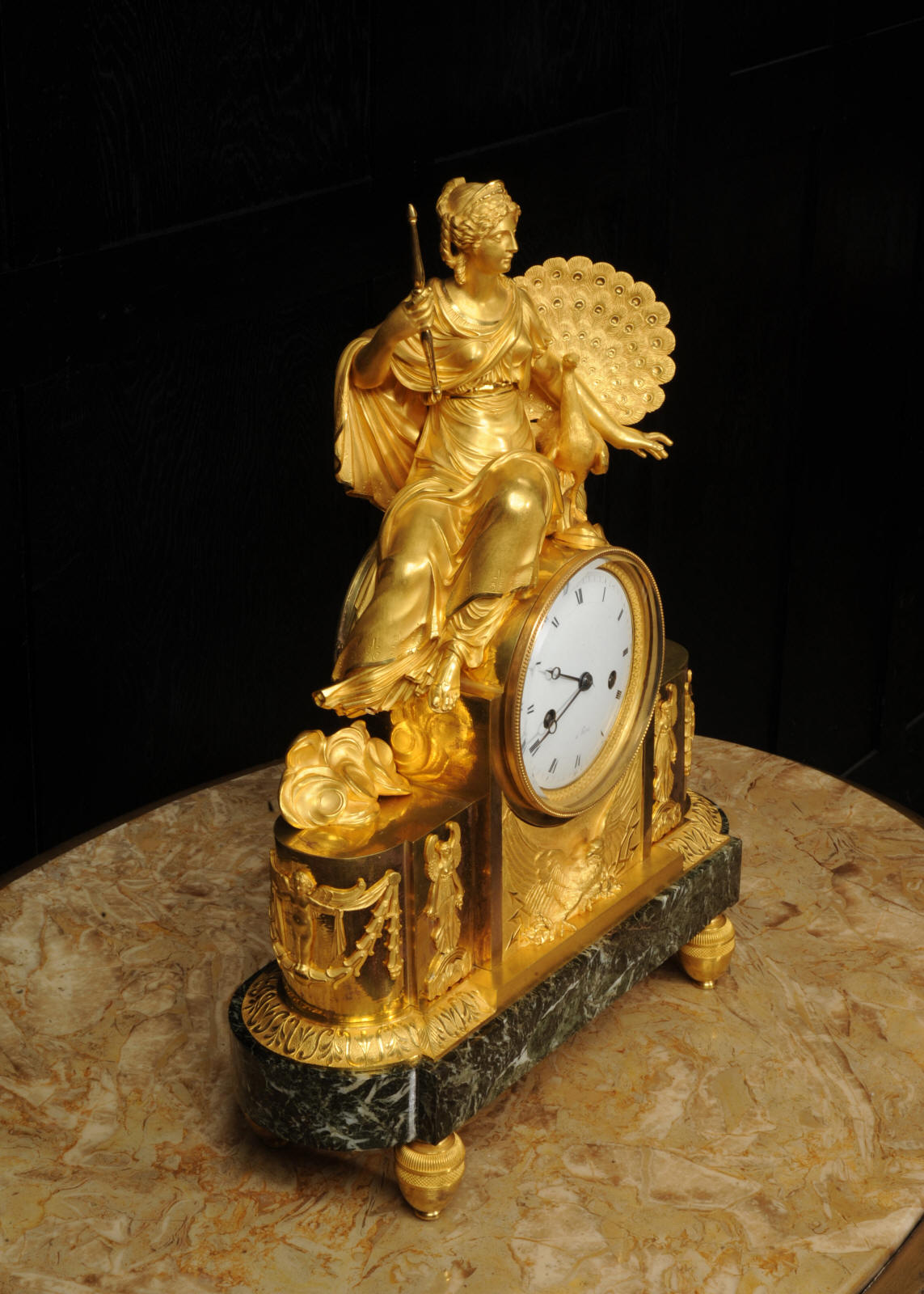 Below the dial is an ormolu panel showing an Eagle, representing Jupiter, with lighting bolts which as Jupiter's wife, Juno was able to hurl. The clock sits upon a green marble base with four feet. The fine porcelain dial is signed 'Paris' and is complete with blued steel Breguet hands and the original bayonet bezel. The rear door is also glazed to allow the pendulum to be seen. The French movement is of high quality and is signed on the backplate by the clockmaker Lesieur. It is in excellent clean and running condition having been fully overhauled by our clockmaker. It has a silk suspension and the pendulum is a replacement. It runs for 8 days and strikes the hours and halves on a bell. Click the video below to hear the bell and watch the clock running. Condition of the case is excellent; the original gilding is in stunning condition, just some wear to mainly the rear and the right hand side of the base, where less gold was originally applied. Possibly there were originally two further feet to the marble base, however the clock sits well on four feet. There is also possibly some repair / alteration to the bottom of Juno's right foot at some time. The rear bezel is a later hinged type rather than the bayonet fit of the front bezel. The dial is also in excellent condition just some tiny nibbles to the winding holes. Lesieur (fl. 1790-1850) was a highly respected but little documented clockmaker who worked in Paris during the last years of the eighteenth century and continued in business up until circa 1850. He was known to have regularly worked with Thomire and the greatest Parisian Bronziers. Tardy (Tardy, Dictionnaire des Horlogers Francais) notes that by 1806 he was established at Vieille rue du Temple; during 1812-20 and 1830-50 he was at rue de la Verrerie and in 1840 at Boulevard St. Martin. Elsewhere in the Paris almanacs he is recorded at Bar-du-Bec in 1839 and in 1840 at rue des Alexiens. Lesieur’s name also appears on a number of complex and important clocks, counting among them a mantle clock showing signs of the zodiac with marble columns of 1807-8, in the Hôtel de l’Intendance de la Généralité de Metz, Moselle (originally the Préfecture de la Moselle et de la Région Lorraine). The latter is probably a pair to another identical clock by Lesieur in the Château de Nymphenburg in Bavaria. Lesieur also made the movements for a variety of other clocks, from a late Louis XVI Sèvres porcelain lyre clock to Empire figural clocks. Among them is one featuring Jason and the Golden Fleece which is housed at the Musée de la Malmaison in the appartements de Joséphine de Beauharnais. During the Restauration he also collaborated with the Parisian firm of bronziers Choiselat-Gallien who worked for the Garde-Meuble and were appointed to Monsieur, Frère du Roi.