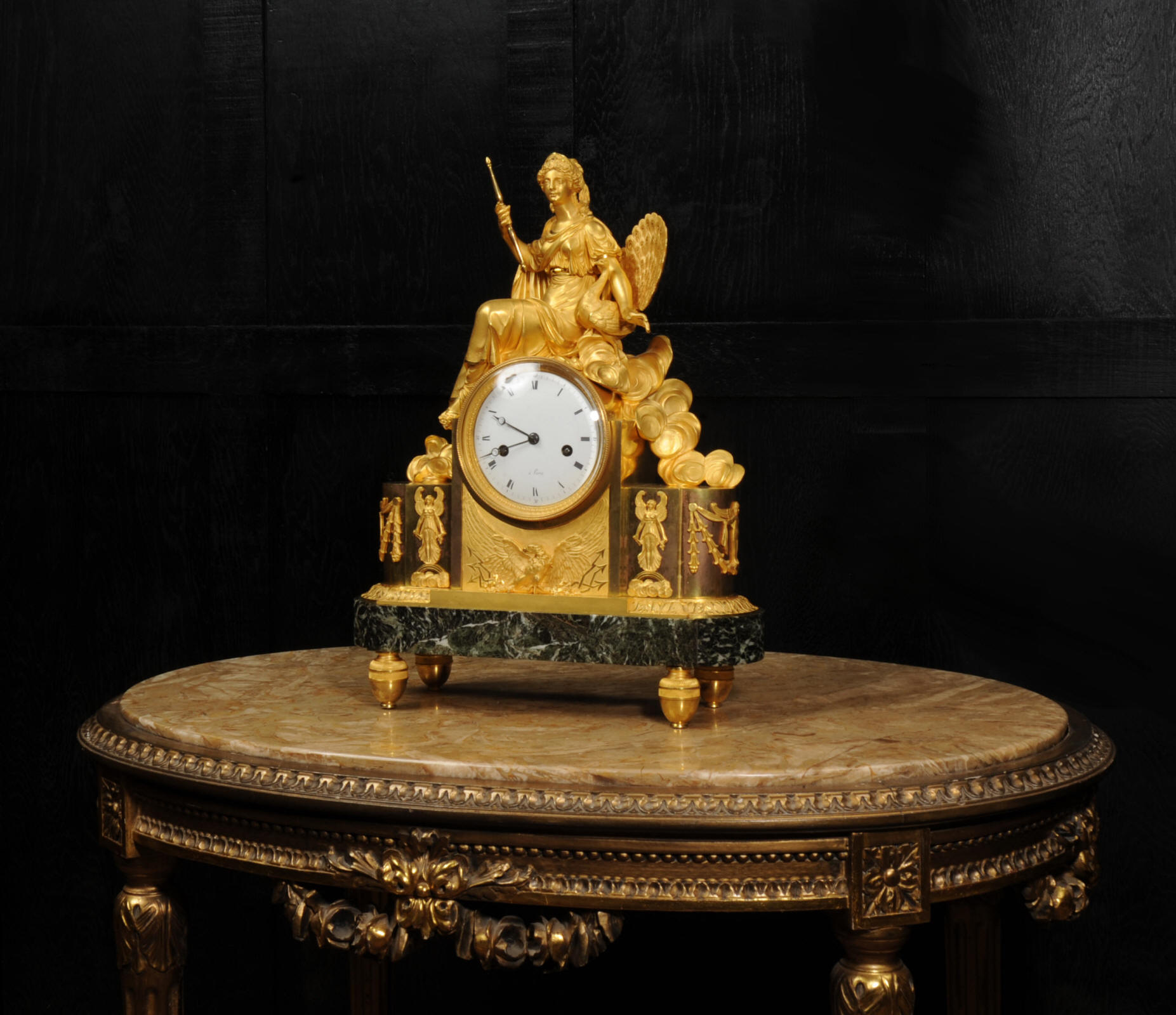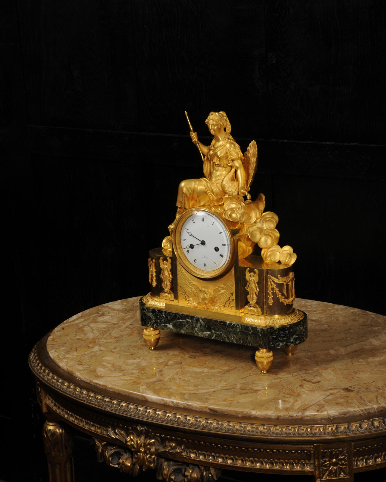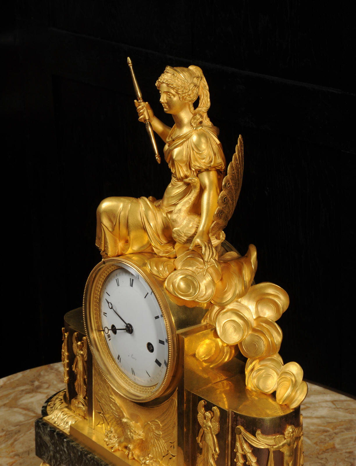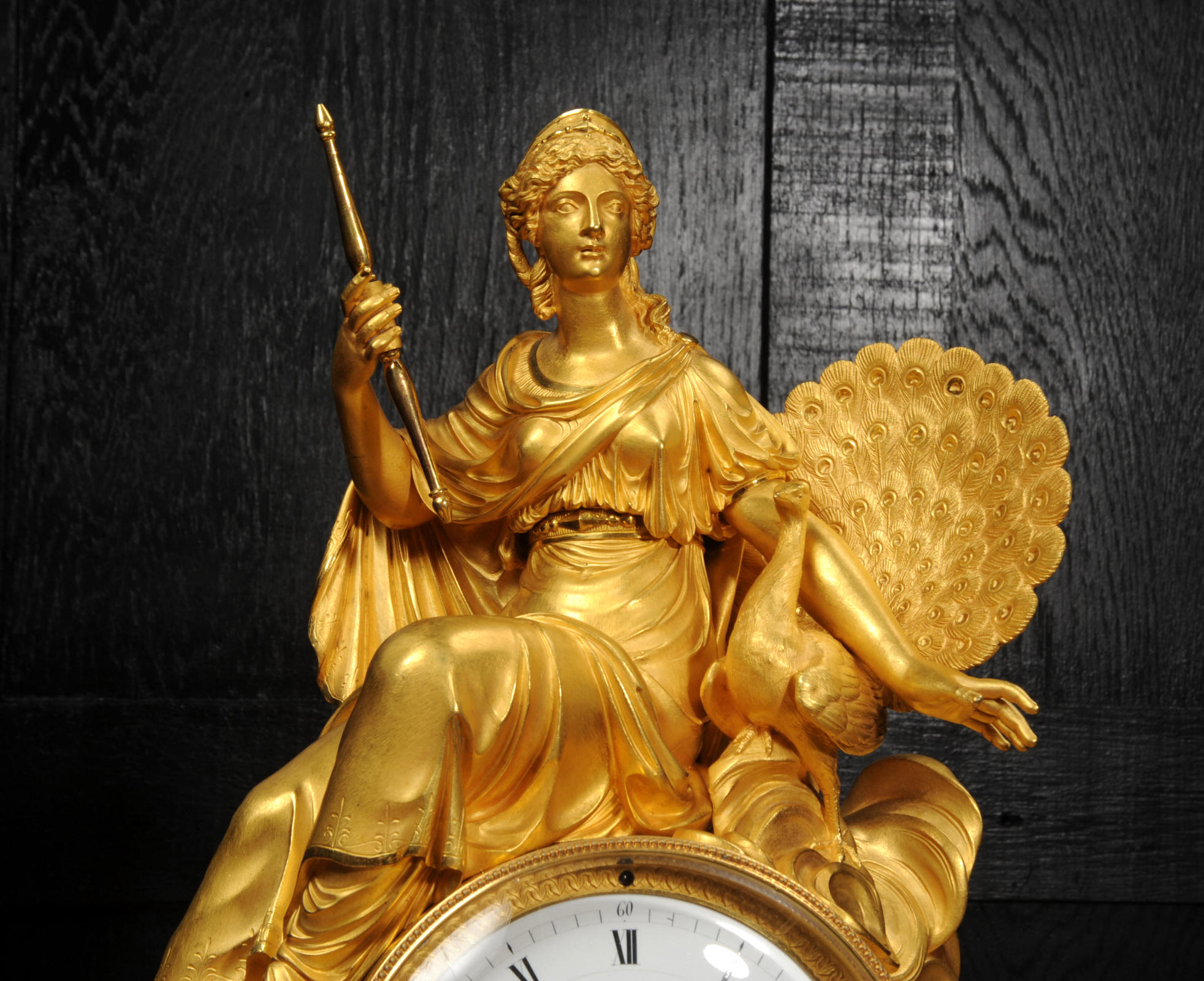 Below the dial is an ormolu panel showing an Eagle, representing Jupiter, with lighting bolts which as Jupiter's wife, Juno was able to hurl. The clock sits upon a green marble base with four feet. The fine porcelain dial is signed 'Paris' and is complete with blued steel Breguet hands and the original bayonet bezel. The rear door is also glazed to allow the pendulum to be seen. The French movement is of high quality and is signed on the backplate by the clockmaker Lesieur. It is in excellent clean and running condition having been fully overhauled by our clockmaker. It has a silk suspension and the pendulum is a replacement. It runs for 8 days and strikes the hours and halves on a bell. Click the video below to hear the bell and watch the clock running. Condition of the case is excellent; the original gilding is in stunning condition, just some wear to mainly the rear and the right hand side of the base, where less gold was originally applied. Possibly there were originally two further feet to the marble base, however the clock sits well on four feet. There is also possibly some repair / alteration to the bottom of Juno's right foot at some time. The rear bezel is a later hinged type rather than the bayonet fit of the front bezel. The dial is also in excellent condition just some tiny nibbles to the winding holes. Lesieur (fl. 1790-1850) was a highly respected but little documented clockmaker who worked in Paris during the last years of the eighteenth century and continued in business up until circa 1850. He was known to have regularly worked with Thomire and the greatest Parisian Bronziers. Tardy (Tardy, Dictionnaire des Horlogers Francais) notes that by 1806 he was established at Vieille rue du Temple; during 1812-20 and 1830-50 he was at rue de la Verrerie and in 1840 at Boulevard St. Martin. Elsewhere in the Paris almanacs he is recorded at Bar-du-Bec in 1839 and in 1840 at rue des Alexiens. Lesieur’s name also appears on a number of complex and important clocks, counting among them a mantle clock showing signs of the zodiac with marble columns of 1807-8, in the Hôtel de l’Intendance de la Généralité de Metz, Moselle (originally the Préfecture de la Moselle et de la Région Lorraine). The latter is probably a pair to another identical clock by Lesieur in the Château de Nymphenburg in Bavaria. Lesieur also made the movements for a variety of other clocks, from a late Louis XVI Sèvres porcelain lyre clock to Empire figural clocks. Among them is one featuring Jason and the Golden Fleece which is housed at the Musée de la Malmaison in the appartements de Joséphine de Beauharnais. During the Restauration he also collaborated with the Parisian firm of bronziers Choiselat-Gallien who worked for the Garde-Meuble and were appointed to Monsieur, Frère du Roi.