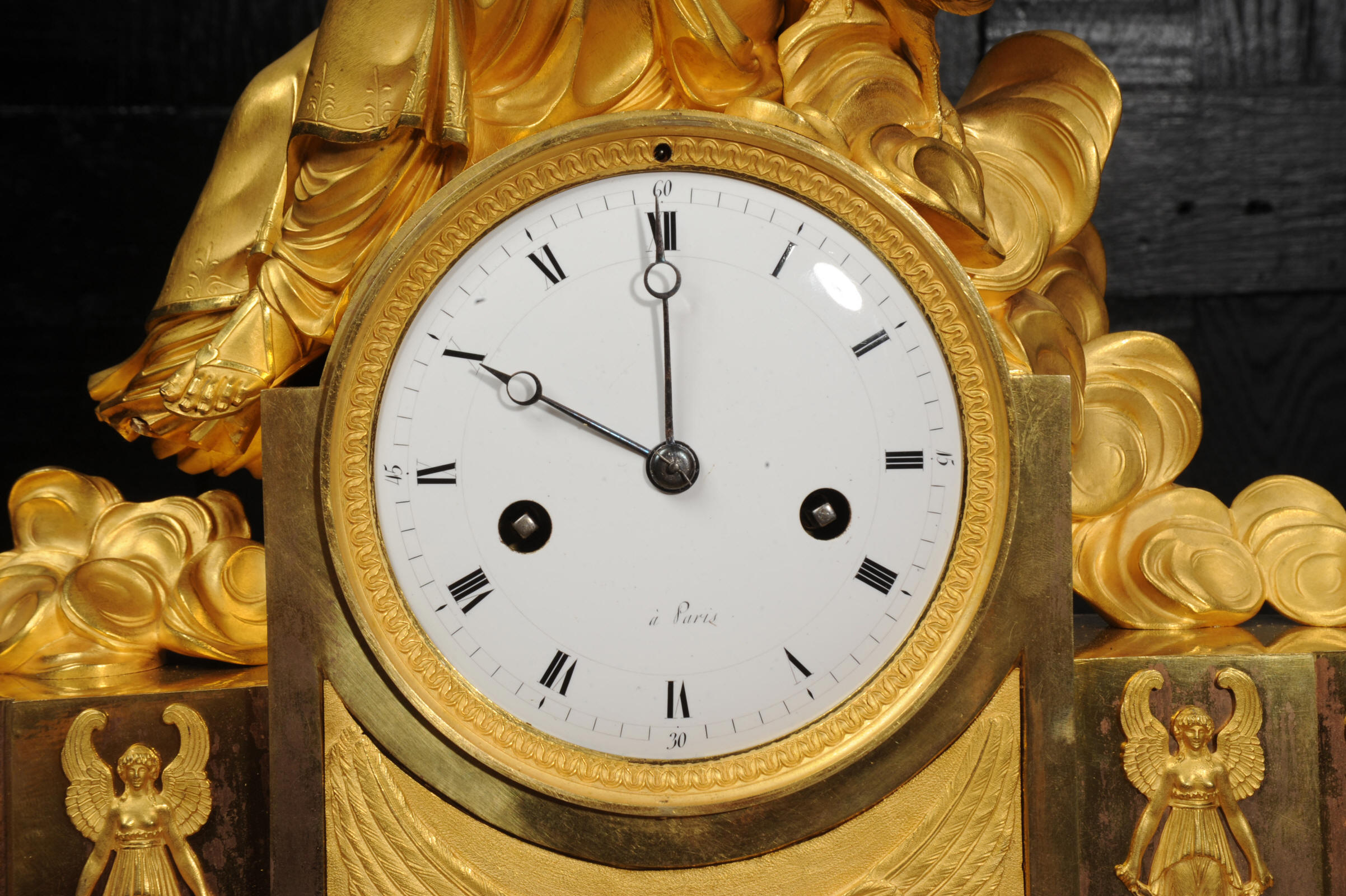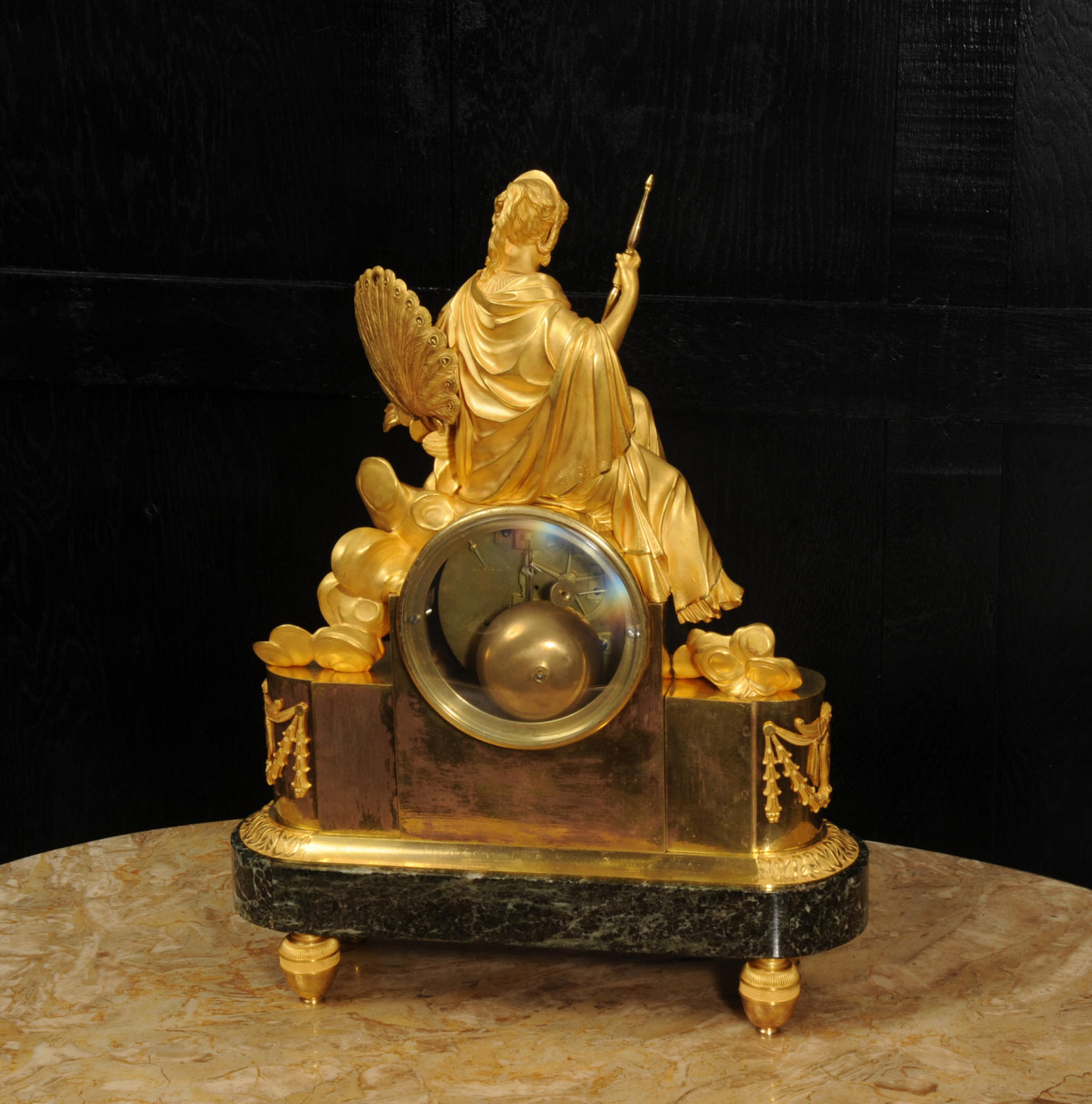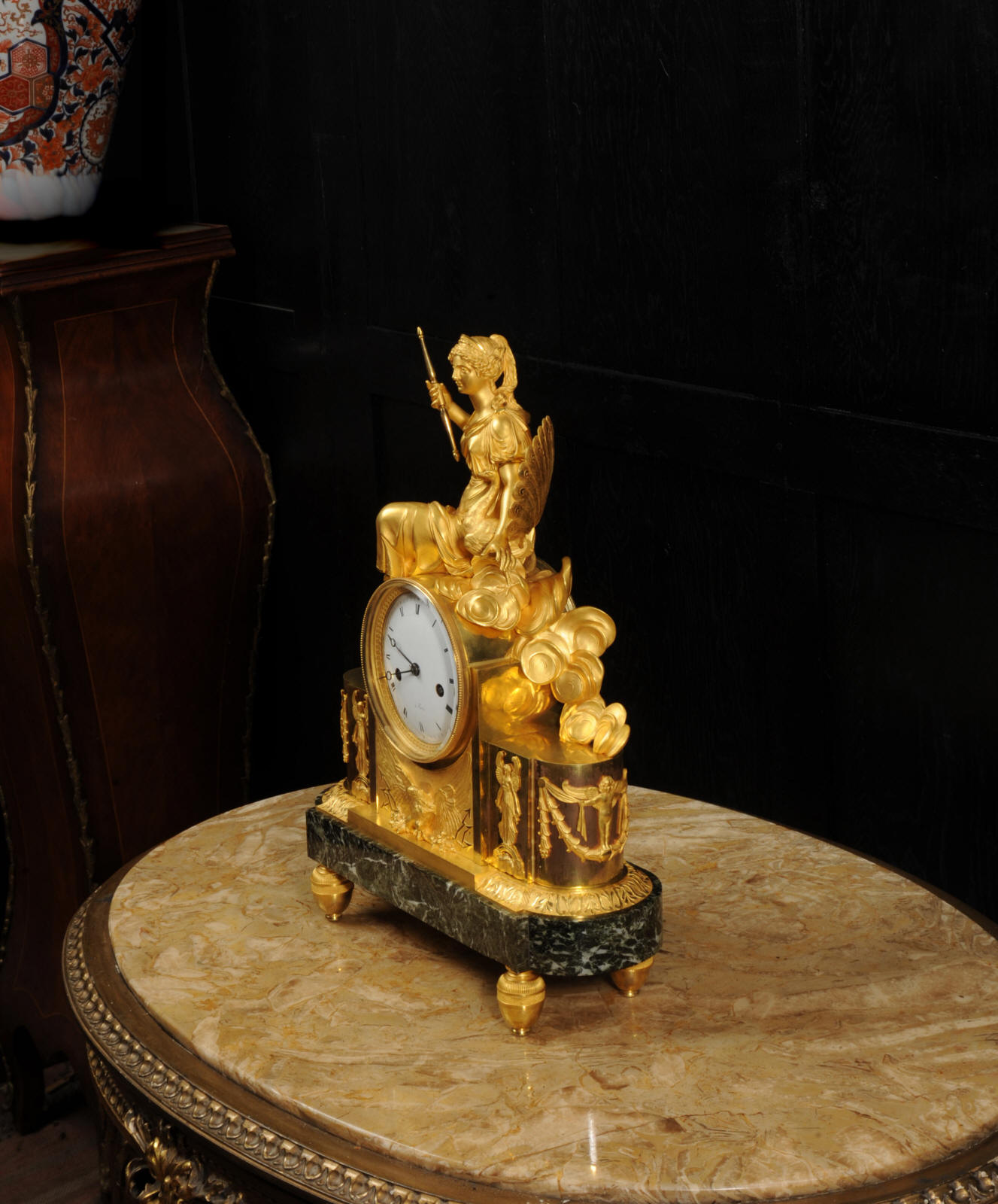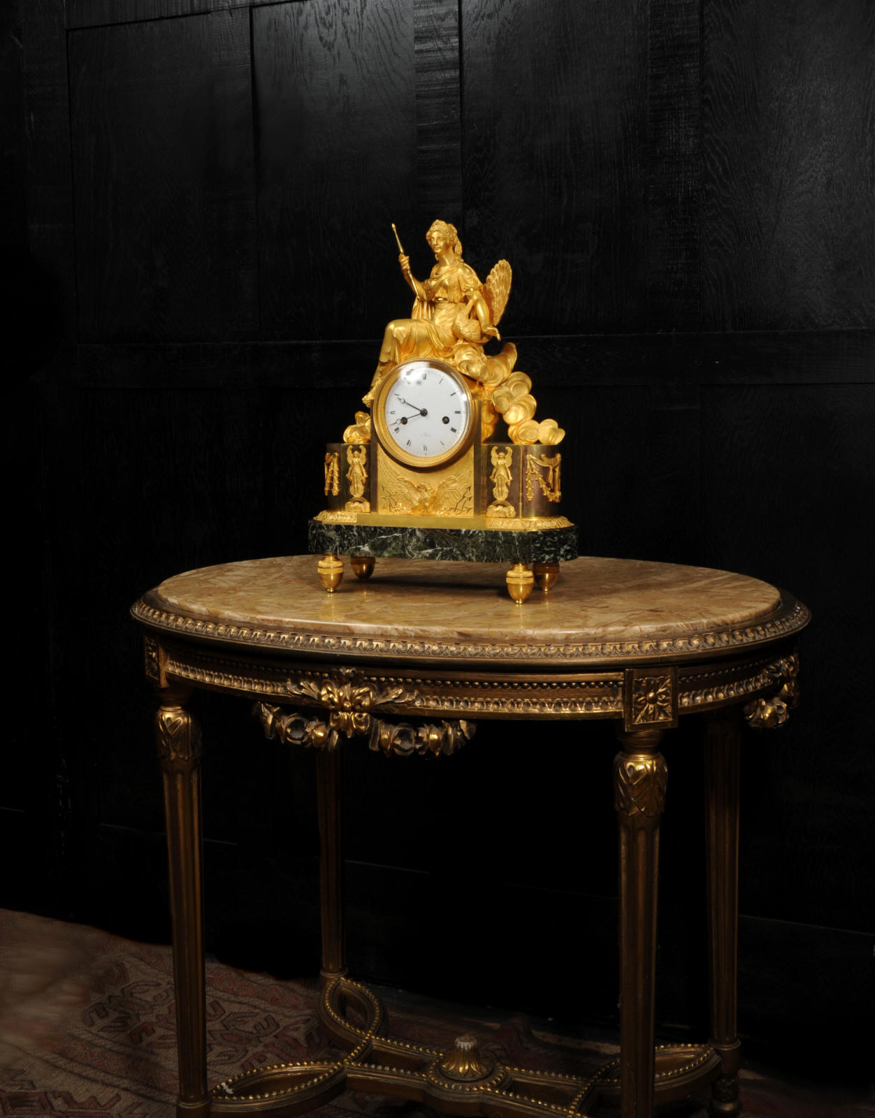 Below the dial is an ormolu panel showing an Eagle, representing Jupiter, with lighting bolts which as Jupiter's wife, Juno was able to hurl. The clock sits upon a green marble base with four feet. The fine porcelain dial is signed 'Paris' and is complete with blued steel Breguet hands and the original bayonet bezel. The rear door is also glazed to allow the pendulum to be seen. The French movement is of high quality and is signed on the backplate by the clockmaker Lesieur. It is in excellent clean and running condition having been fully overhauled by our clockmaker. It has a silk suspension and the pendulum is a replacement. It runs for 8 days and strikes the hours and halves on a bell. Click the video below to hear the bell and watch the clock running. Condition of the case is excellent; the original gilding is in stunning condition, just some wear to mainly the rear and the right hand side of the base, where less gold was originally applied. Possibly there were originally two further feet to the marble base, however the clock sits well on four feet. There is also possibly some repair / alteration to the bottom of Juno's right foot at some time. The rear bezel is a later hinged type rather than the bayonet fit of the front bezel. The dial is also in excellent condition just some tiny nibbles to the winding holes. Lesieur (fl. 1790-1850) was a highly respected but little documented clockmaker who worked in Paris during the last years of the eighteenth century and continued in business up until circa 1850. He was known to have regularly worked with Thomire and the greatest Parisian Bronziers. Tardy (Tardy, Dictionnaire des Horlogers Francais) notes that by 1806 he was established at Vieille rue du Temple; during 1812-20 and 1830-50 he was at rue de la Verrerie and in 1840 at Boulevard St. Martin. Elsewhere in the Paris almanacs he is recorded at Bar-du-Bec in 1839 and in 1840 at rue des Alexiens. Lesieur’s name also appears on a number of complex and important clocks, counting among them a mantle clock showing signs of the zodiac with marble columns of 1807-8, in the Hôtel de l’Intendance de la Généralité de Metz, Moselle (originally the Préfecture de la Moselle et de la Région Lorraine). The latter is probably a pair to another identical clock by Lesieur in the Château de Nymphenburg in Bavaria. Lesieur also made the movements for a variety of other clocks, from a late Louis XVI Sèvres porcelain lyre clock to Empire figural clocks. Among them is one featuring Jason and the Golden Fleece which is housed at the Musée de la Malmaison in the appartements de Joséphine de Beauharnais. During the Restauration he also collaborated with the Parisian firm of bronziers Choiselat-Gallien who worked for the Garde-Meuble and were appointed to Monsieur, Frère du Roi.