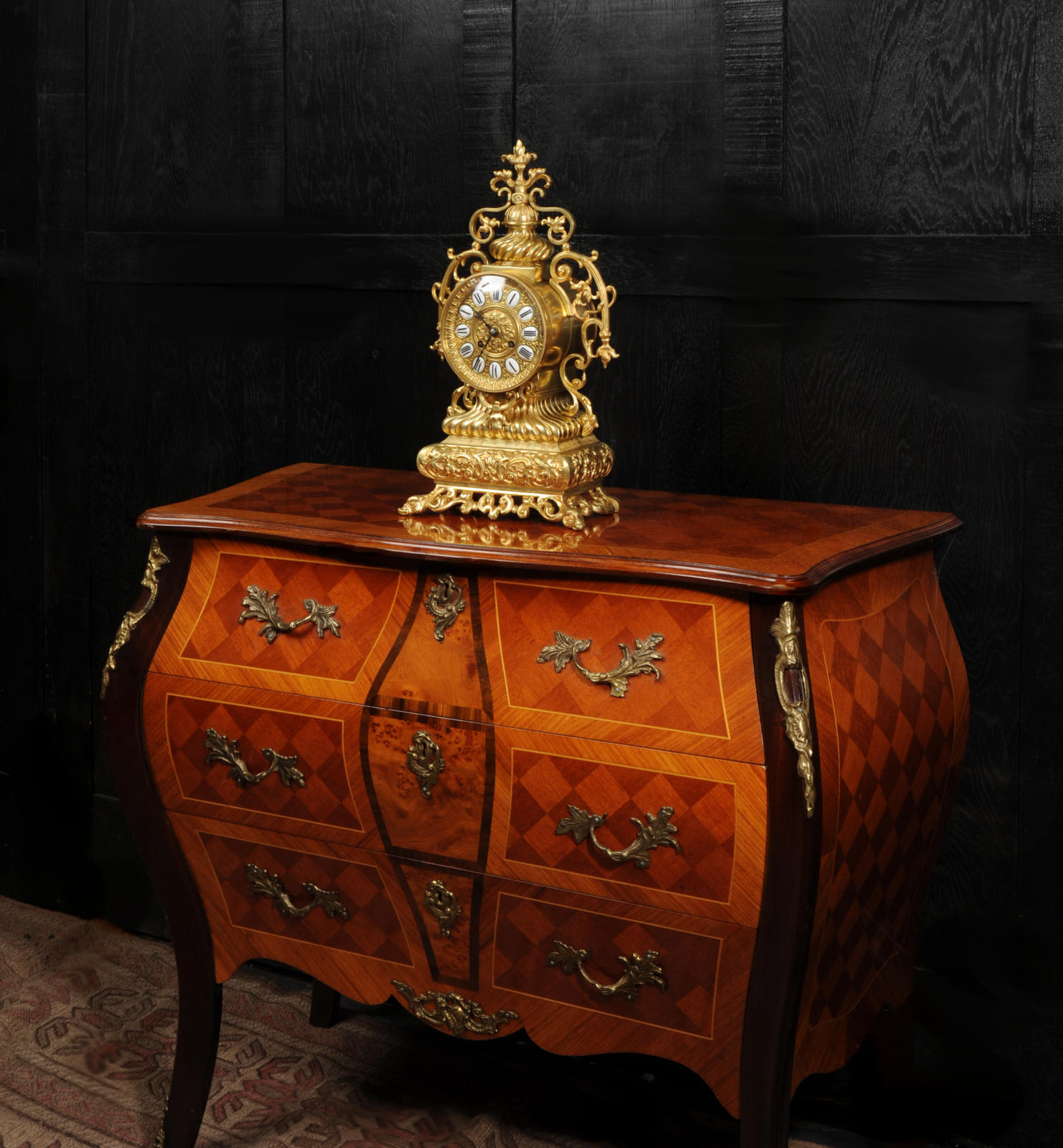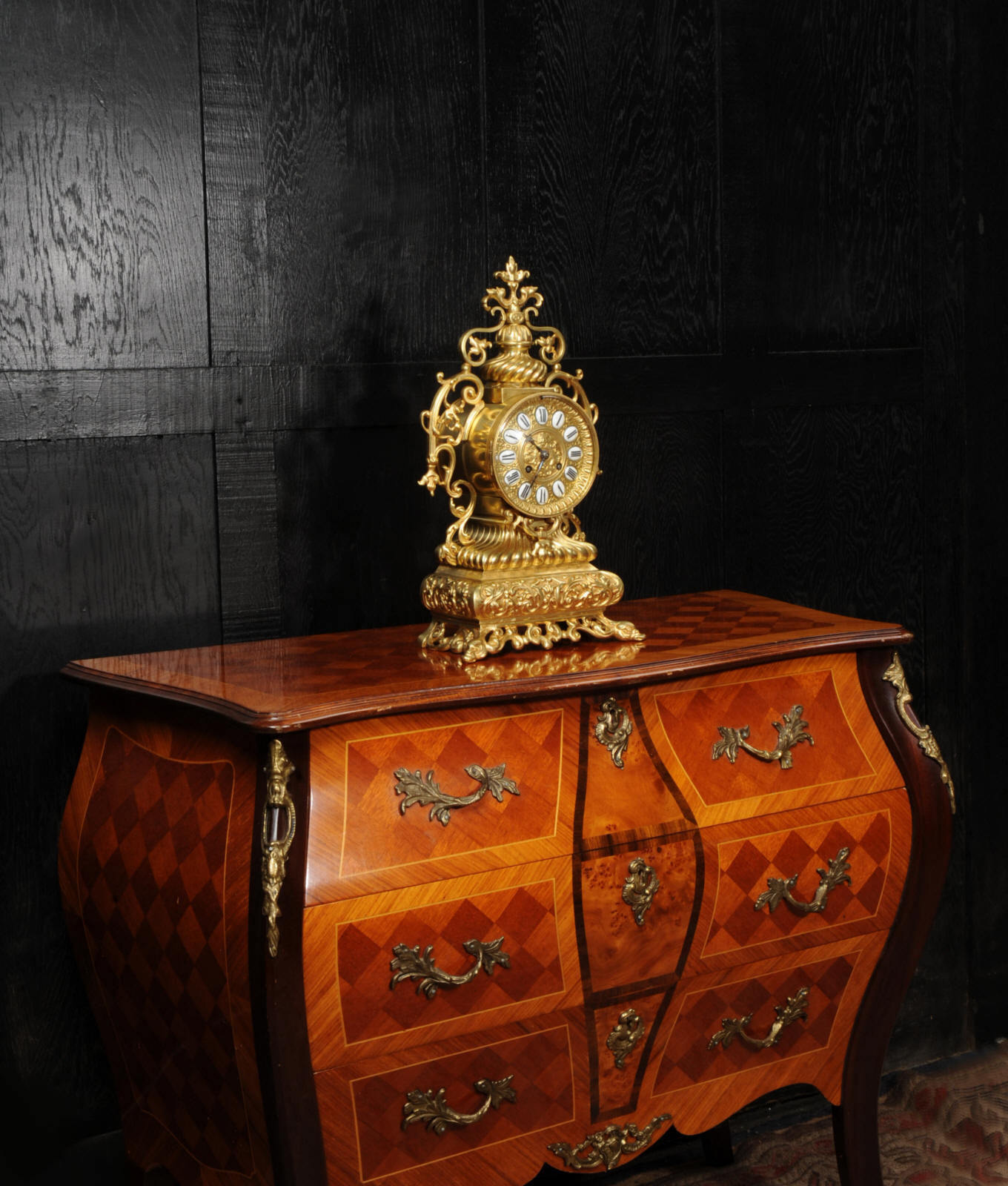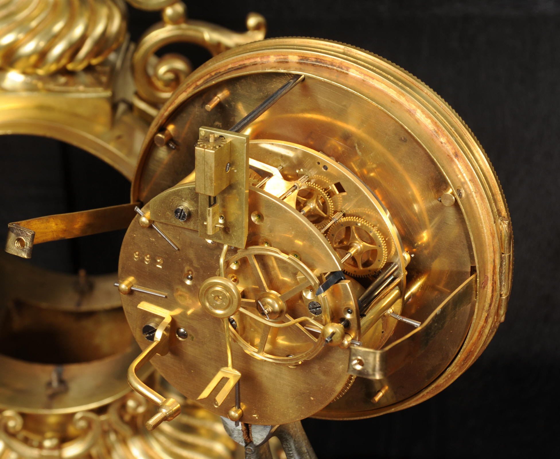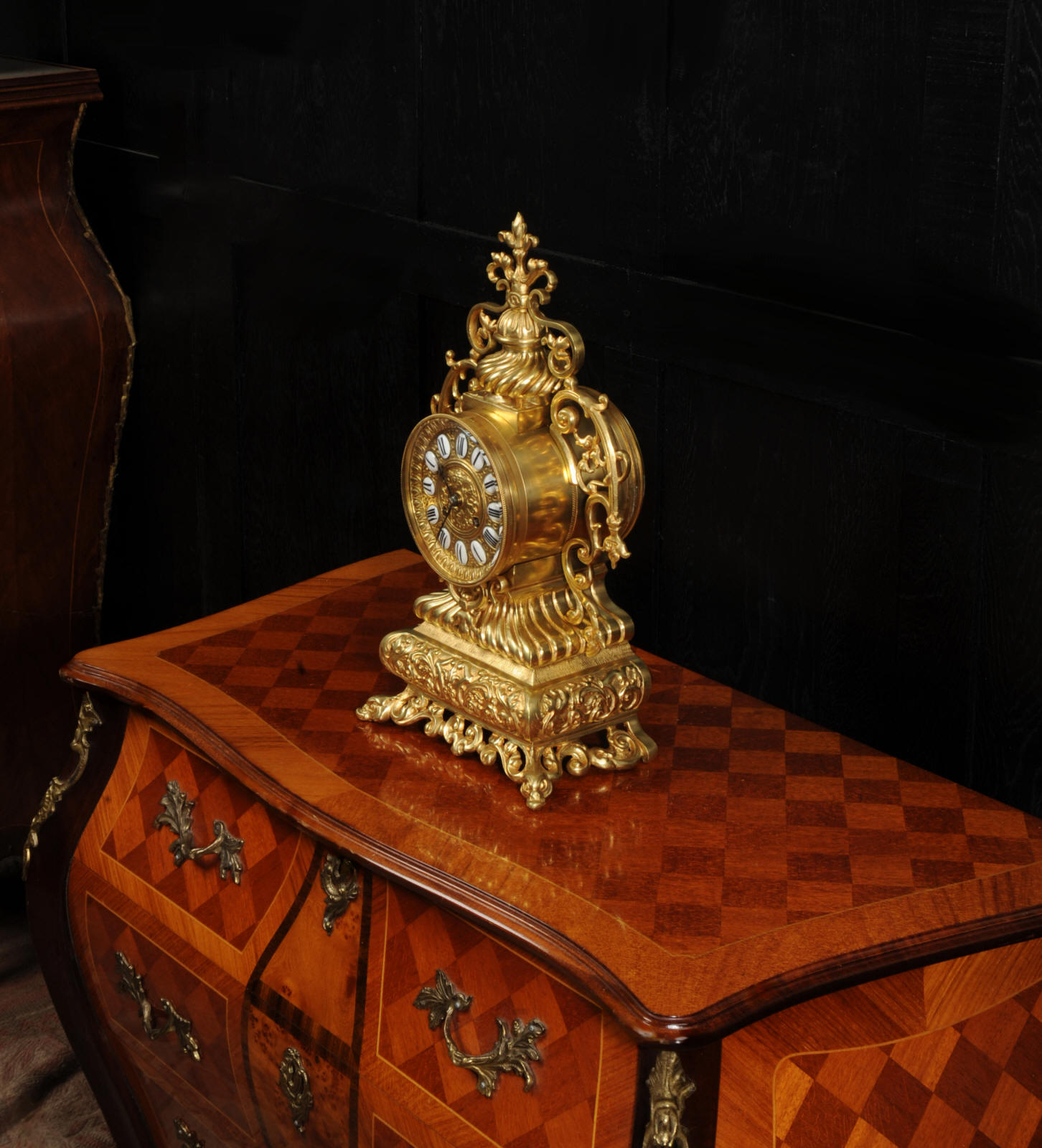 The dial is also gilt bronze with 12 individual enamel cartouches and blued steel hands. The front bezel is glazed with convex glass and the rear door with heavy beveled glass to allow the movement to be seen. The French movement is of high quality and is in excellent clean and running condition having been fully overhauled by our clockmaker. Pendulum is a replacement. It runs for 8 days and strikes the hours and halves on a bell. Click the video below to hear the bell and watch the clock running.