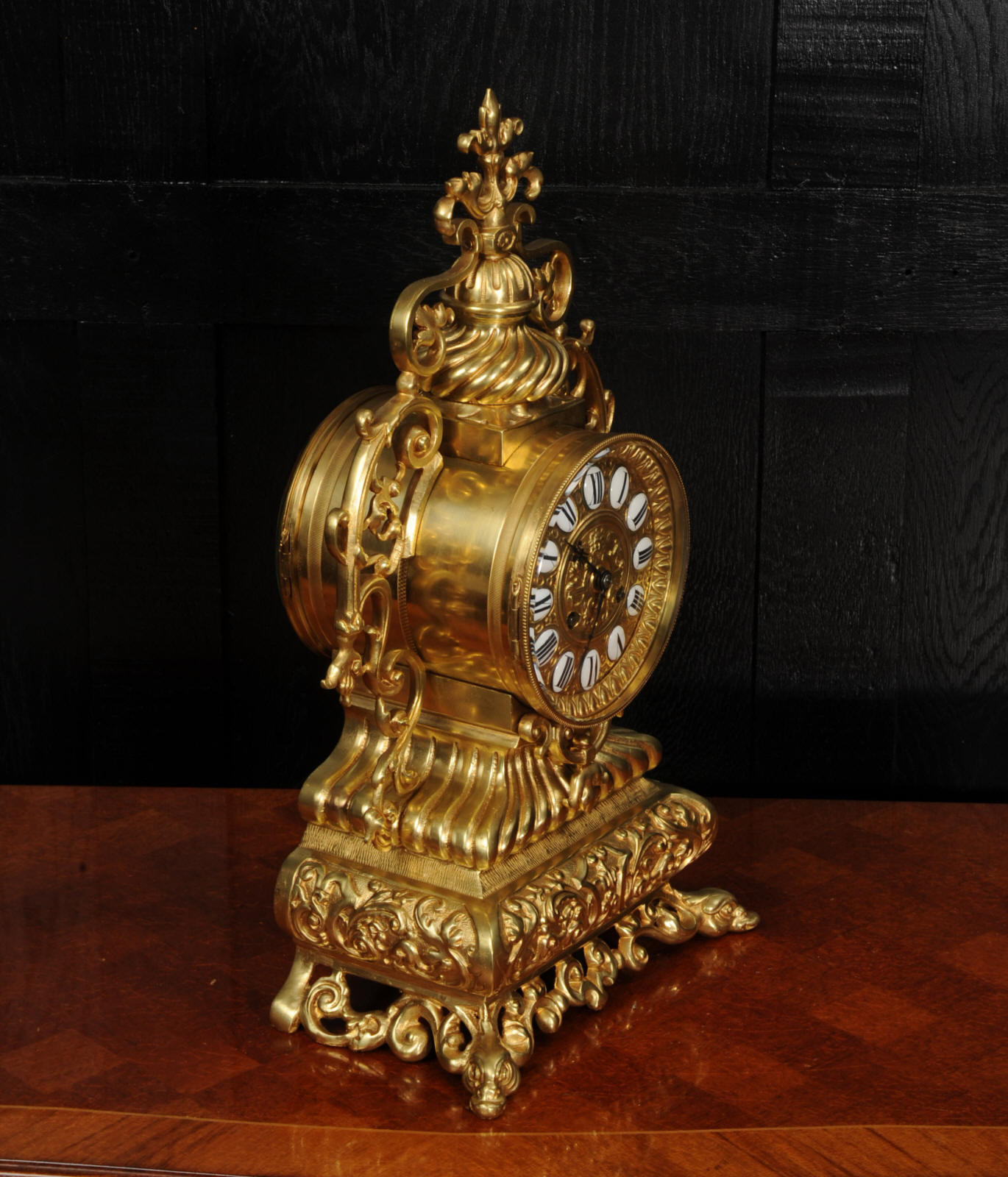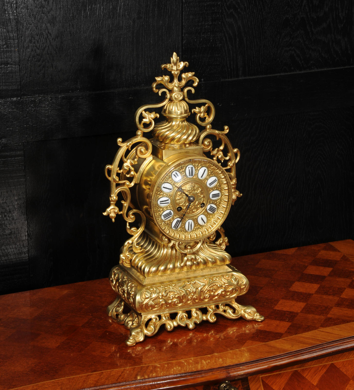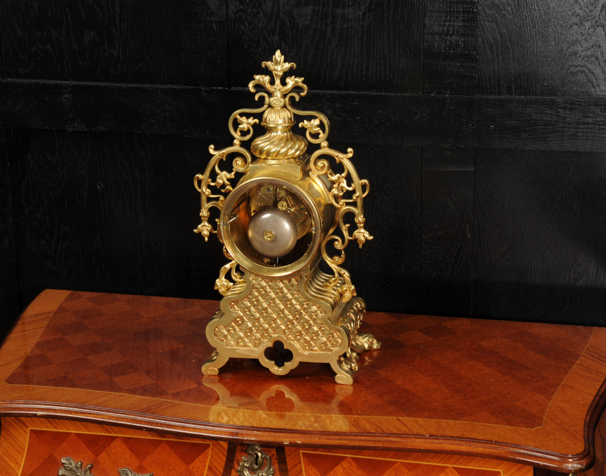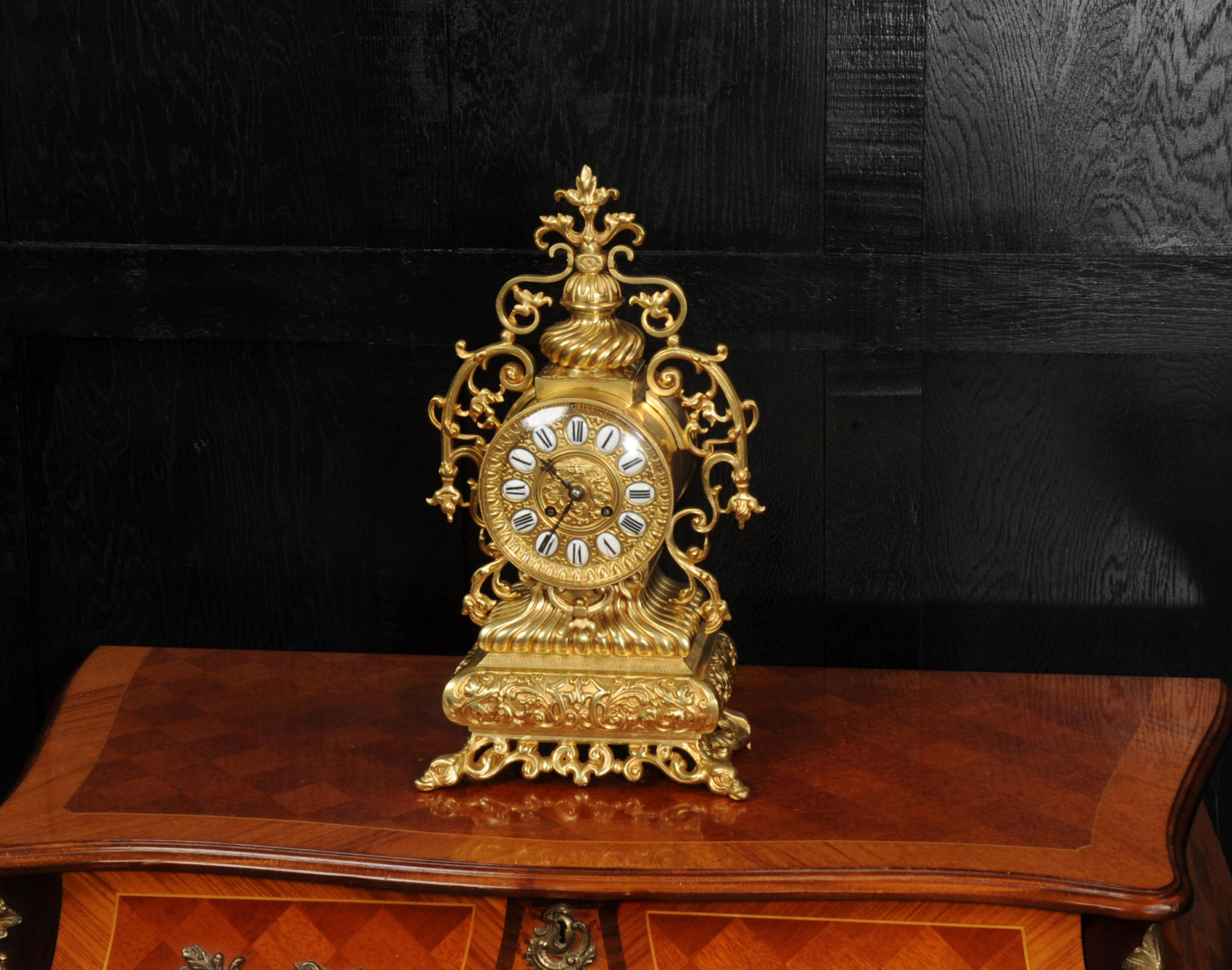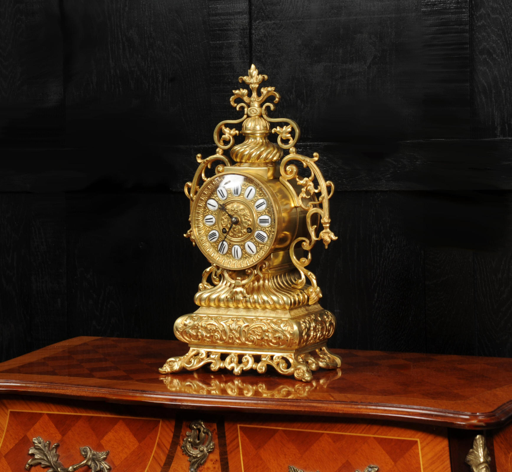 The dial is also gilt bronze with 12 individual enamel cartouches and blued steel hands. The front bezel is glazed with convex glass and the rear door with heavy beveled glass to allow the movement to be seen. The French movement is of high quality and is in excellent clean and running condition having been fully overhauled by our clockmaker. Pendulum is a replacement. It runs for 8 days and strikes the hours and halves on a bell. Click the video below to hear the bell and watch the clock running.