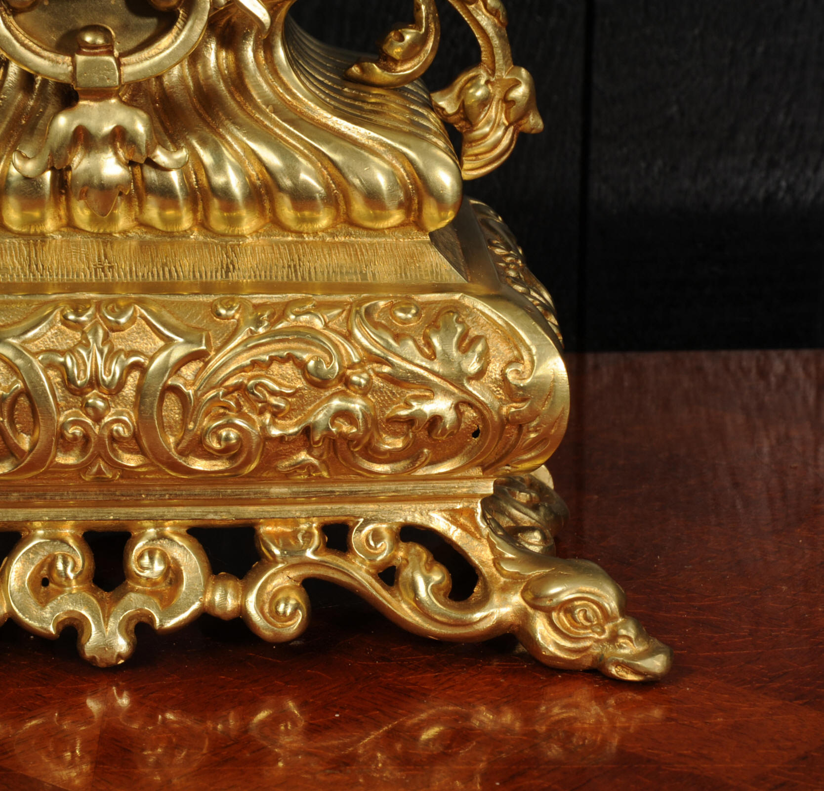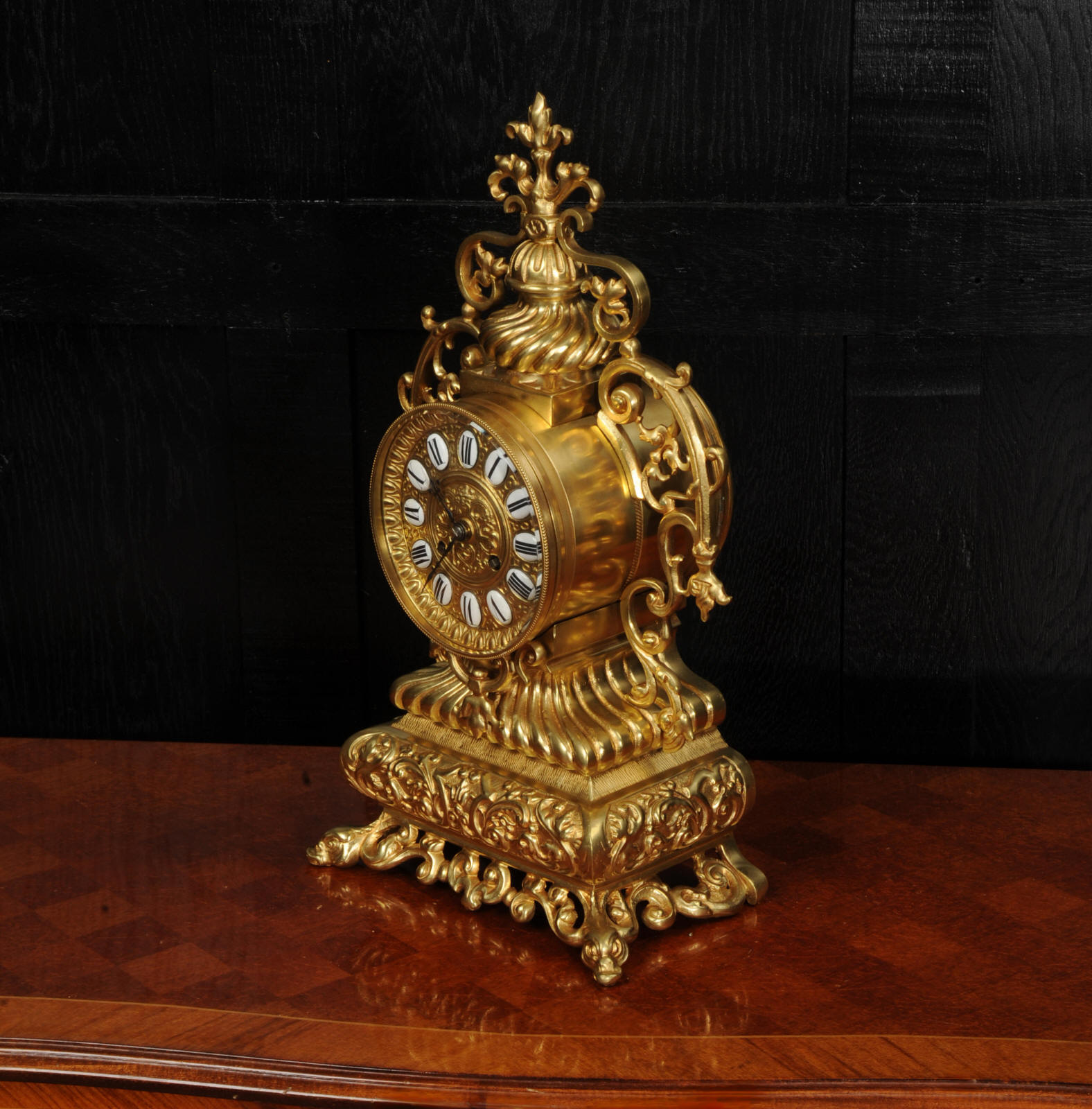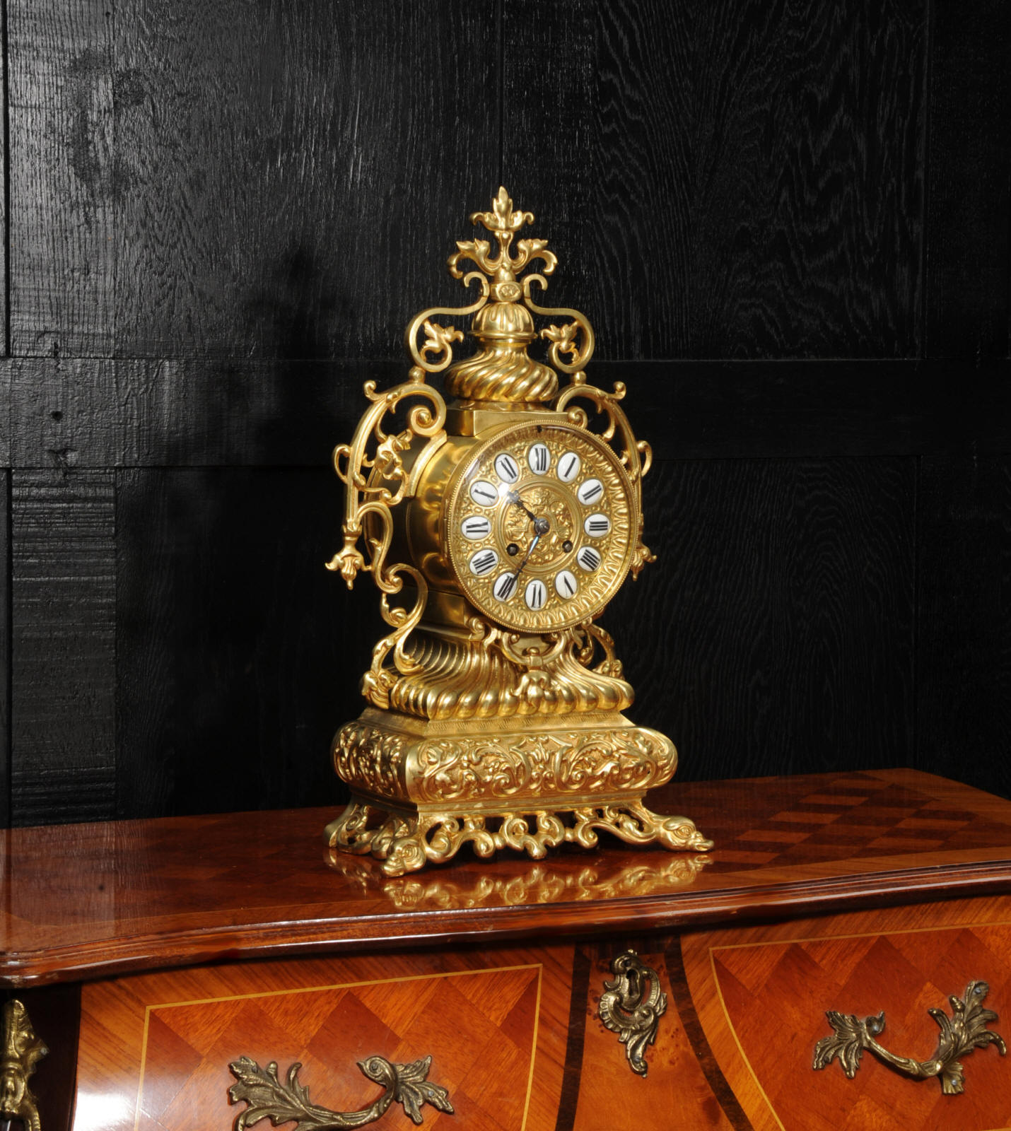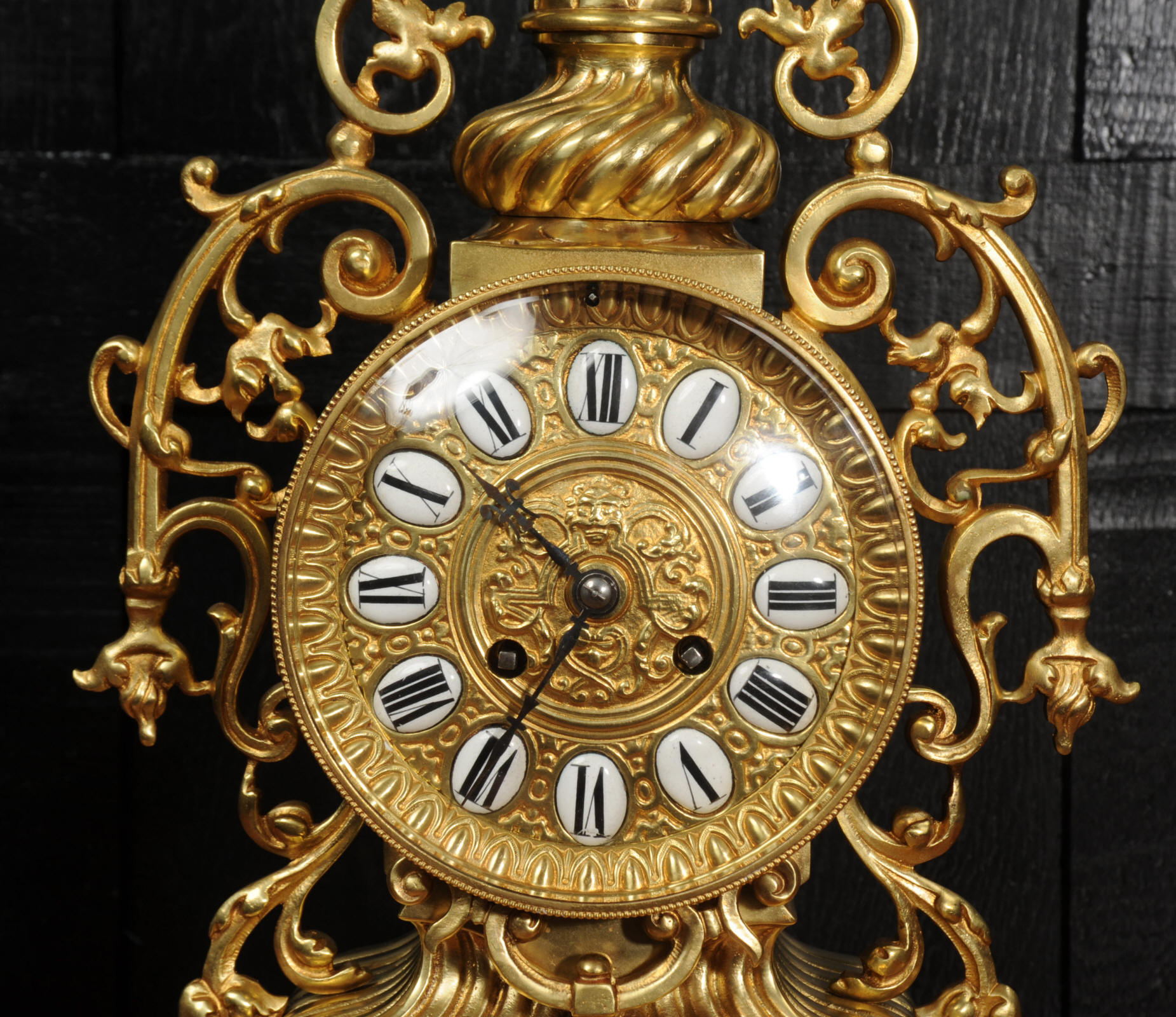 The dial is also gilt bronze with 12 individual enamel cartouches and blued steel hands. The front bezel is glazed with convex glass and the rear door with heavy beveled glass to allow the movement to be seen. The French movement is of high quality and is in excellent clean and running condition having been fully overhauled by our clockmaker. Pendulum is a replacement. It runs for 8 days and strikes the hours and halves on a bell. Click the video below to hear the bell and watch the clock running.