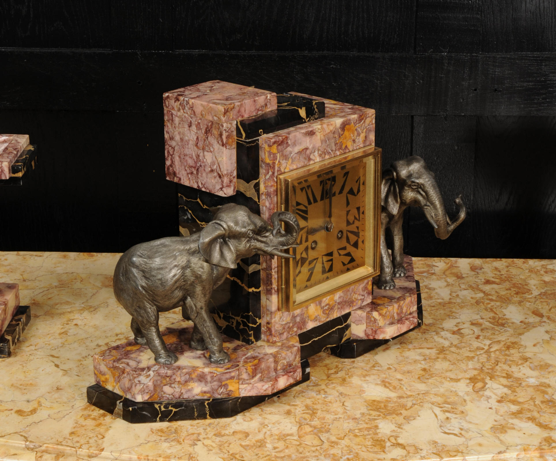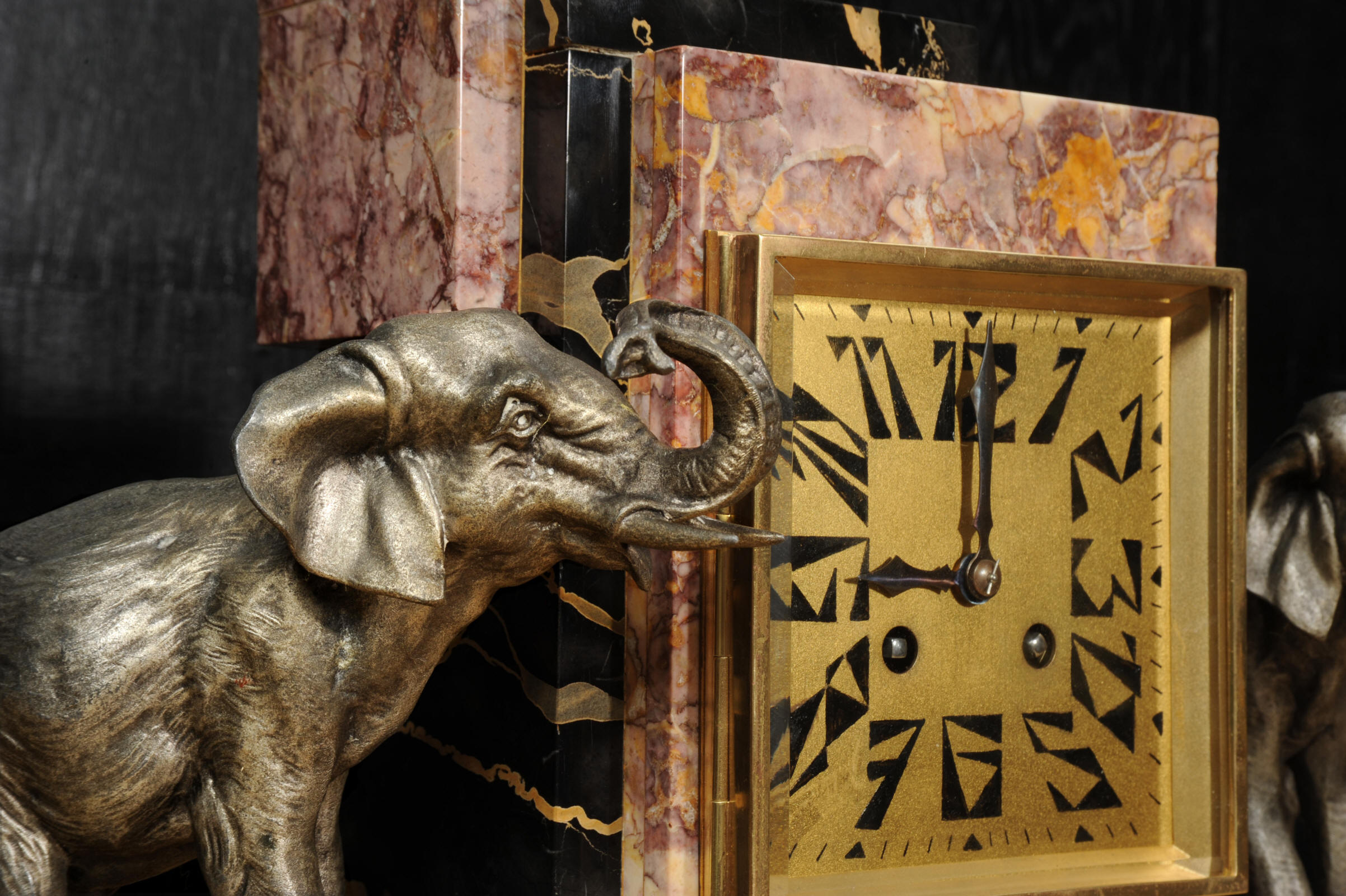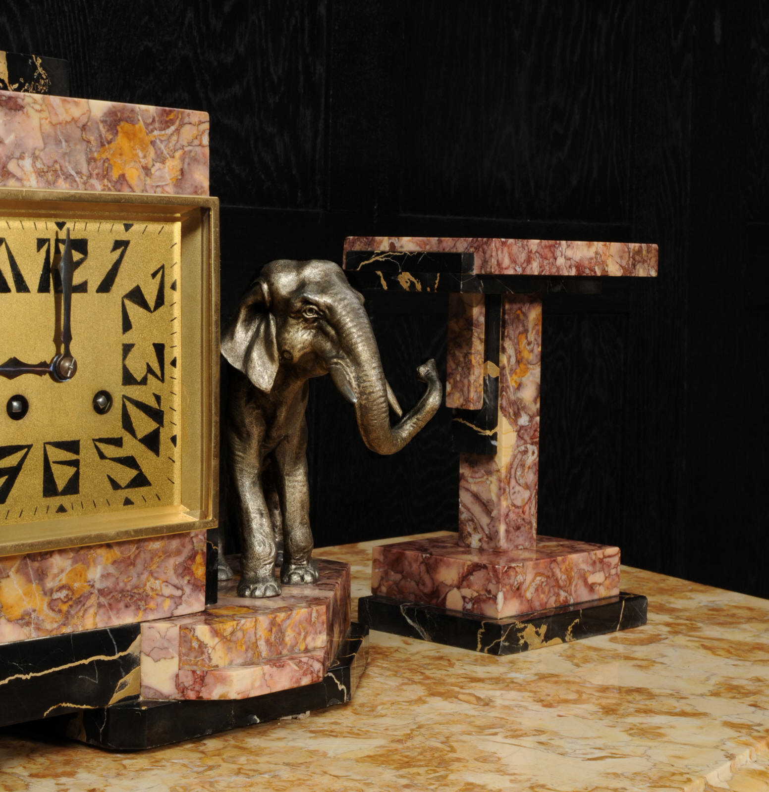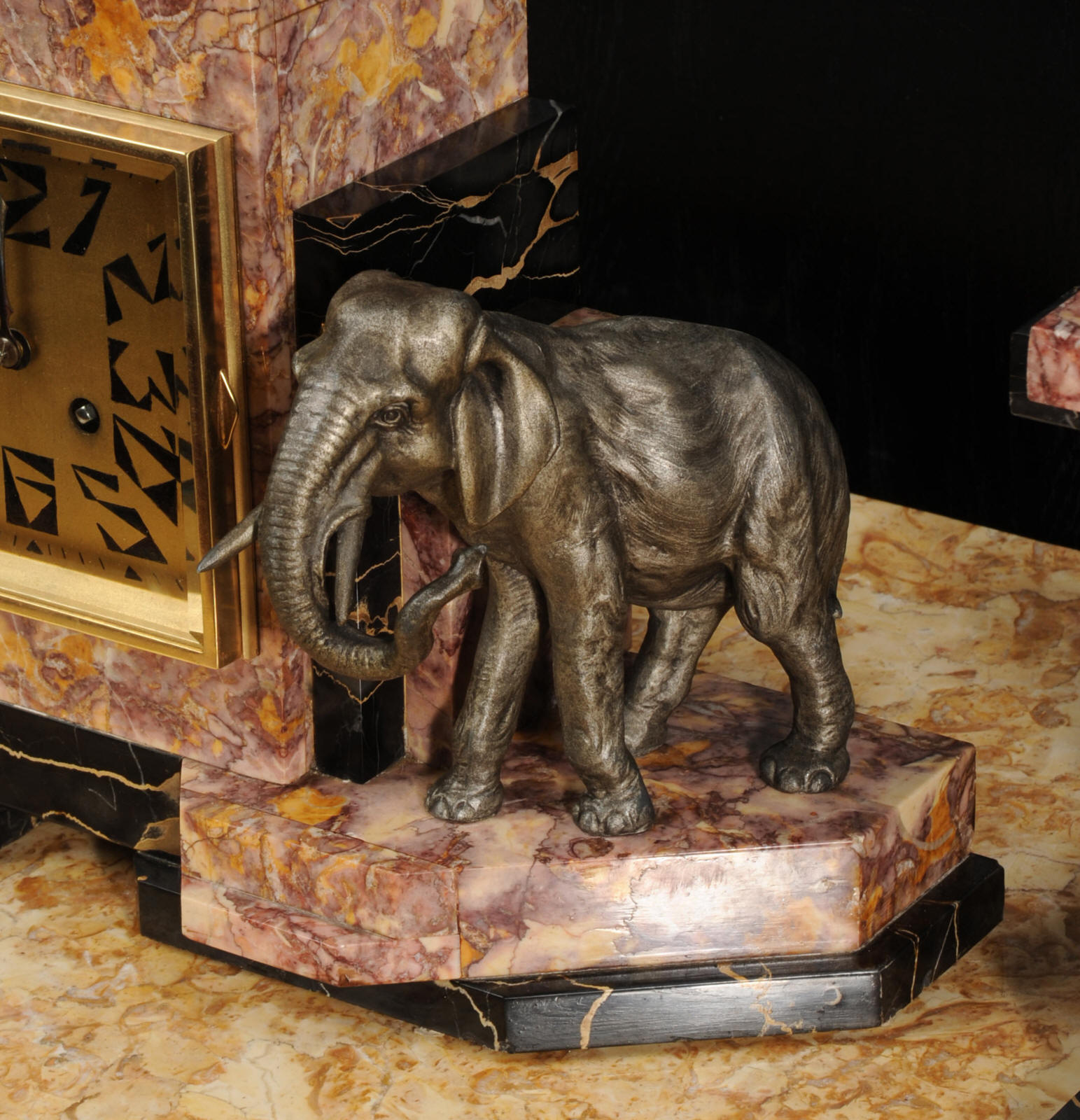The dial is of high quality with a heavy gilded bezel with beveled glass enclosing a matted gold dial with Art Deco lettering and blued steel hands. The French movement is a traditional 'Pendule de Paris' movement with a pendulum and is of high quality. It is by the Parisian maker Silvin and is in excellent clean and running condition having been fully overhauled by our clockmaker. Pendulum is a replacement. It runs for 8 days and strikes the hours and halves on a bell. Click the video below to hear the bell and watch the clock running. Condition of the case is excellent, the marble has a lovely polish, there are some minor nibbles to the marble mostly along the bottom edges and corners. The is a small patch of lost polish to the top of one side piece. The dial is excellent with some re-touching to the lettering and some light marks, mostly between the '7' and '8'. Elephants are also very good with just some light wear to the original finish.