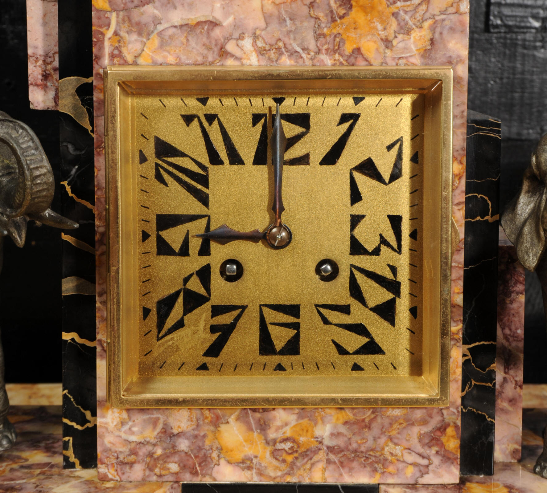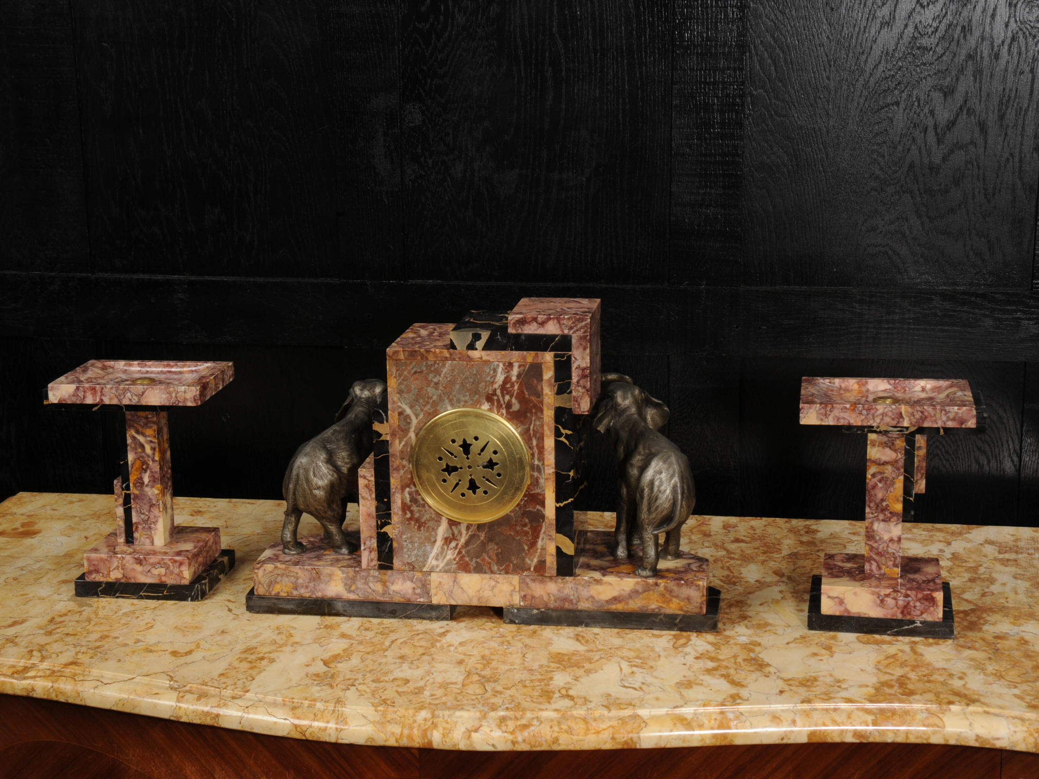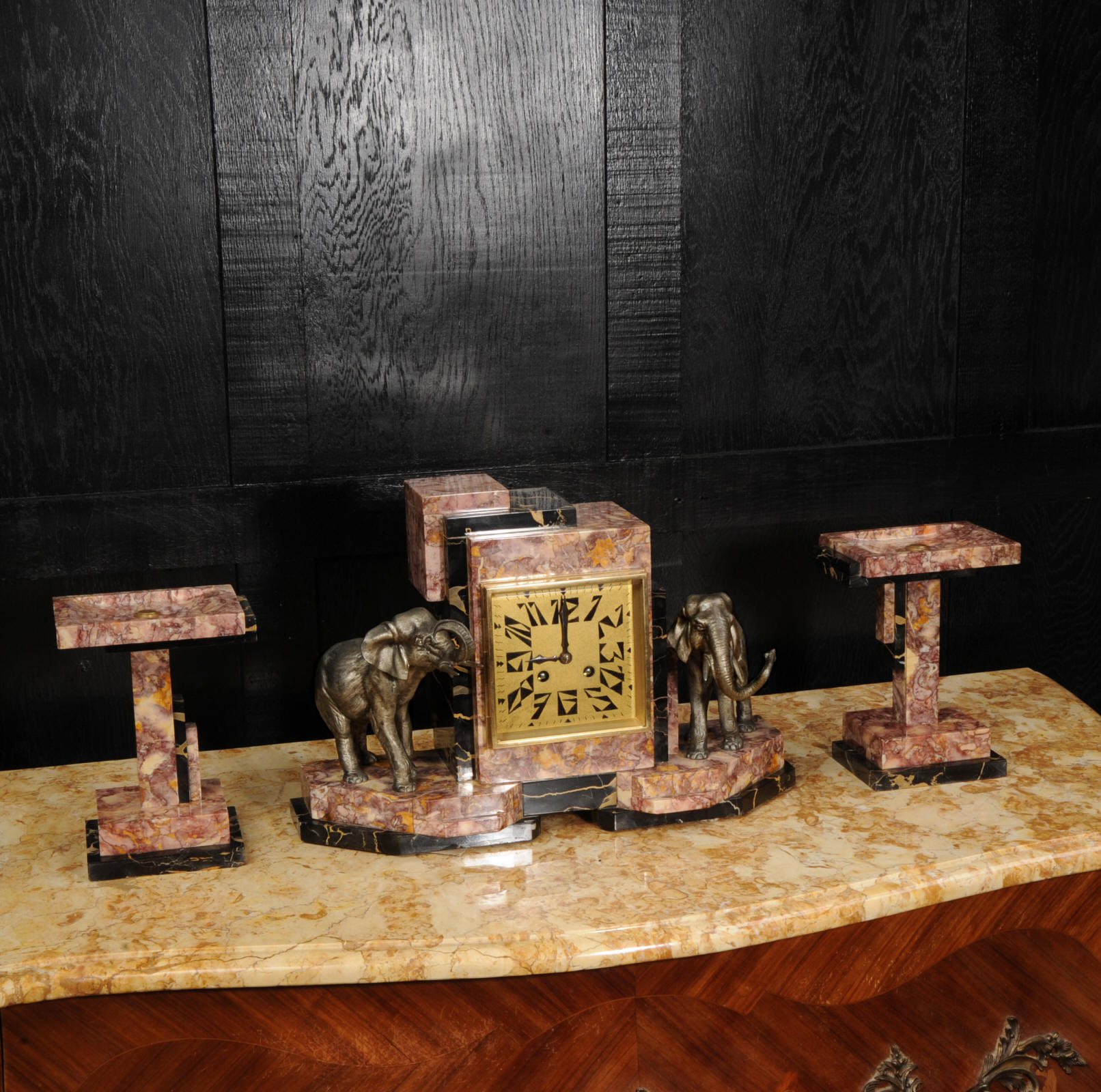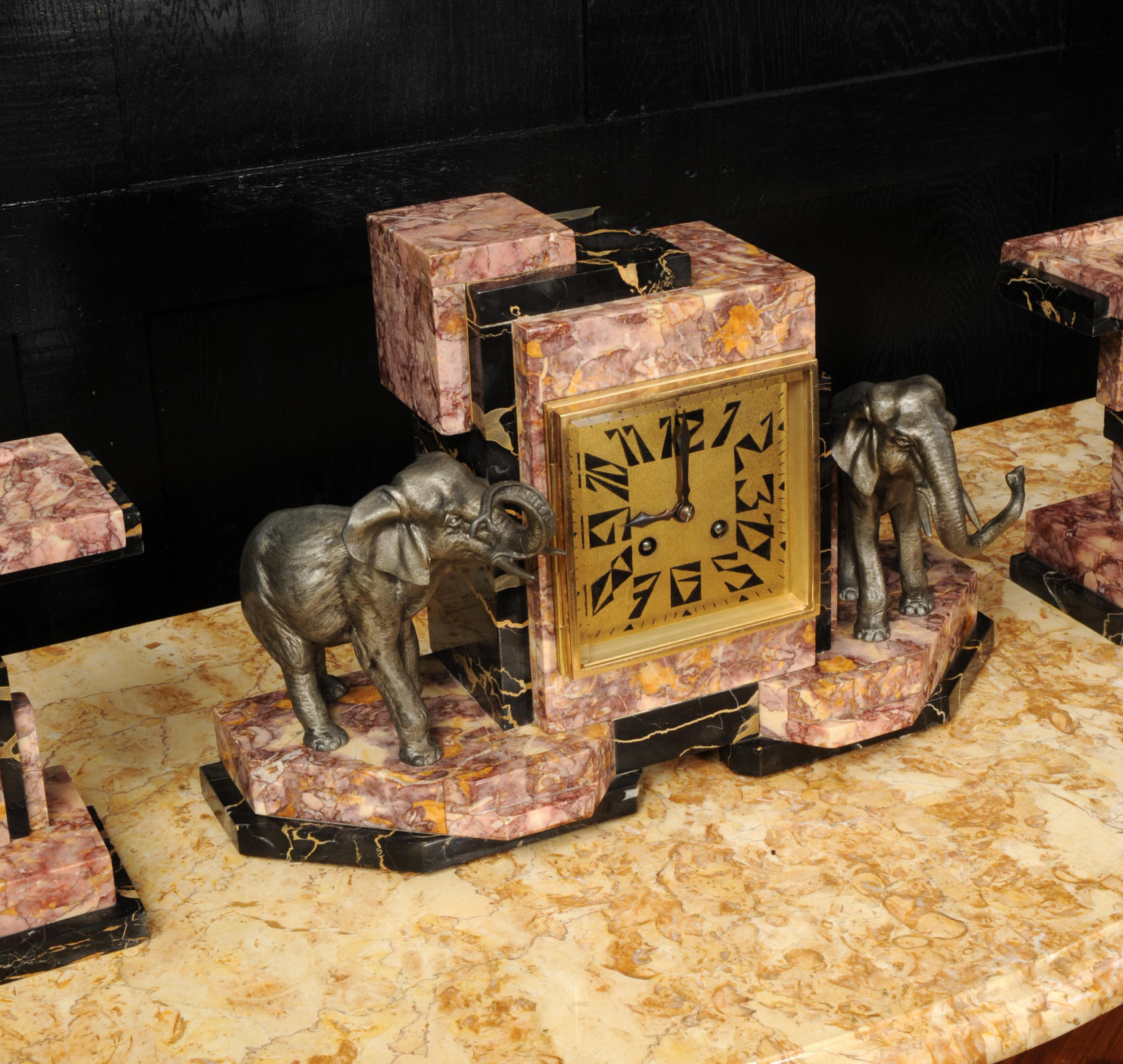 The dial is of high quality with a heavy gilded bezel with beveled glass enclosing a matted gold dial with Art Deco lettering and blued steel hands. The French movement is a traditional 'Pendule de Paris' movement with a pendulum and is of high quality. It is by the Parisian maker Silvin and is in excellent clean and running condition having been fully overhauled by our clockmaker. Pendulum is a replacement. It runs for 8 days and strikes the hours and halves on a bell. Click the video below to hear the bell and watch the clock running. Condition of the case is excellent, the marble has a lovely polish, there are some minor nibbles to the marble mostly along the bottom edges and corners. The is a small patch of lost polish to the top of one side piece. The dial is excellent with some re-touching to the lettering and some light marks, mostly between the '7' and '8'. Elephants are also very good with just some light wear to the original finish.