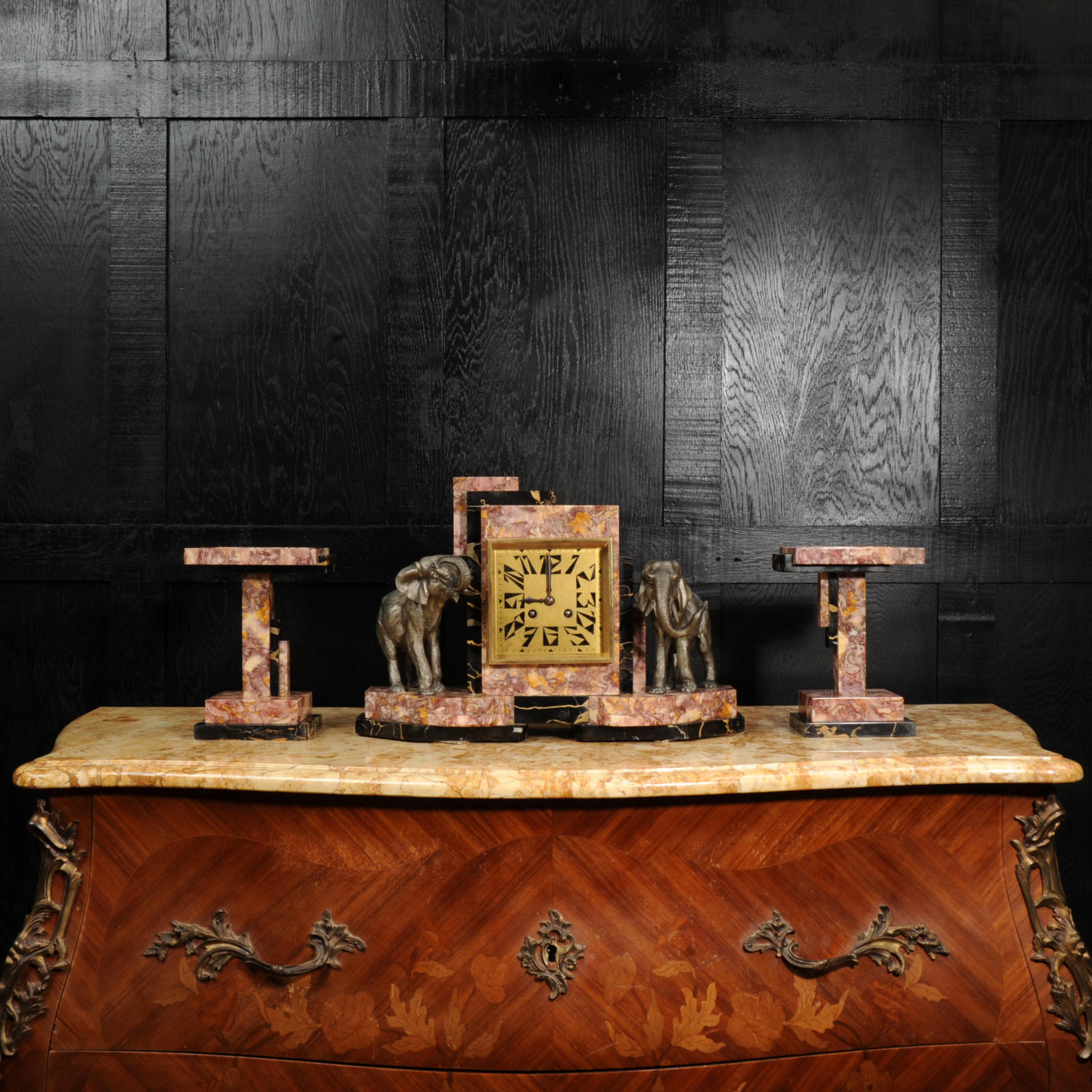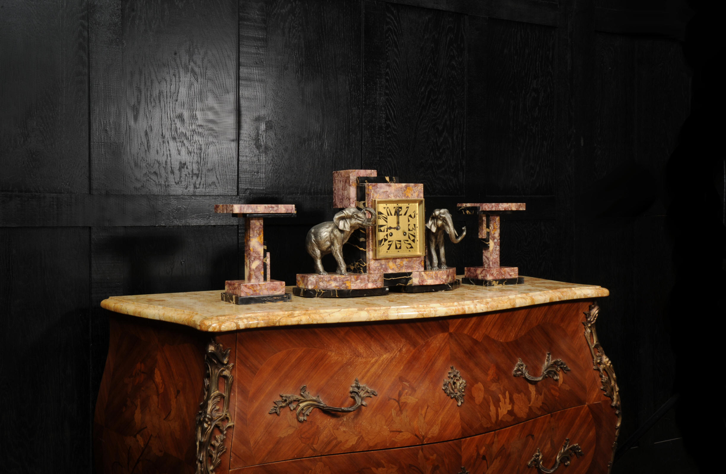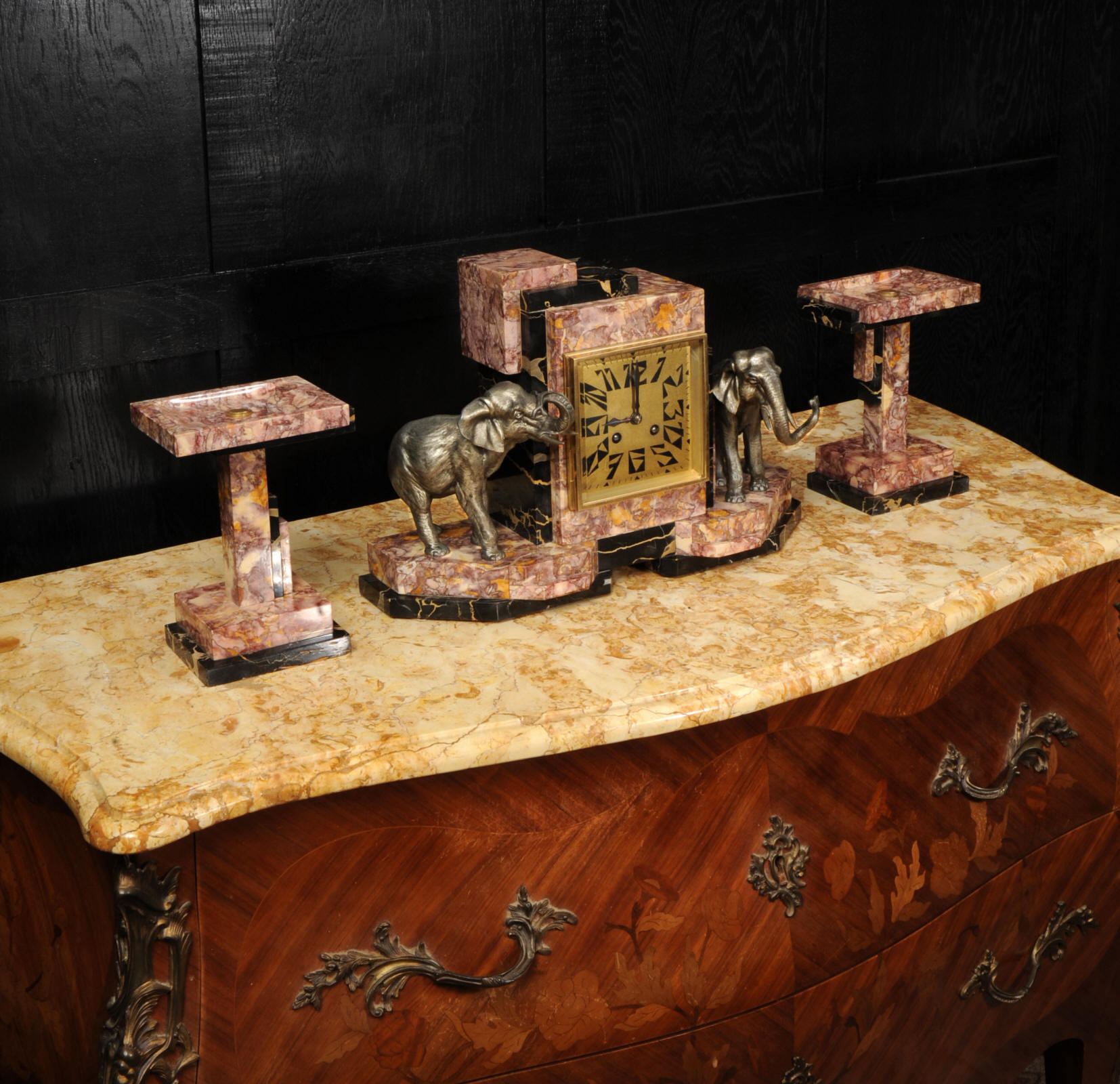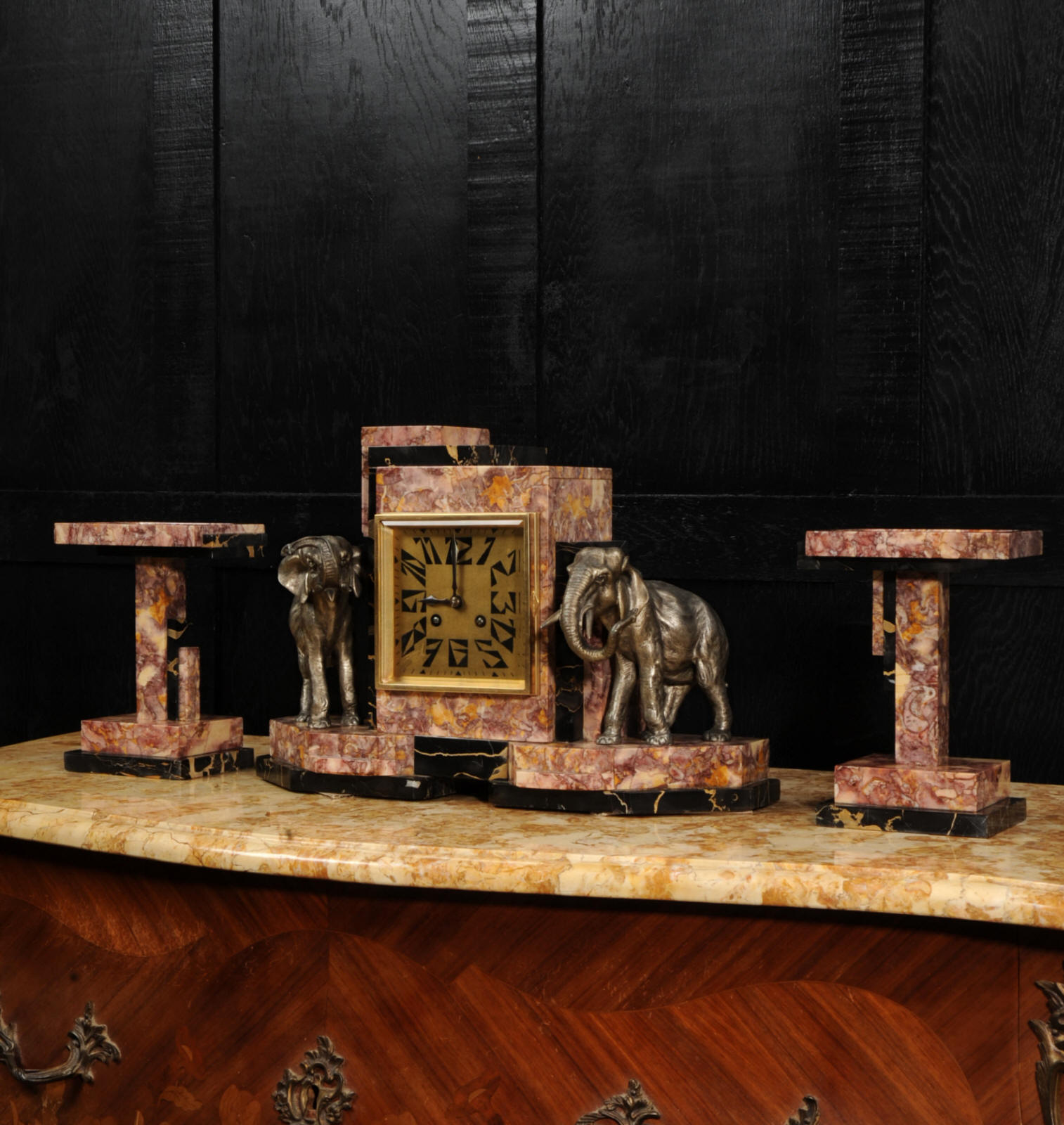 The dial is of high quality with a heavy gilded bezel with beveled glass enclosing a matted gold dial with Art Deco lettering and blued steel hands. The French movement is a traditional 'Pendule de Paris' movement with a pendulum and is of high quality. It is by the Parisian maker Silvin and is in excellent clean and running condition having been fully overhauled by our clockmaker. Pendulum is a replacement. It runs for 8 days and strikes the hours and halves on a bell. Click the video below to hear the bell and watch the clock running. Condition of the case is excellent, the marble has a lovely polish, there are some minor nibbles to the marble mostly along the bottom edges and corners. The is a small patch of lost polish to the top of one side piece. The dial is excellent with some re-touching to the lettering and some light marks, mostly between the '7' and '8'. Elephants are also very good with just some light wear to the original finish.
