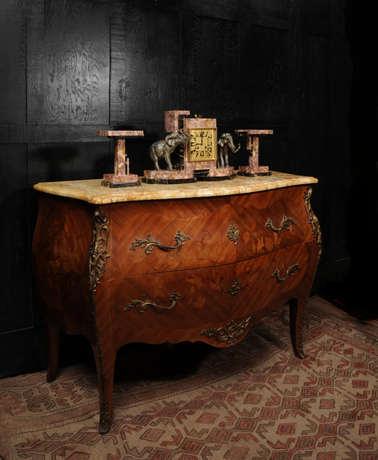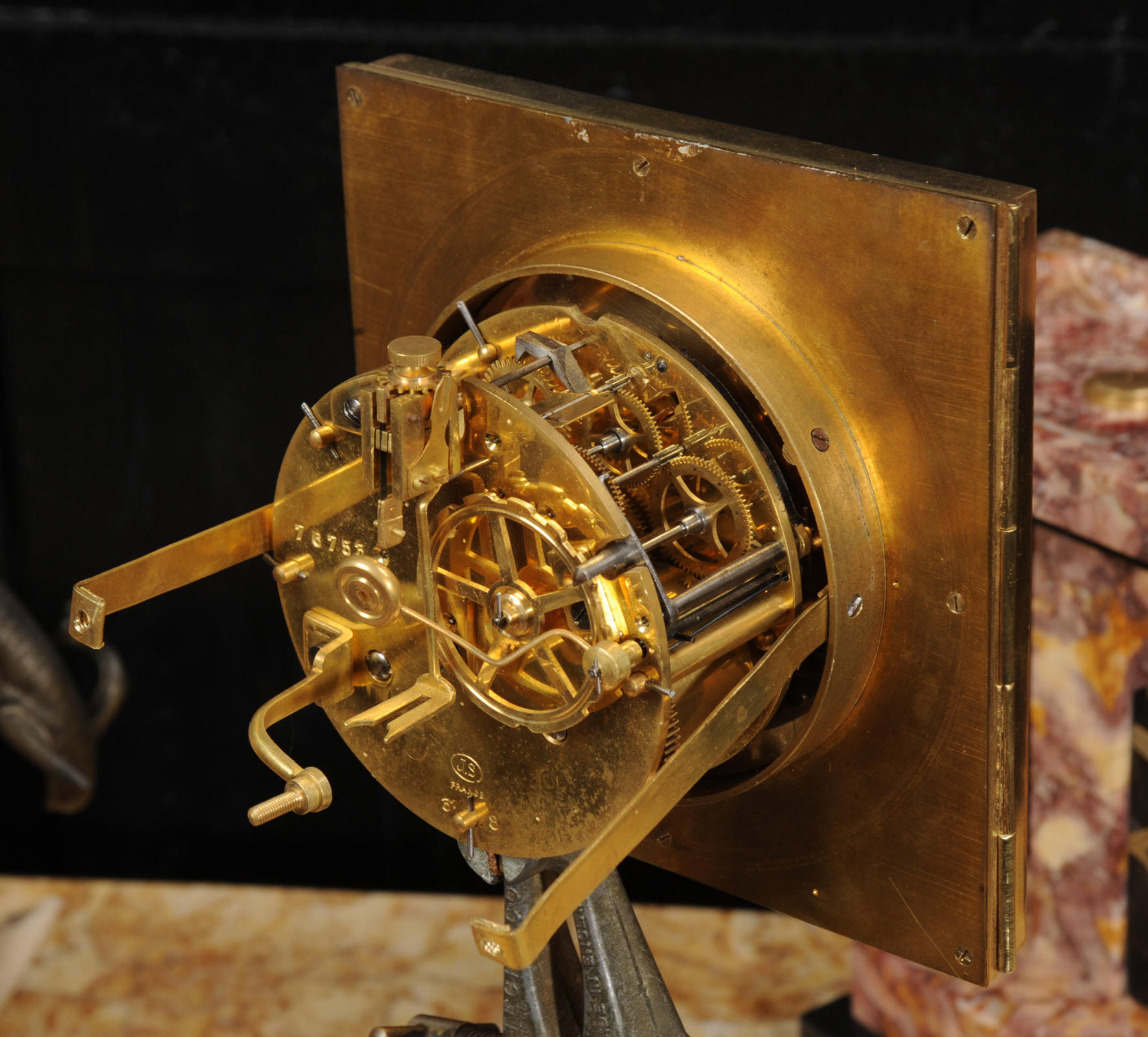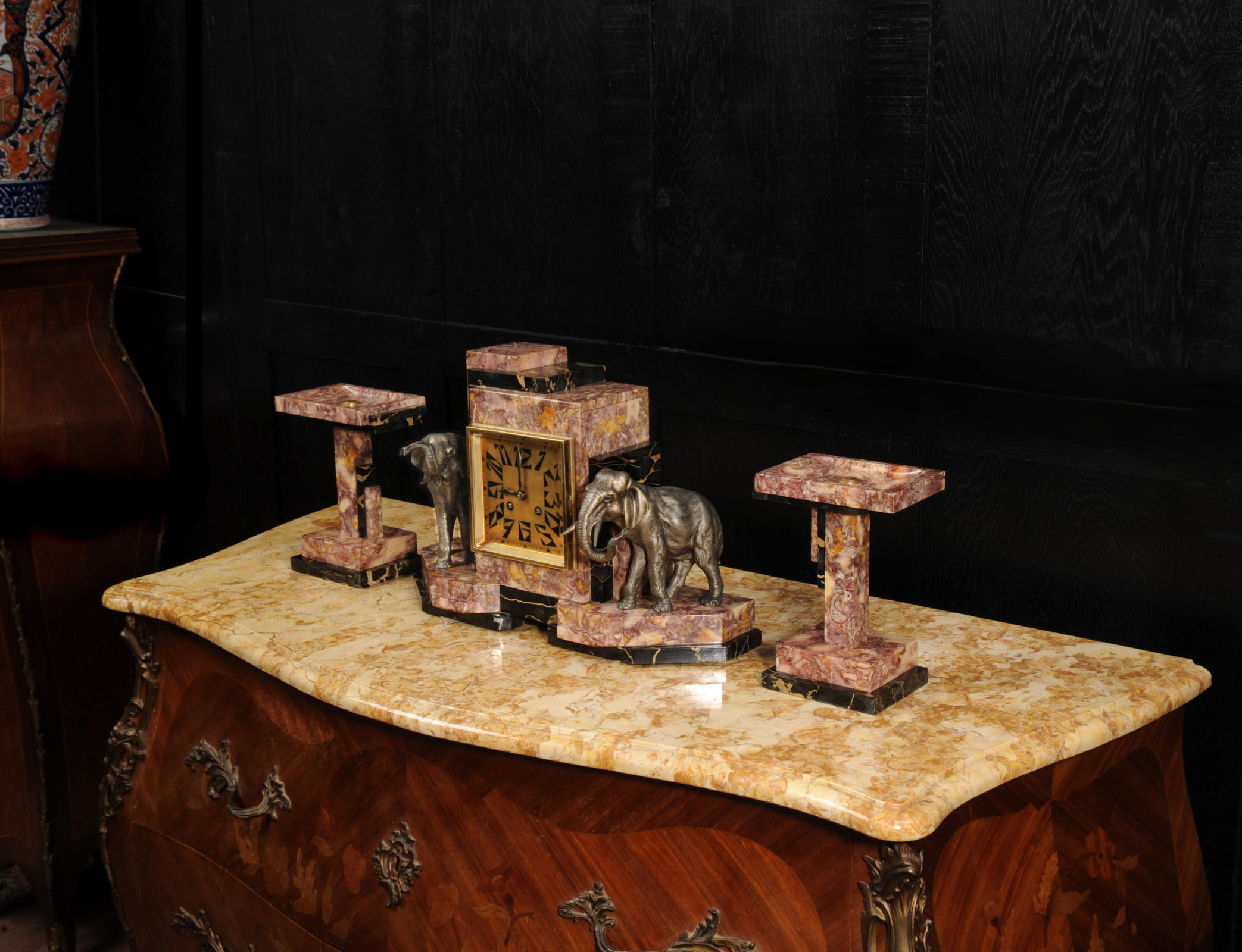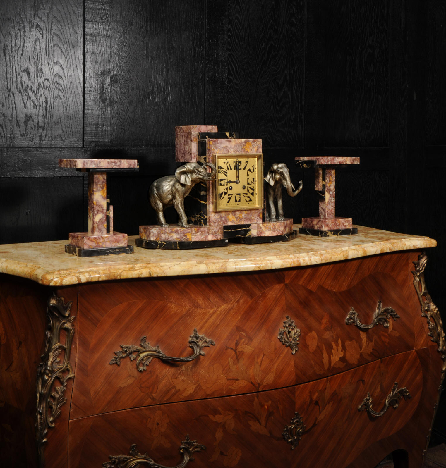 The dial is of high quality with a heavy gilded bezel with beveled glass enclosing a matted gold dial with Art Deco lettering and blued steel hands. The French movement is a traditional 'Pendule de Paris' movement with a pendulum and is of high quality. It is by the Parisian maker Silvin and is in excellent clean and running condition having been fully overhauled by our clockmaker. Pendulum is a replacement. It runs for 8 days and strikes the hours and halves on a bell. Click the video below to hear the bell and watch the clock running. Condition of the case is excellent, the marble has a lovely polish, there are some minor nibbles to the marble mostly along the bottom edges and corners. The is a small patch of lost polish to the top of one side piece. The dial is excellent with some re-touching to the lettering and some light marks, mostly between the '7' and '8'. Elephants are also very good with just some light wear to the original finish.