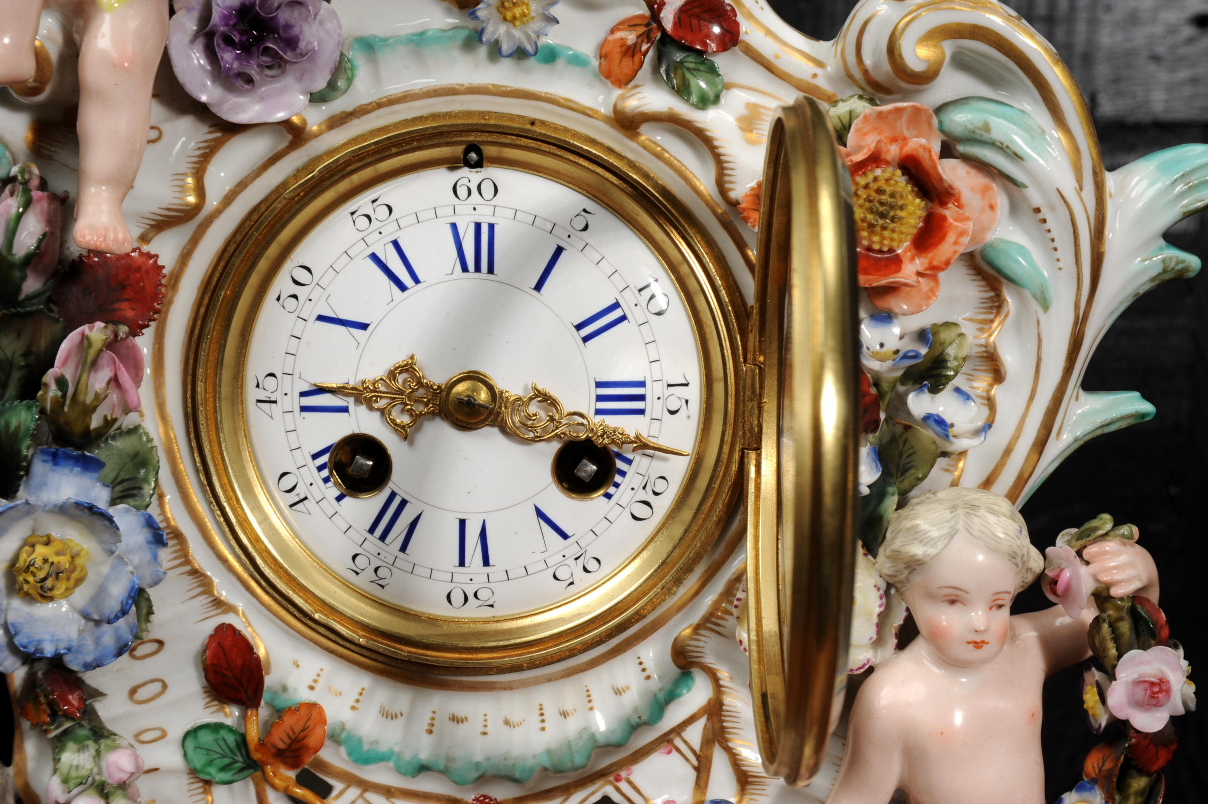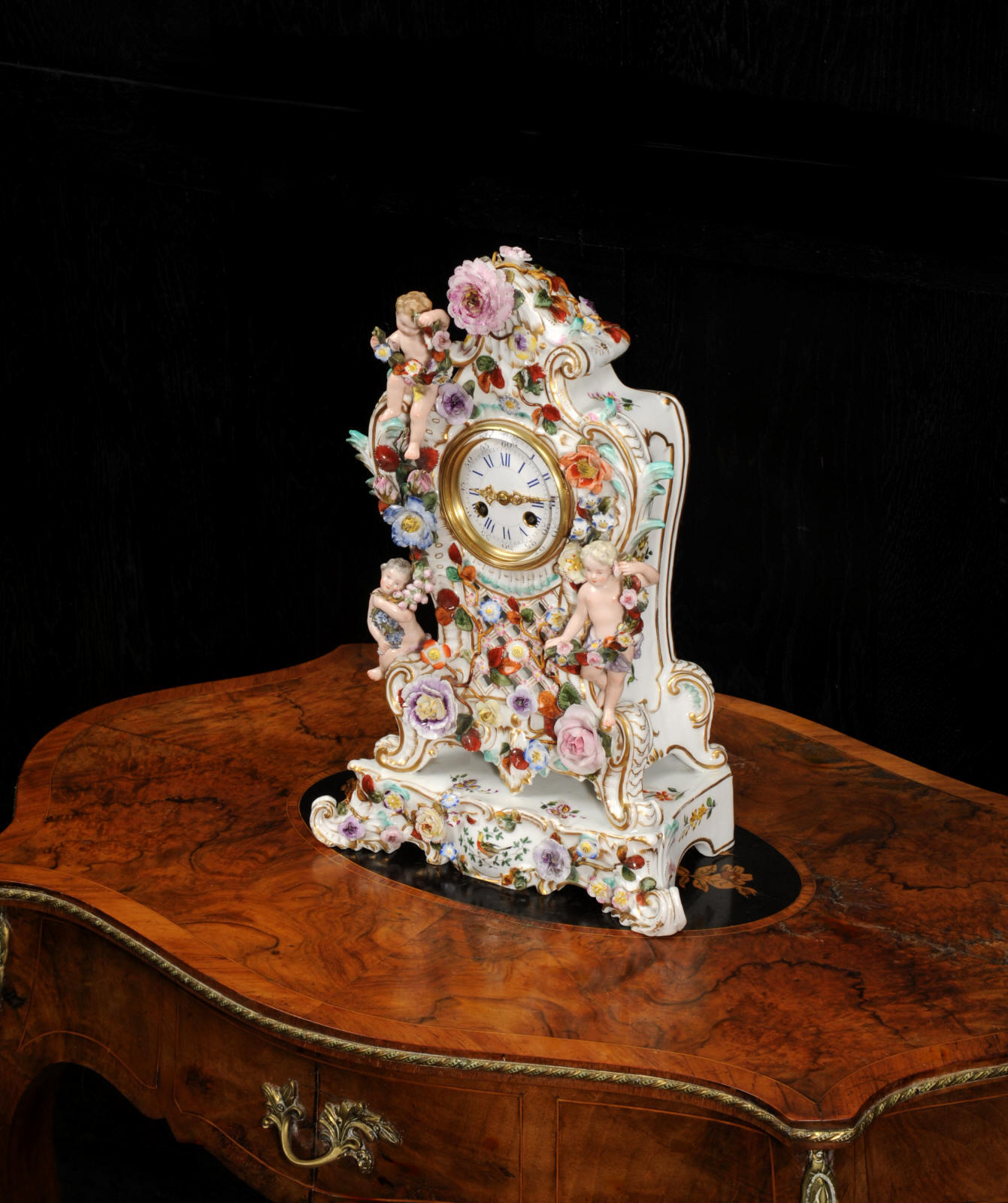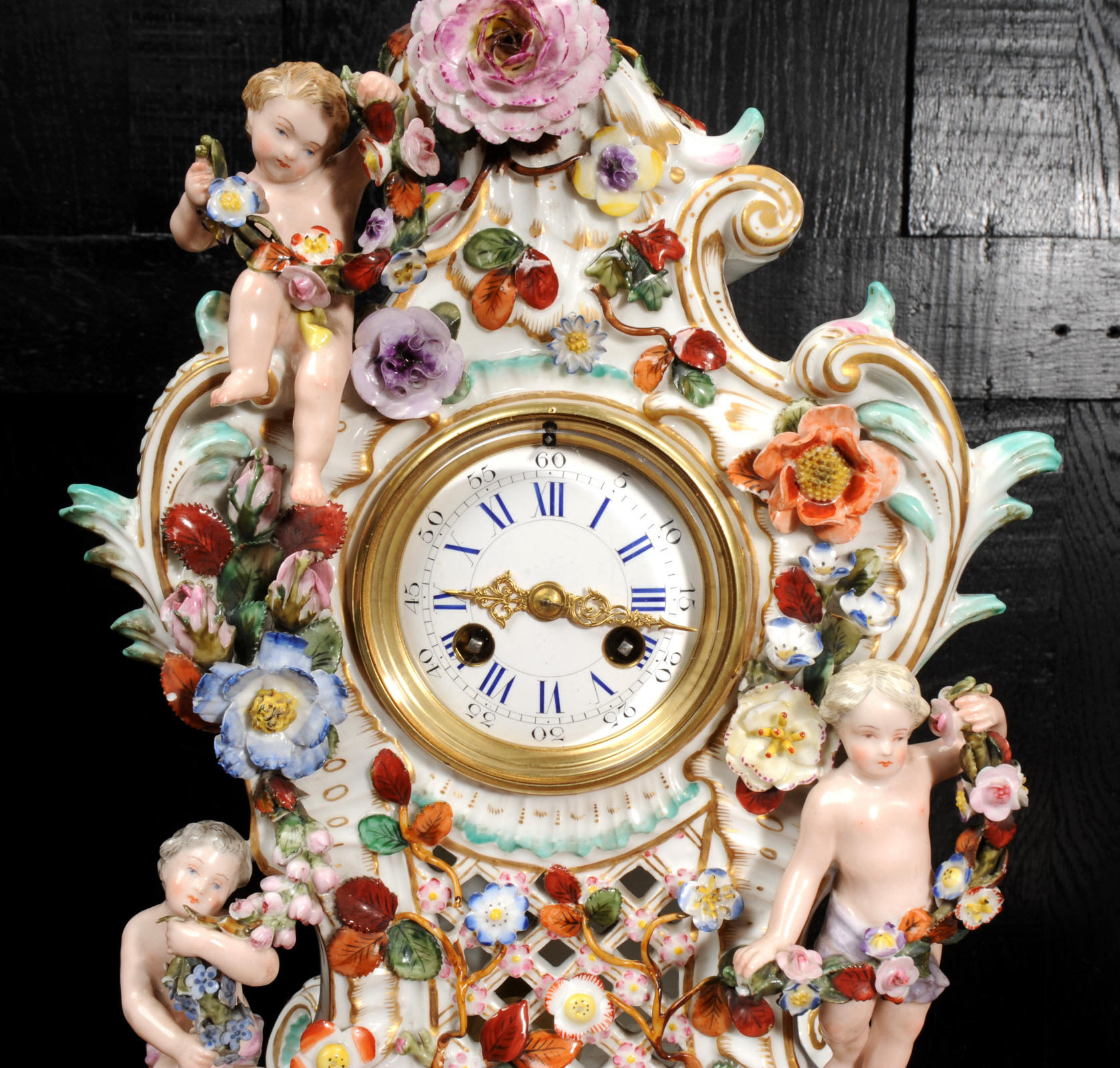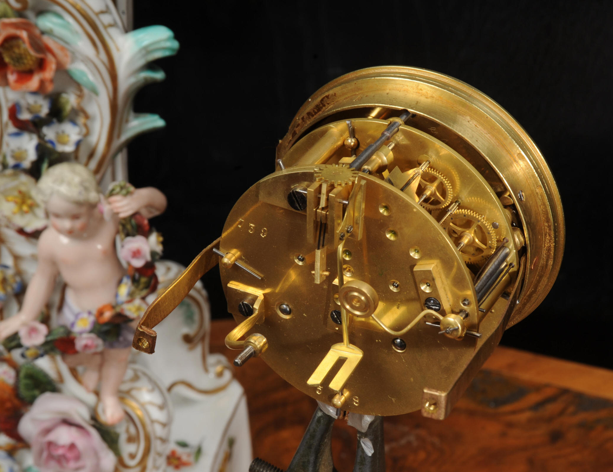 The front of the clock is formed as open lattice to allow a glimpse of the pendulum gentle swinging within. The porcelain is marked with an imitation Meissen mark and is by one of several French makers imitating Meissen at the time. The dial is porcelain enamel with it's original finely fretted gilt hands and convex bezel. The rear door is glazed with frosted glass. The French movement is of high quality and is in excellent clean and running condition having been fully overhauled by our clockmaker. Pendulum is a replacement. It runs for 8 days and strikes the hours and halves on a bell. Click the video to hear the bell and watch the clock running. Condition of the case is excellent, porcelain has some small losses as is to be expected, a small piece of stem to the top, some small losses to petals, a light hairline through one cherubs foot. There are four very small areas of scratching that have been touched in, two to the front of the base and two to the rear of the clock. There is some slight rubbing to the over-glaze gilt decoration. The dial has no damage.