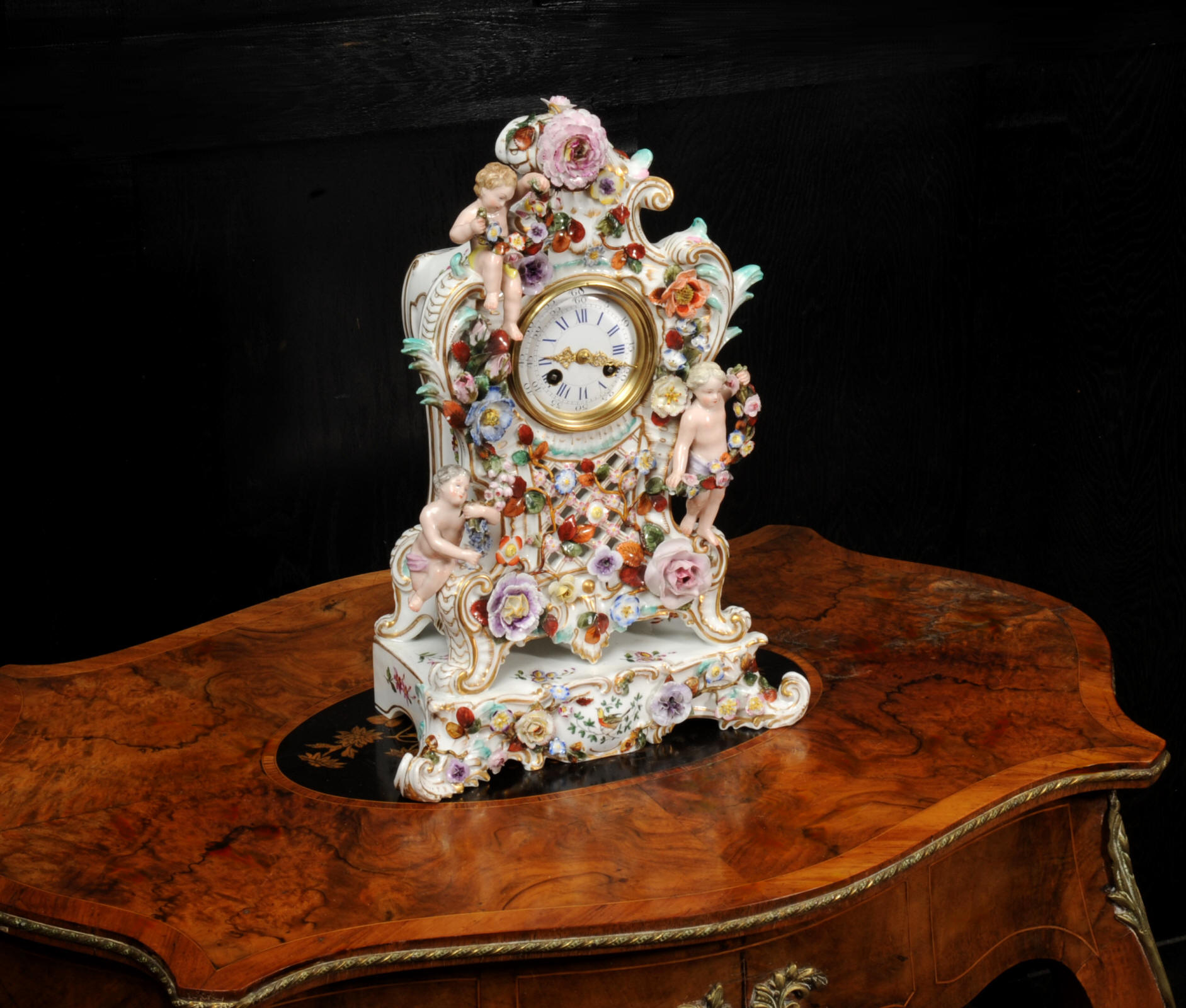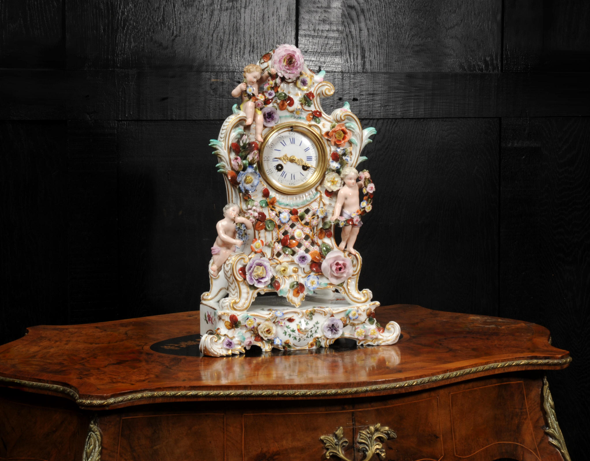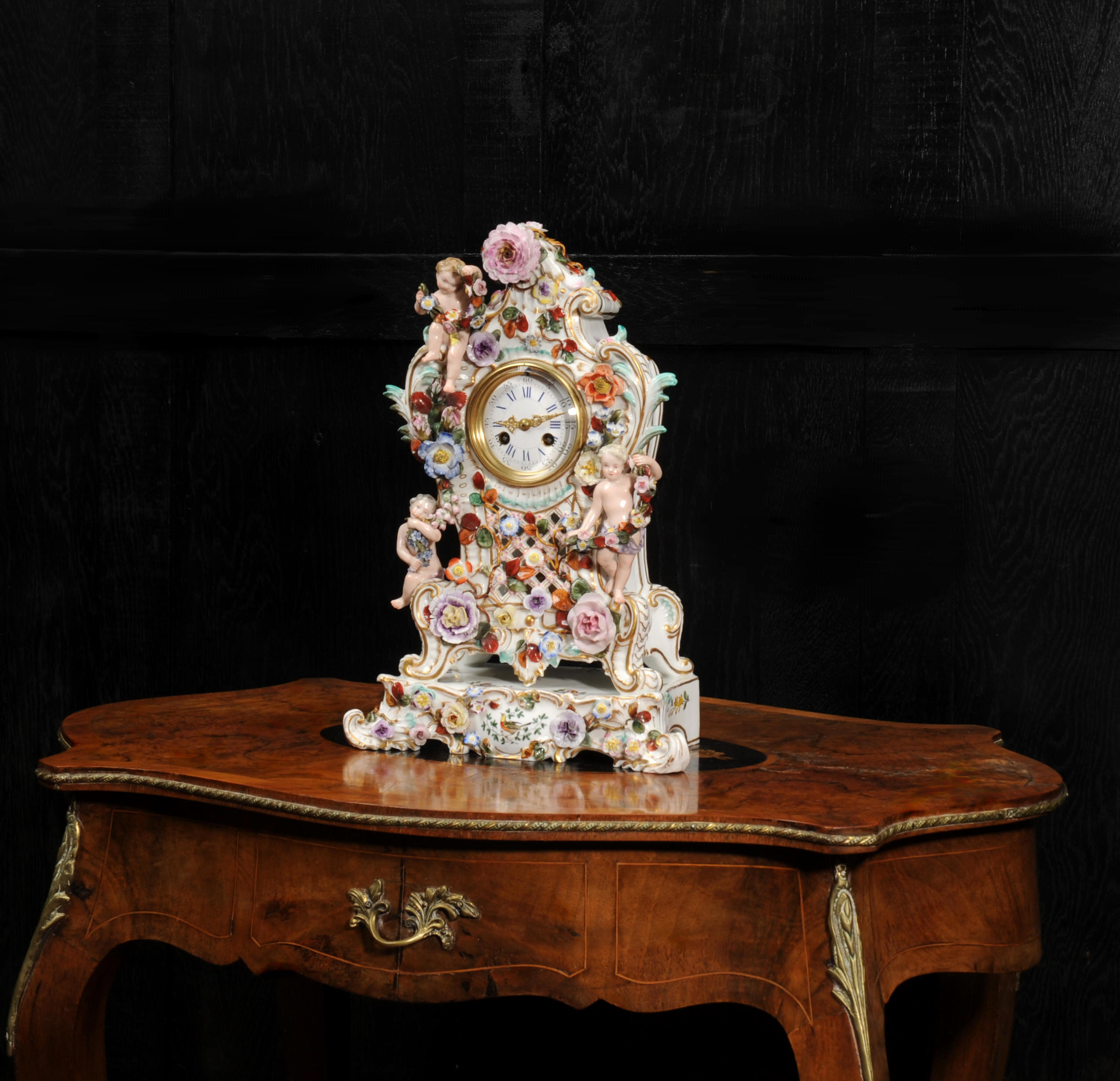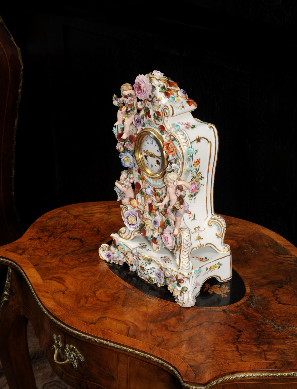 The front of the clock is formed as open lattice to allow a glimpse of the pendulum gentle swinging within. The porcelain is marked with an imitation Meissen mark and is by one of several French makers imitating Meissen at the time. The dial is porcelain enamel with it's original finely fretted gilt hands and convex bezel. The rear door is glazed with frosted glass. The French movement is of high quality and is in excellent clean and running condition having been fully overhauled by our clockmaker. Pendulum is a replacement. It runs for 8 days and strikes the hours and halves on a bell. Click the video to hear the bell and watch the clock running. Condition of the case is excellent, porcelain has some small losses as is to be expected, a small piece of stem to the top, some small losses to petals, a light hairline through one cherubs foot. There are four very small areas of scratching that have been touched in, two to the front of the base and two to the rear of the clock. There is some slight rubbing to the over-glaze gilt decoration. The dial has no damage.