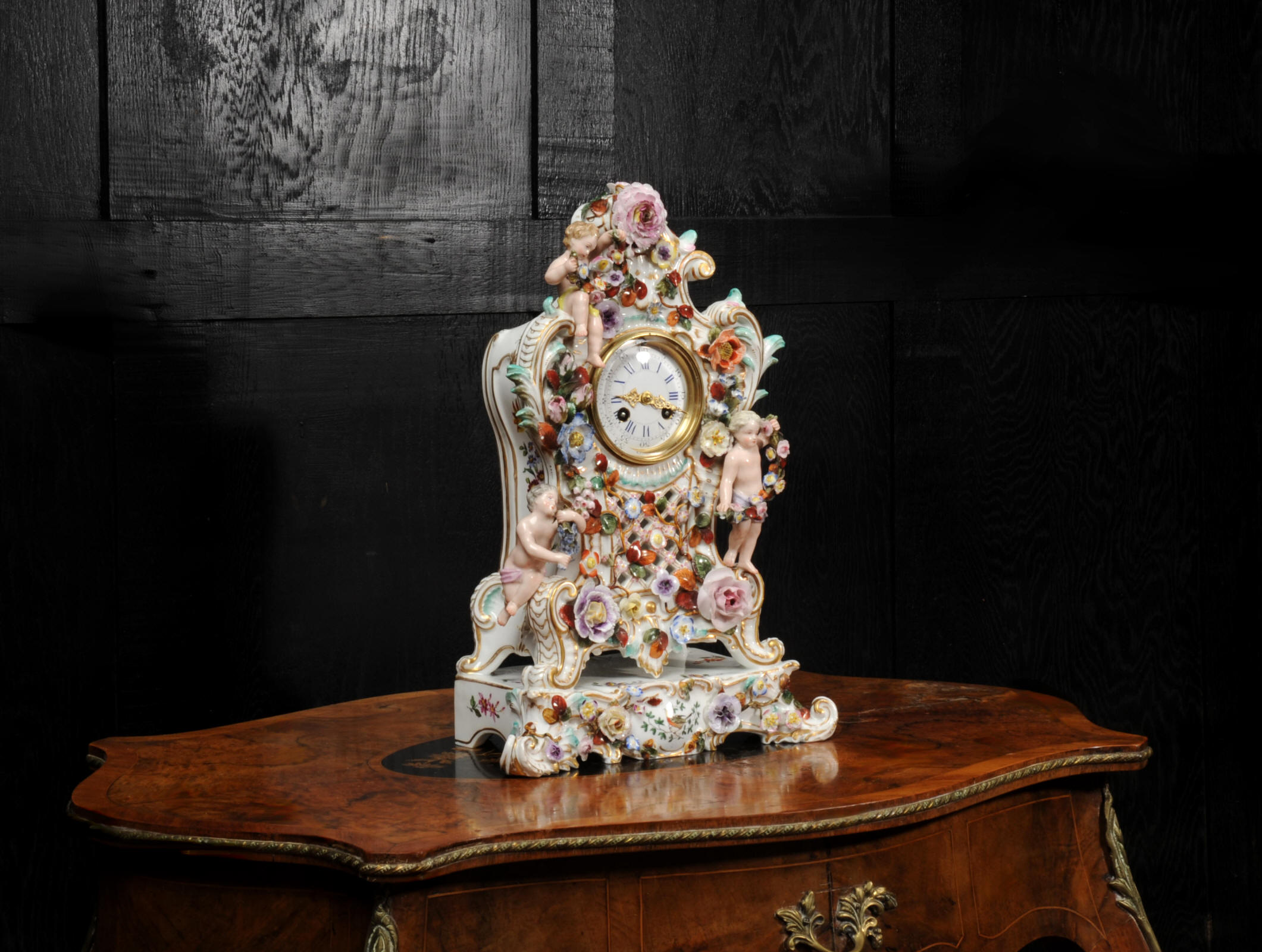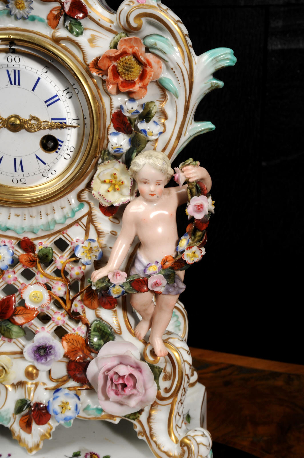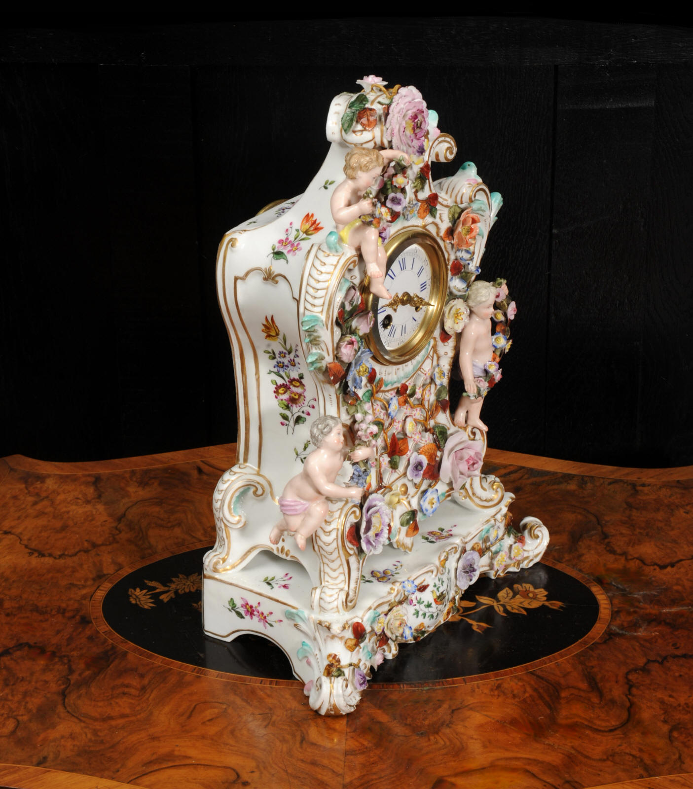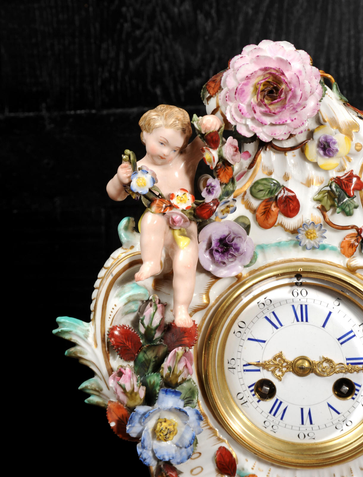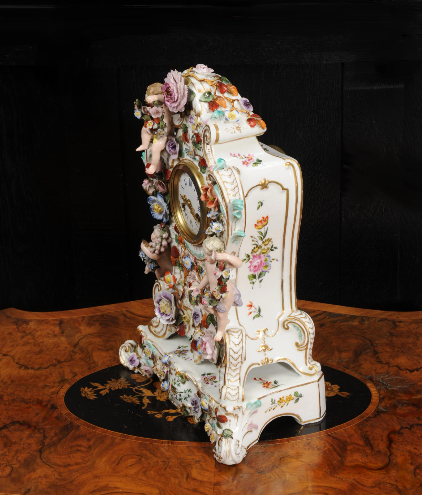 The front of the clock is formed as open lattice to allow a glimpse of the pendulum gentle swinging within. The porcelain is marked with an imitation Meissen mark and is by one of several French makers imitating Meissen at the time. The dial is porcelain enamel with it's original finely fretted gilt hands and convex bezel. The rear door is glazed with frosted glass. The French movement is of high quality and is in excellent clean and running condition having been fully overhauled by our clockmaker. Pendulum is a replacement. It runs for 8 days and strikes the hours and halves on a bell. Click the video to hear the bell and watch the clock running. Condition of the case is excellent, porcelain has some small losses as is to be expected, a small piece of stem to the top, some small losses to petals, a light hairline through one cherubs foot. There are four very small areas of scratching that have been touched in, two to the front of the base and two to the rear of the clock. There is some slight rubbing to the over-glaze gilt decoration. The dial has no damage.