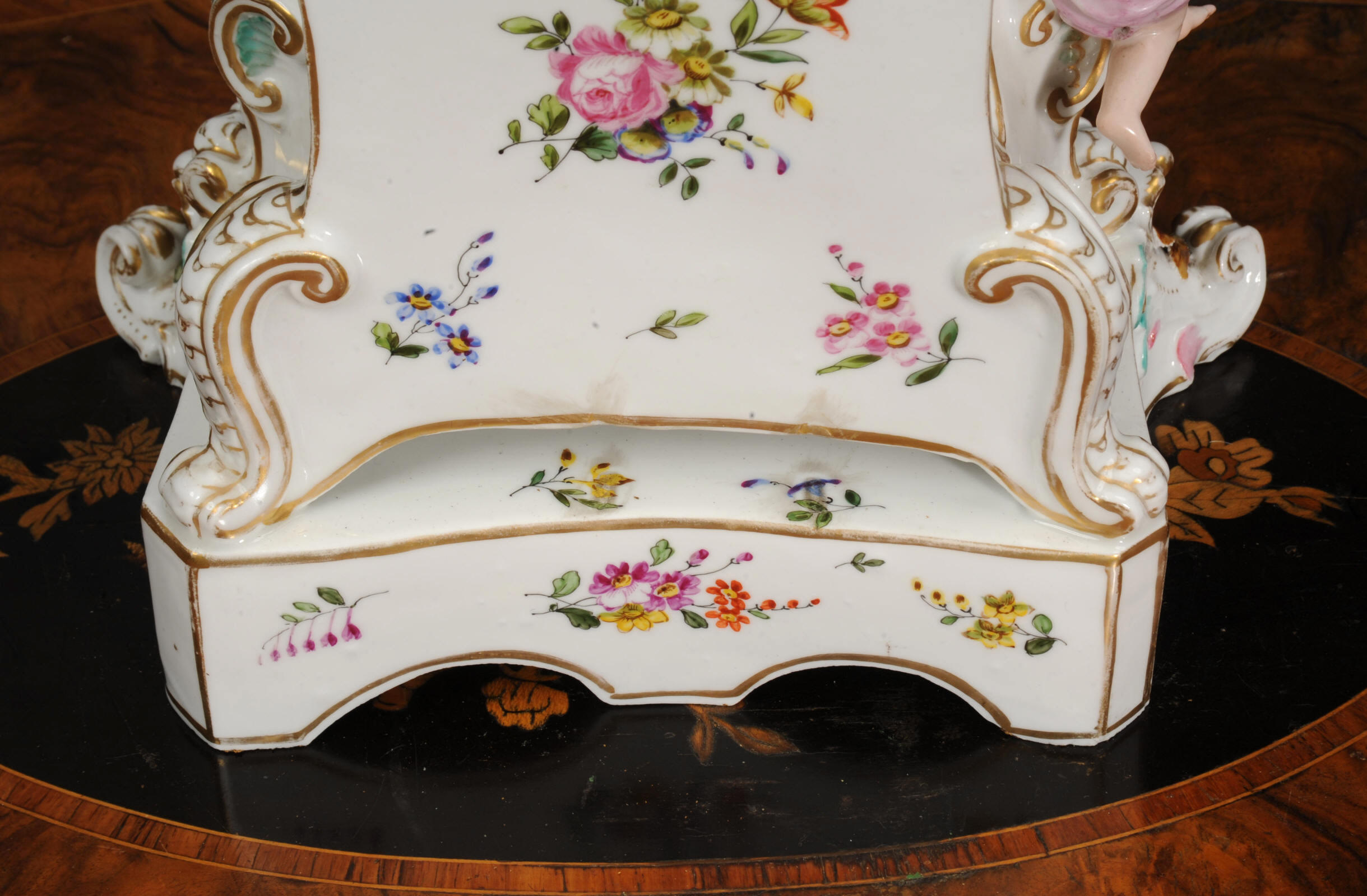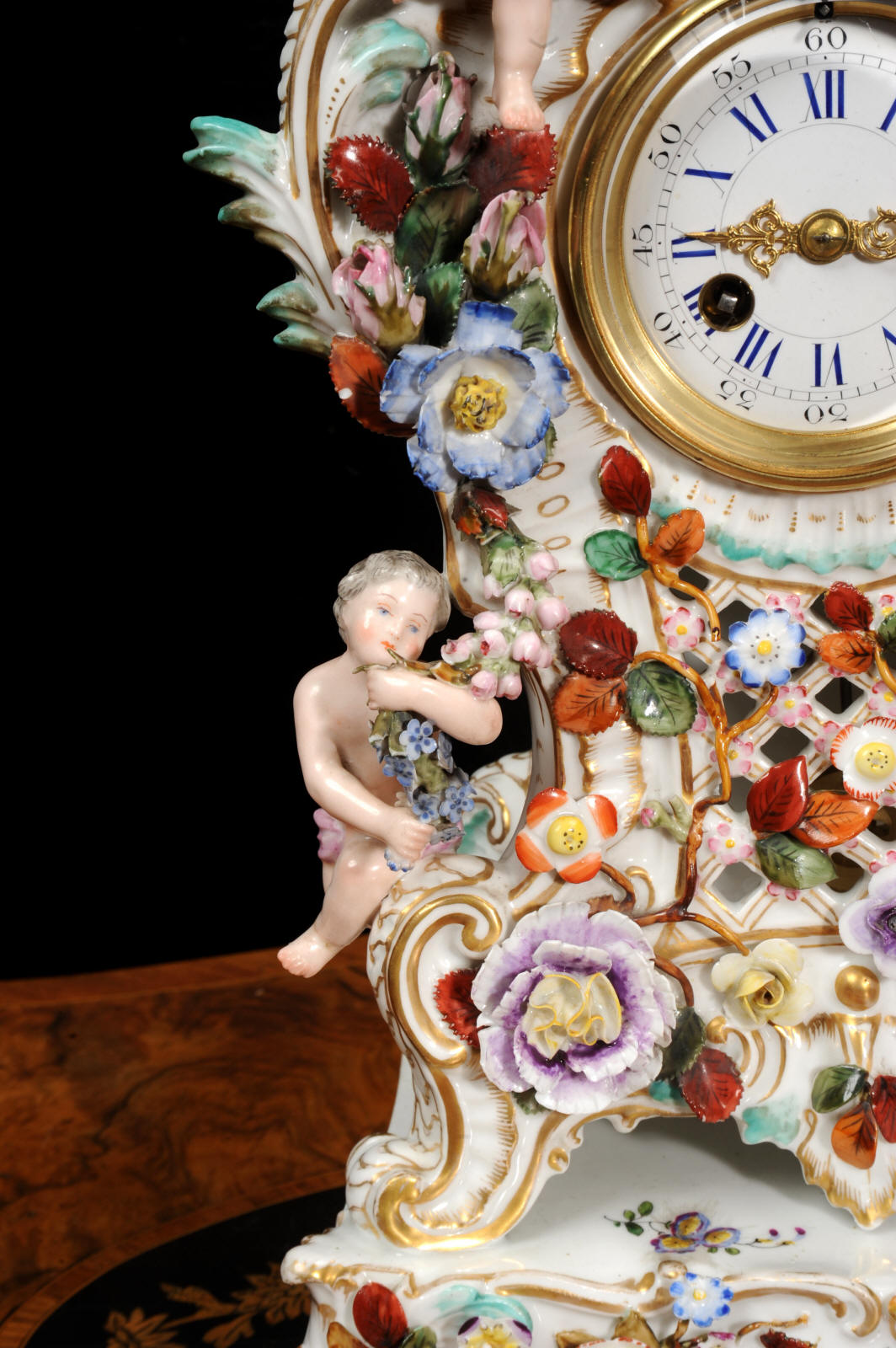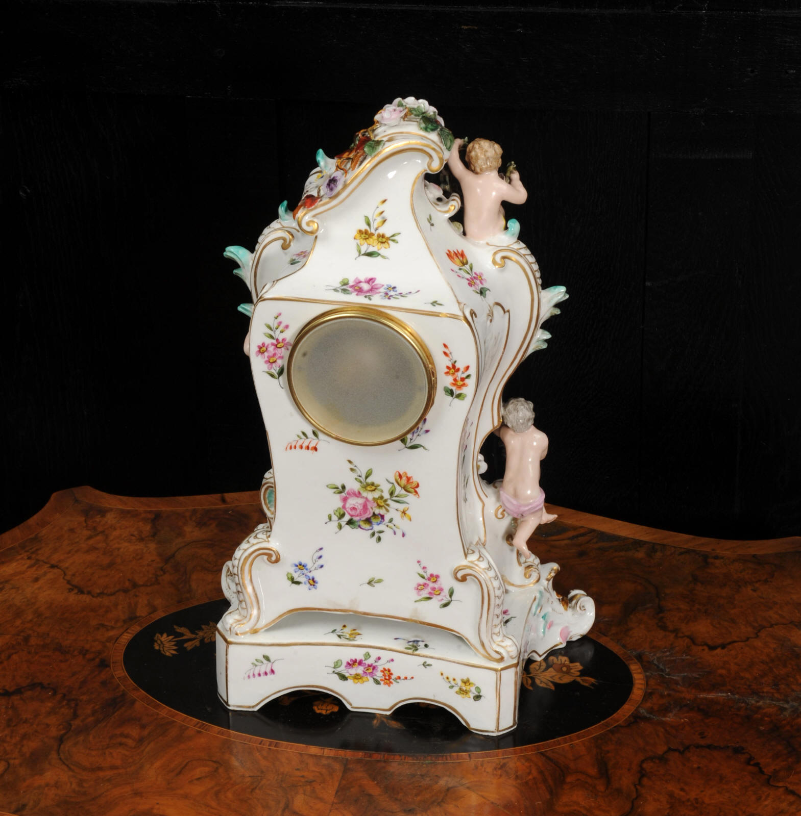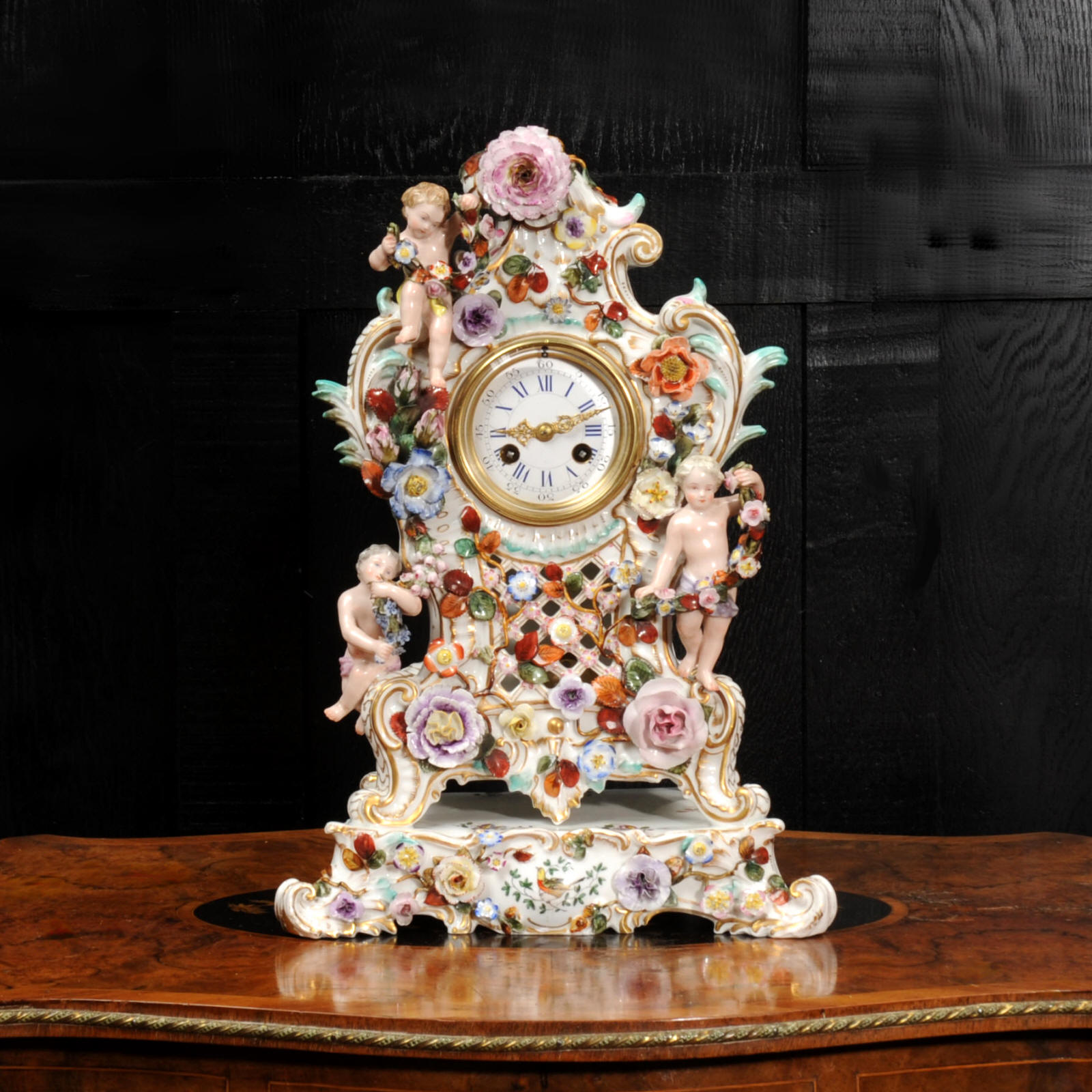 The front of the clock is formed as open lattice to allow a glimpse of the pendulum gentle swinging within. The porcelain is marked with an imitation Meissen mark and is by one of several French makers imitating Meissen at the time. The dial is porcelain enamel with it's original finely fretted gilt hands and convex bezel. The rear door is glazed with frosted glass. The French movement is of high quality and is in excellent clean and running condition having been fully overhauled by our clockmaker. Pendulum is a replacement. It runs for 8 days and strikes the hours and halves on a bell. Click the video to hear the bell and watch the clock running. Condition of the case is excellent, porcelain has some small losses as is to be expected, a small piece of stem to the top, some small losses to petals, a light hairline through one cherubs foot. There are four very small areas of scratching that have been touched in, two to the front of the base and two to the rear of the clock. There is some slight rubbing to the over-glaze gilt decoration. The dial has no damage.