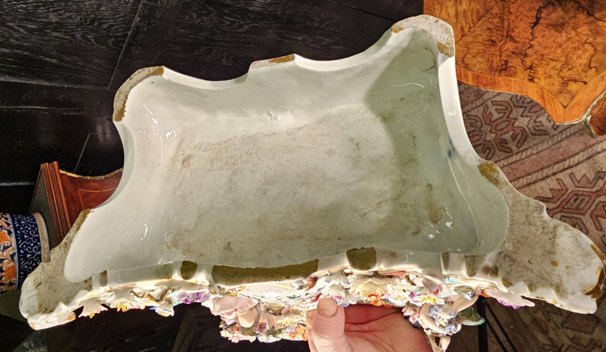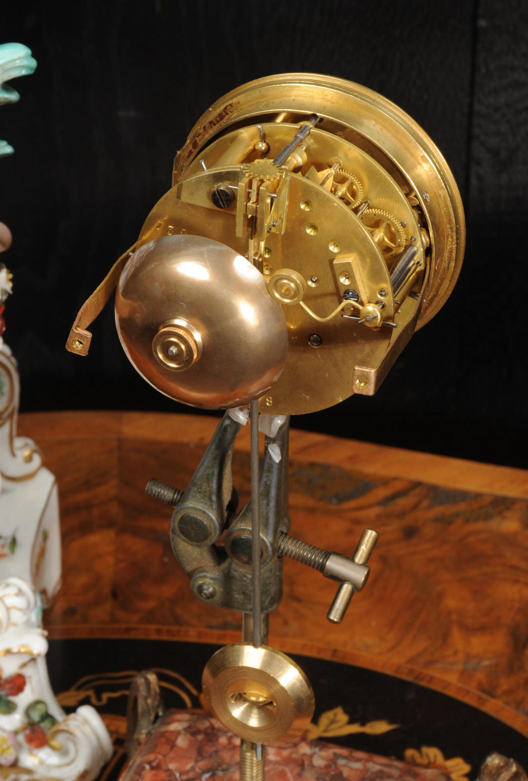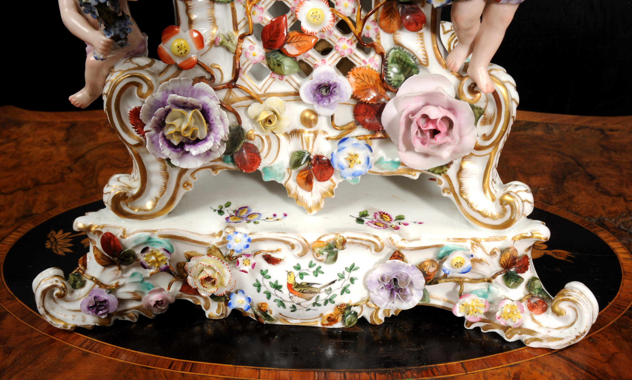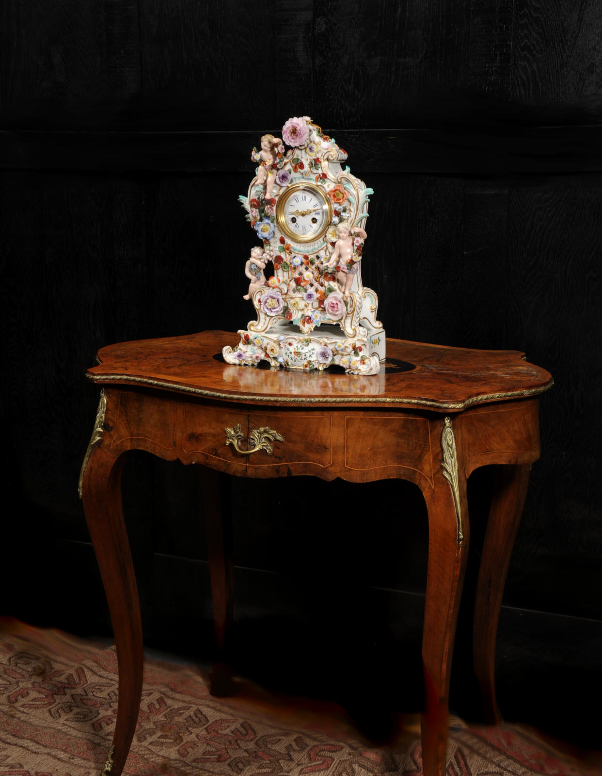 The front of the clock is formed as open lattice to allow a glimpse of the pendulum gentle swinging within. The porcelain is marked with an imitation Meissen mark and is by one of several French makers imitating Meissen at the time. The dial is porcelain enamel with it's original finely fretted gilt hands and convex bezel. The rear door is glazed with frosted glass. The French movement is of high quality and is in excellent clean and running condition having been fully overhauled by our clockmaker. Pendulum is a replacement. It runs for 8 days and strikes the hours and halves on a bell. Click the video to hear the bell and watch the clock running. Condition of the case is excellent, porcelain has some small losses as is to be expected, a small piece of stem to the top, some small losses to petals, a light hairline through one cherubs foot. There are four very small areas of scratching that have been touched in, two to the front of the base and two to the rear of the clock. There is some slight rubbing to the over-glaze gilt decoration. The dial has no damage.