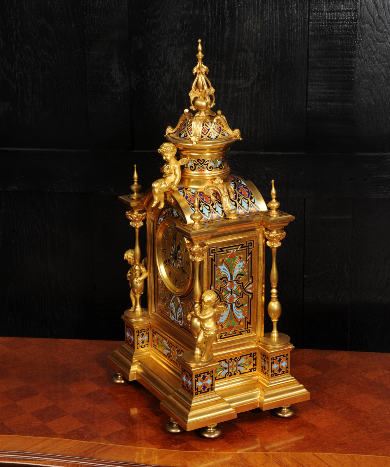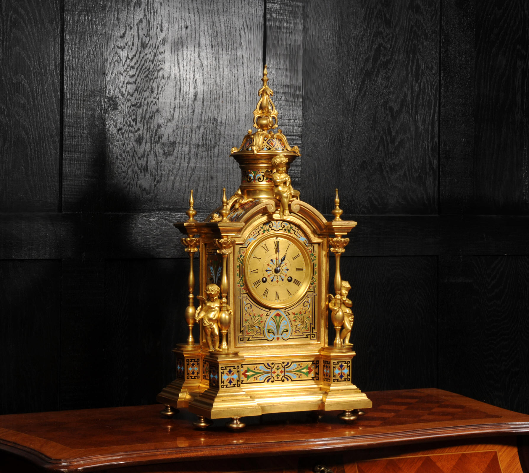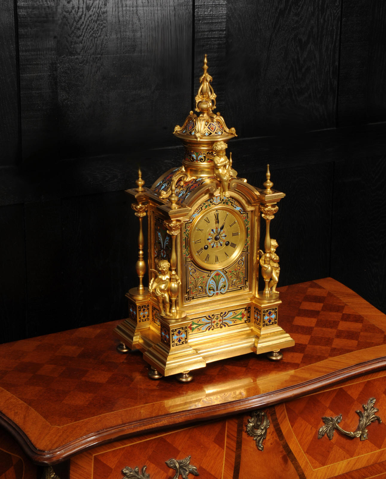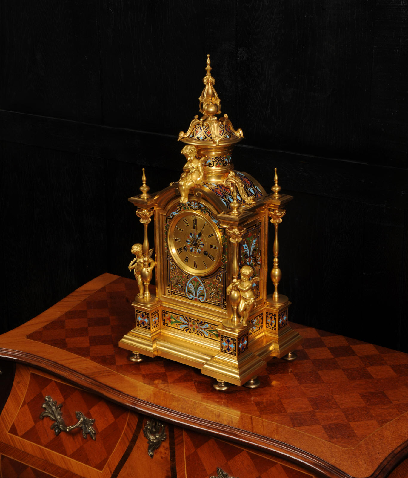 To the sides are charming figures of cherubs clutching the baluster turned pillars. A third cherub is seated above the dial. The dial is also gilded bronze with champlevé enamel and is complete with original finely blued steel hands. The clock is decorated in the round with a frosted glass rear door. Please note that this type of clock does not have a glazed bezel to cover the dial. The French movement is of high quality and is by Vincenti et Cie. It is in excellent clean and running condition having been fully overhauled by our clockmaker. Pendulum is original. It runs for 8 days and strikes the hours and halves on a bell. Click the video below to hear the bell and watch the clock running. Condition of the case is excellent, the original gilding is particularly good with only minor wear where the clock has been handled and some light marks and discolouration. The rear most bun feet are missing however the clock sits very well without them. Rear frosted glass has some marks. Enamel is very good. Established by Basile Charles Le Roy in 1785, the firm of Le Roy et Fils became a well-established and renowned clockmaker. Basile had been Napoleon's master clockmaker, and along with his son Charles-Louis, he worked for Princess Pauline and the Duke de Bourbon as well. Examples of the firm's work are included in all of the major world collections. The firm was located at the Palais Royale from 1785, the year of its founding, through the death of Charles-Louis at Versailles in 1865. A shop was opened in London, in 1854 at 296 Regent Street under the name of Le Roy and Son. The name was later changed to Le Roy and Fils. A second shop was opened in London in 1885 at 57 New Bond Street. Le Roy and Fils was a British Royal Warrant holder to Queen Victoria. Champlevé enamelling, is similar to cloisonné in that the enamel is applied to discrete cells separated by metal. However, in champlevé, cells or troughs are cast into or cut away from the metal base, leaving a raised metal line between the cells which forms the outline of a design. The cells are then filled with molten or powdered glass and fired.