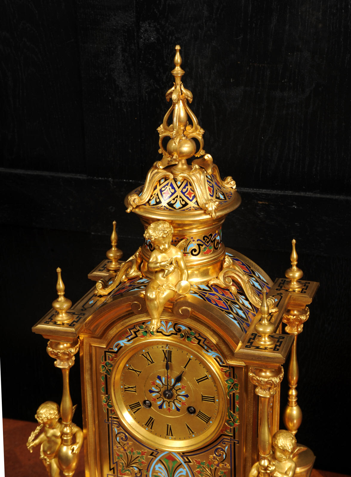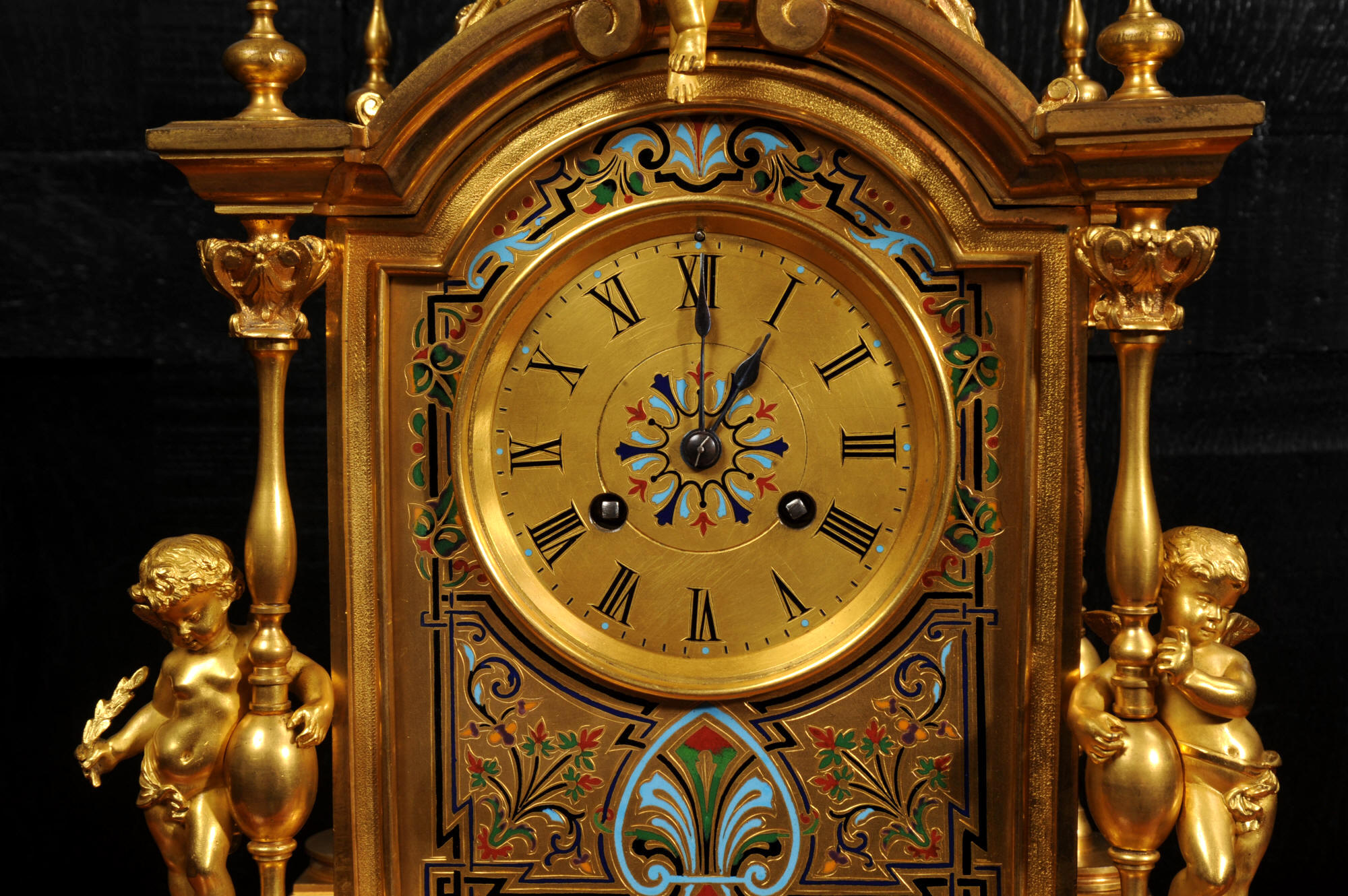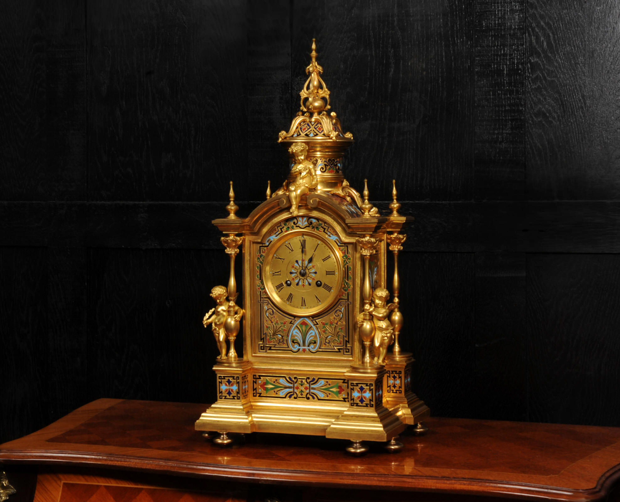 To the sides are charming figures of cherubs clutching the baluster turned pillars. A third cherub is seated above the dial. The dial is also gilded bronze with champlevé enamel and is complete with original finely blued steel hands. The clock is decorated in the round with a frosted glass rear door. Please note that this type of clock does not have a glazed bezel to cover the dial. The French movement is of high quality and is by Vincenti et Cie. It is in excellent clean and running condition having been fully overhauled by our clockmaker. Pendulum is original. It runs for 8 days and strikes the hours and halves on a bell. Click the video below to hear the bell and watch the clock running. Condition of the case is excellent, the original gilding is particularly good with only minor wear where the clock has been handled and some light marks and discolouration. The rear most bun feet are missing however the clock sits very well without them. Rear frosted glass has some marks. Enamel is very good. Established by Basile Charles Le Roy in 1785, the firm of Le Roy et Fils became a well-established and renowned clockmaker. Basile had been Napoleon's master clockmaker, and along with his son Charles-Louis, he worked for Princess Pauline and the Duke de Bourbon as well. Examples of the firm's work are included in all of the major world collections. The firm was located at the Palais Royale from 1785, the year of its founding, through the death of Charles-Louis at Versailles in 1865. A shop was opened in London, in 1854 at 296 Regent Street under the name of Le Roy and Son. The name was later changed to Le Roy and Fils. A second shop was opened in London in 1885 at 57 New Bond Street. Le Roy and Fils was a British Royal Warrant holder to Queen Victoria. Champlevé enamelling, is similar to cloisonné in that the enamel is applied to discrete cells separated by metal. However, in champlevé, cells or troughs are cast into or cut away from the metal base, leaving a raised metal line between the cells which forms the outline of a design. The cells are then filled with molten or powdered glass and fired.