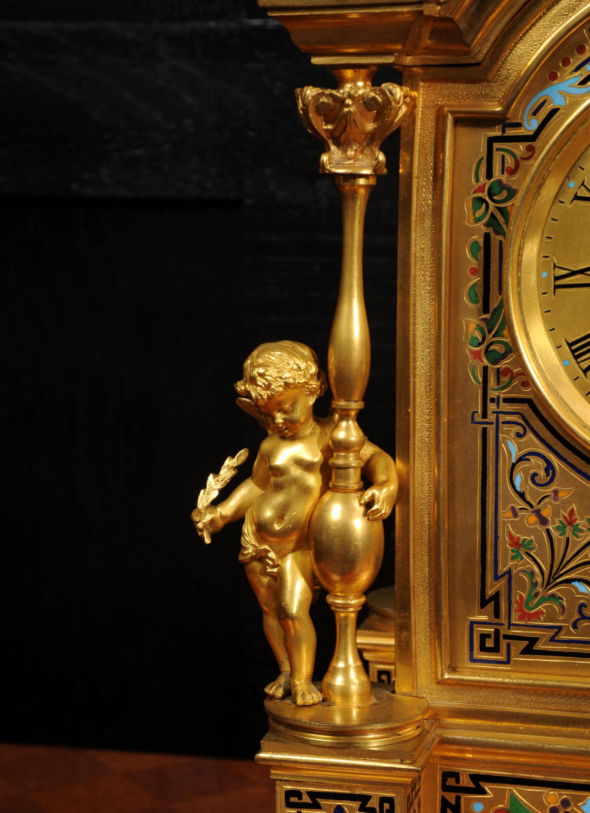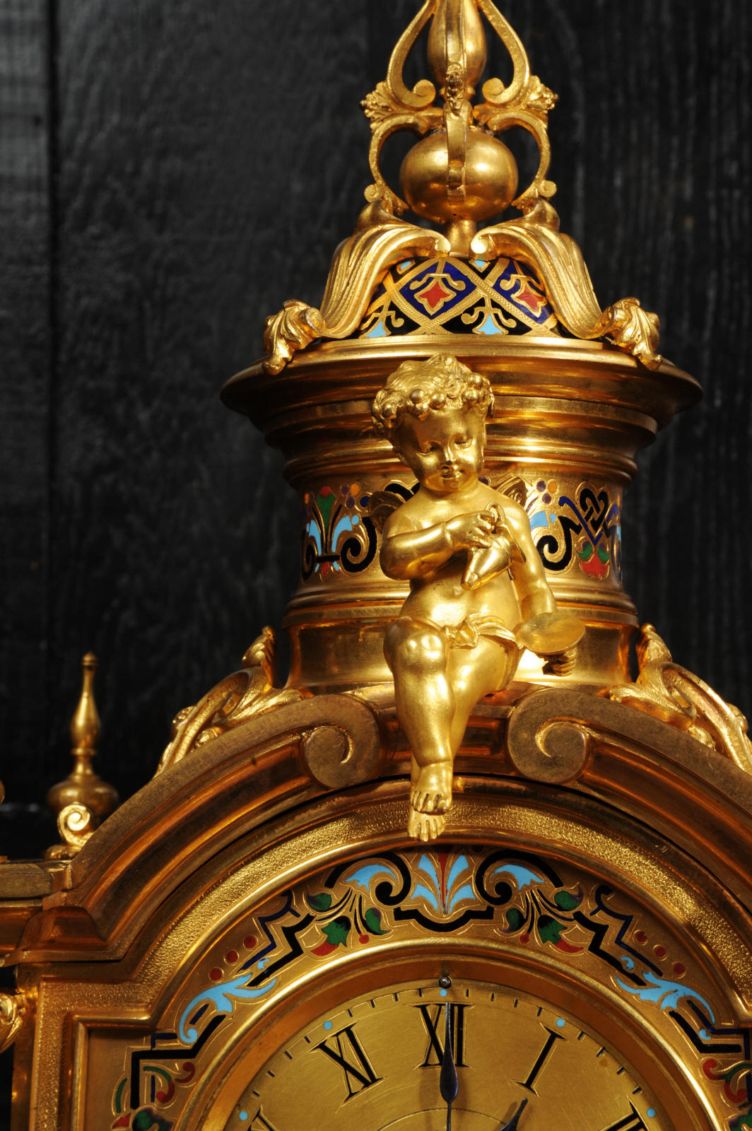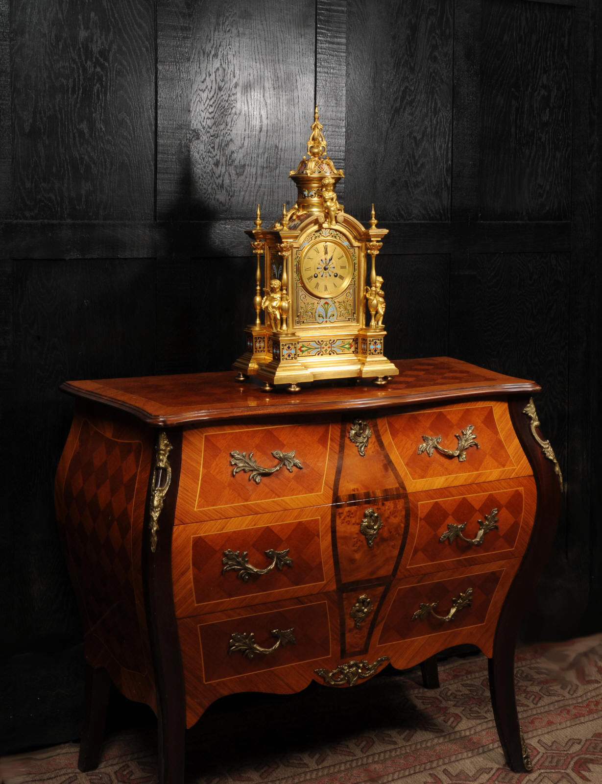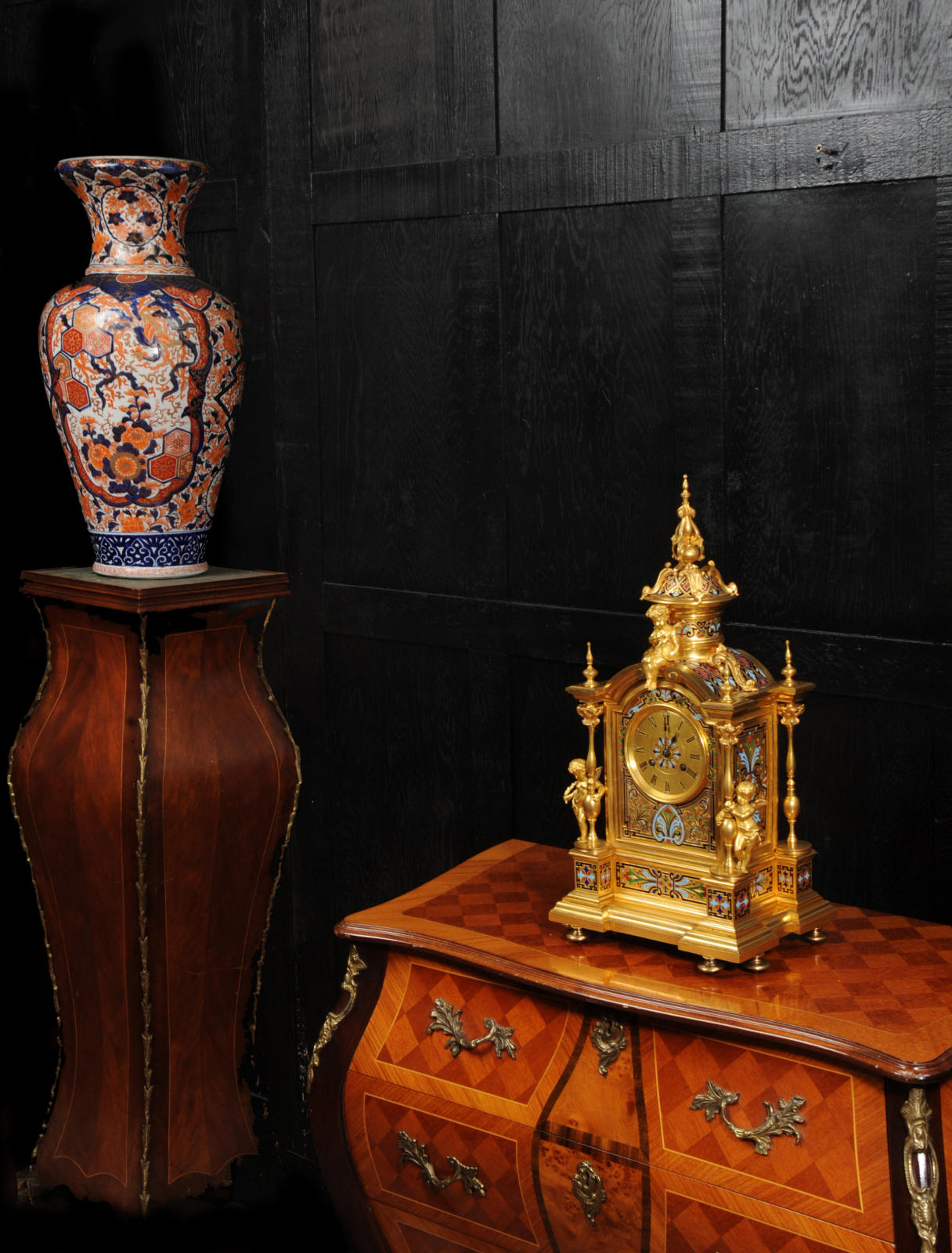To the sides are charming figures of cherubs clutching the baluster turned pillars. A third cherub is seated above the dial. The dial is also gilded bronze with champlevé enamel and is complete with original finely blued steel hands. The clock is decorated in the round with a frosted glass rear door. Please note that this type of clock does not have a glazed bezel to cover the dial. The French movement is of high quality and is by Vincenti et Cie. It is in excellent clean and running condition having been fully overhauled by our clockmaker. Pendulum is original. It runs for 8 days and strikes the hours and halves on a bell. Click the video below to hear the bell and watch the clock running. Condition of the case is excellent, the original gilding is particularly good with only minor wear where the clock has been handled and some light marks and discolouration. The rear most bun feet are missing however the clock sits very well without them. Rear frosted glass has some marks. Enamel is very good. Established by Basile Charles Le Roy in 1785, the firm of Le Roy et Fils became a well-established and renowned clockmaker. Basile had been Napoleon's master clockmaker, and along with his son Charles-Louis, he worked for Princess Pauline and the Duke de Bourbon as well. Examples of the firm's work are included in all of the major world collections. The firm was located at the Palais Royale from 1785, the year of its founding, through the death of Charles-Louis at Versailles in 1865. A shop was opened in London, in 1854 at 296 Regent Street under the name of Le Roy and Son. The name was later changed to Le Roy and Fils. A second shop was opened in London in 1885 at 57 New Bond Street. Le Roy and Fils was a British Royal Warrant holder to Queen Victoria. Champlevé enamelling, is similar to cloisonné in that the enamel is applied to discrete cells separated by metal. However, in champlevé, cells or troughs are cast into or cut away from the metal base, leaving a raised metal line between the cells which forms the outline of a design. The cells are then filled with molten or powdered glass and fired.