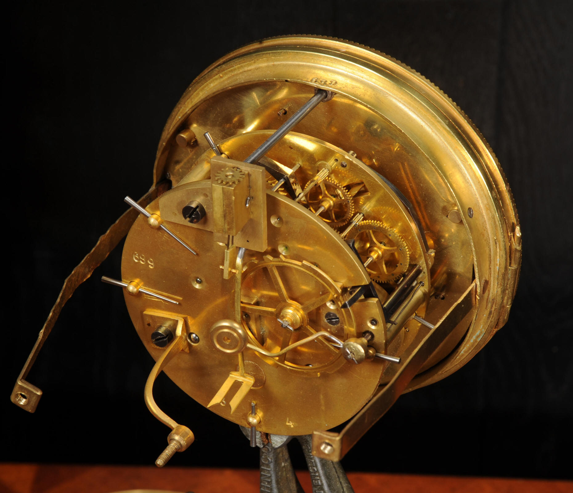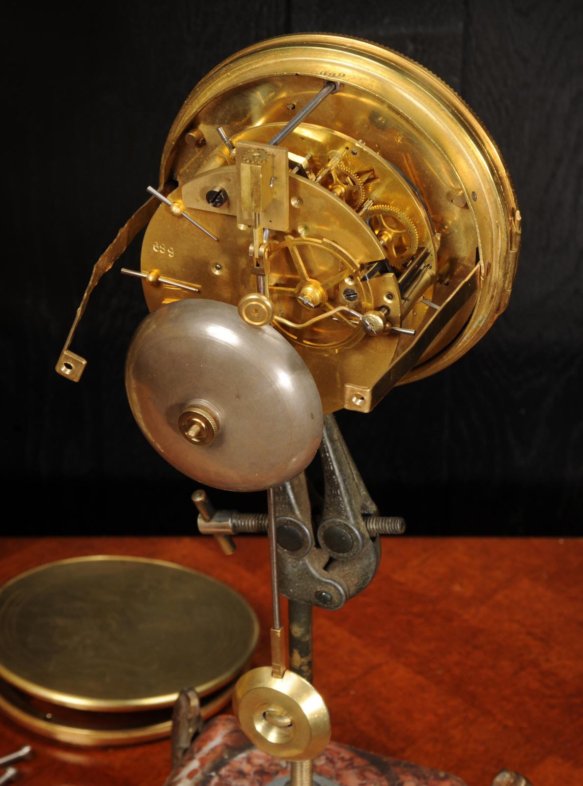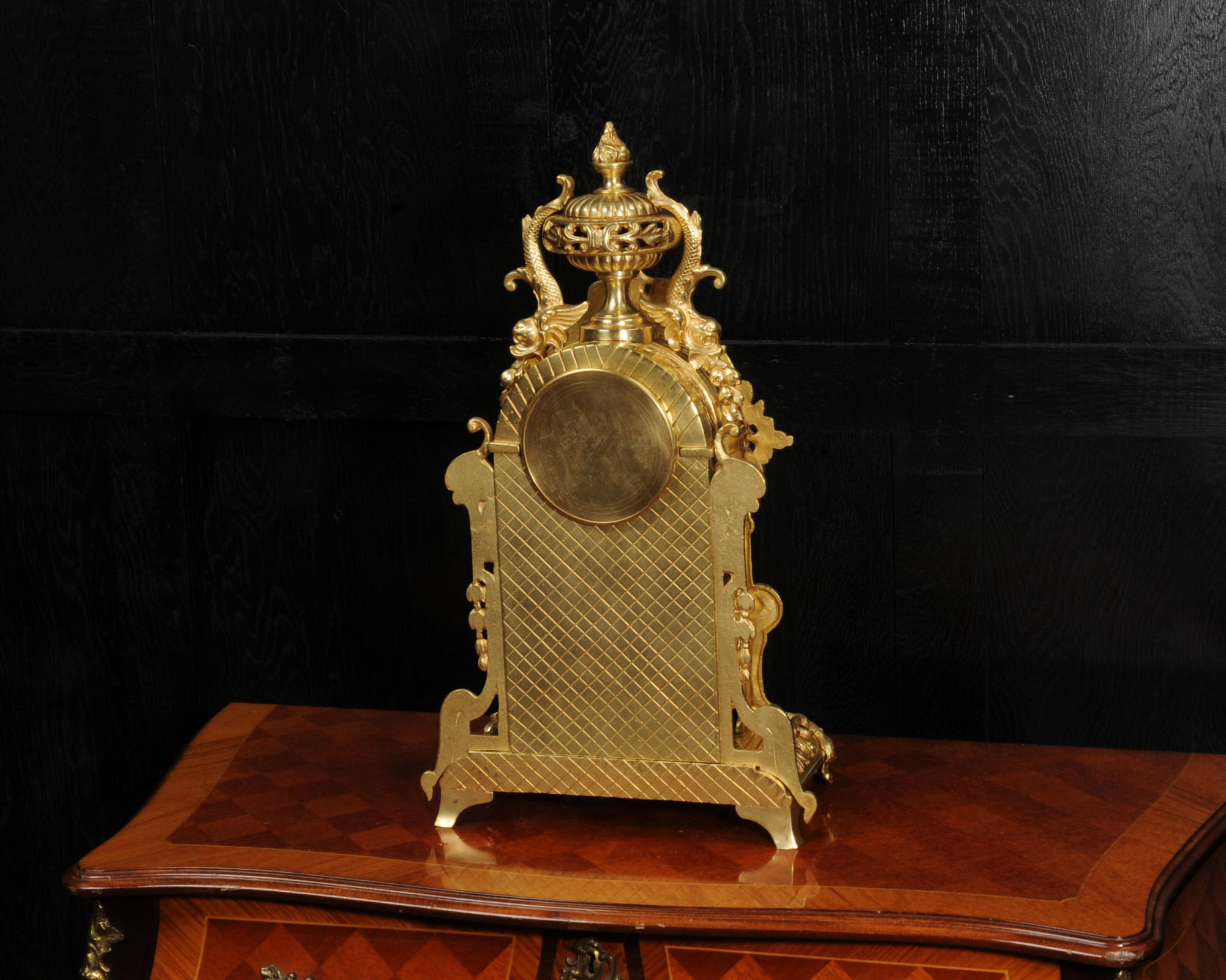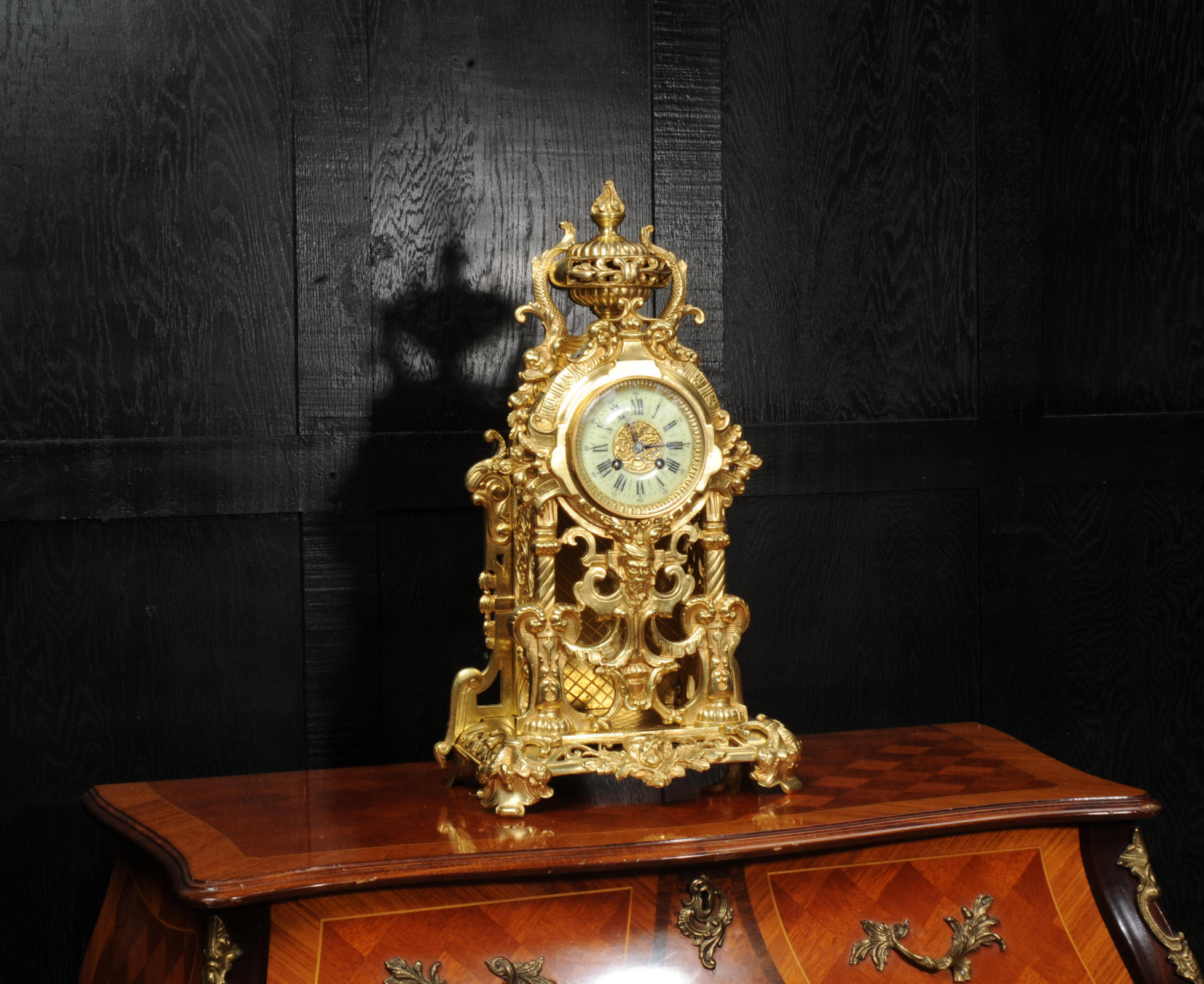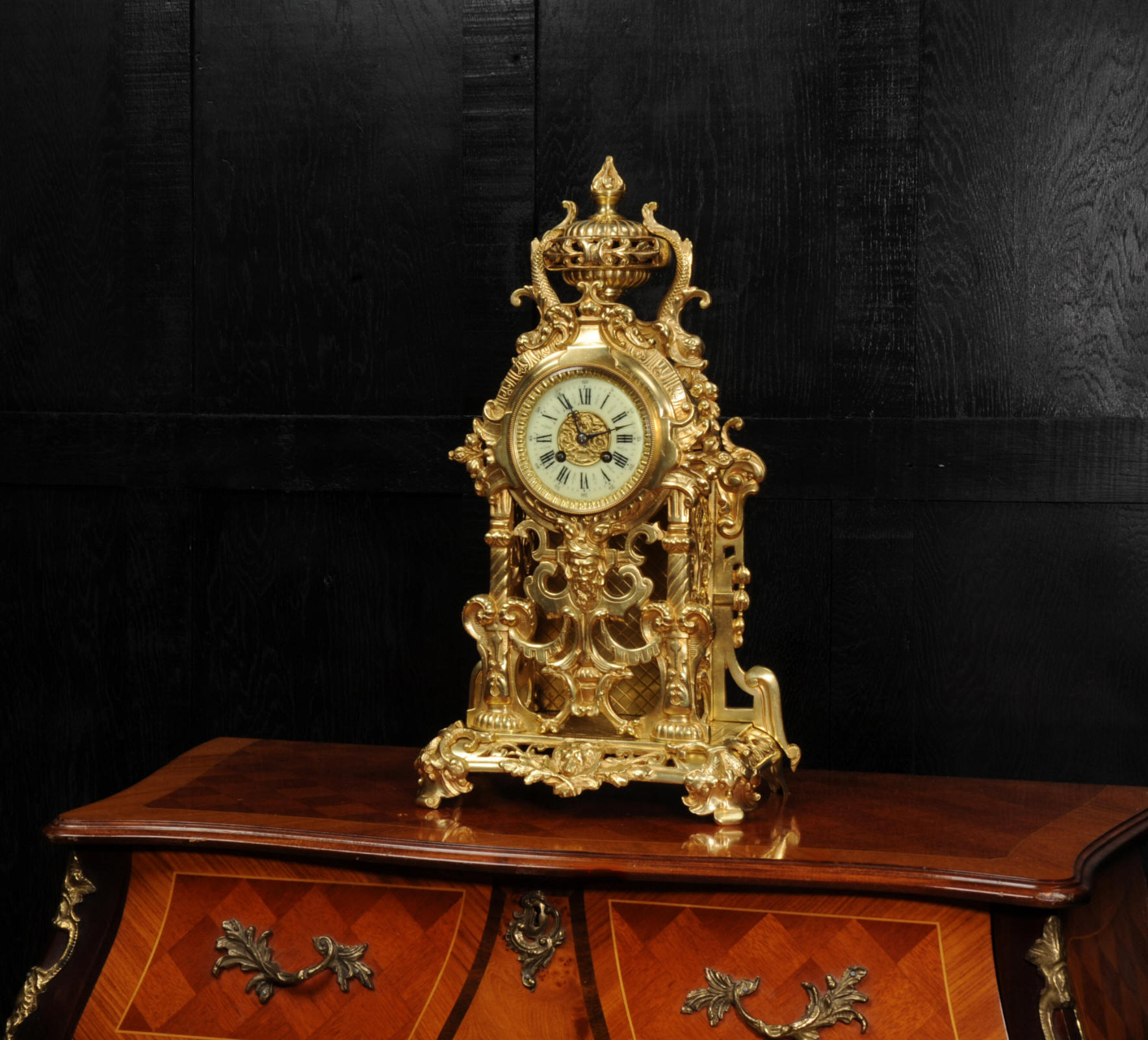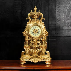 The dial is porcelain enamel on copper and is complete with its original fine blued steel hands. The French movement is of high quality and is by Louis Japy. It is in excellent clean and running condition having been fully overhauled by our clockmaker. Pendulum is original. It runs for 8 days and strikes the hours and halves on a bell. Click the video below to hear the bell and watch the clock running. Condition of the case is excellent, the original gilding is beautifully clean and bright with hardly any wear or discolouration. The dial is also in excellent condition just some tiny nibbles to the winding holes.